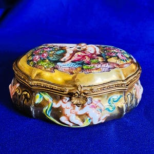 Well-preserved vanity/jewellery box with burl wood veneer. Fittings and feet in gilt bronze. Functioning lock and a drawer secured by a wooden pin to the right of the lock. The key is not the original key, but it does lock (with a little dexterity). Beautiful antique small piece of furniture which is also suitable as an accent in a modern interior. Old dutch print in the lid inside. Condition: In good condition considering its age (probably around 170 years). Slight signs of use. Some minor damage to the veneer on the lower edge of the back, but no major damage. All hinges work well and are stable. So an antique small piece of furniture that can still be used well. Please see photos. Dimensions: Height 35 cm, depth 27 cm, height 21 cm