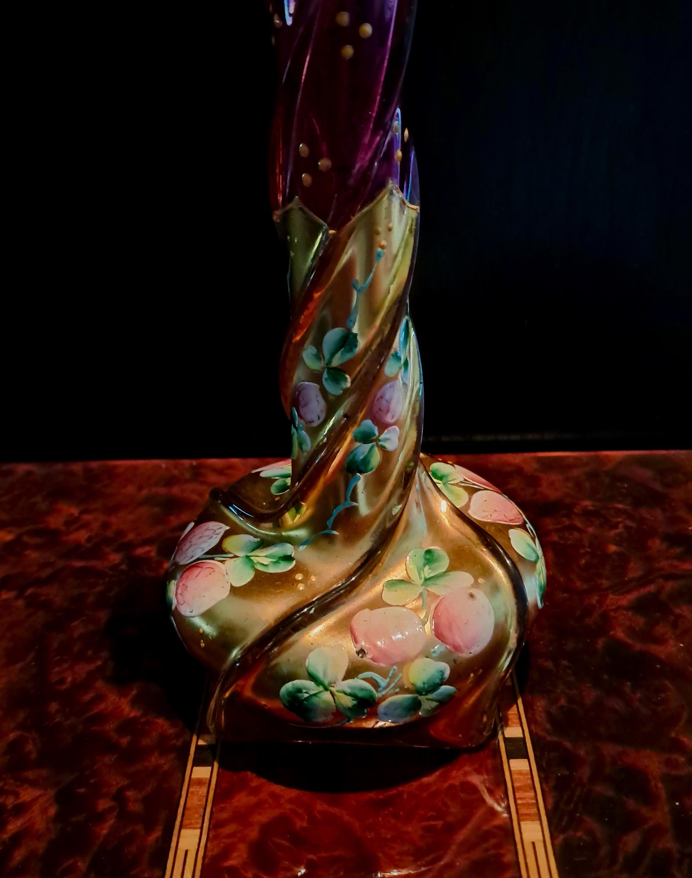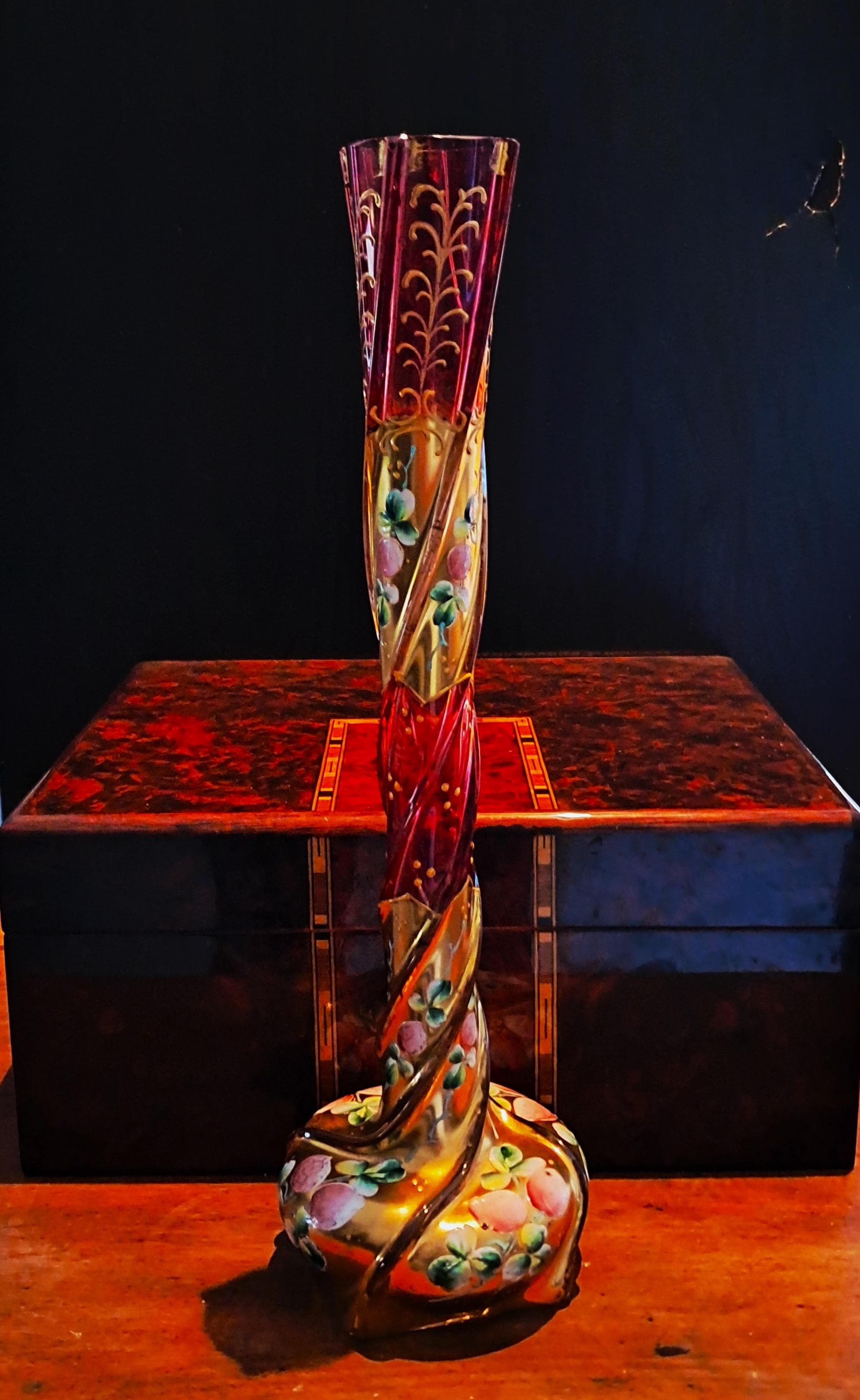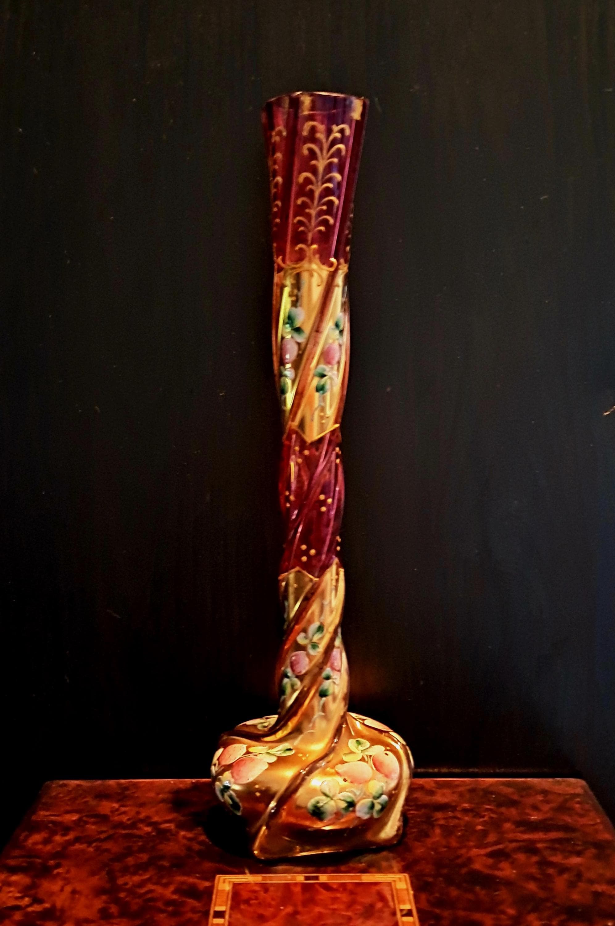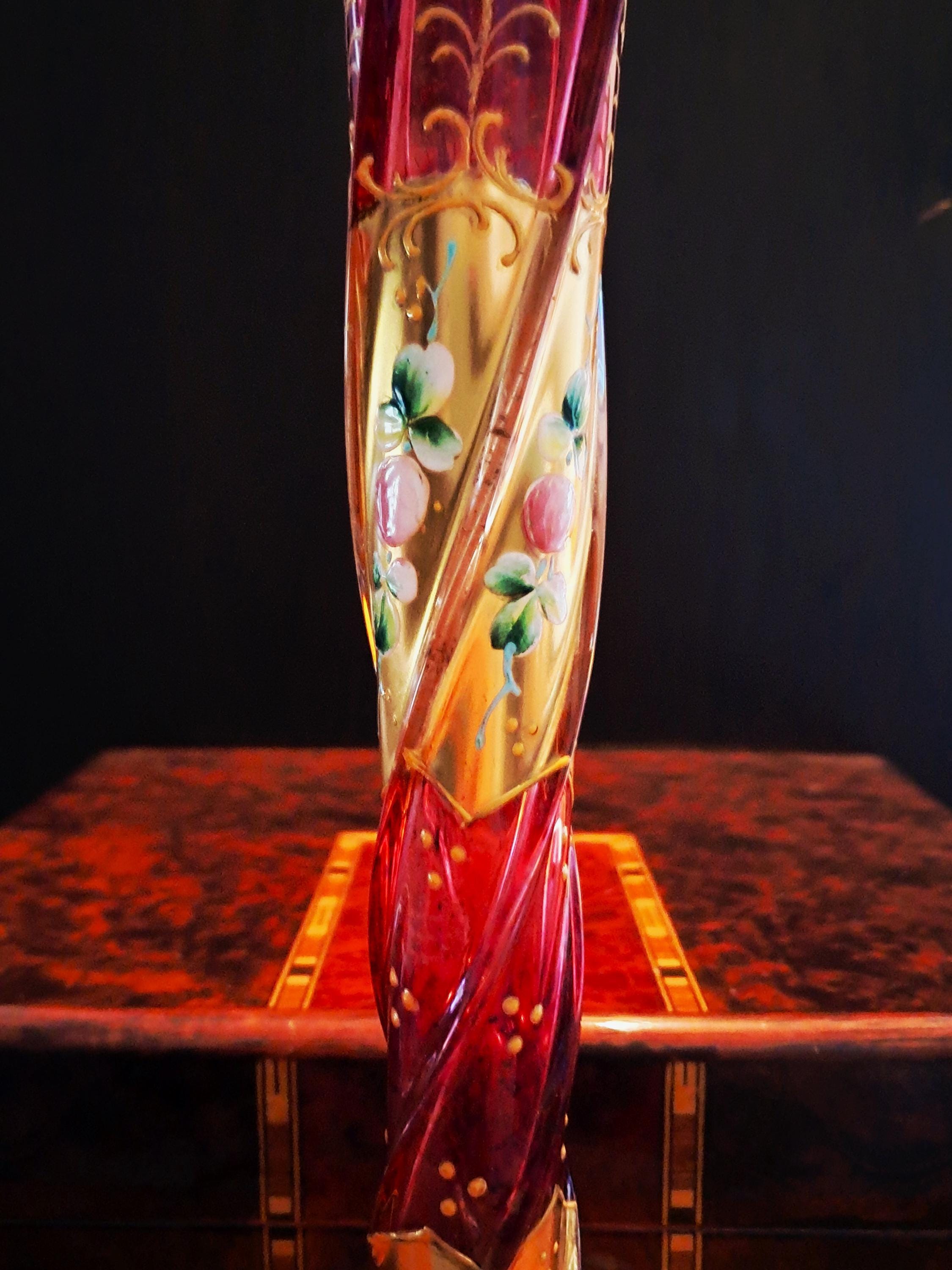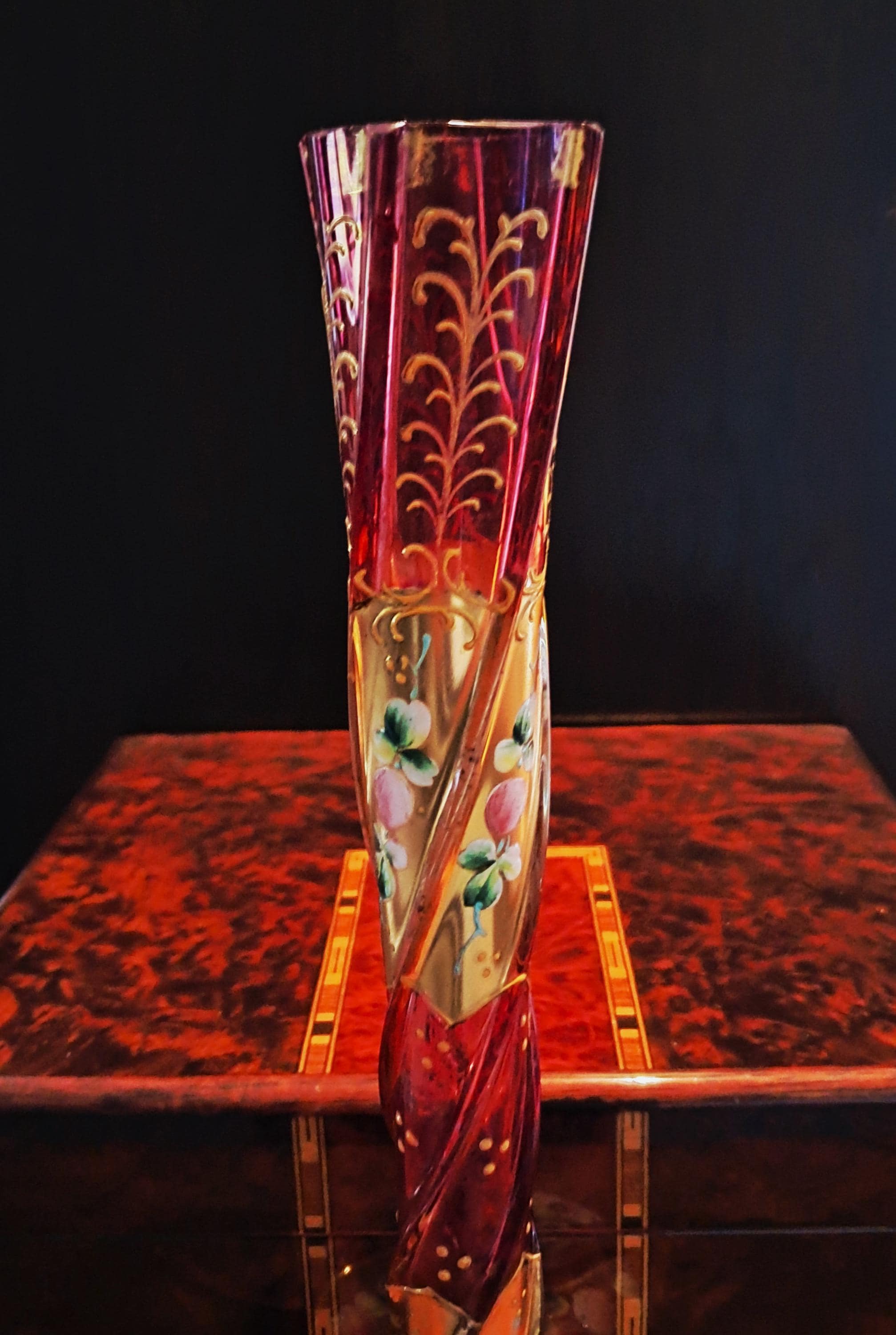 Four garland-shaped ribs wind around the vase from the four corners of the square-shaped base. The glass is ruby red throughout due to the addition of metal oxide. The partially applied gilding is decorated with the finest, detailed enamel painting. The sections that are not fully gilded are decorated with fine floral motifs in gold. The base of the vase has been sanded and polished several times. The Ludwig Moser glass finishing company was founded in Karlovy Vary in 1857 by Ludwig Moser, a glass cutter by trade and part of the Bohemian glass tradition. The Art Nouveau influence in his earlier glassware and the stylistic influence of New Objectivity and Art Deco are certainly also linked to Ludwig Moser's close relationship with the Wiener Werkstätte. In Austria, the Wiener Werkstätte had a similar influence on the development of design and was characterised by the same ideas as the Werkbund or the Bauhaus in Weimar in Germany at the same time. Dimensions: Height 30 cm, width 8 cm Condition: The vase is in very good condition considering its age. No chipping on the base or upper rim. Apart from the upper rim (heavy abrasion), the gilding is still very good. See also the photos for the condition.