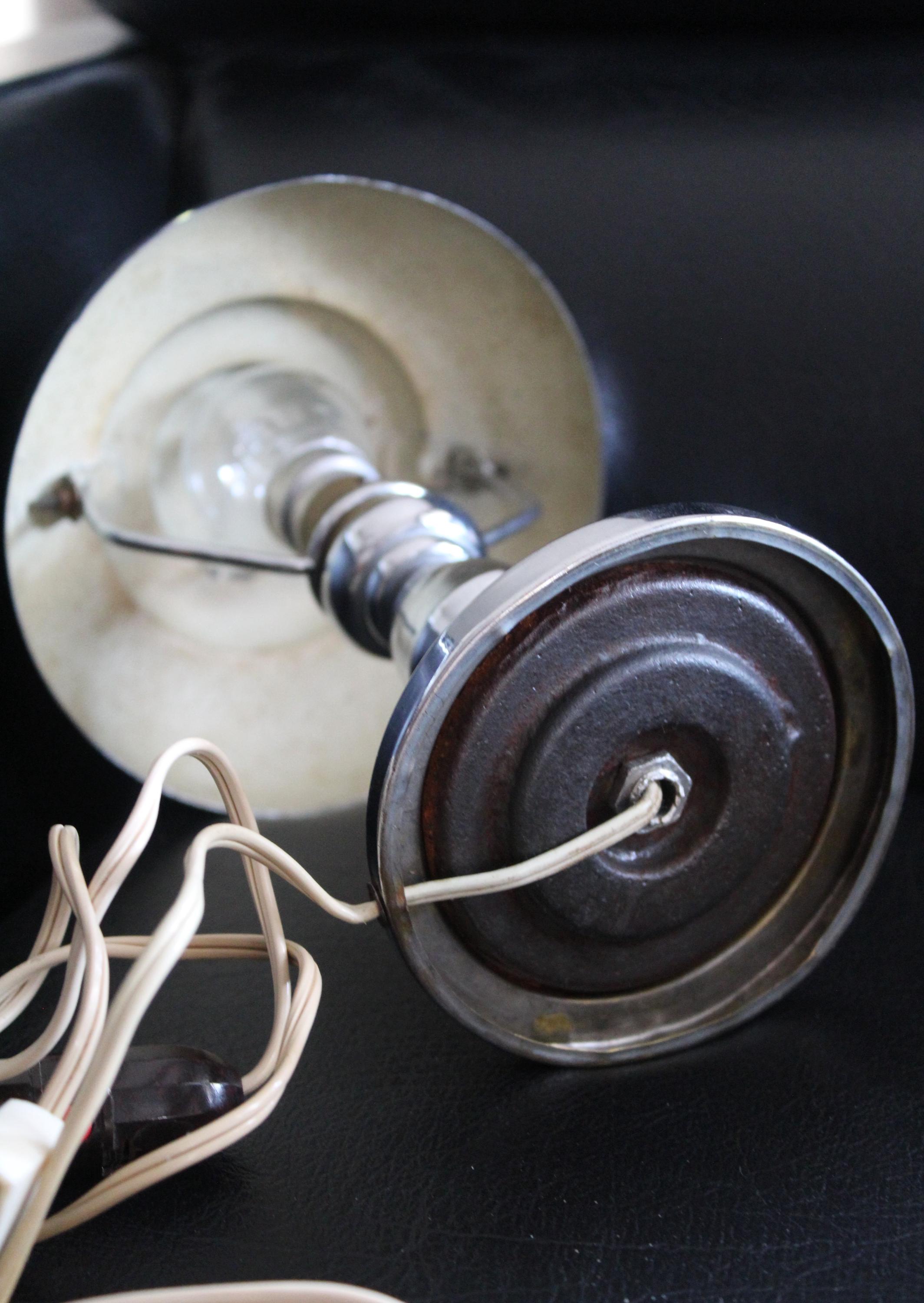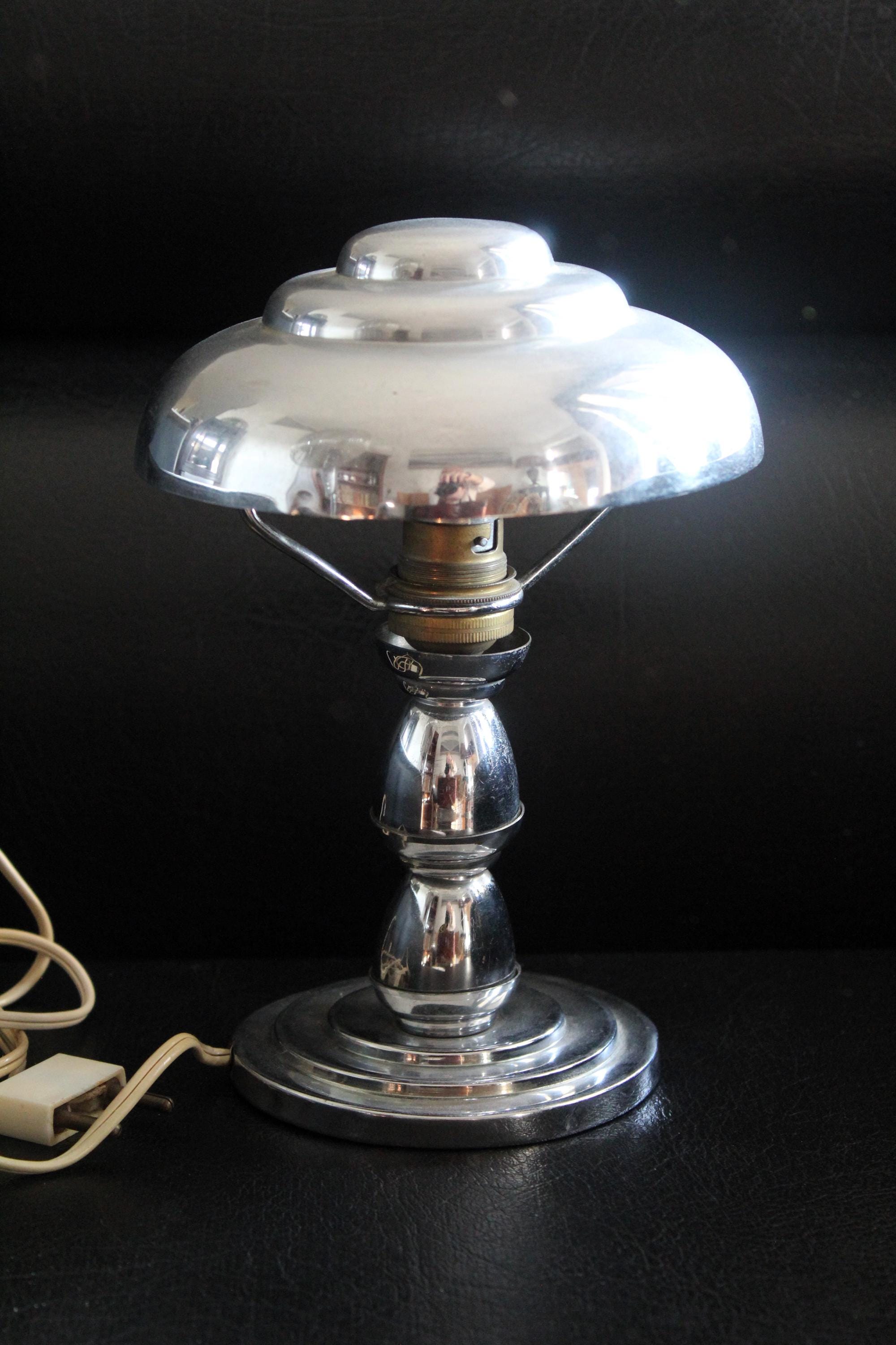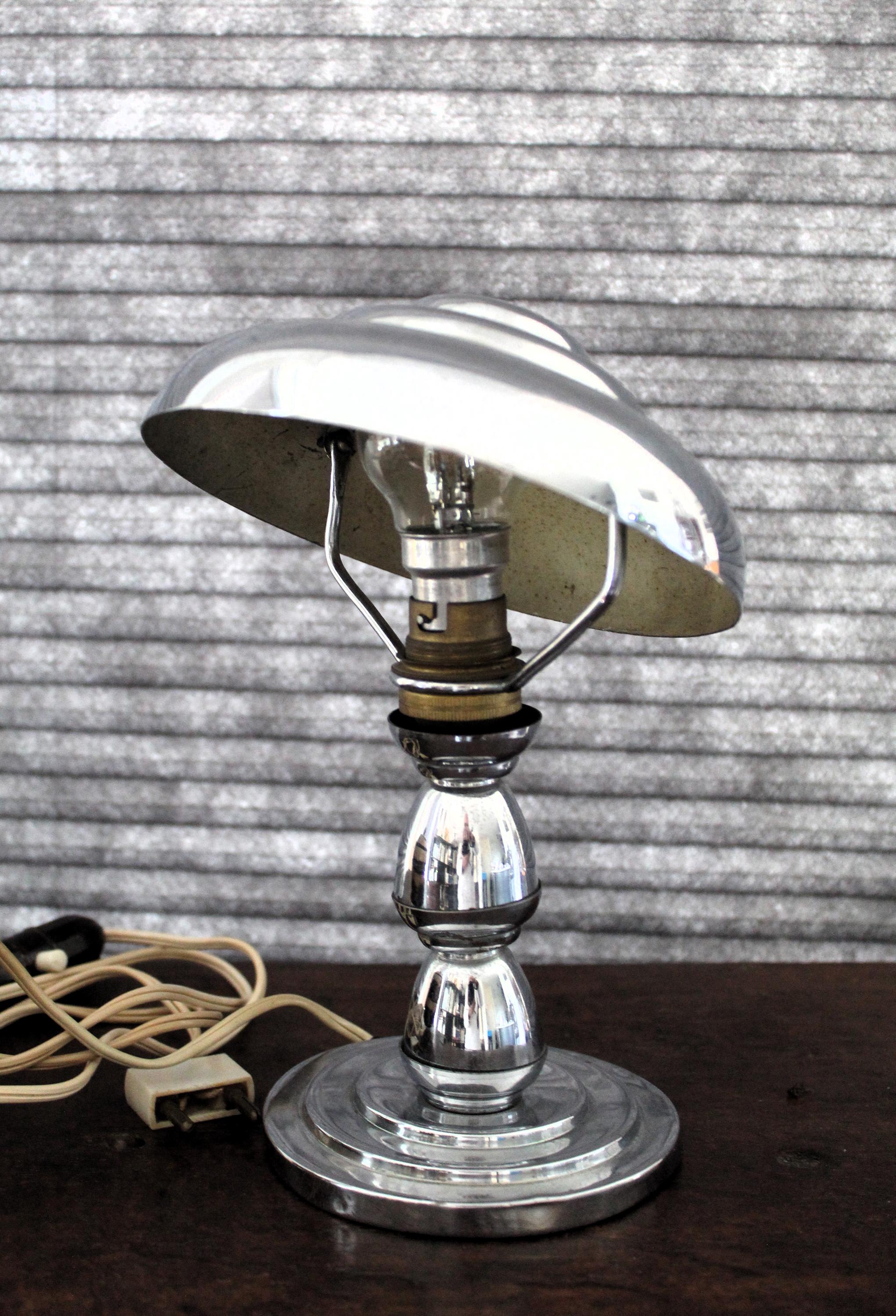 This small mushroom lamp comes from France and has been fitted with a new cable and switch. A pretty little reading lamp or atmospheric lamp with a charming vintage character. Condition: Lamp works perfectly and shows patina and signs of use after so many years, but no damage. Dimensions: Height 22 cm, diameter lampshade 15 cm