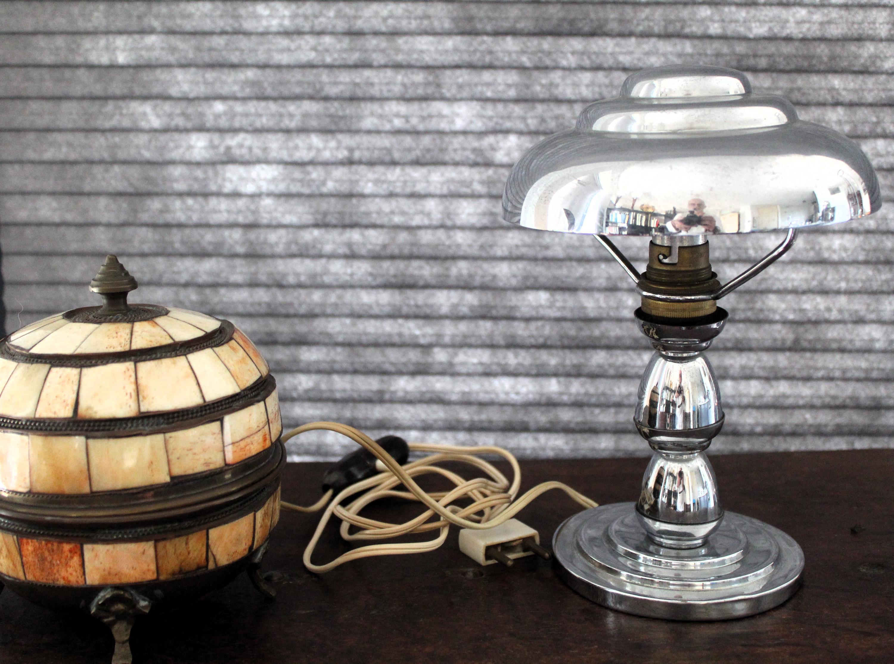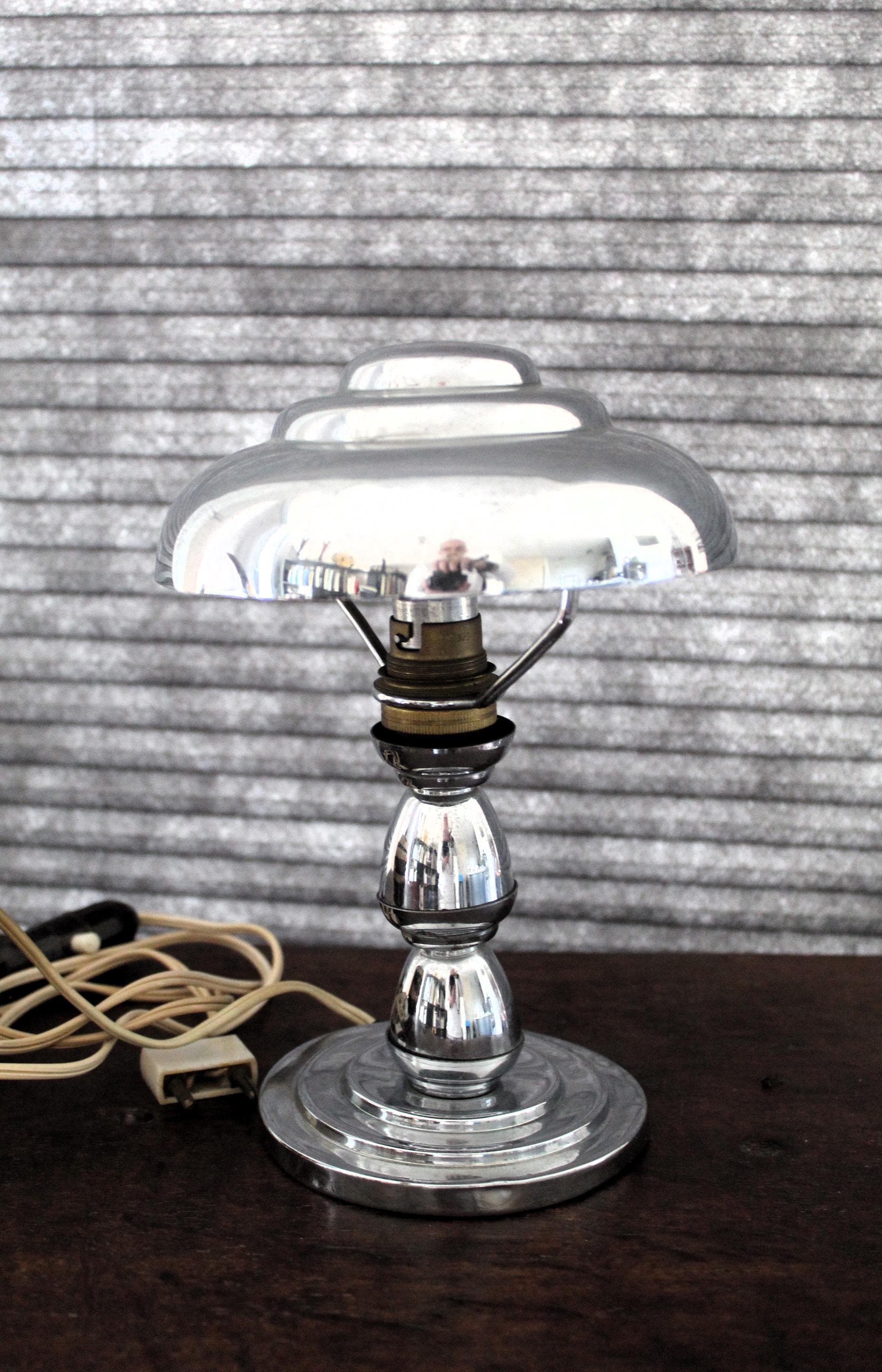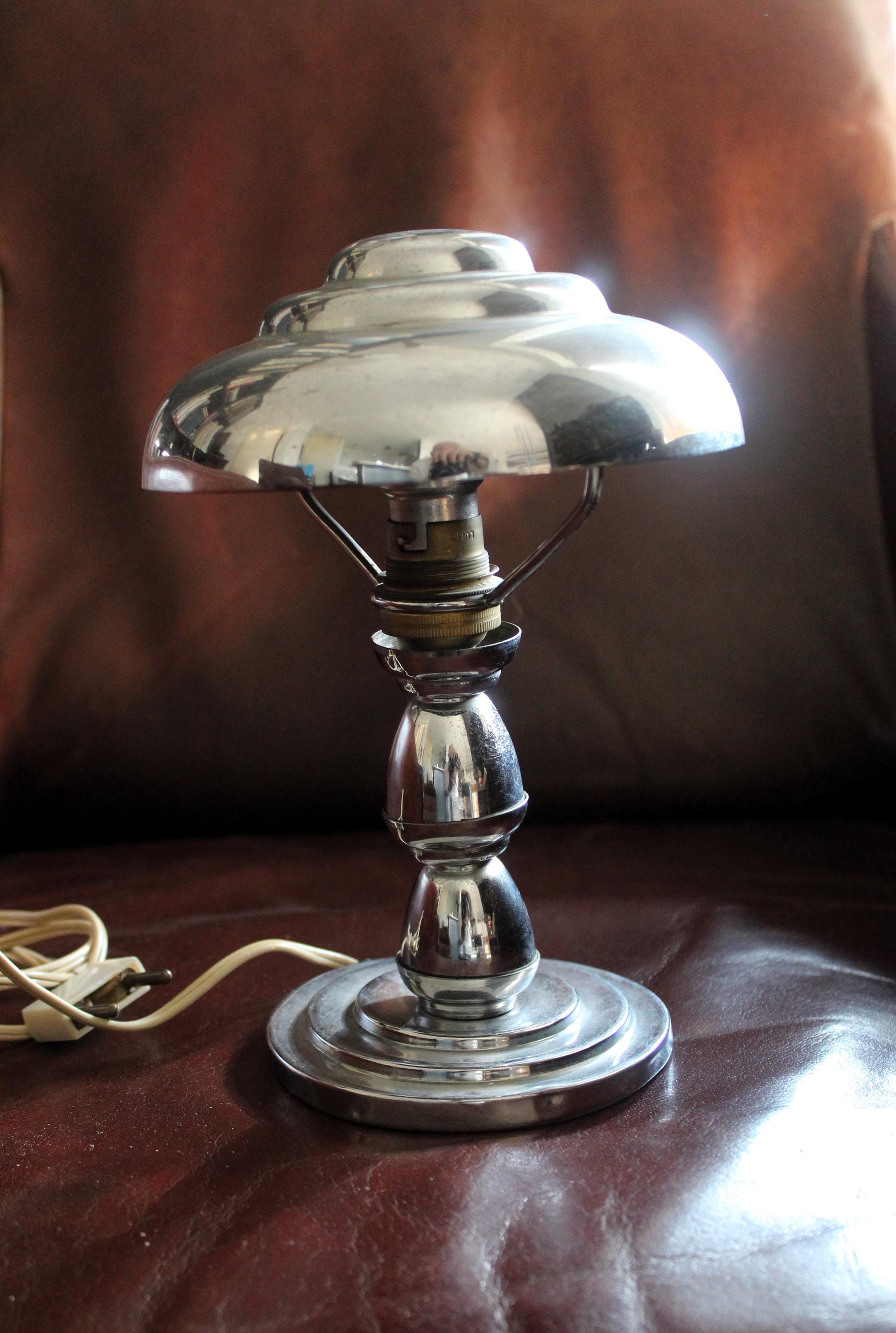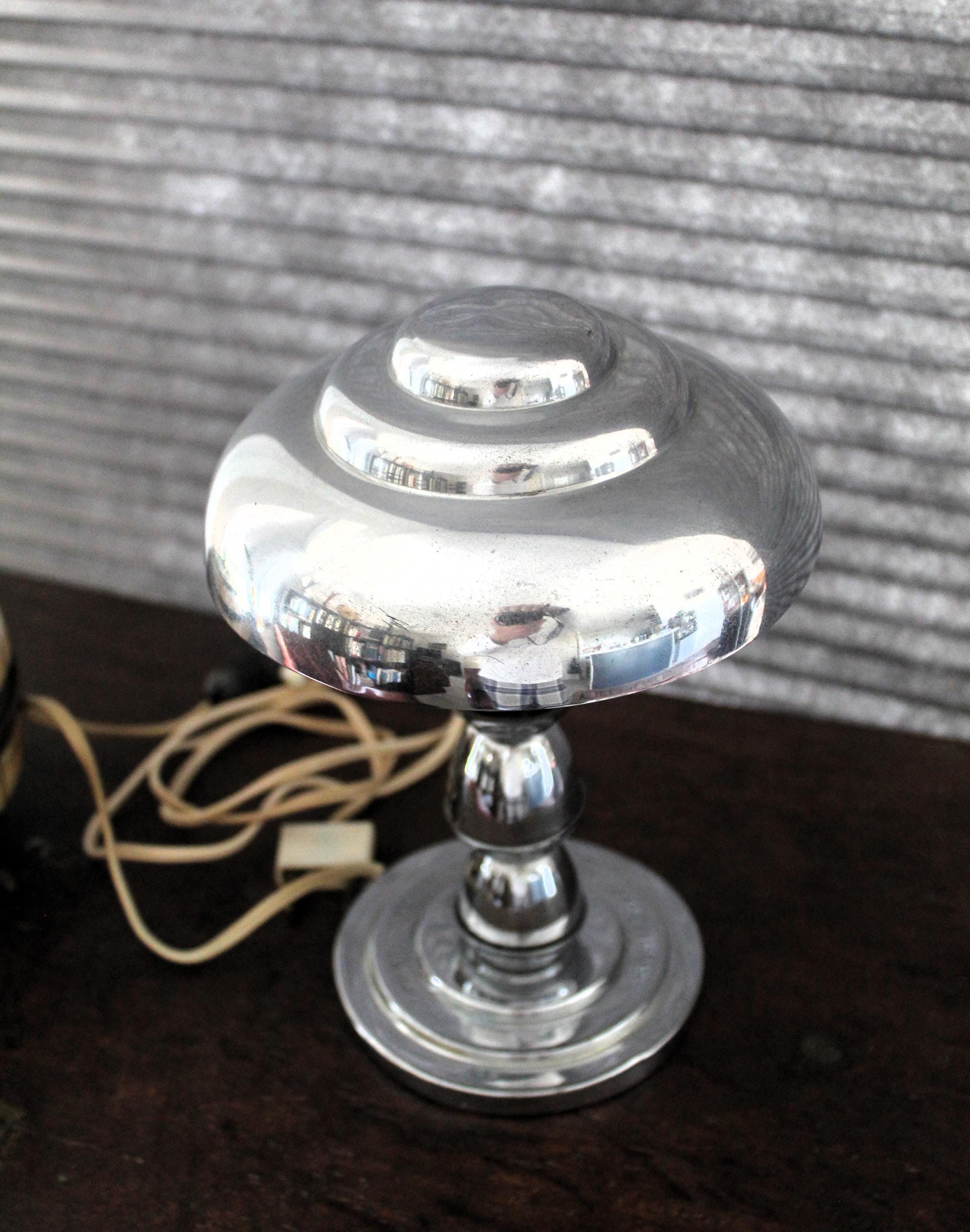 This small mushroom lamp comes from France and has been fitted with a new cable and switch. A pretty little reading lamp or atmospheric lamp with a charming vintage character. Condition: Lamp works perfectly and shows patina and signs of use after so many years, but no damage. Dimensions: Height 22 cm, diameter lampshade 15 cm