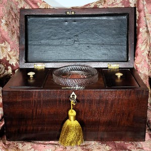 This small jewellery box is a piece of jewellery. The front shows aspects of Art Deco, but if you look at the lid with the applications made of solid silver, you can see Art Nouveau elements. Therefore, this box was probably made in the transitional period between the 1920s and 1930s. Condition: Good condition, only one bakelite knob in the middle of the front is missing. Dimensions: Width 15 cm, Depth 9 cm, Height 5 cm