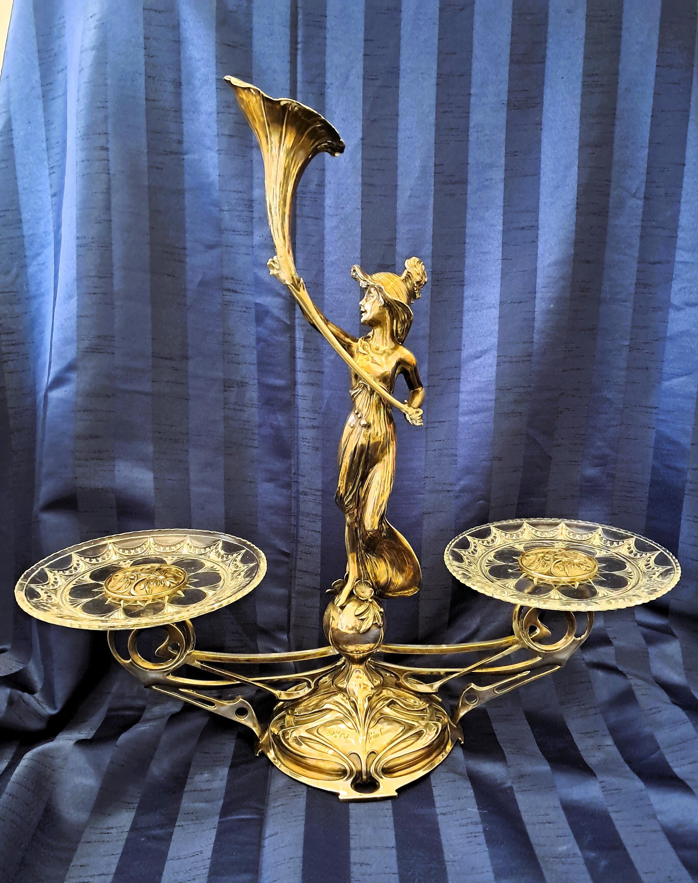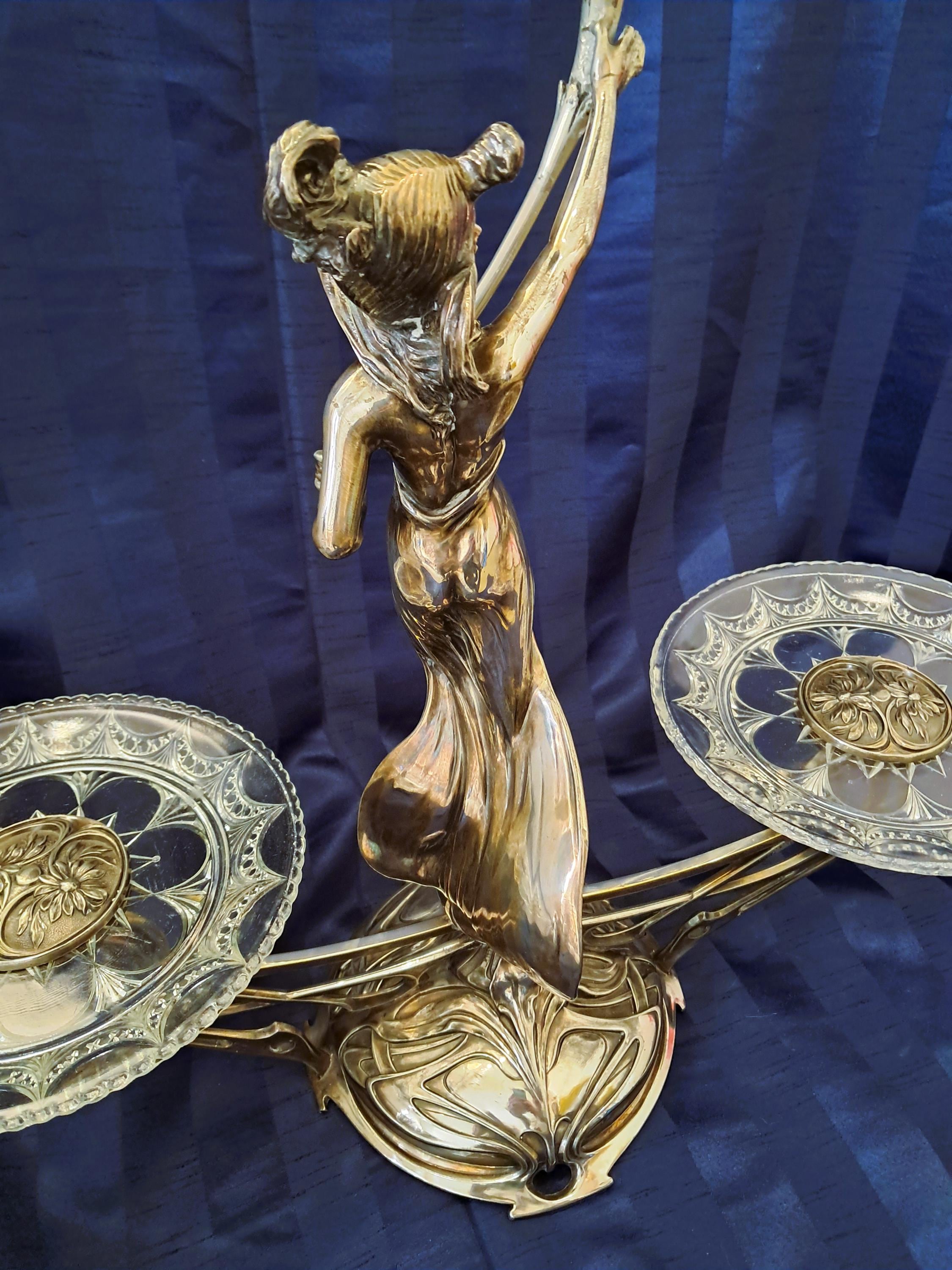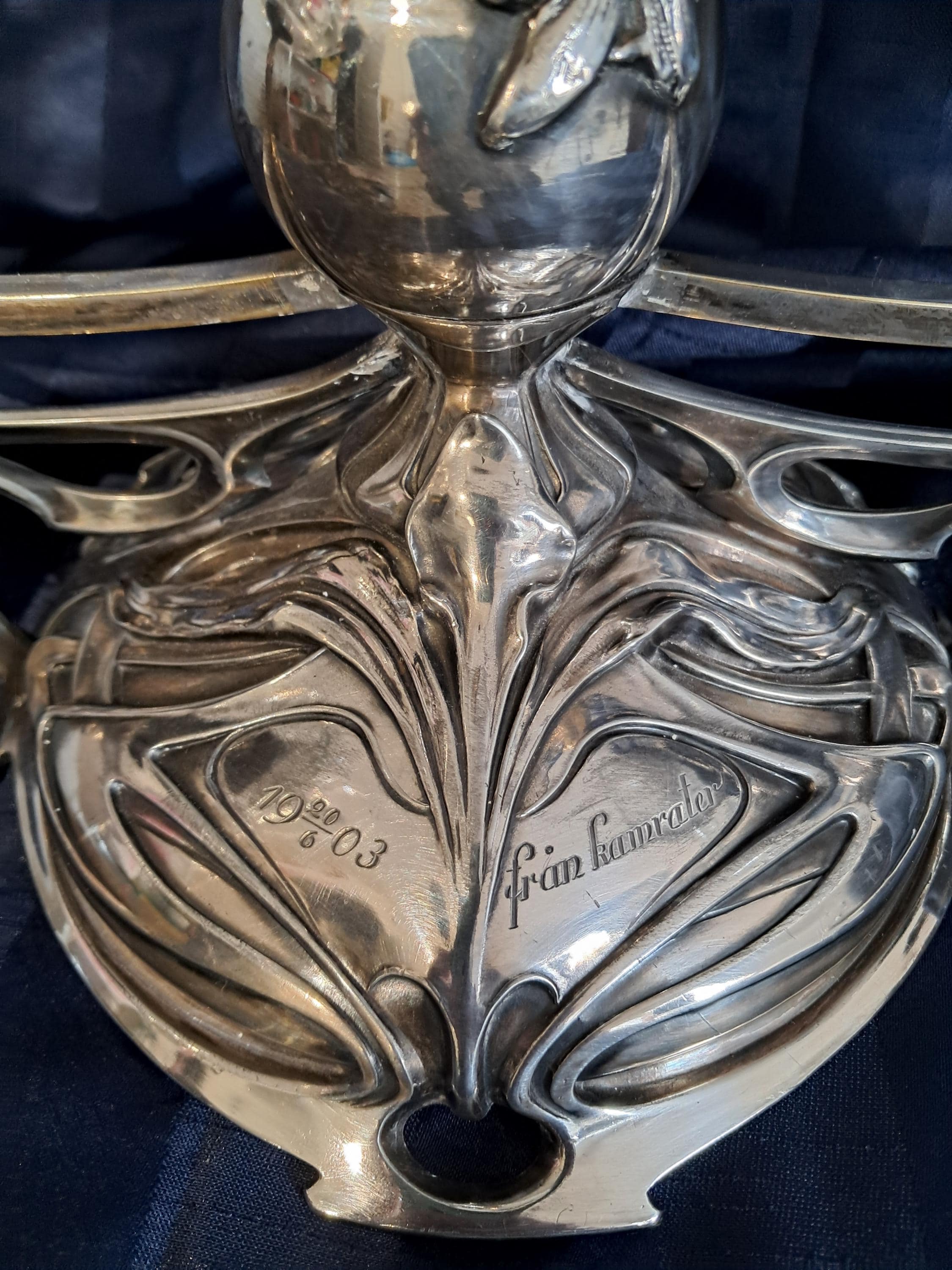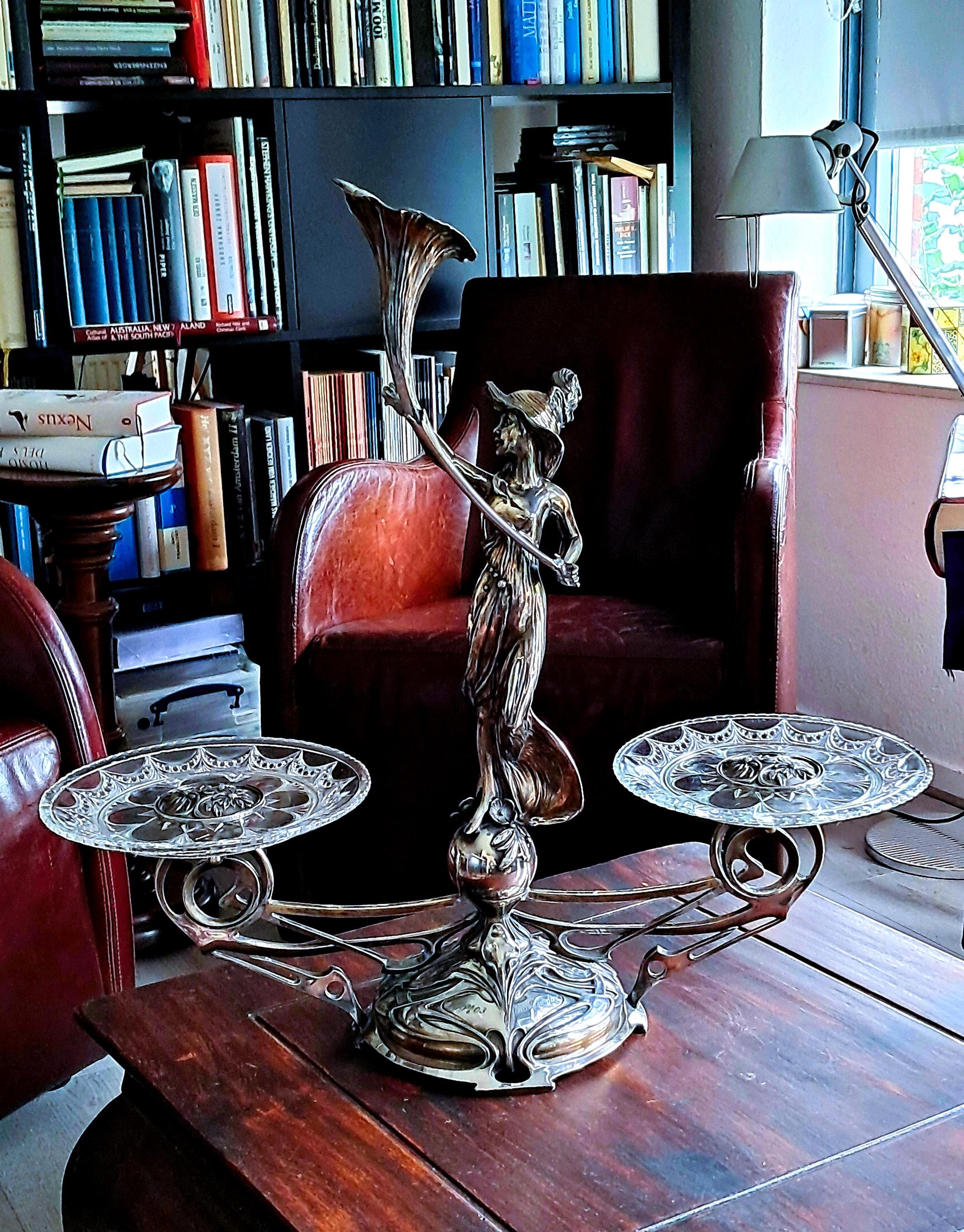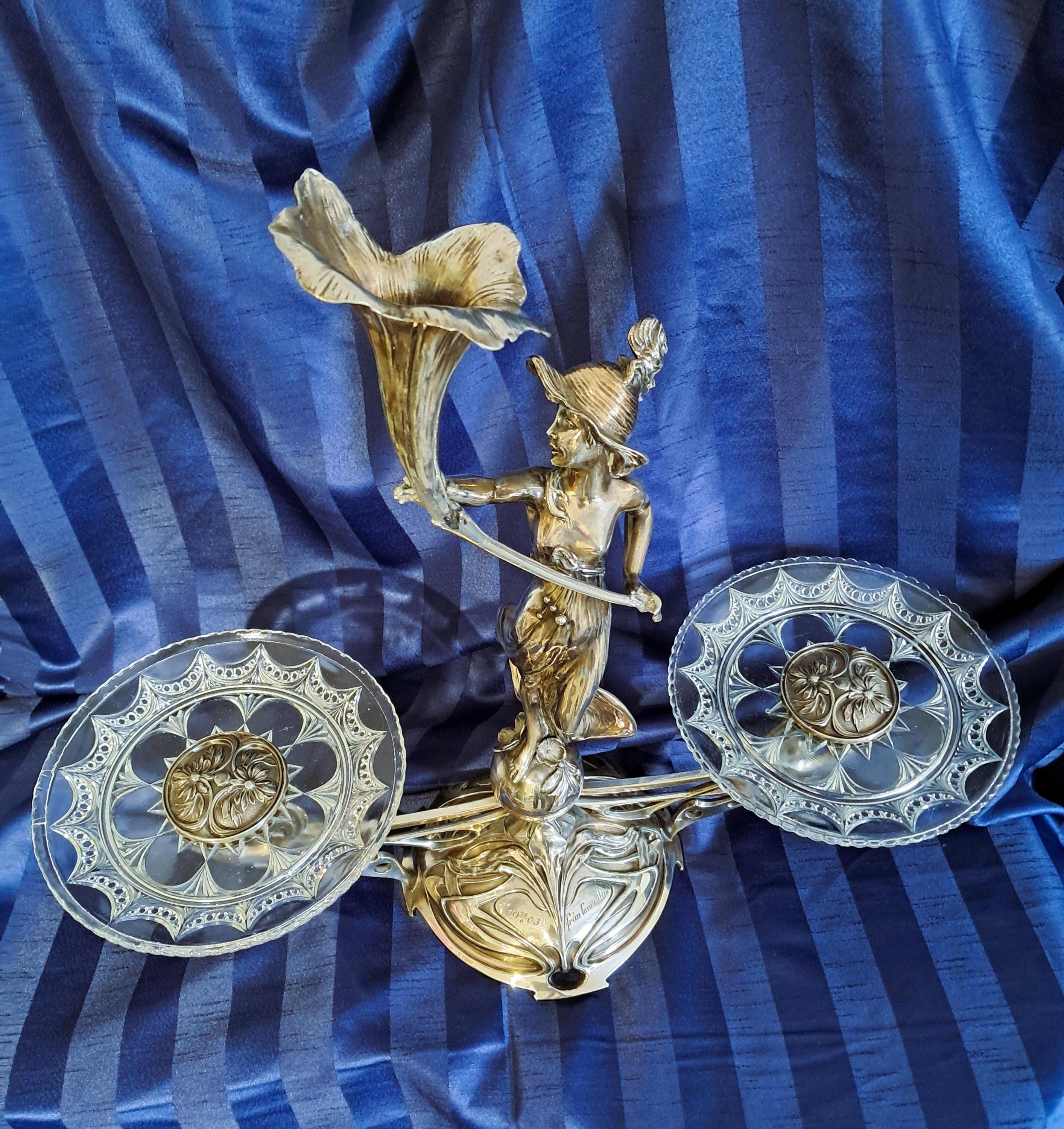 Two-armed silver-plated centrepiece with standing female figure holding the mythical cornucopia. Made around 1900 (engraving on the front with the date of a gift for a valued person, ‘Dear Comrade,’ 20 June 1903). Floral ornamental decoration, 2 glass inserts with etched motifs. Swedish manufacturer's mark on the bottom. Will be disassembled for safe shipping and delivered with all screws, etc. Condition: Age-related patina and signs of wear (localised abrasion of the silver plating), but in good and stable condition considering its age. (See photos) Dimensions: Height 59 cm, width 61 cm, depth 22 cm Customers from the USA: Please contact us before purchasing in connection with the customs duties levied on goods from the EU from 29 August 2025.