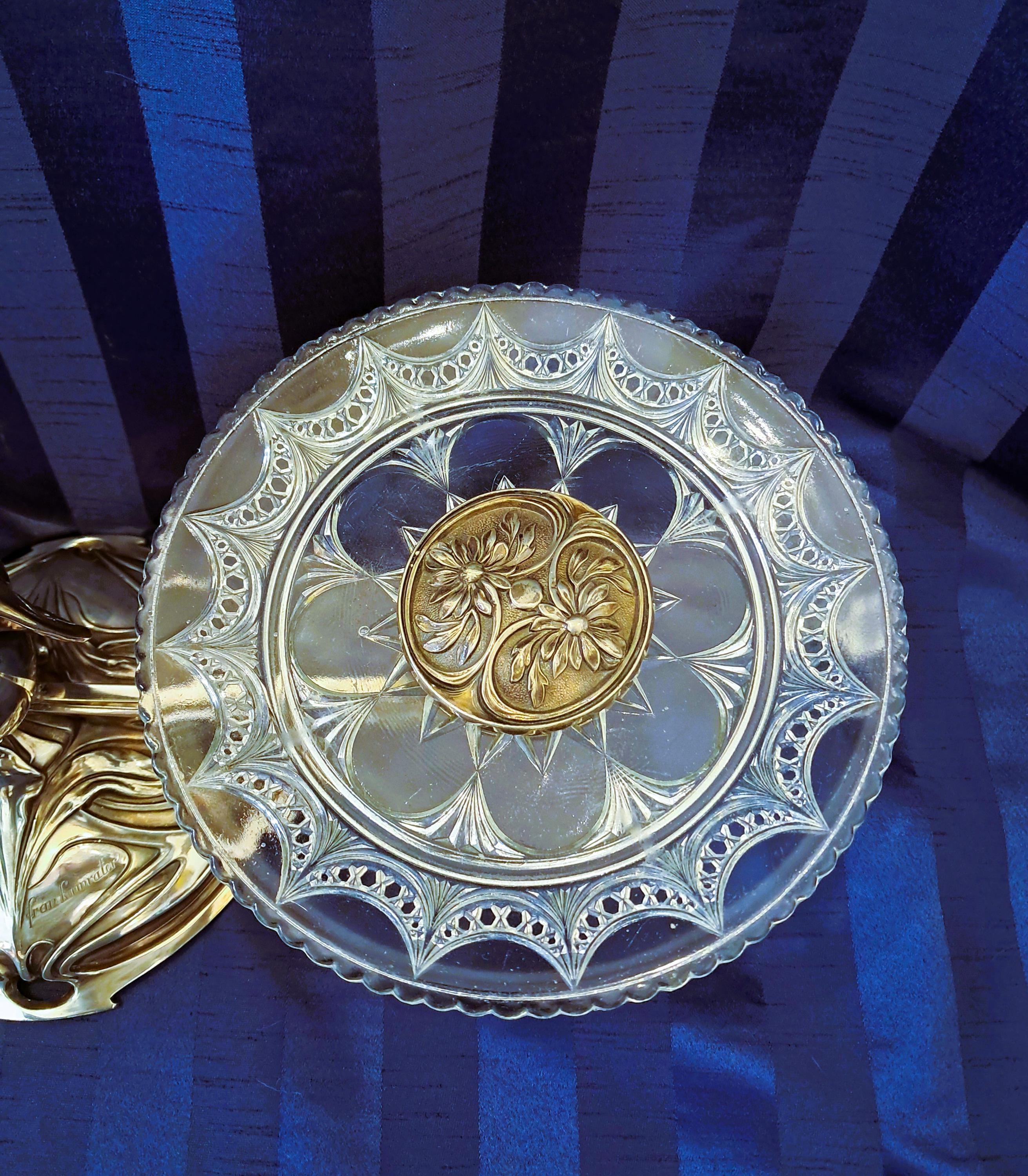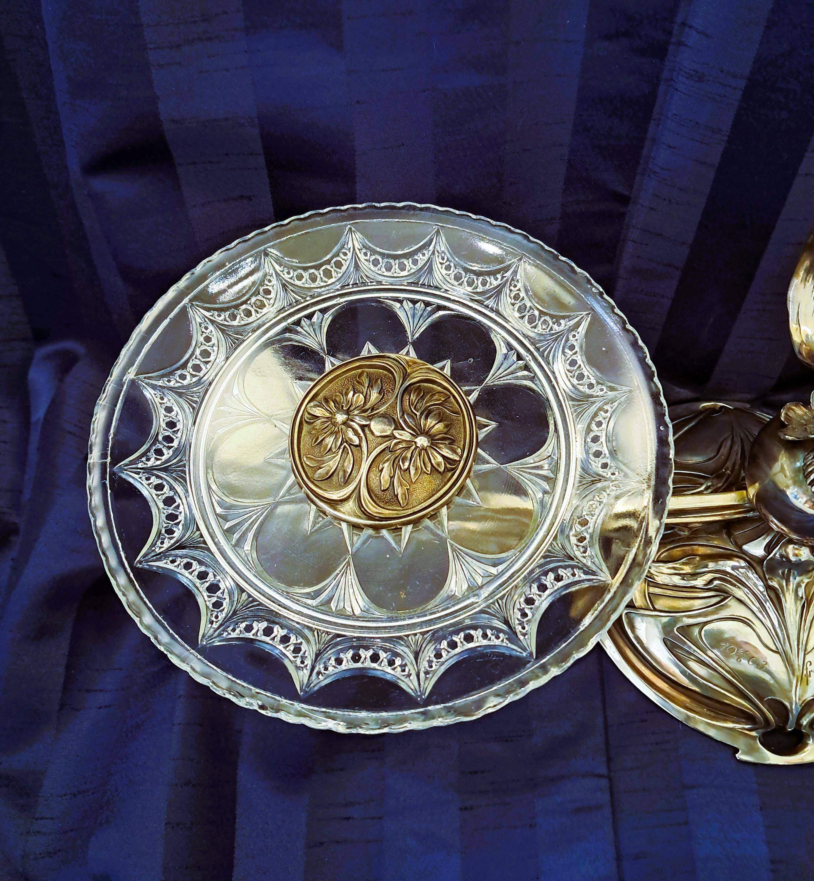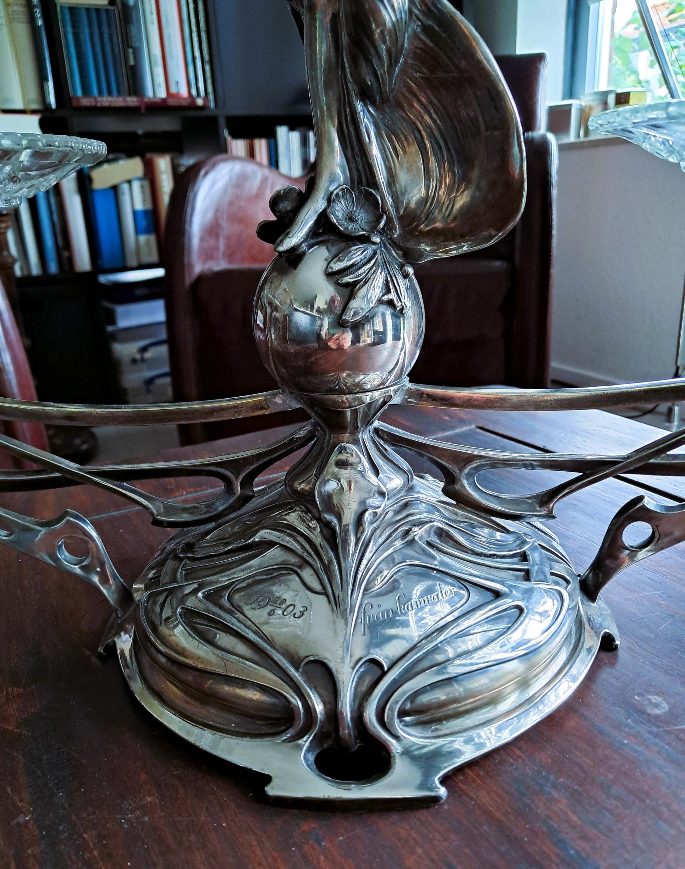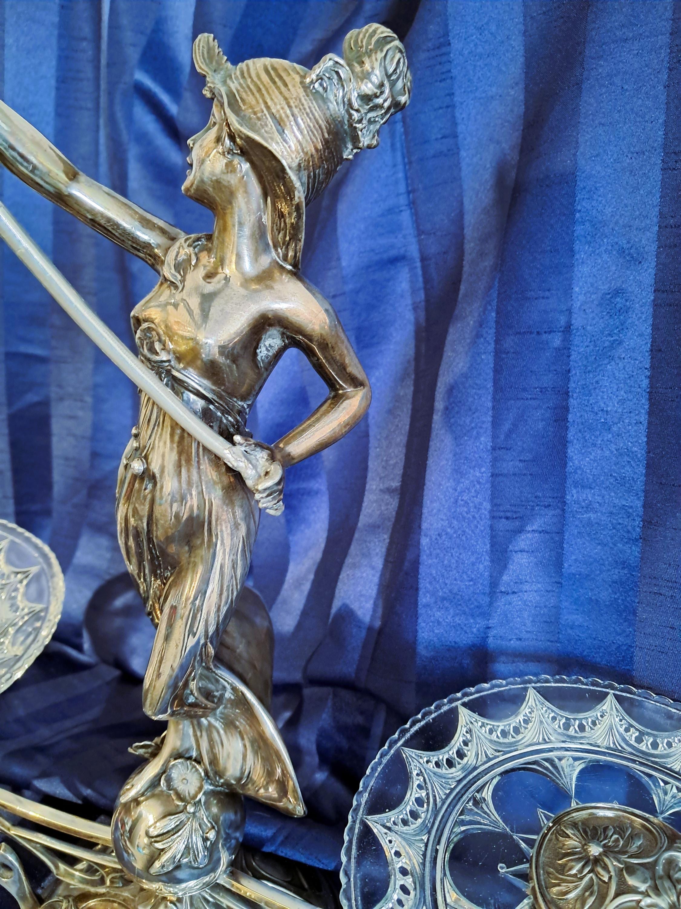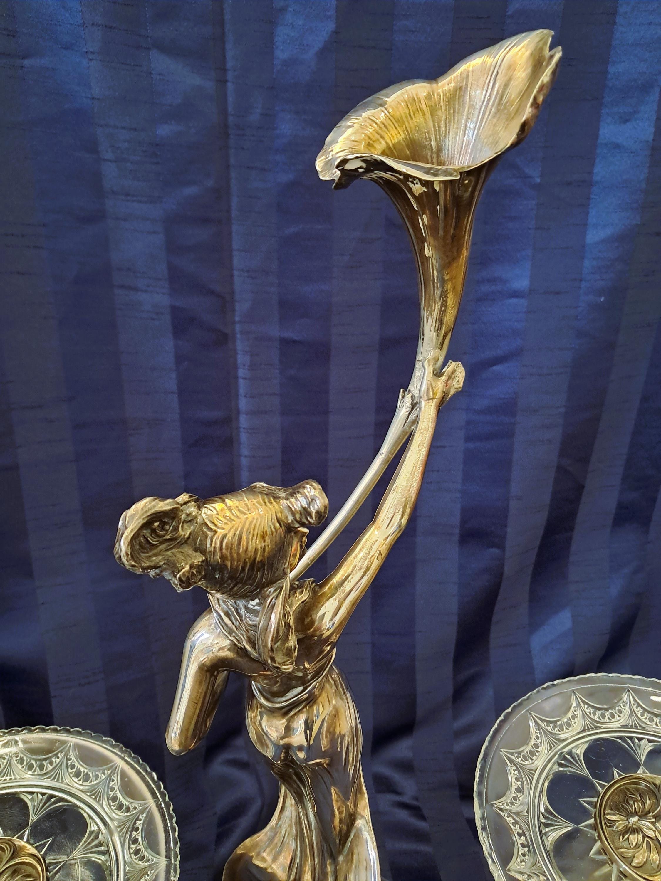 Two-armed silver-plated centrepiece with standing female figure holding the mythical cornucopia. Made around 1900 (engraving on the front with the date of a gift for a valued person, ‘Dear Comrade,’ 20 June 1903). Floral ornamental decoration, 2 glass inserts with etched motifs. Swedish manufacturer's mark on the bottom. Will be disassembled for safe shipping and delivered with all screws, etc. Condition: Age-related patina and signs of wear (localised abrasion of the silver plating), but in good and stable condition considering its age. (See photos) Dimensions: Height 59 cm, width 61 cm, depth 22 cm Customers from the USA: Please contact us before purchasing in connection with the customs duties levied on goods from the EU from 29 August 2025.