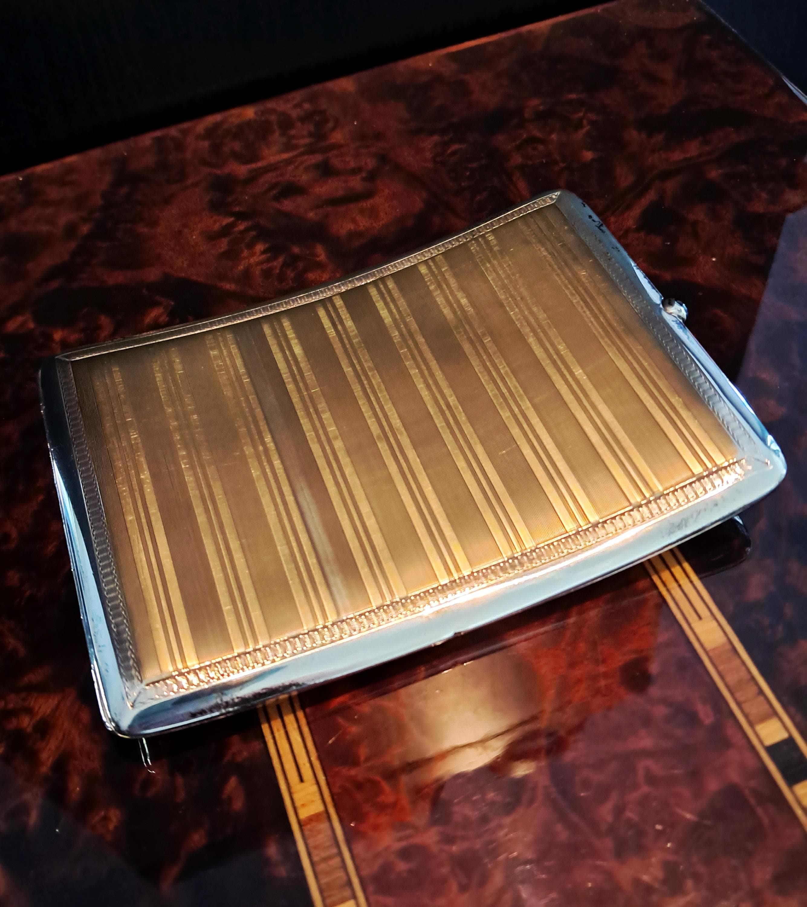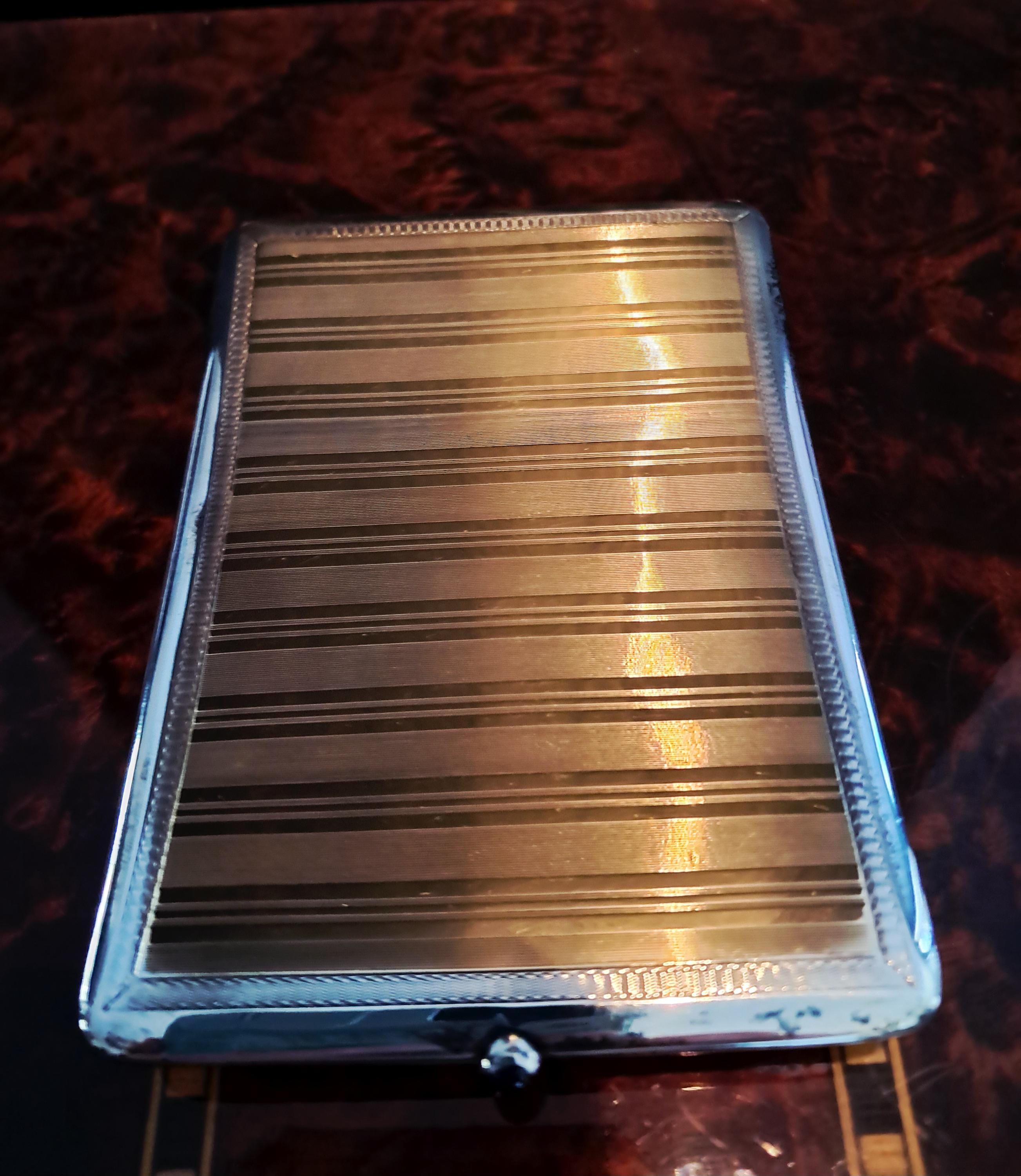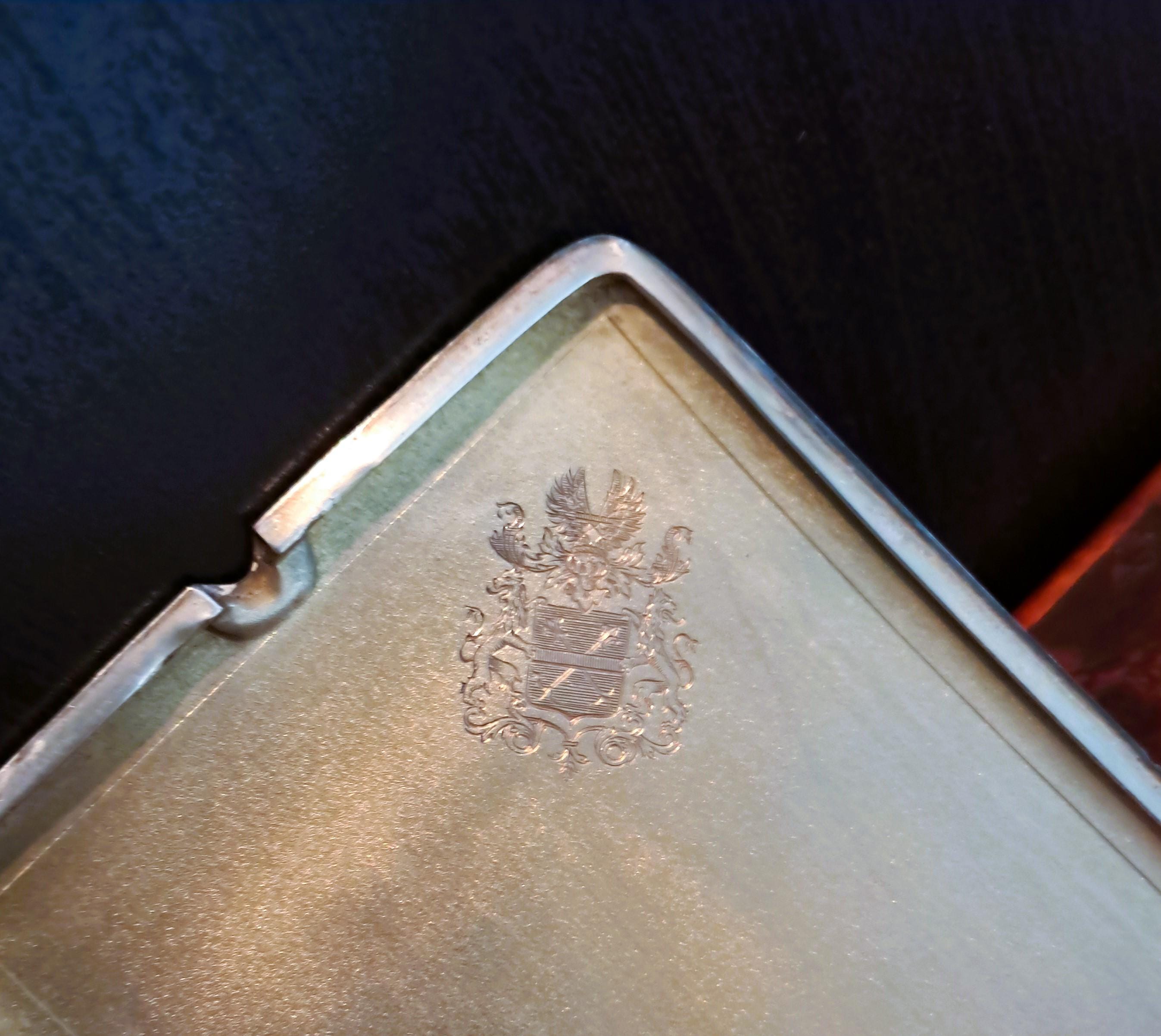 This elegant cigarette case has a slightly curved shape that makes it easy to carry. Base material 830 silver (tested) and the engraved inner rectangle with decorative border heavily gold-plated. The clasp is set with a blue gemstone in cabochon cut. The inside of the case is also gold-plated and engraved with a coat of arms. Condition: Good condition. Minor signs of wear and abrasion. Mechanism in perfect working order. Unfortunately, the manufacturer's mark on the side could not be identified. Dimensions: Width including clasp 11.5 cm, depth 8 cm, height 0.8 cm - Weight: 125 grams Customers from the USA: Please contact us before purchasing in connection with the customs duties applicable to goods from the EU from 29 August 2025.