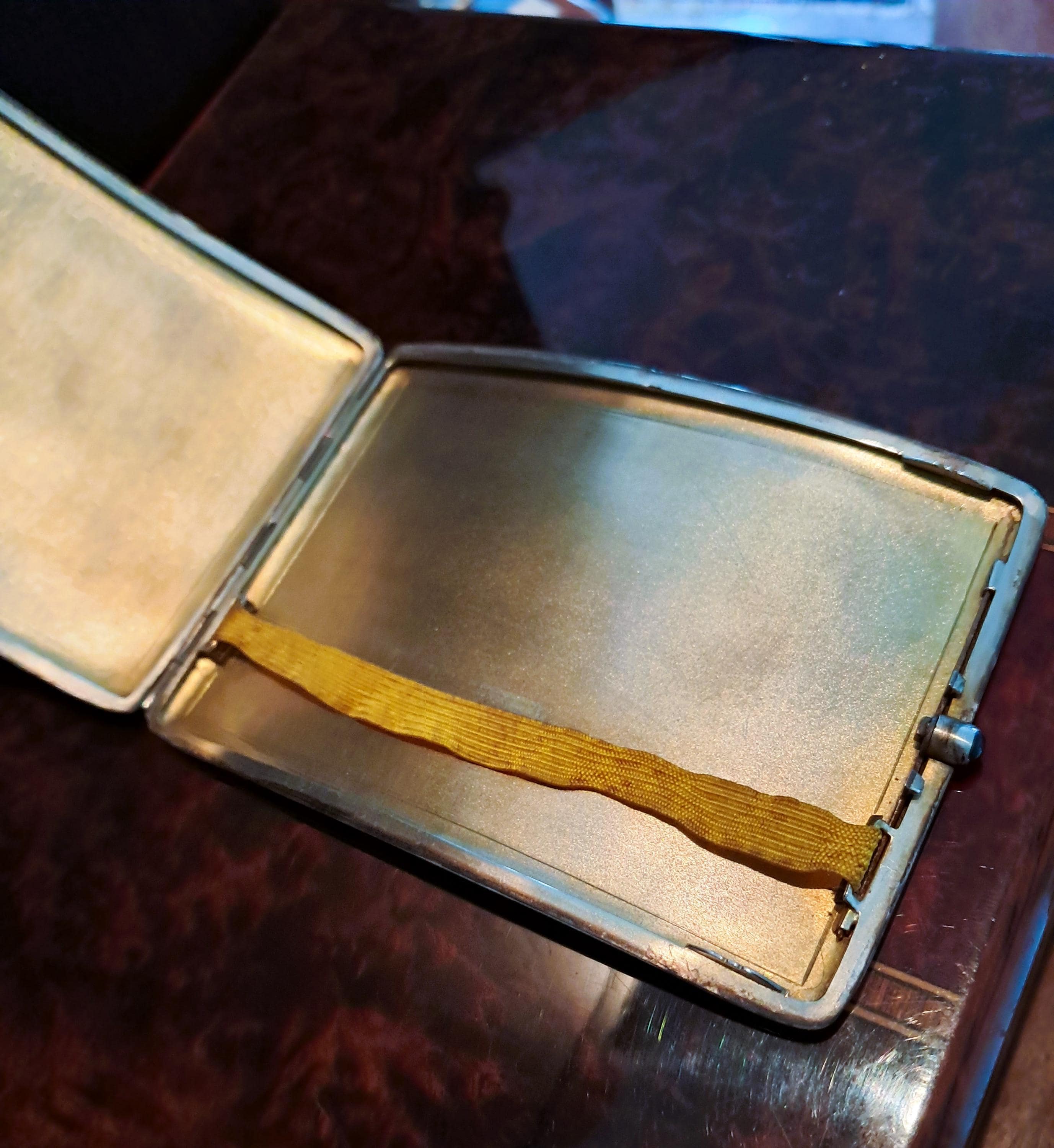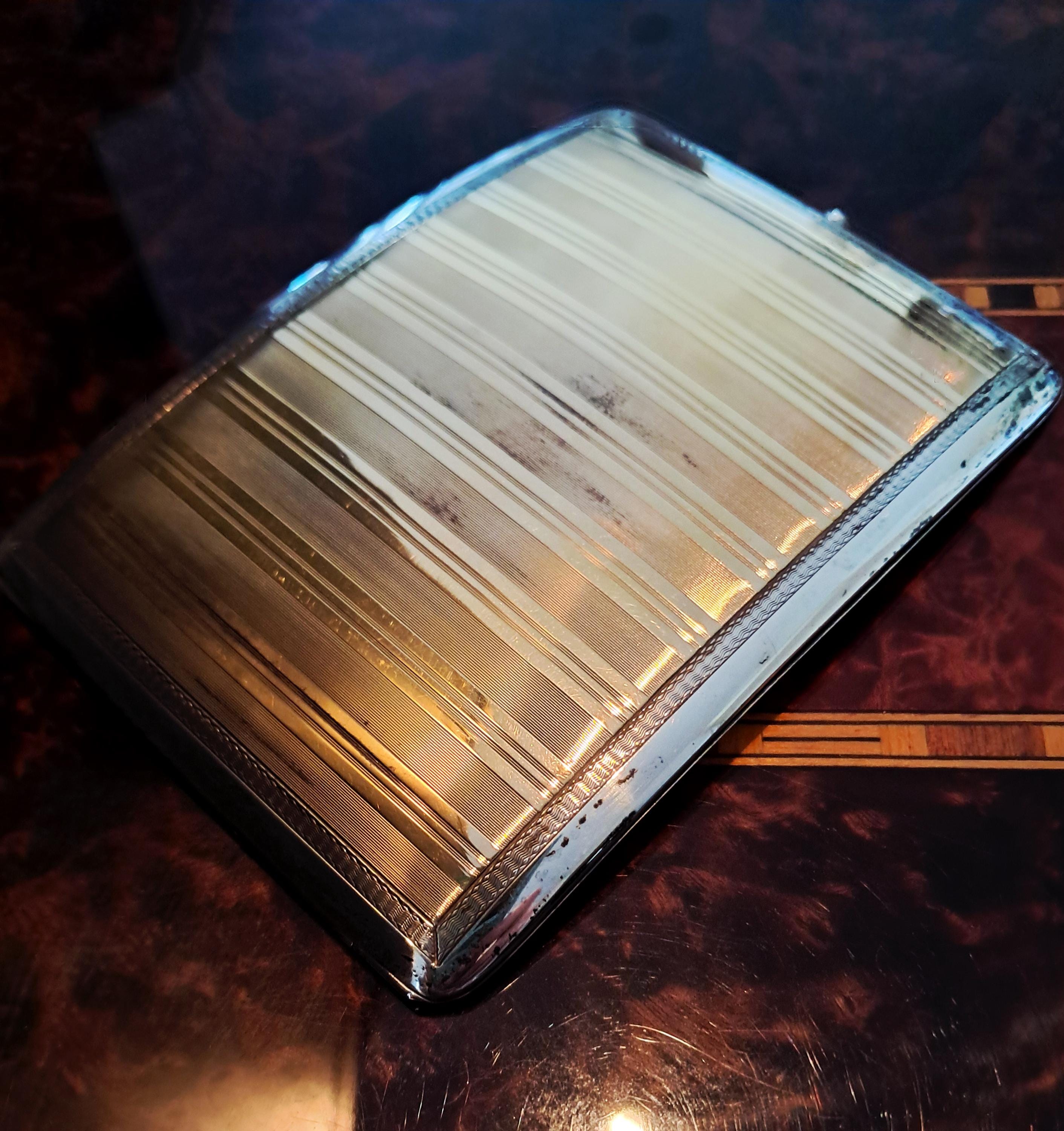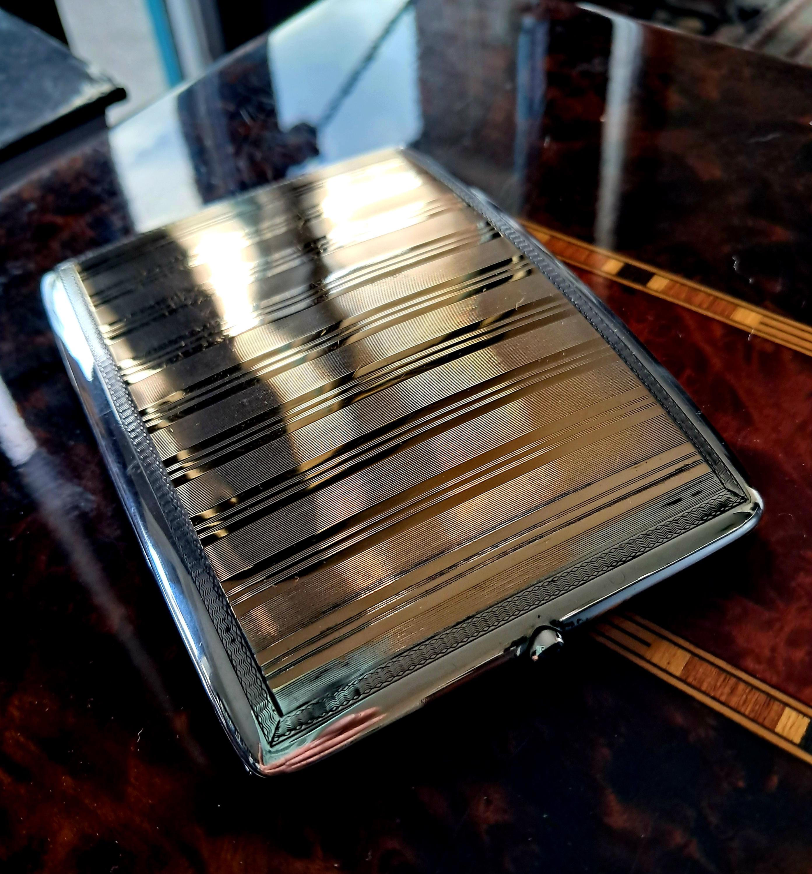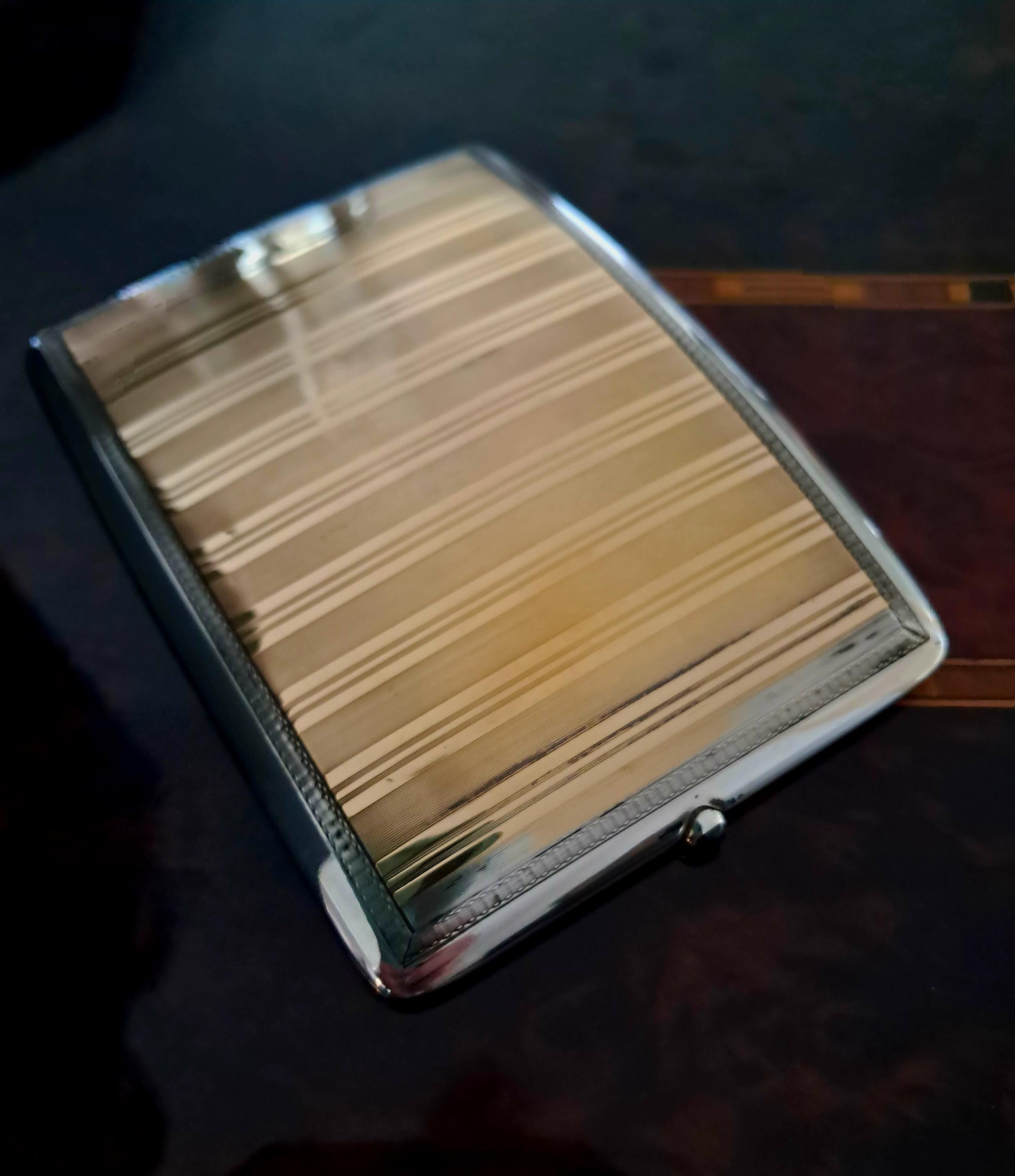 This elegant cigarette case has a slightly curved shape that makes it easy to carry. Base material 830 silver (tested) and the engraved inner rectangle with decorative border heavily gold-plated. The clasp is set with a blue gemstone in cabochon cut. The inside of the case is also gold-plated and engraved with a coat of arms. Condition: Good condition. Minor signs of wear and abrasion. Mechanism in perfect working order. Unfortunately, the manufacturer's mark on the side could not be identified. Dimensions: Width including clasp 11.5 cm, depth 8 cm, height 0.8 cm - Weight: 125 grams Customers from the USA: Please contact us before purchasing in connection with the customs duties applicable to goods from the EU from 29 August 2025.
