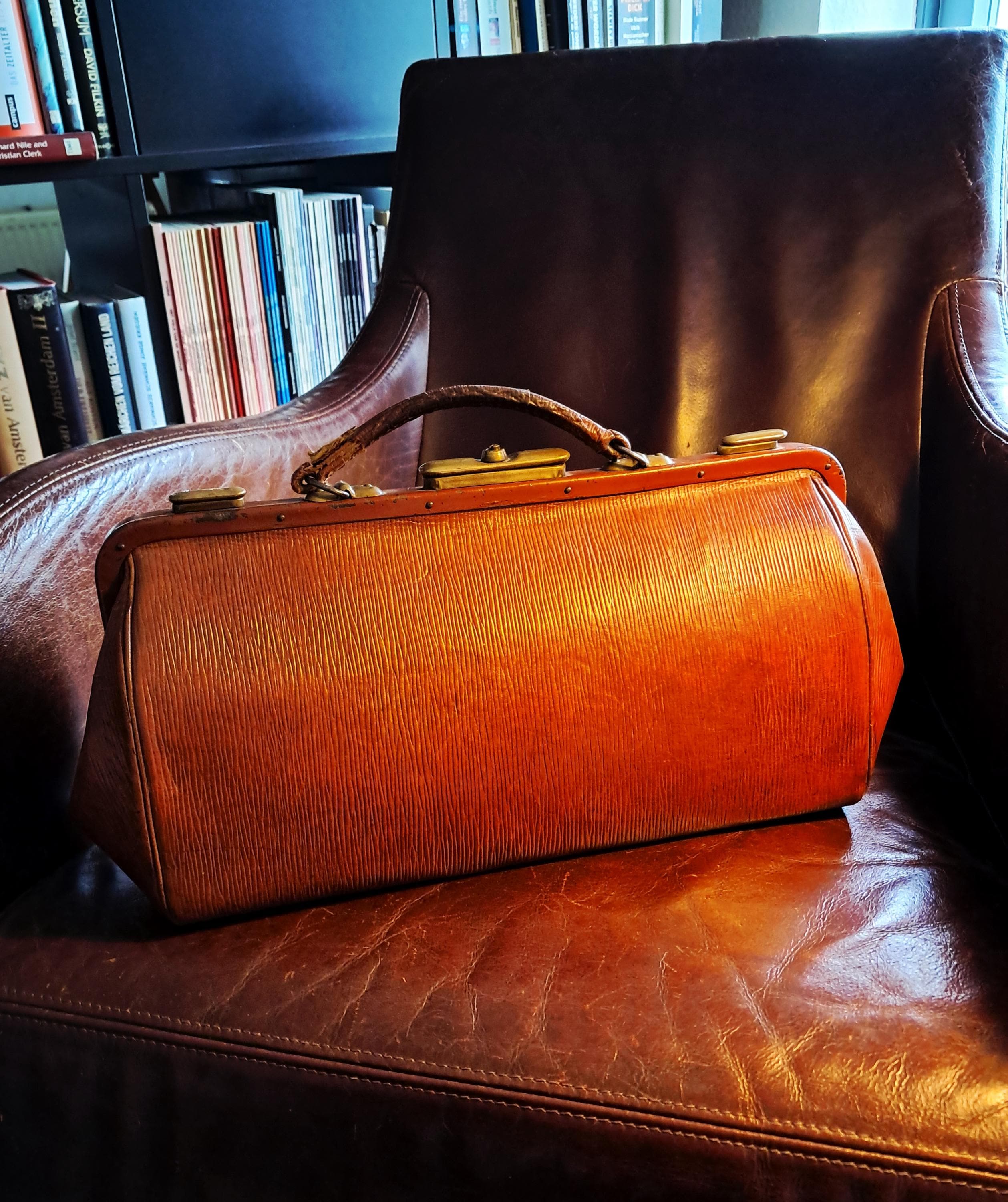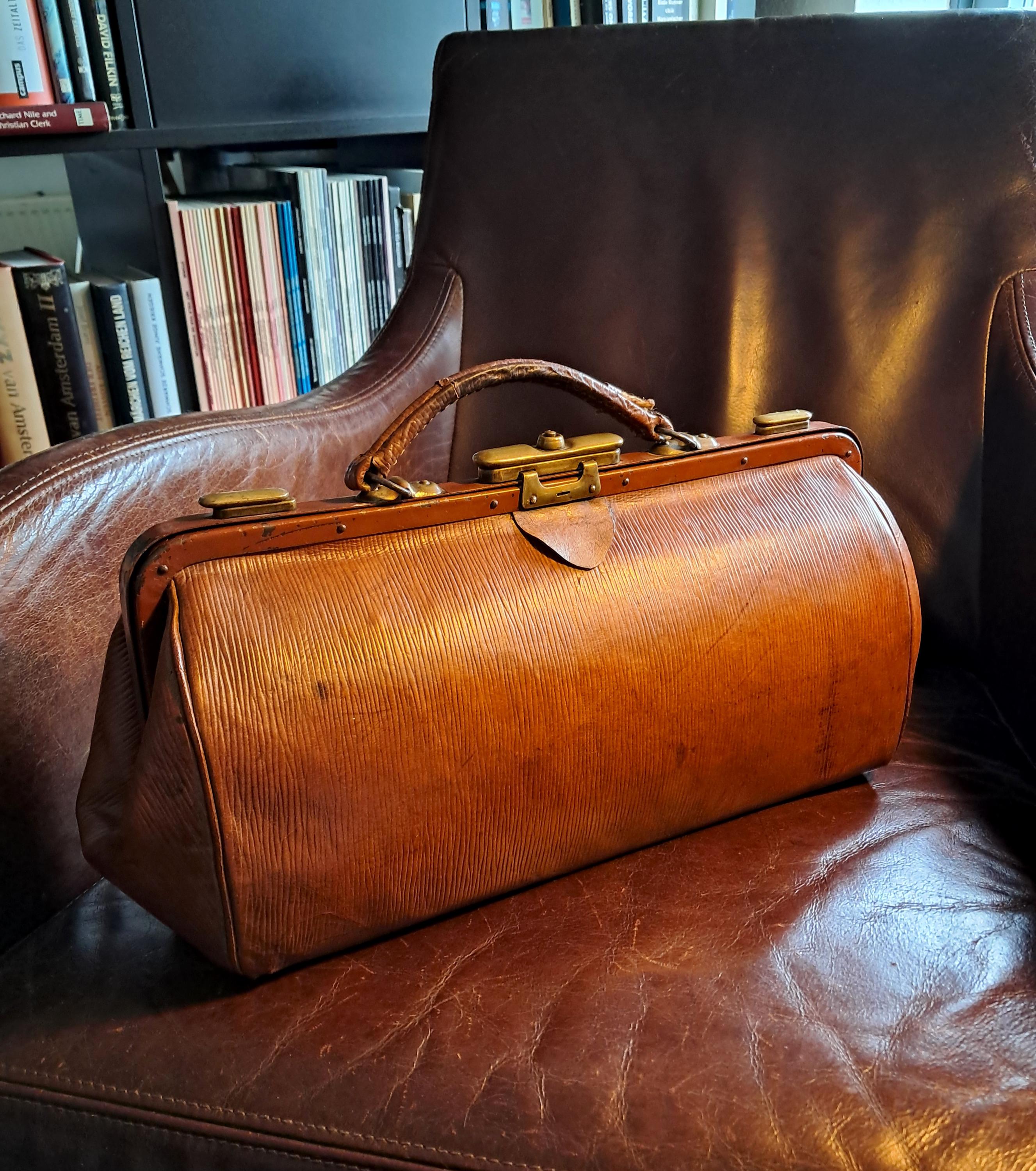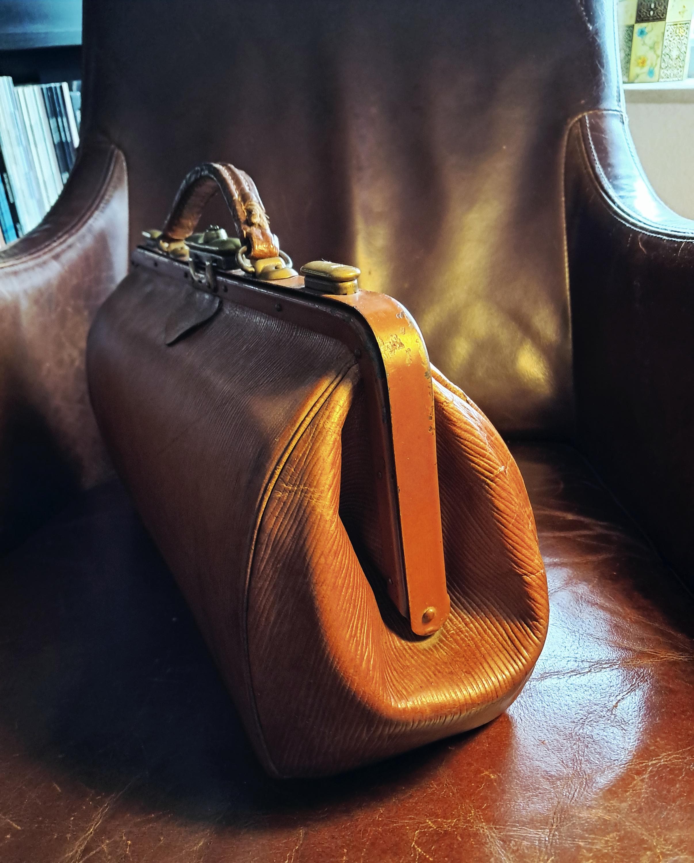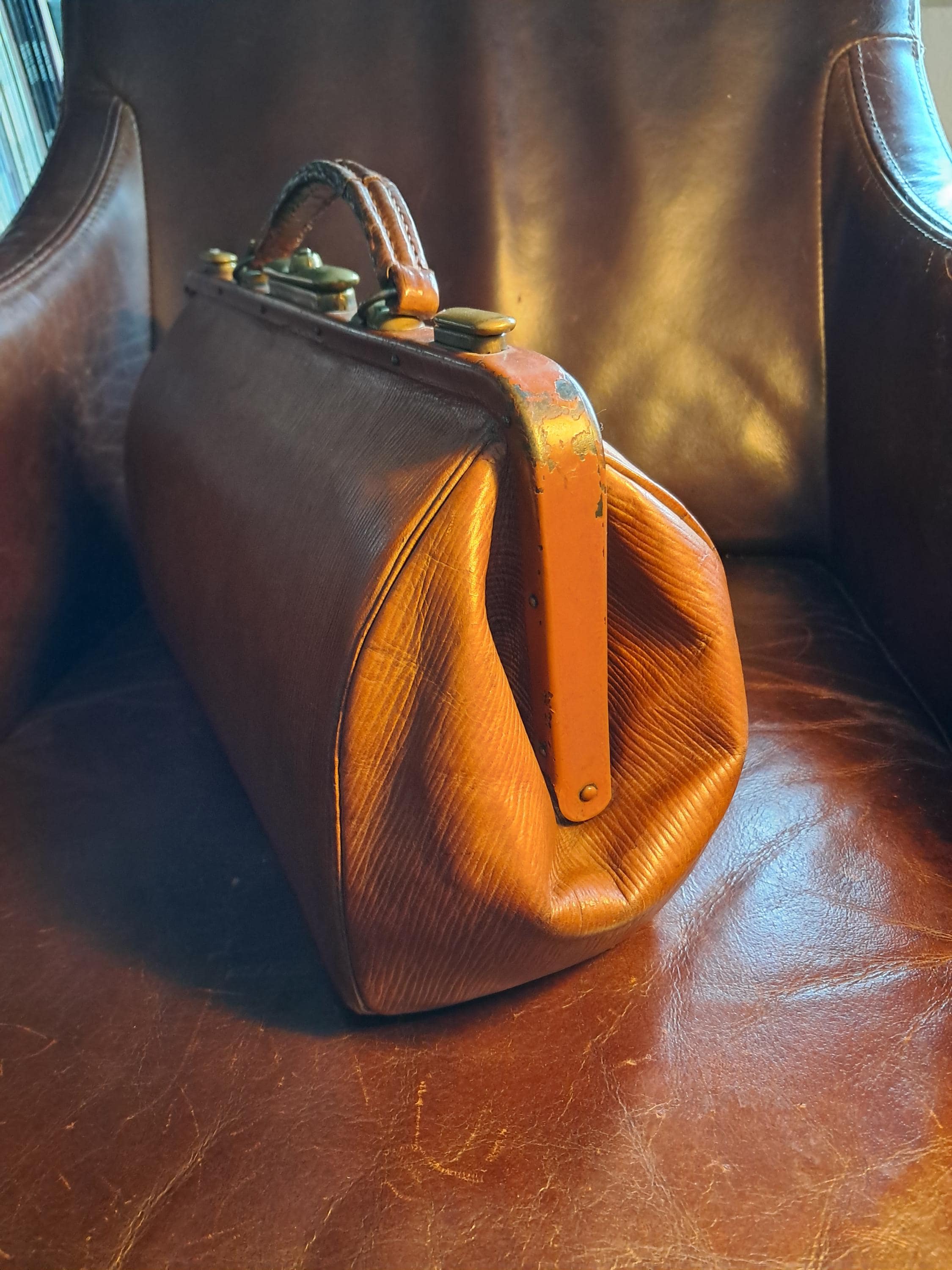 This sturdy leather bag from the French company MF is a statement piece for your own style. You can see the years in it, but the clasp (3 bars) works perfectly and the leather has a patina but is undamaged. The inside lining of the bag has been treated with disinfectant spray. Condition: Good condition, despite intensive use over many years. Clasp in good working order (unfortunately no key). Dimensions: Length 43 cm, width when closed 13 cm, width when open 20 cm, height 22 cm