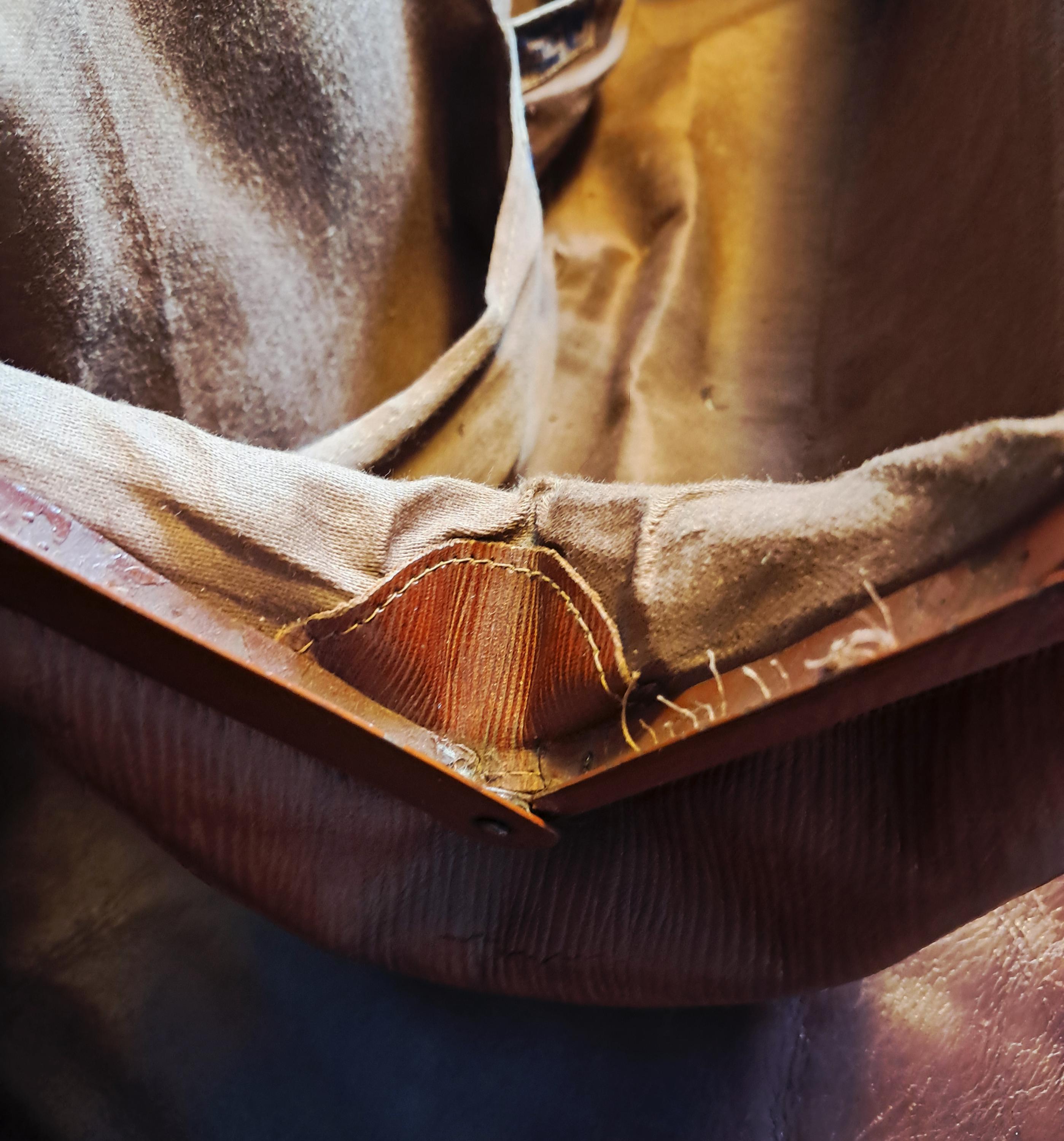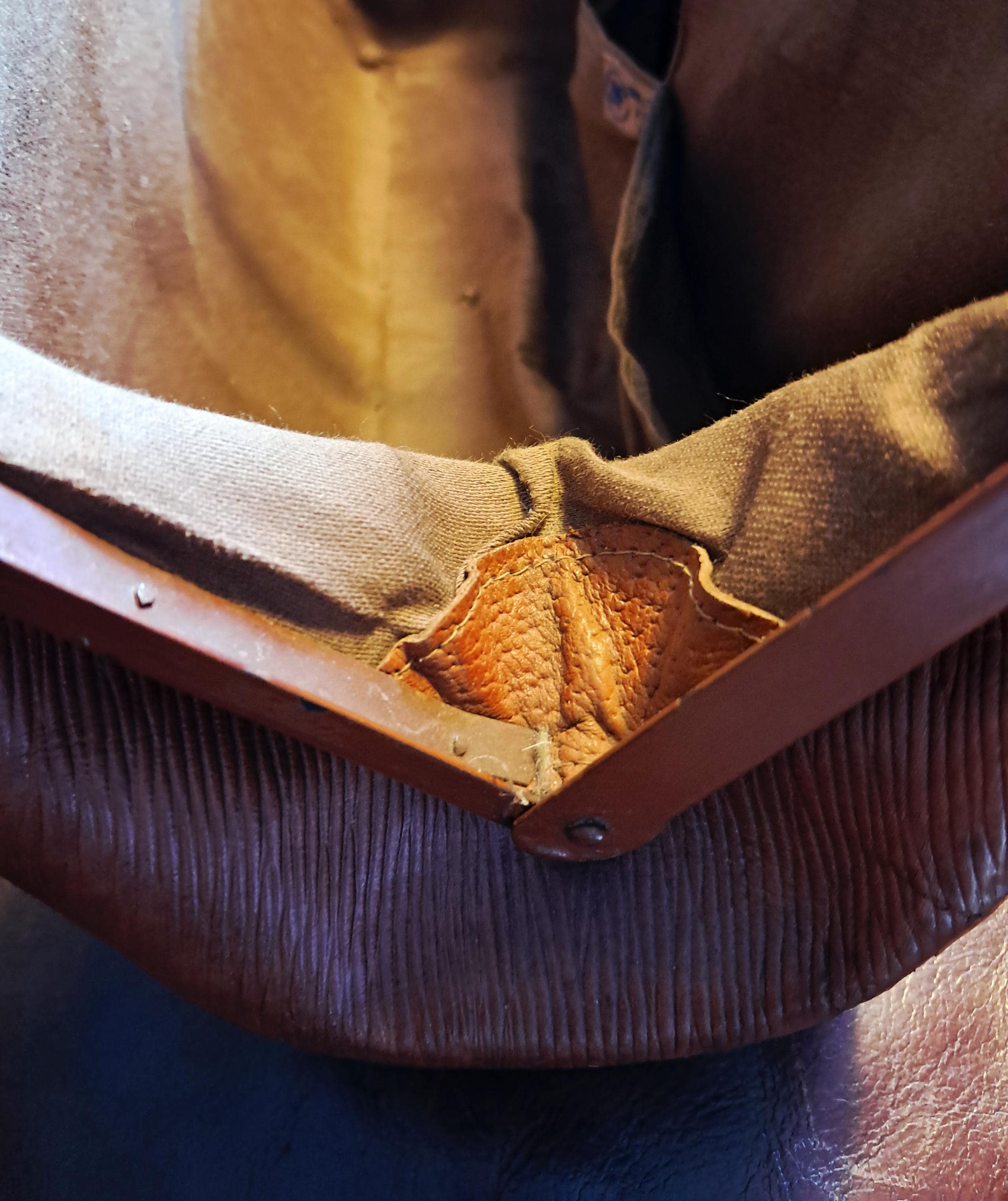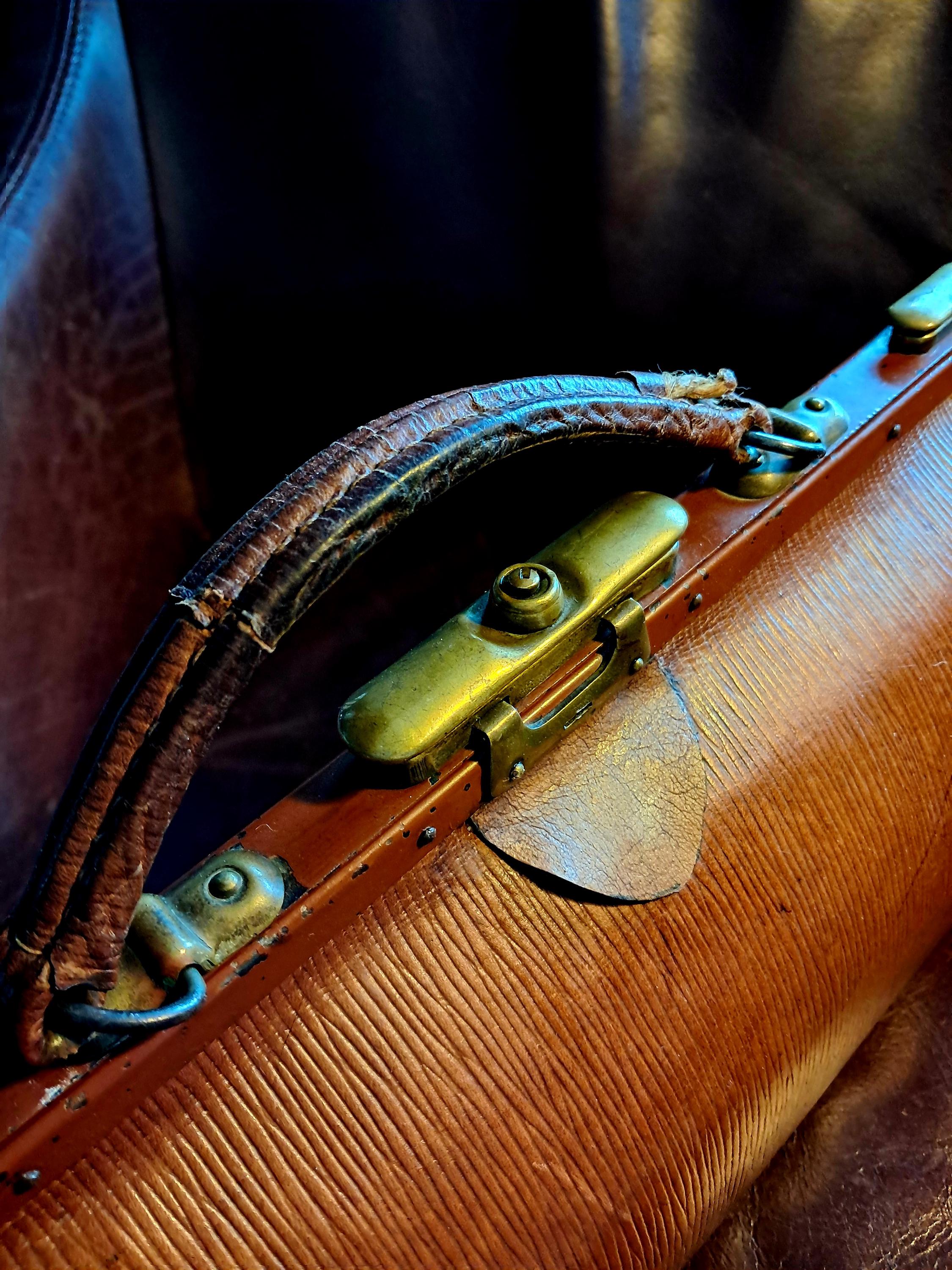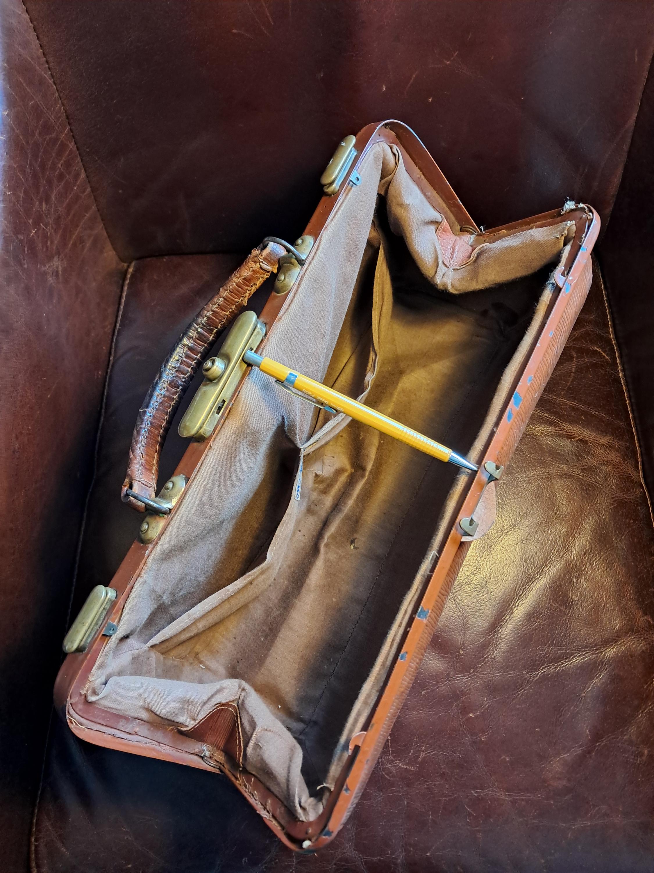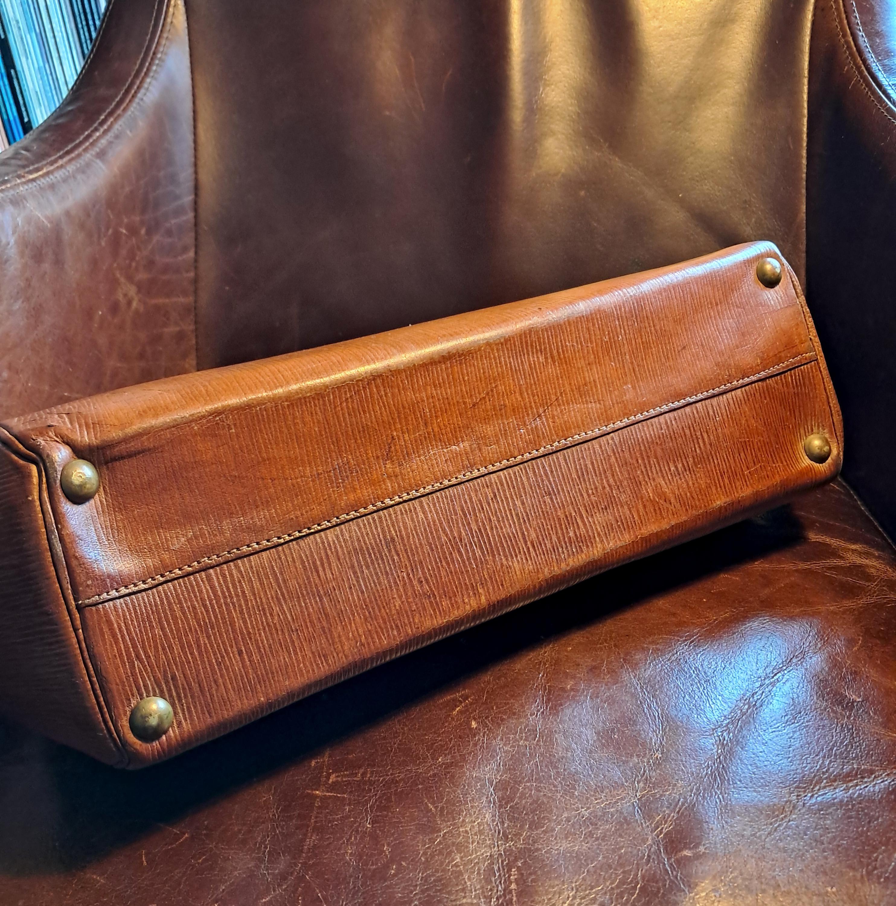 This sturdy leather bag from the French company MF is a statement piece for your own style. You can see the years in it, but the clasp (3 bars) works perfectly and the leather has a patina but is undamaged. The inside lining of the bag has been treated with disinfectant spray. Condition: Good condition, despite intensive use over many years. Clasp in good working order (unfortunately no key). Dimensions: Length 43 cm, width when closed 13 cm, width when open 20 cm, height 22 cm