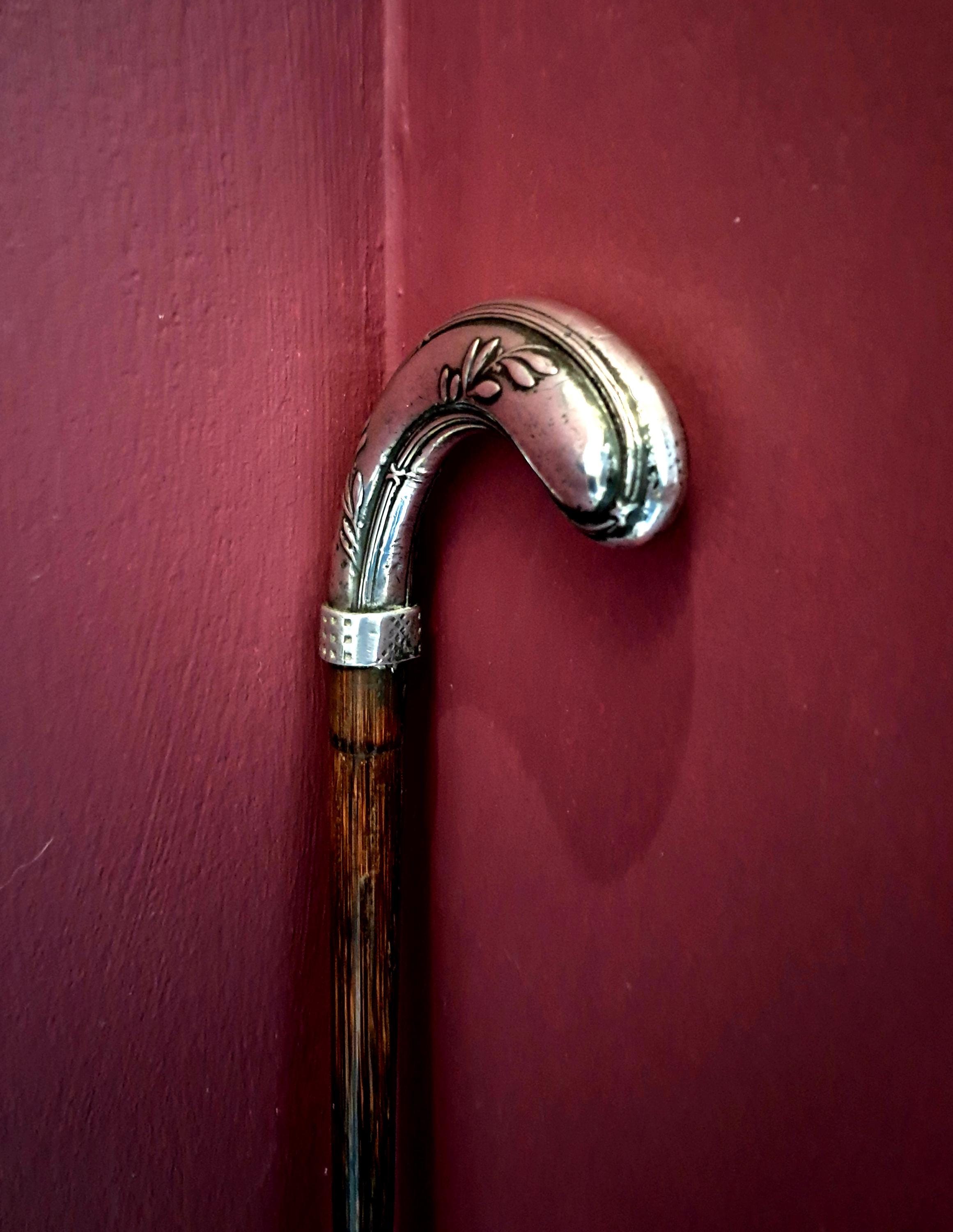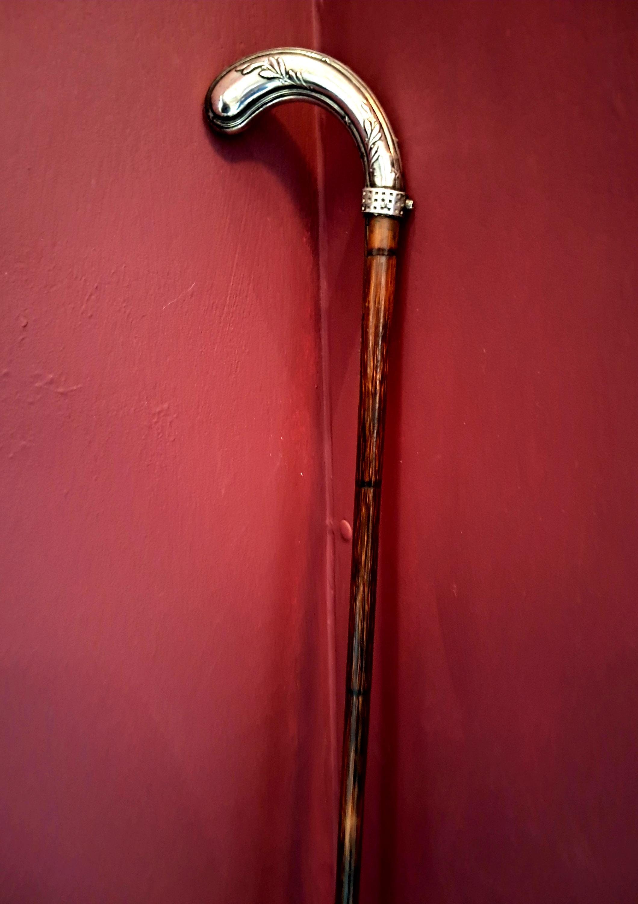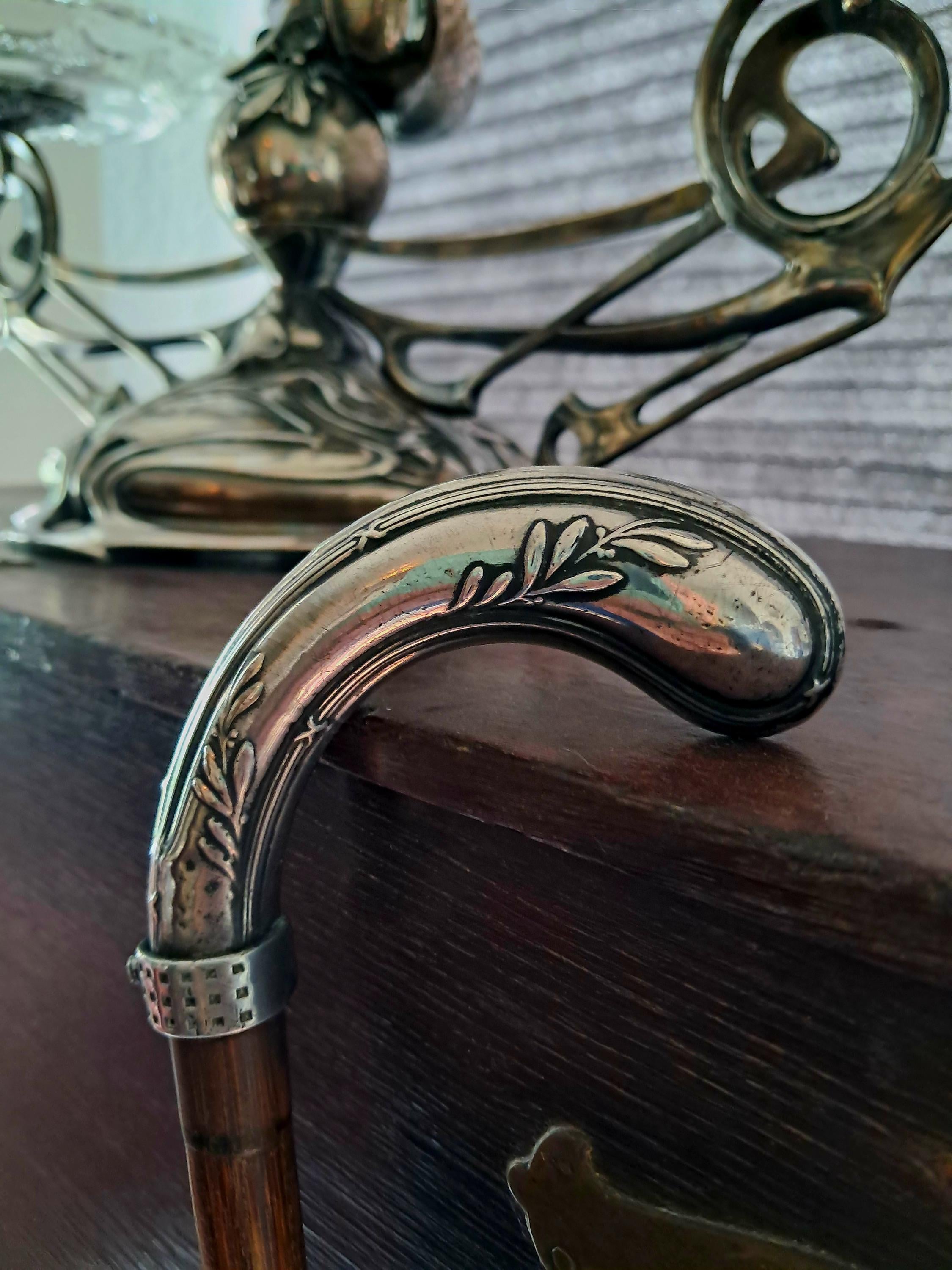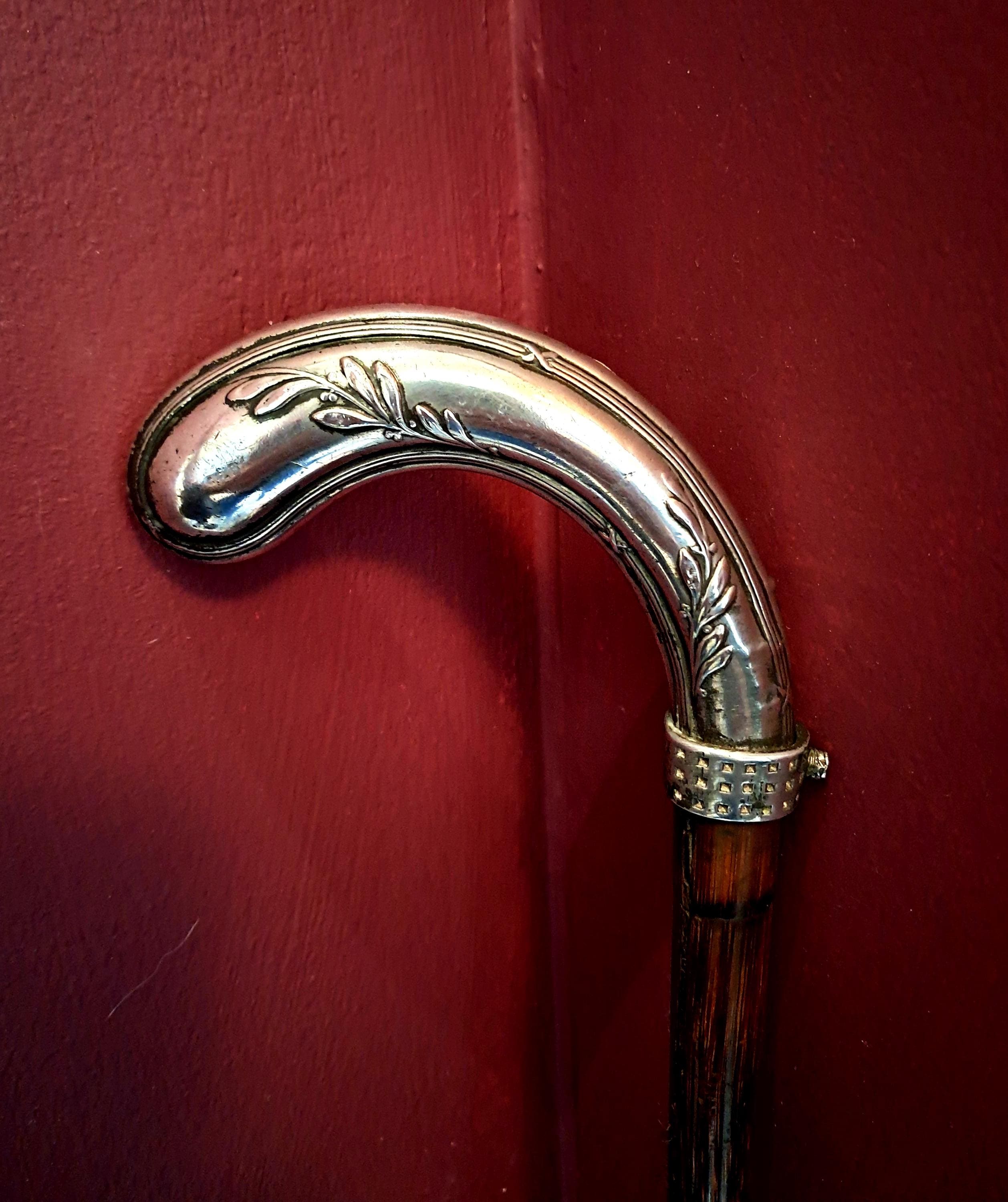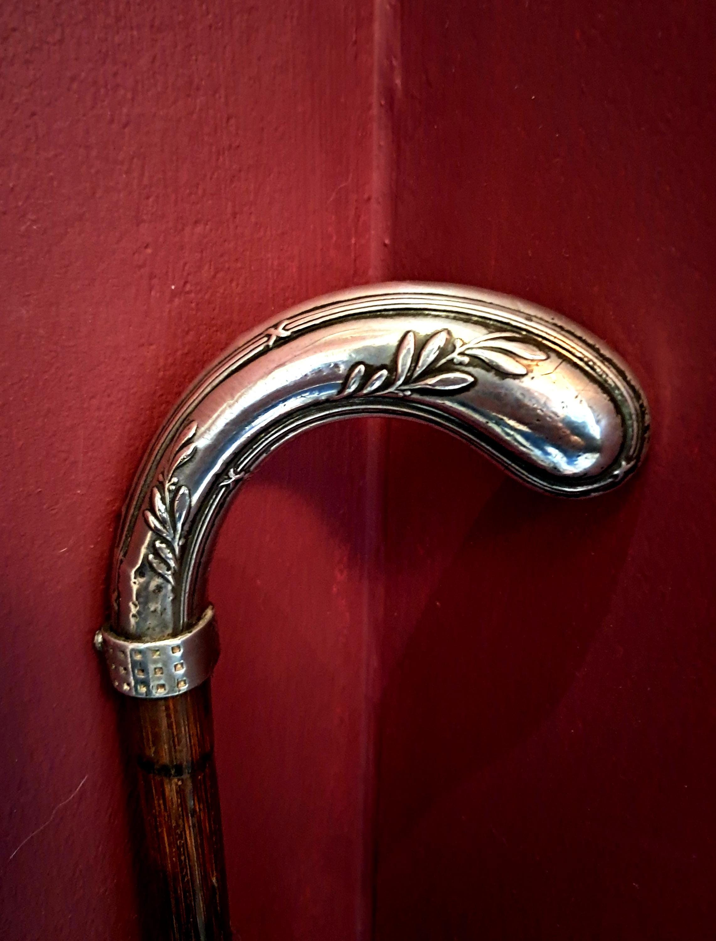 Elegant walking stick made of bamboo with a knob decorated with floral motifs in 800 silver. Finest Art Nouveau. Condition: Good condition, knob with patina and signs of wear, but no major damage (see photos). Walking stick itself made of real bamboo, iron tip slightly worn at an angle. Dimensions: Total length 91 cm, knob width 10 cm, knob height 7 cm