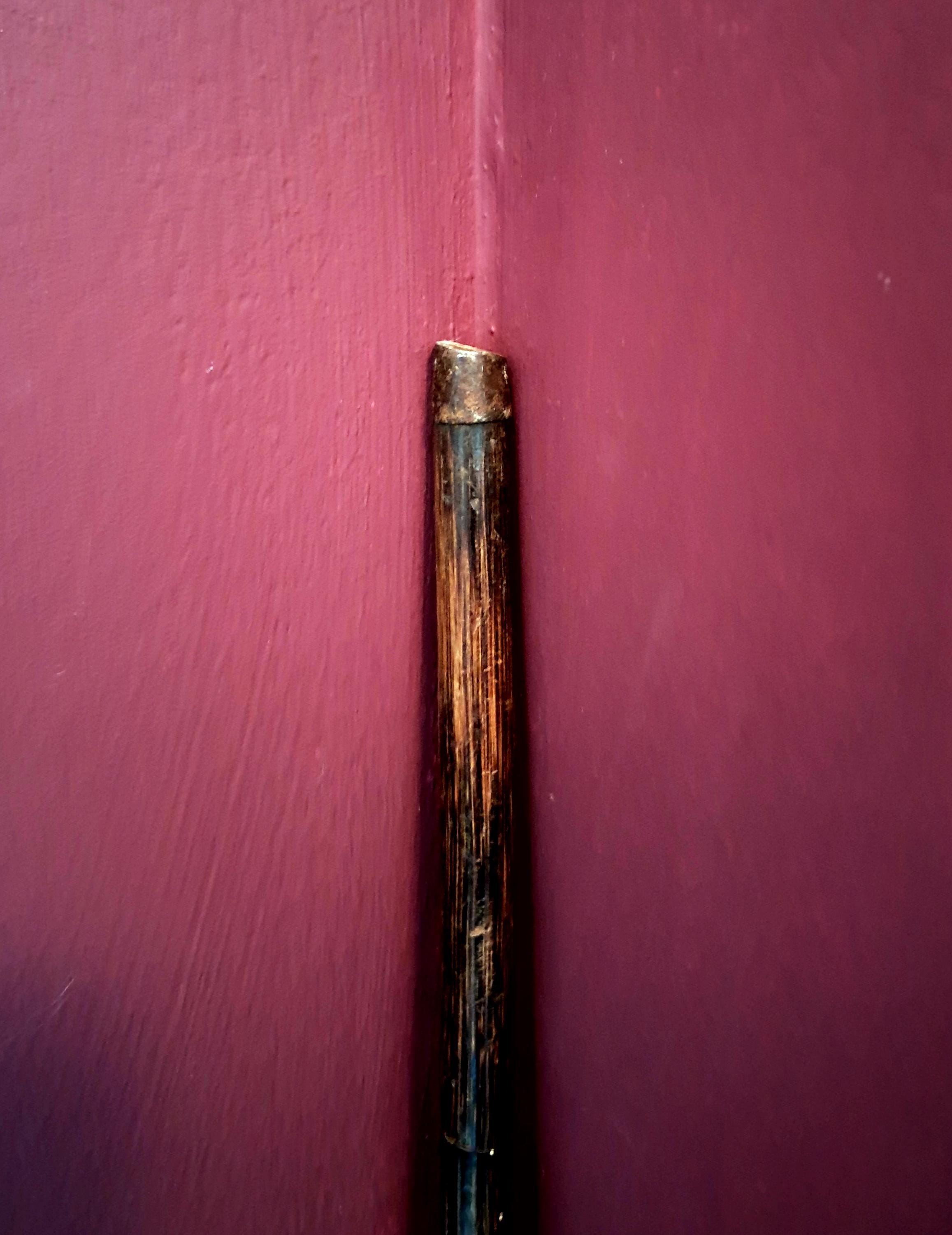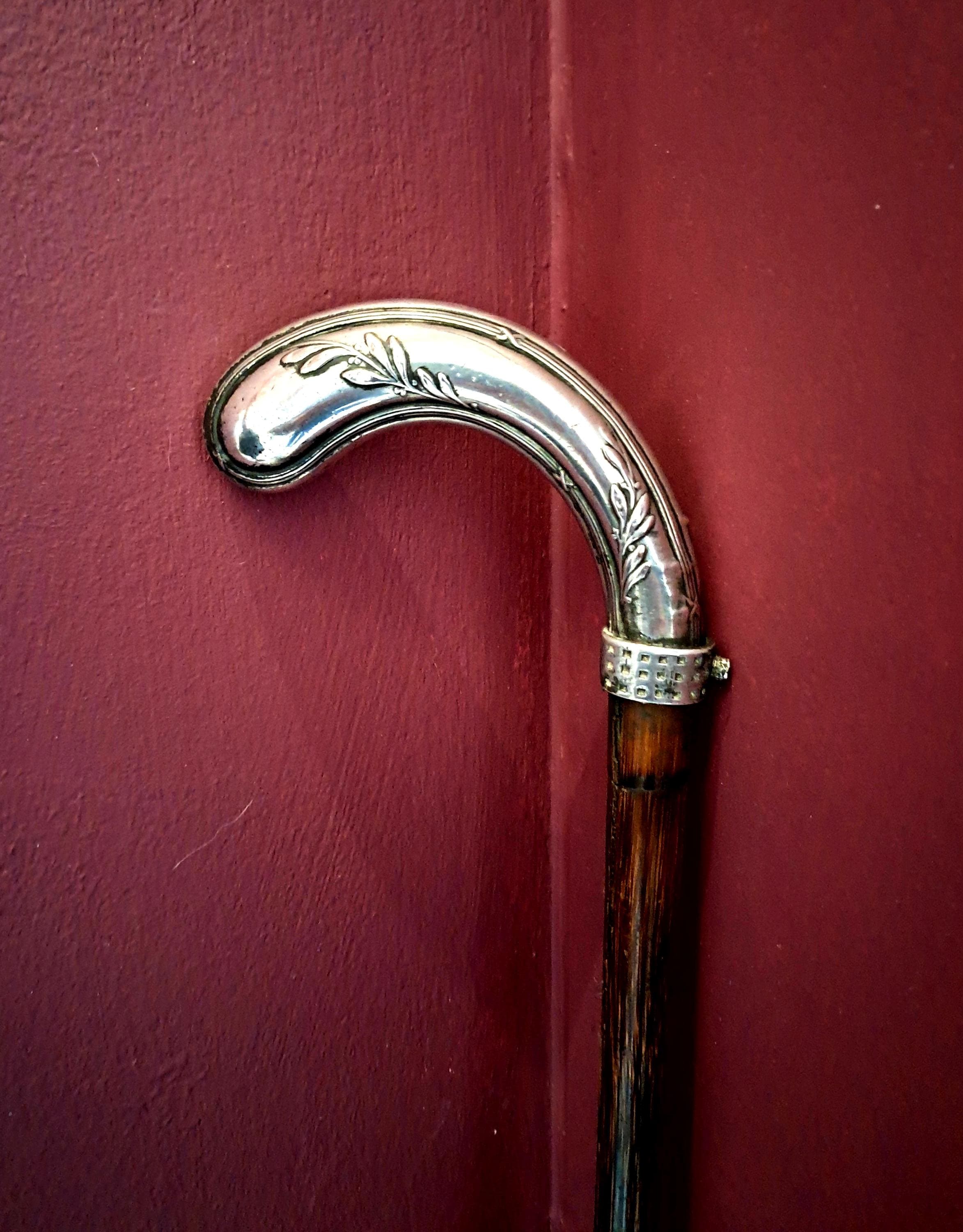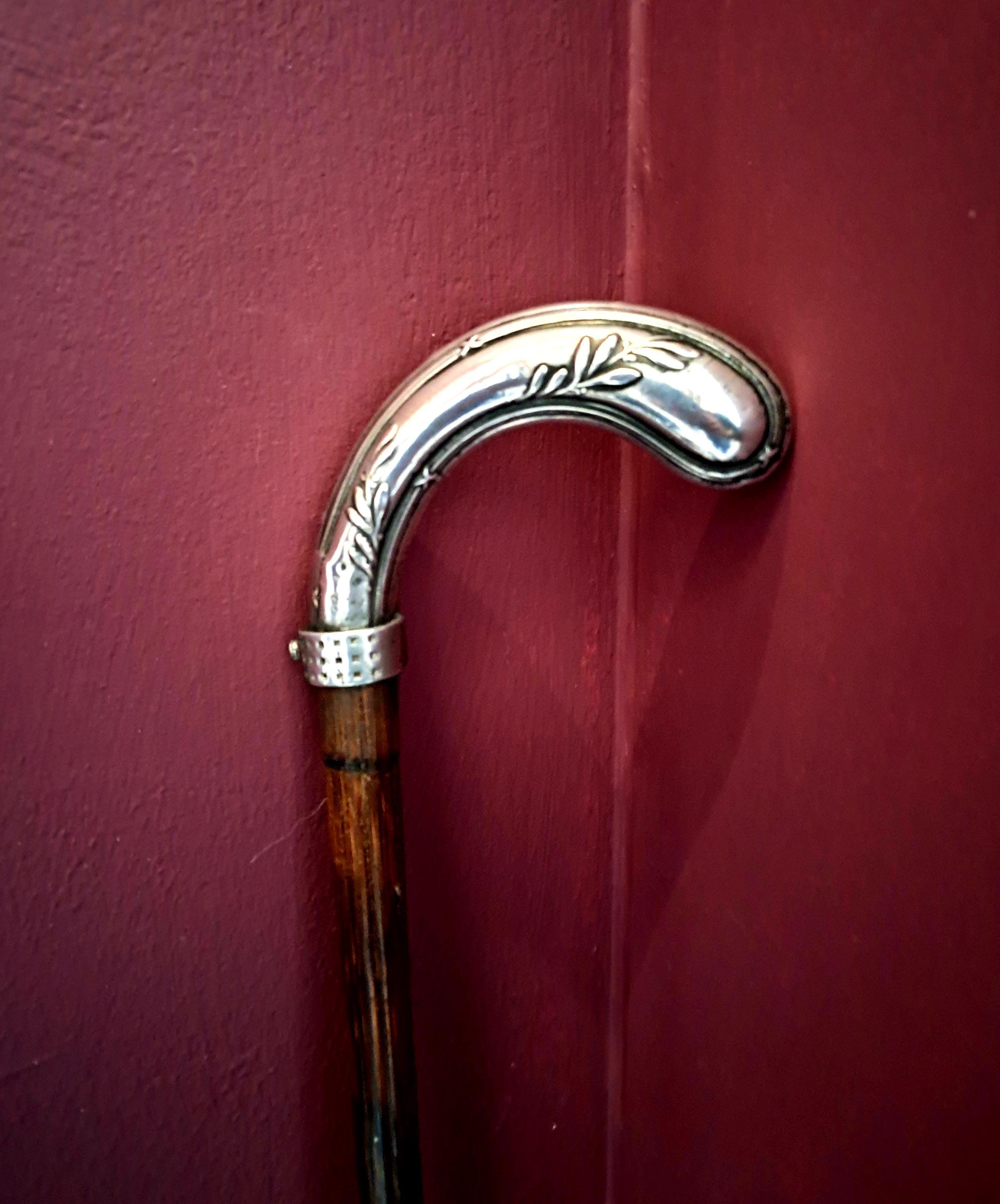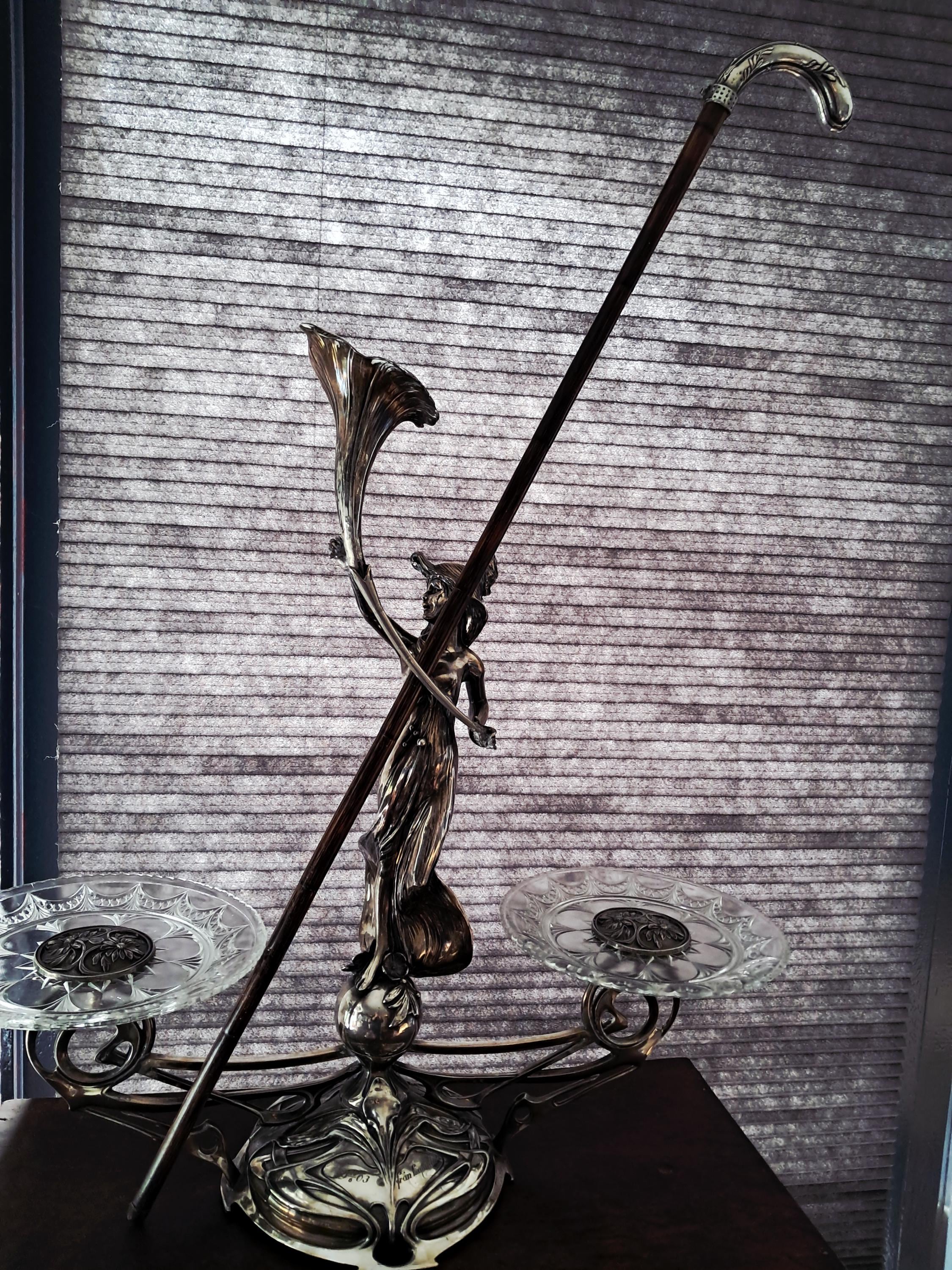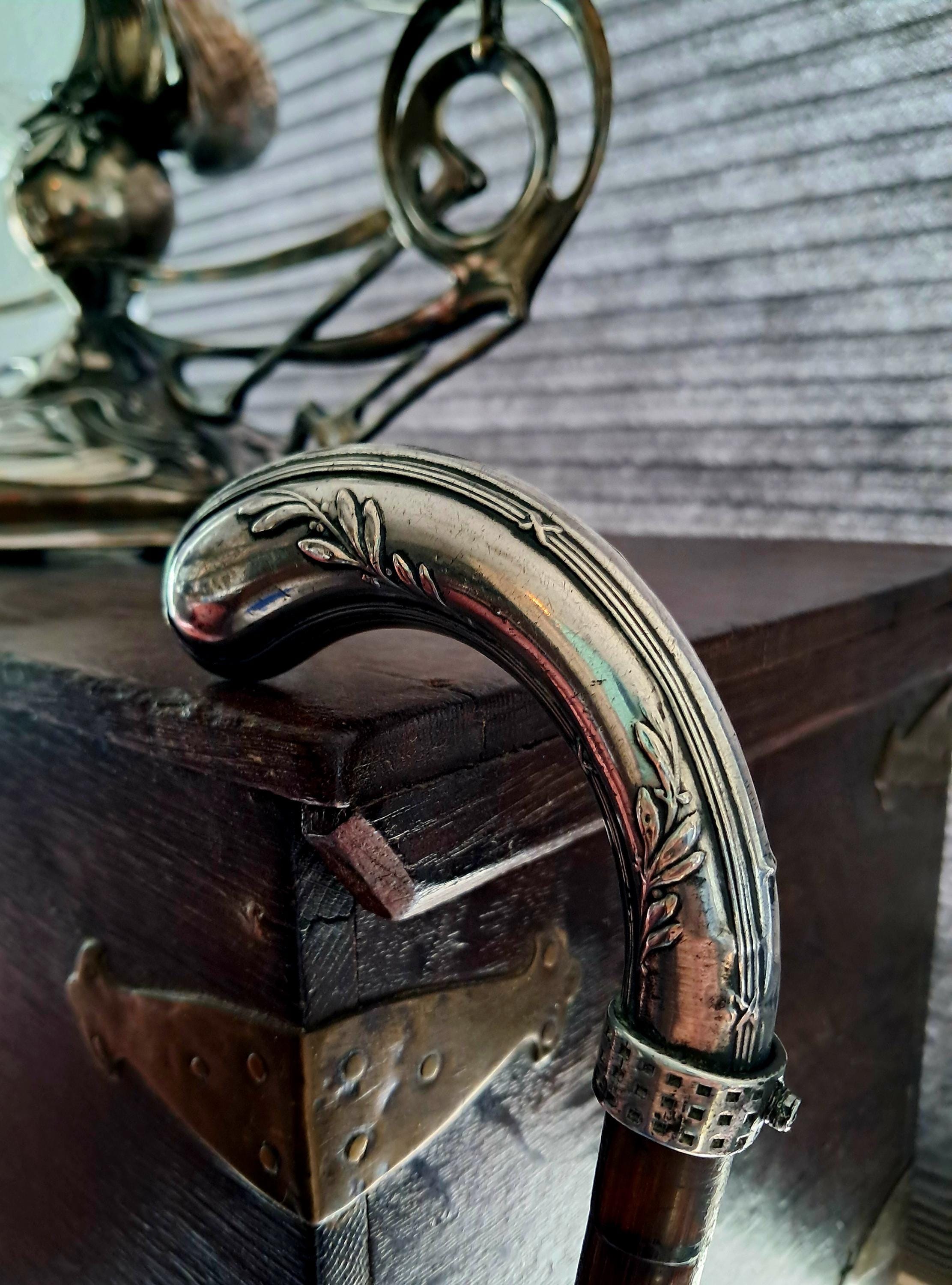 Elegant walking stick made of bamboo with a knob decorated with floral motifs in 800 silver. Finest Art Nouveau. Condition: Good condition, knob with patina and signs of wear, but no major damage (see photos). Walking stick itself made of real bamboo, iron tip slightly worn at an angle. Dimensions: Total length 91 cm, knob width 10 cm, knob height 7 cm