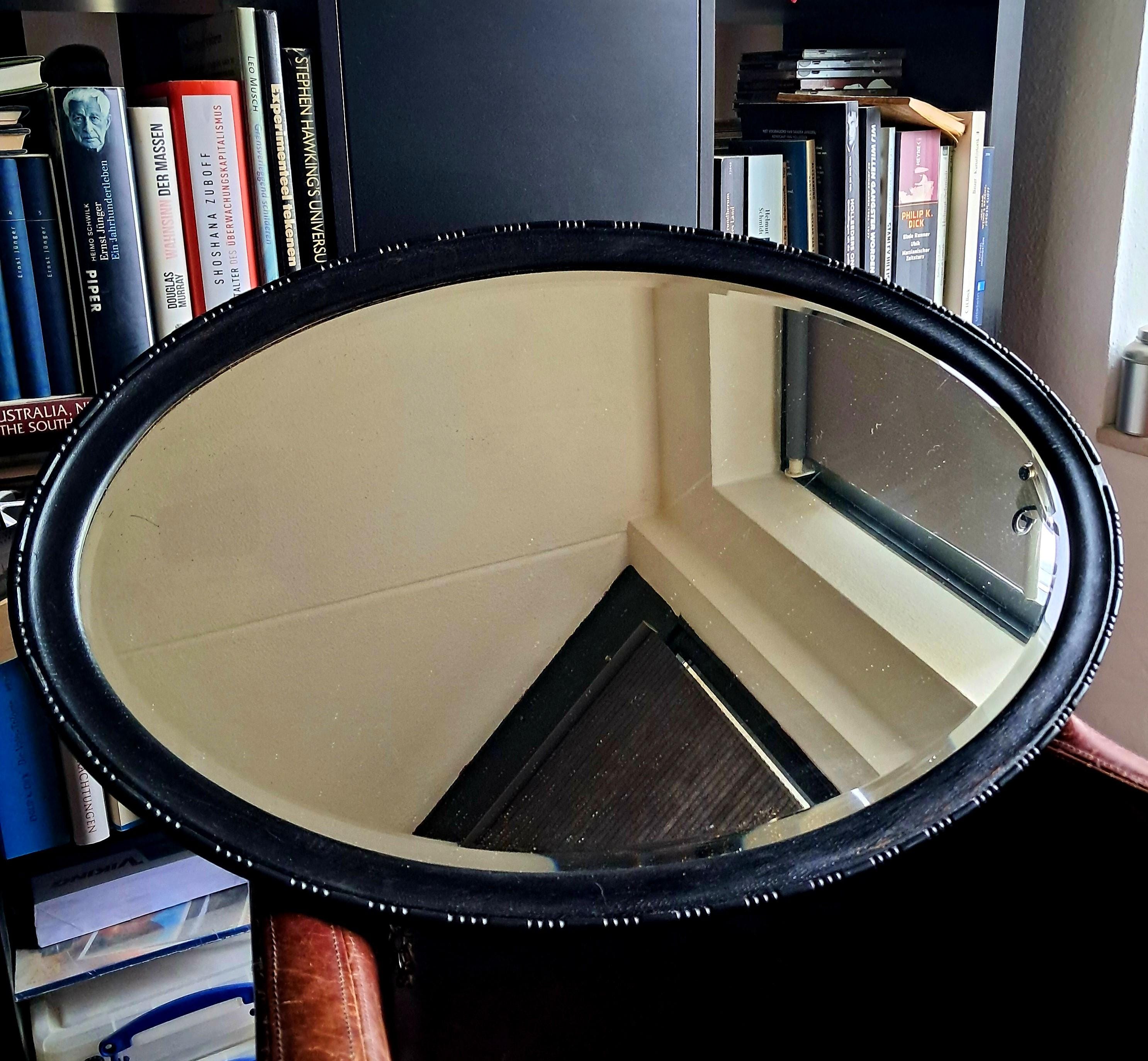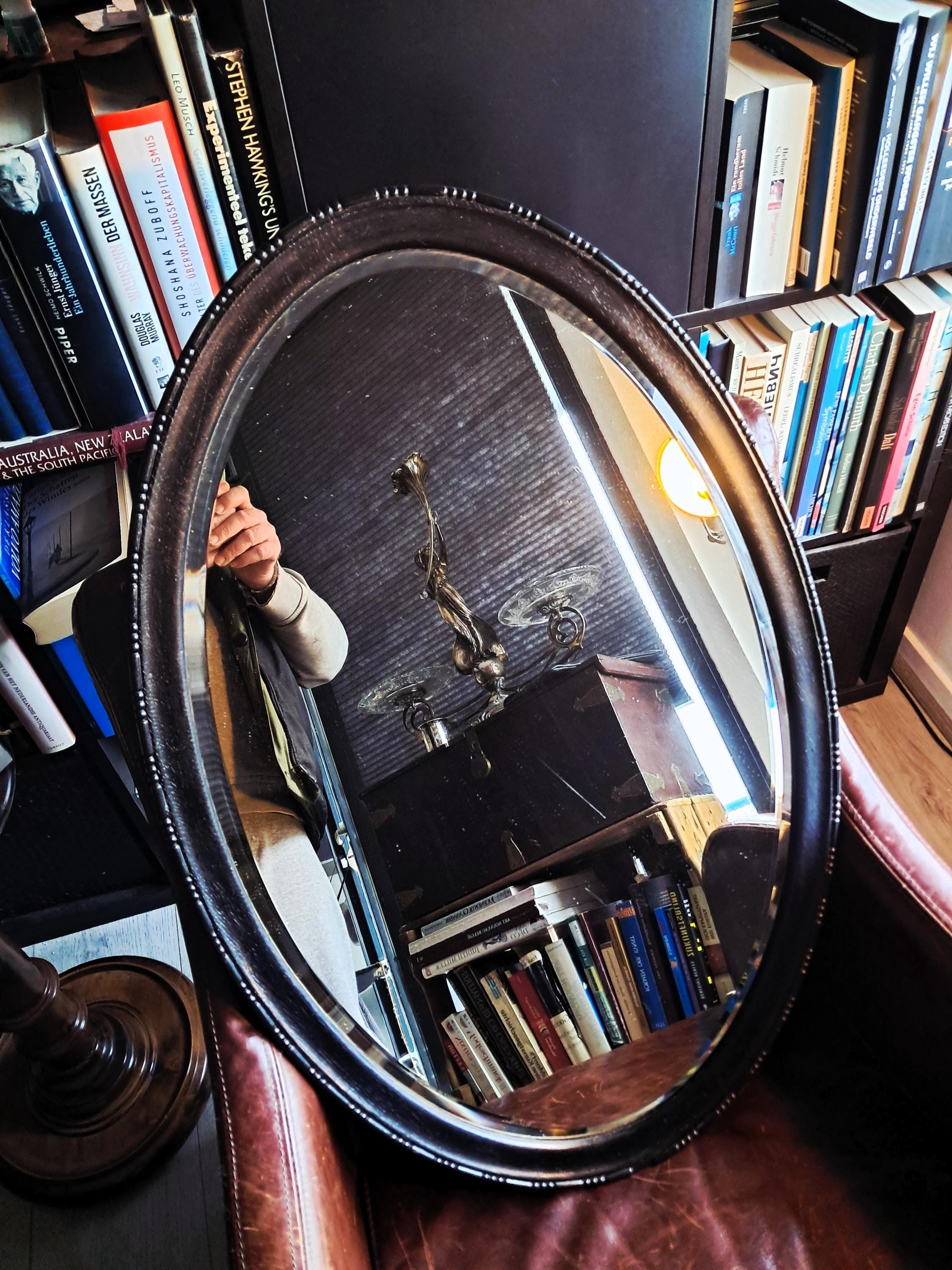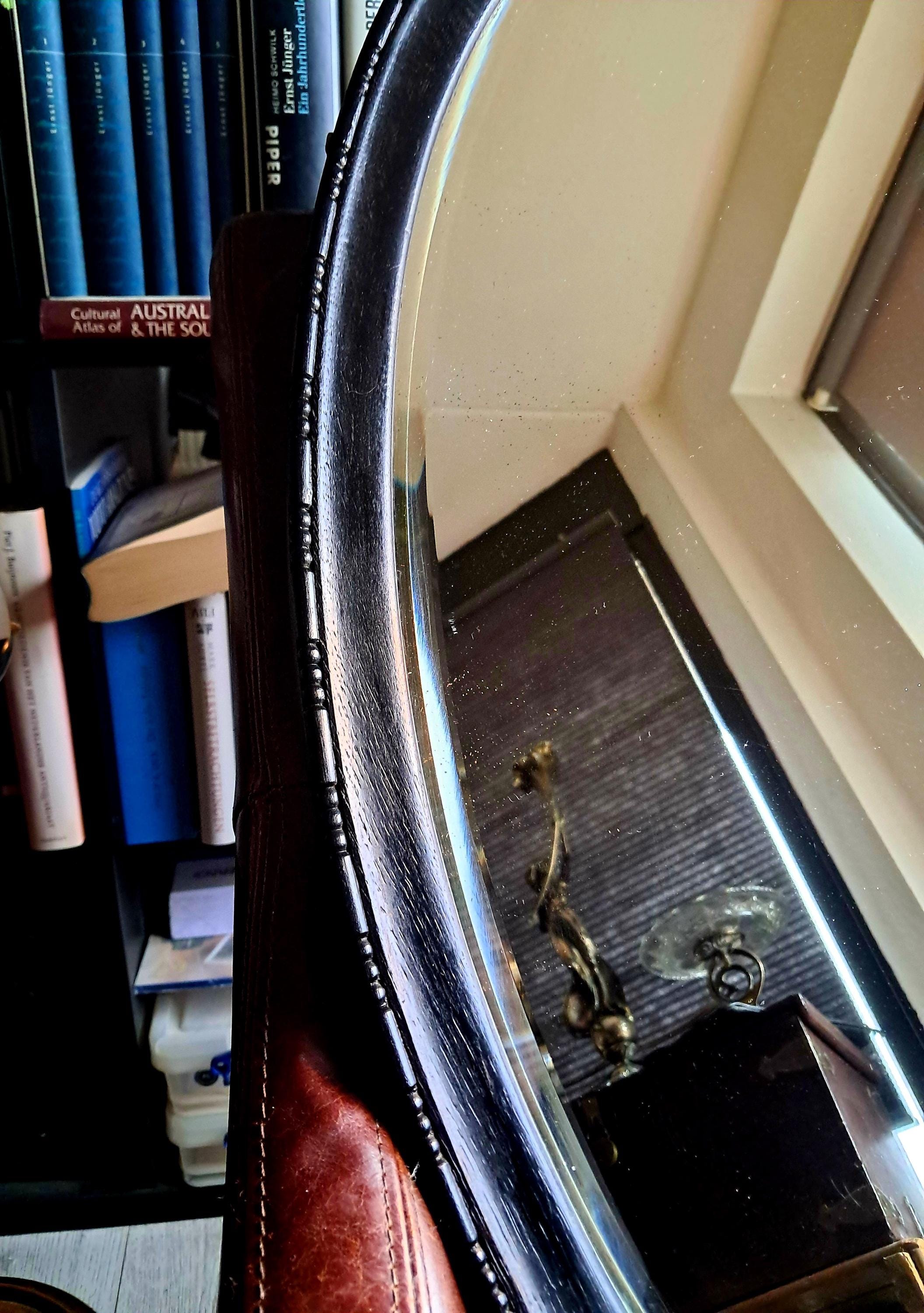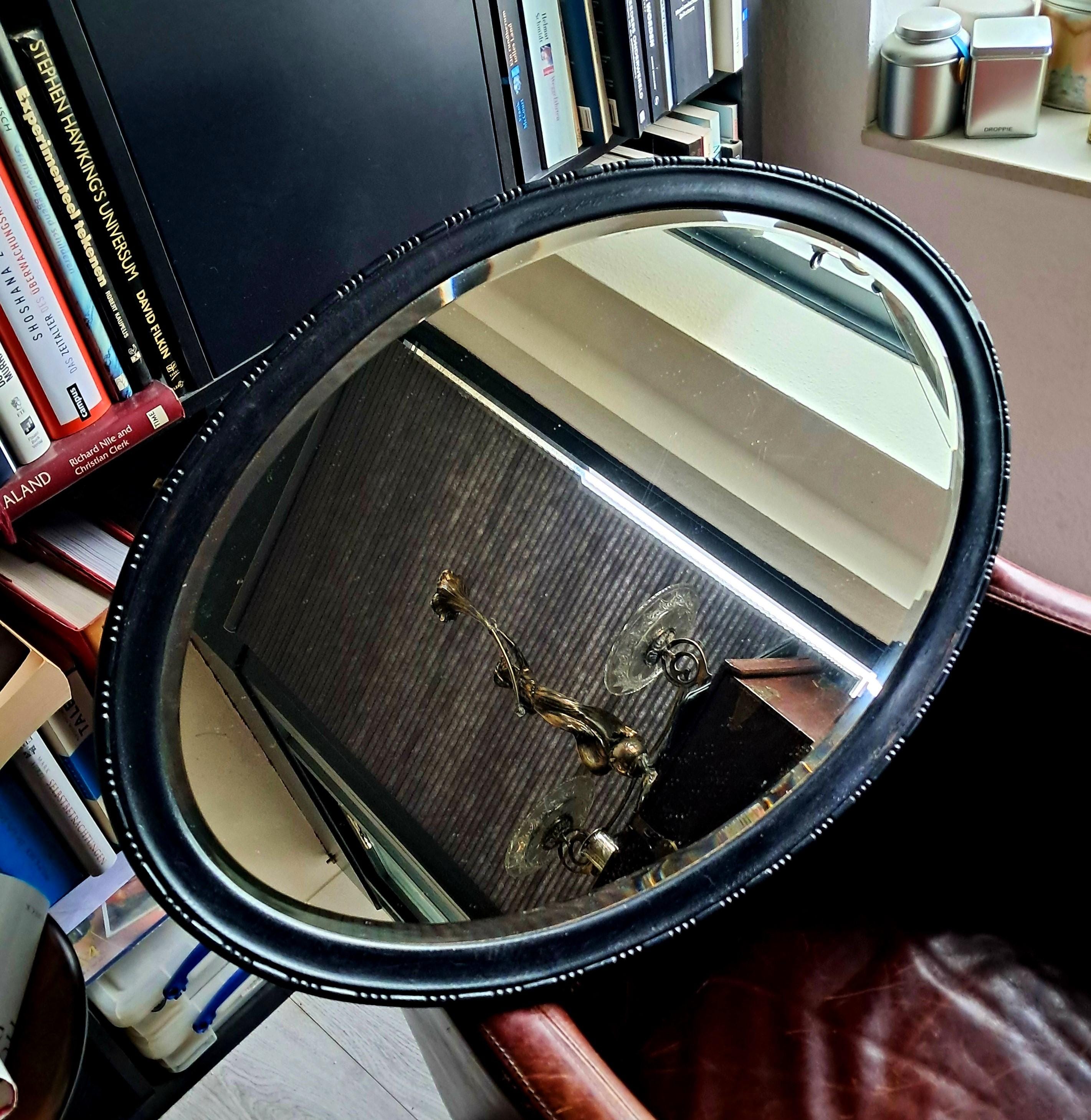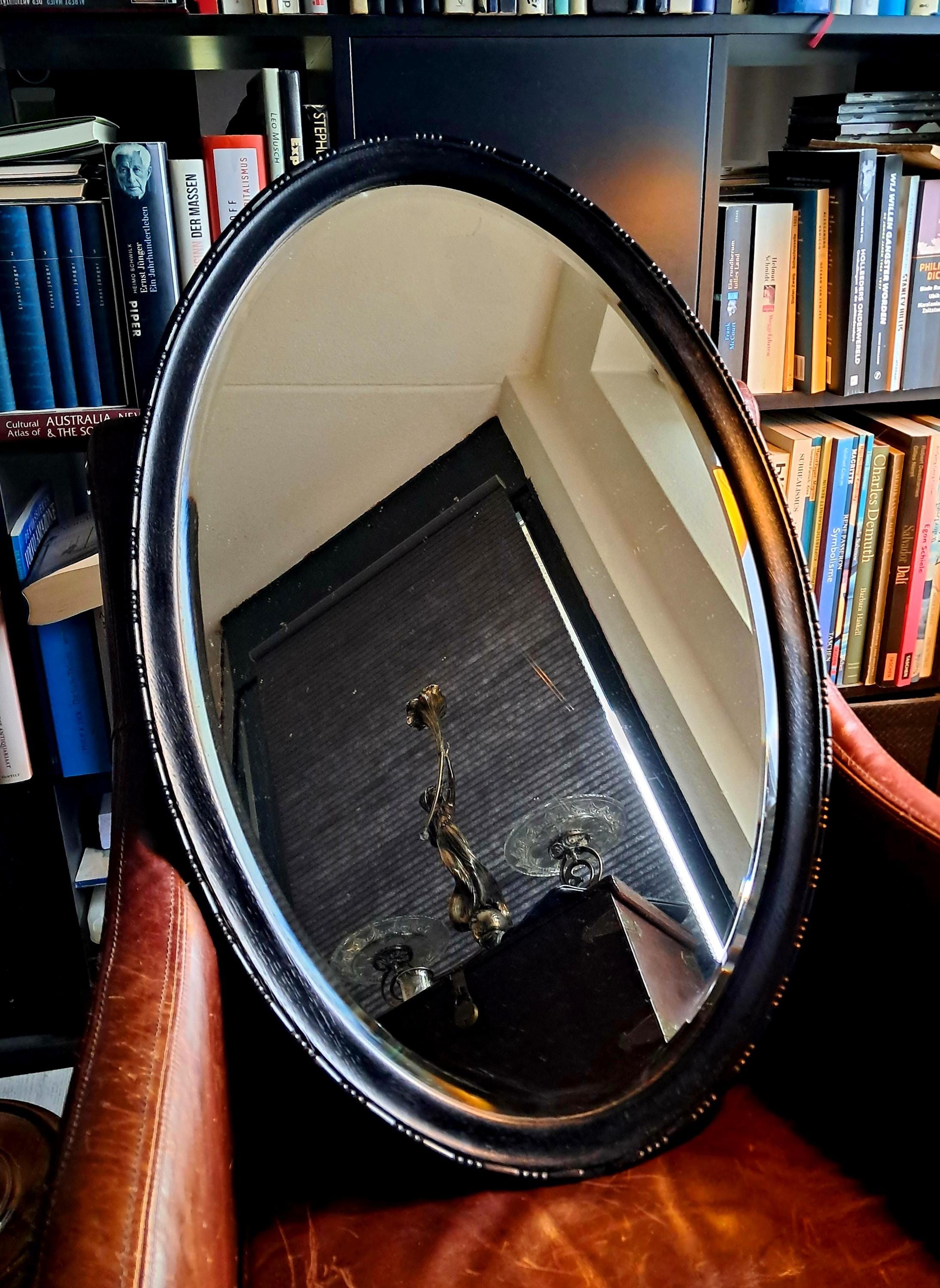 This old mirror, silver-coated, has a solid wood frame with pearl and line ornamentation. Bevelled glass edge. The silver coating already shows slight tarnishing, which gives it an interesting patina now and will continue to do so in the future. Condition: Good condition, one small defect on the edge of the wooden frame. Dimensions: Height 79 cm, width 48.5 cm, height 3.5 cm
