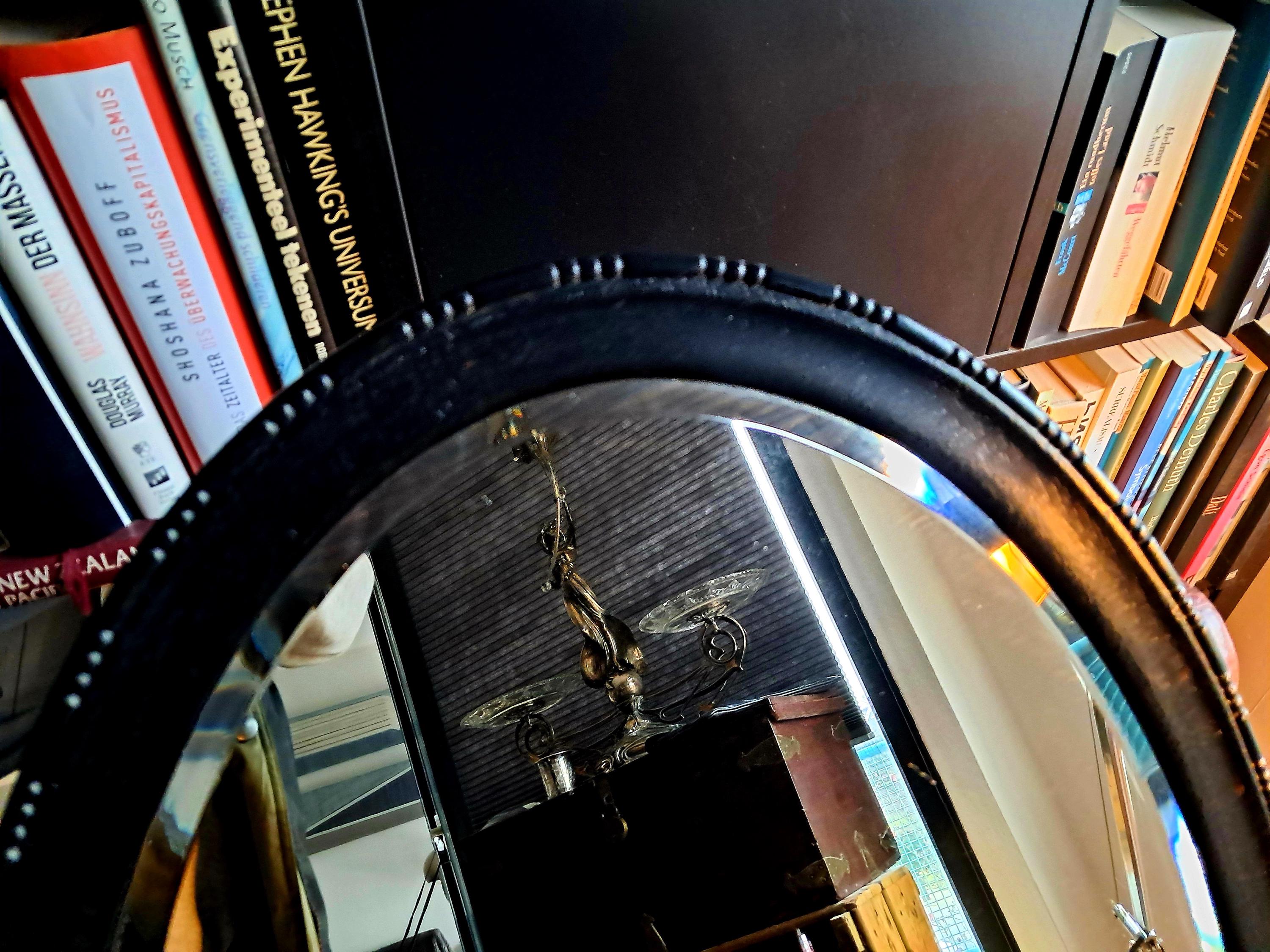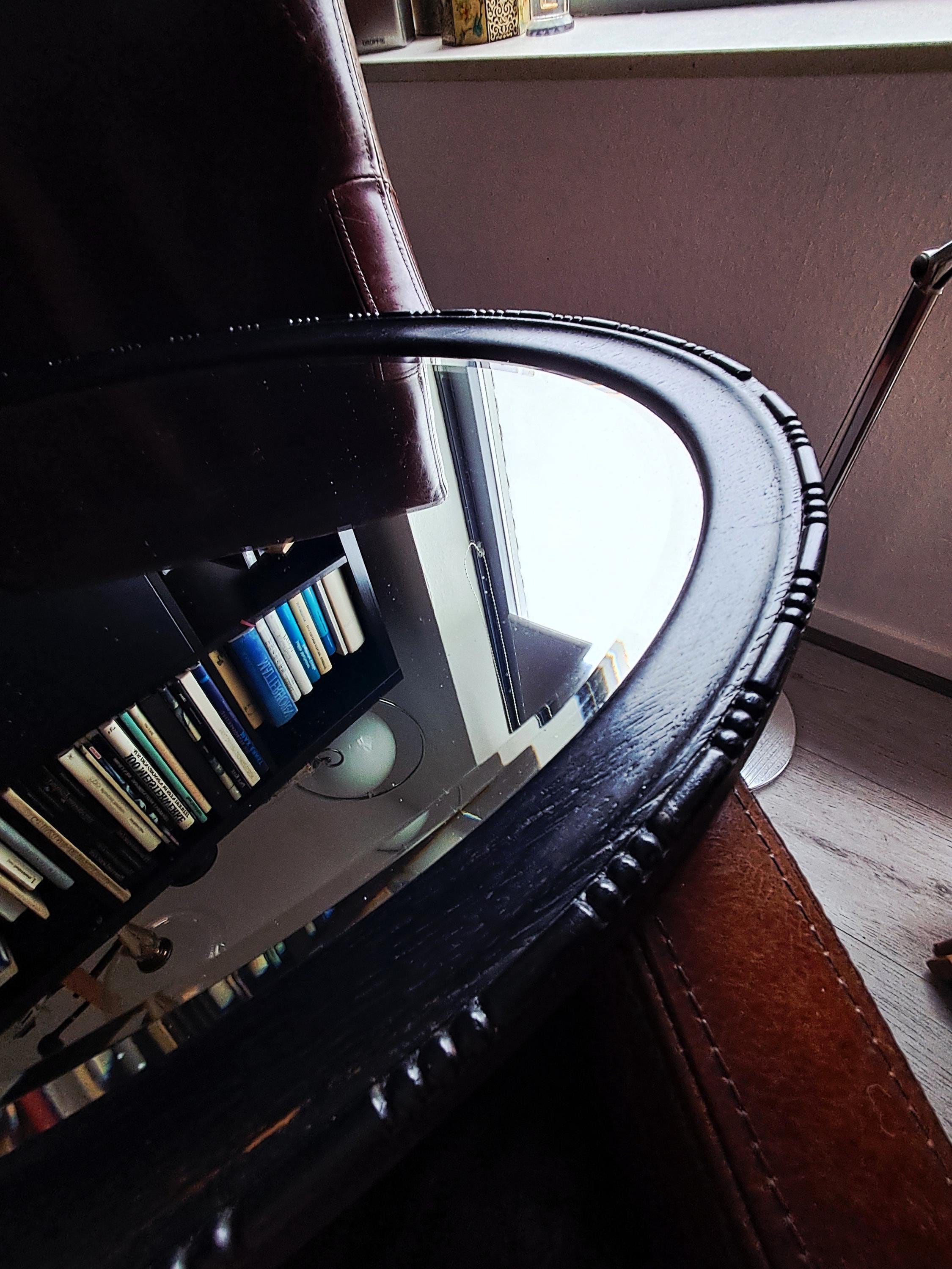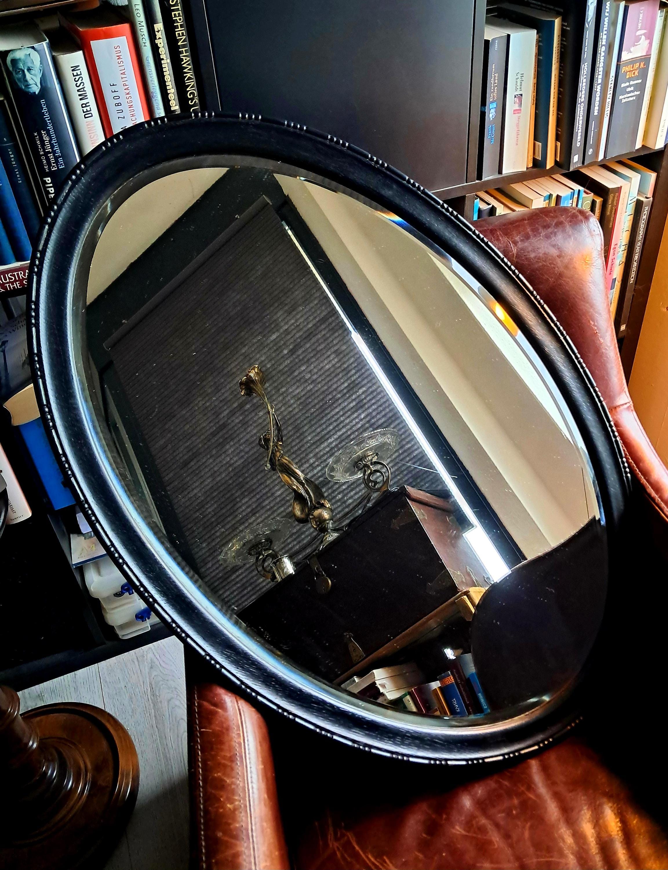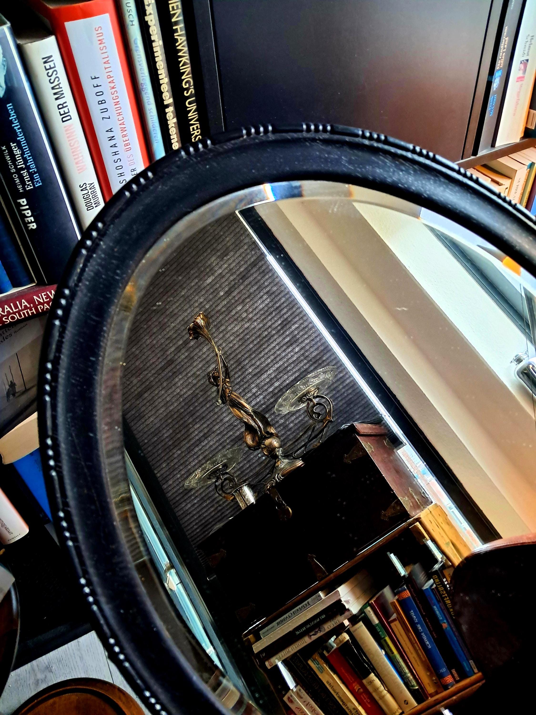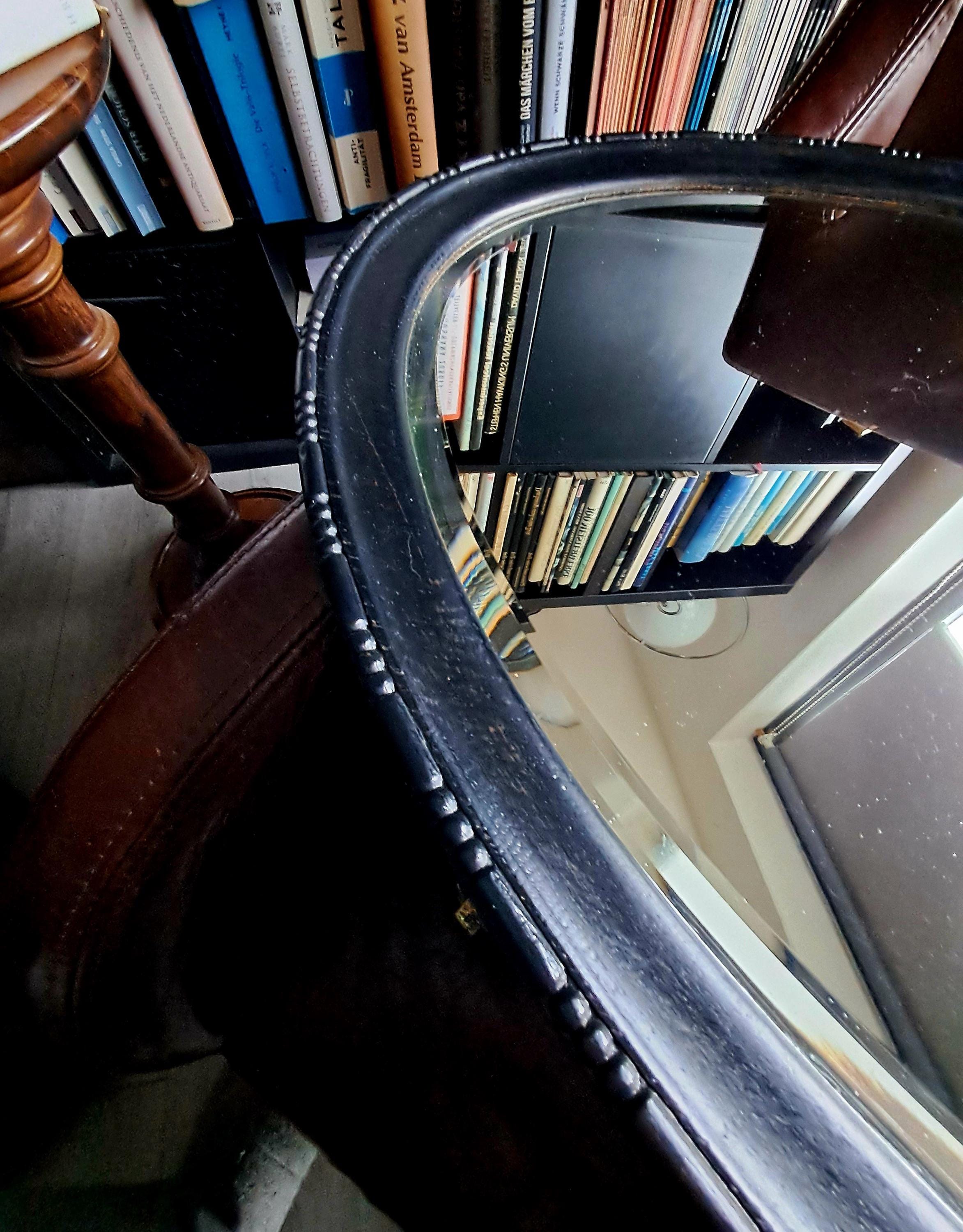 This old mirror, silver-coated, has a solid wood frame with pearl and line ornamentation. Bevelled glass edge. The silver coating already shows slight tarnishing, which gives it an interesting patina now and will continue to do so in the future. Condition: Good condition, one small defect on the edge of the wooden frame. Dimensions: Height 79 cm, width 48.5 cm, height 3.5 cm