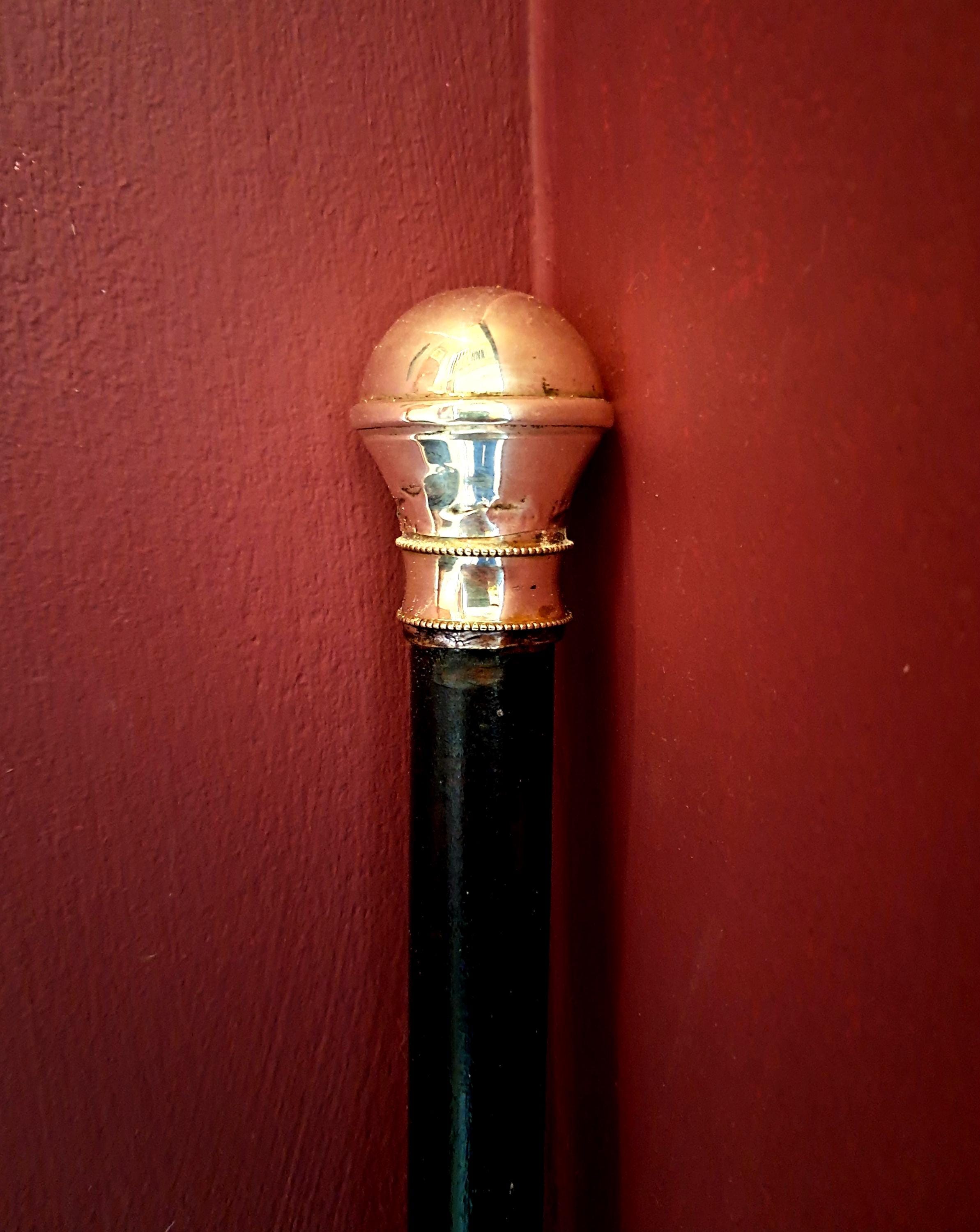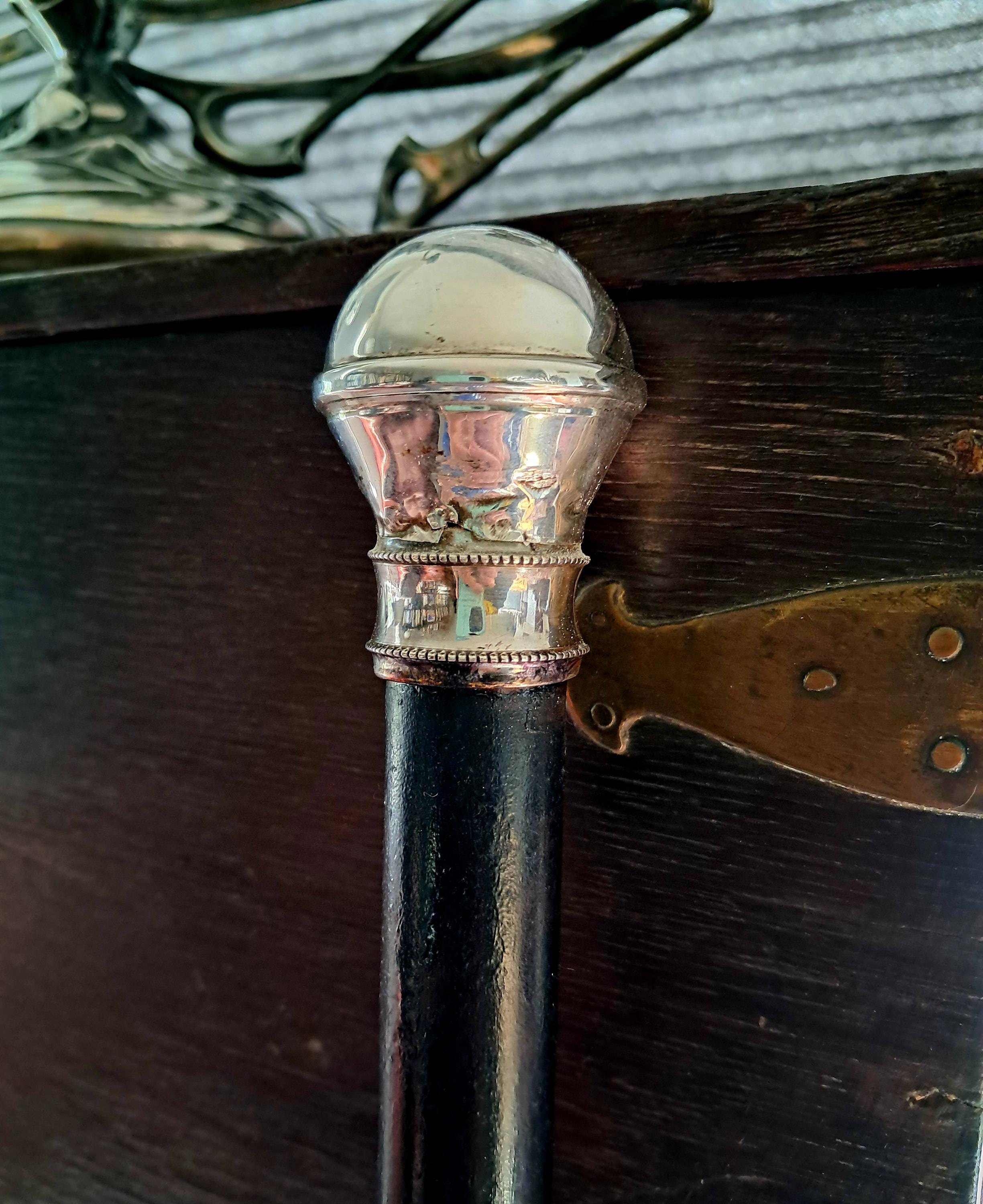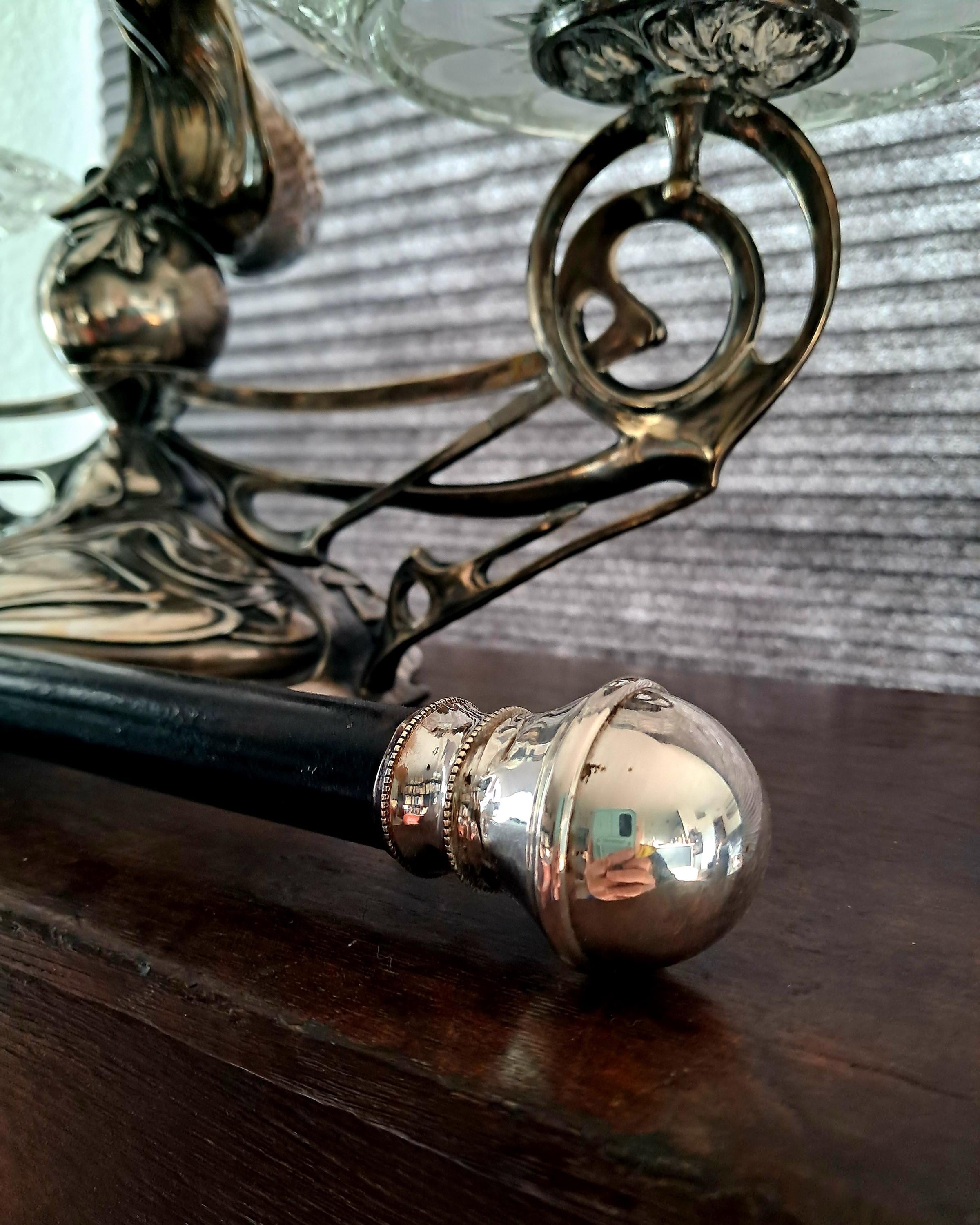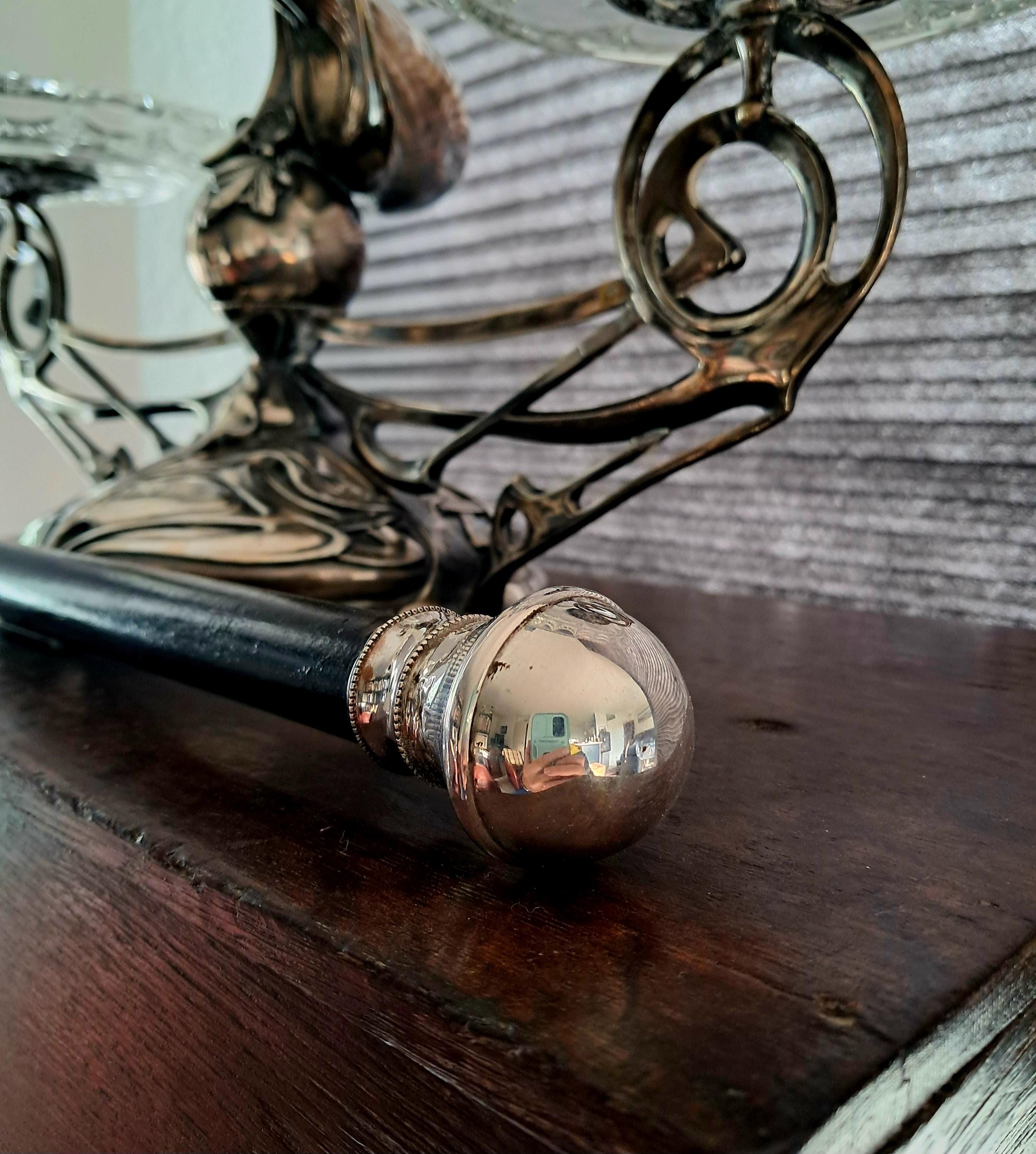 A sturdy antique walking stick made of ebonised hardwood with a spherical handle made of 830 silver (according to acid test). Brass ring and brass nail at the tip. This attractive walking stick feels heavy in the hand and, despite its elegant appearance, can withstand a lot. Engraved initials ‘A.M.N.’ Condition: Good condition, everything is stable, but after such a long time, the handle shows some signs of wear. Dimensions: Total length 96 cm, diameter of knob 4 cm, height of knob 5.5 cm