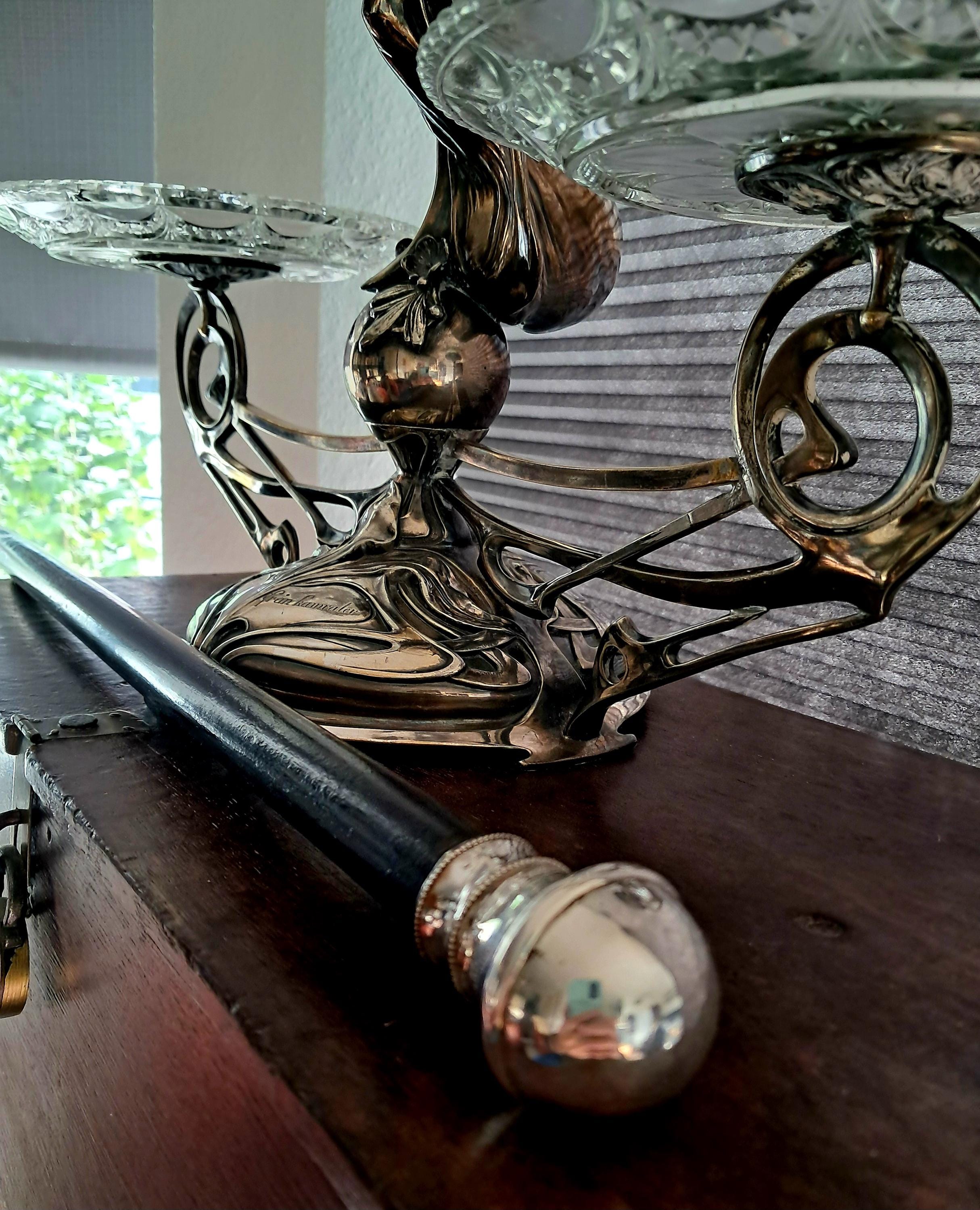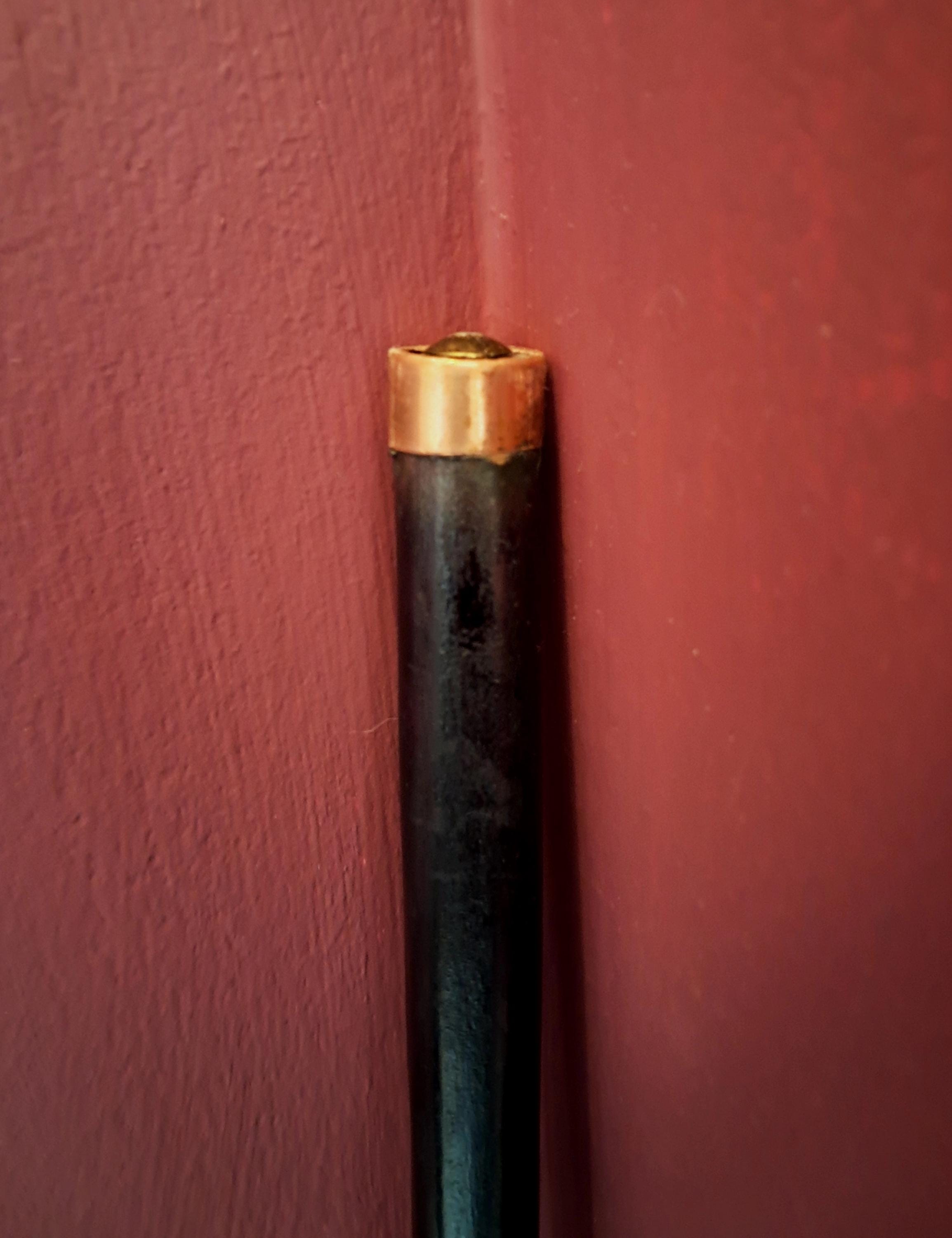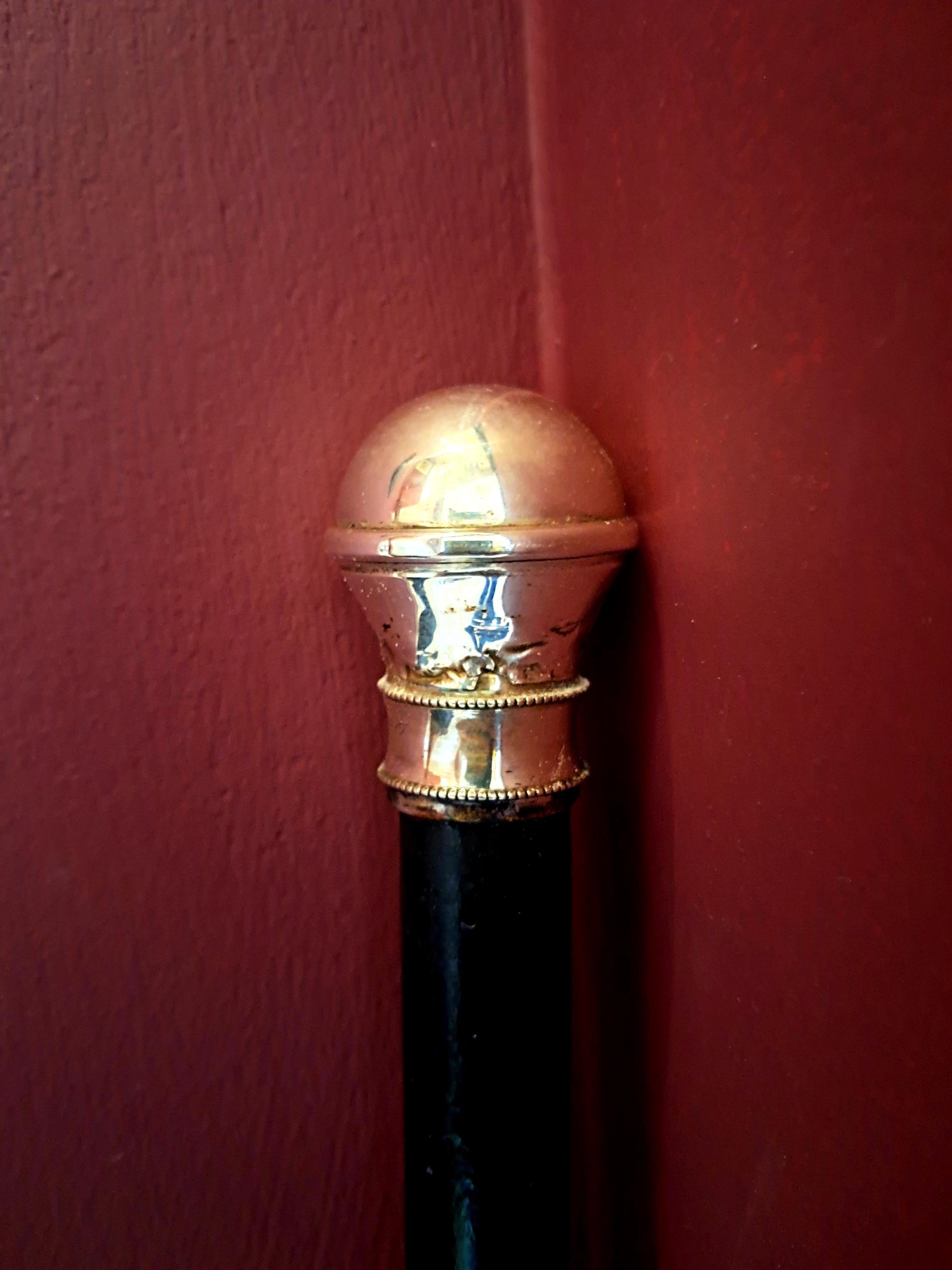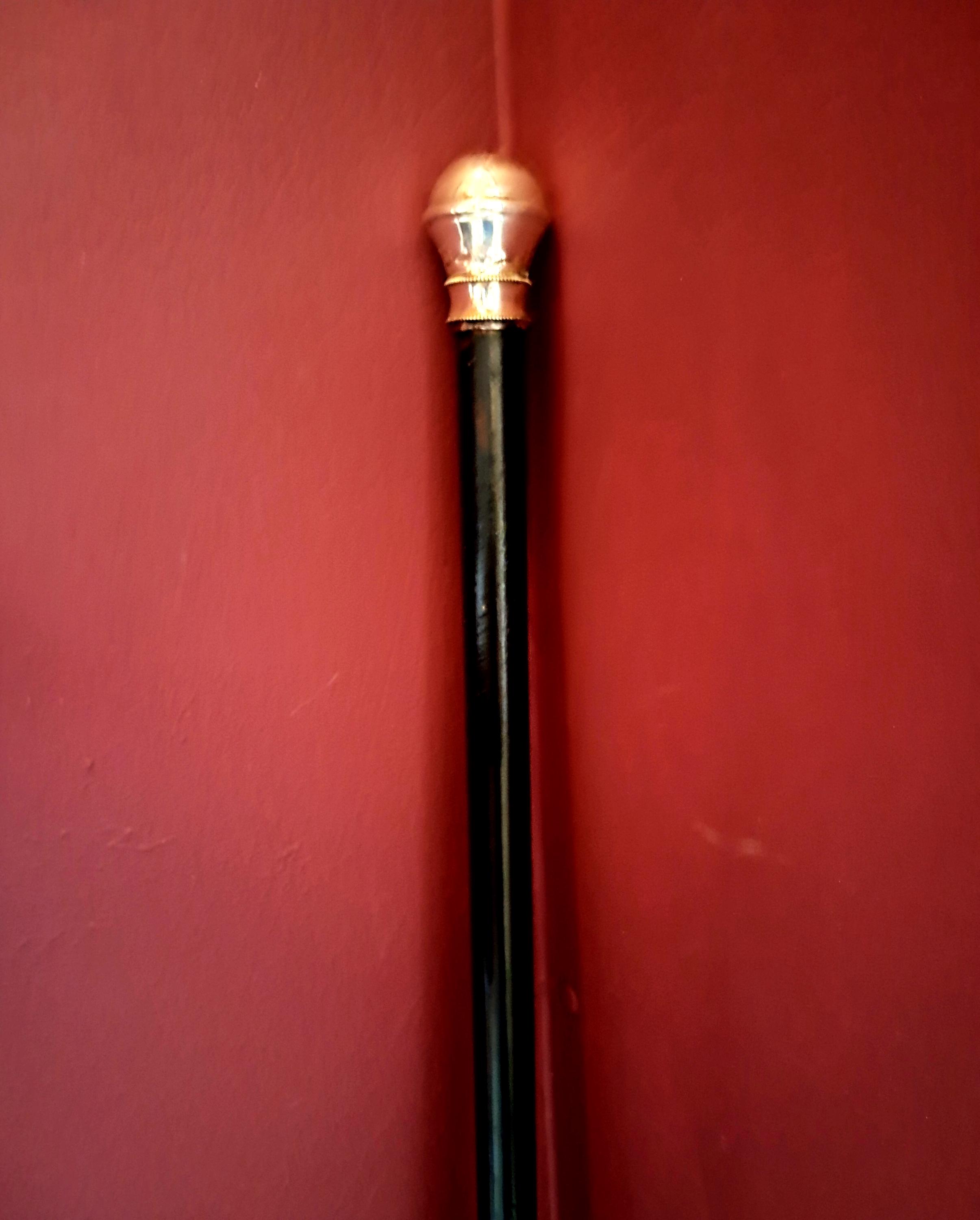A sturdy antique walking stick made of ebonised hardwood with a spherical handle made of 830 silver (according to acid test). Brass ring and brass nail at the tip. This attractive walking stick feels heavy in the hand and, despite its elegant appearance, can withstand a lot. Engraved initials ‘A.M.N.’ Condition: Good condition, everything is stable, but after such a long time, the handle shows some signs of wear. Dimensions: Total length 96 cm, diameter of knob 4 cm, height of knob 5.5 cm