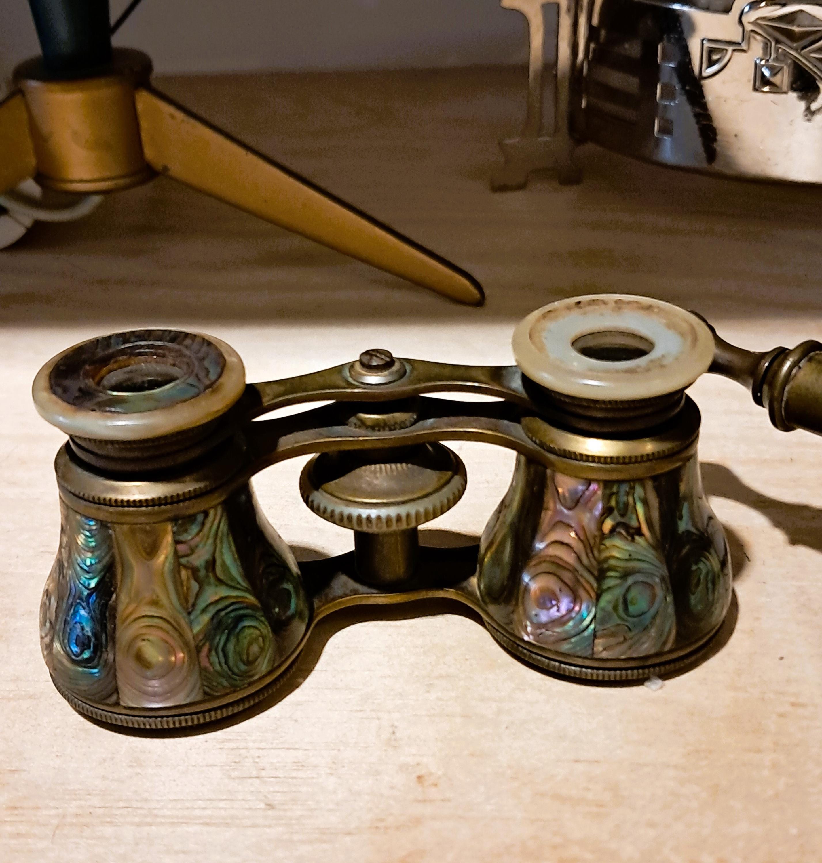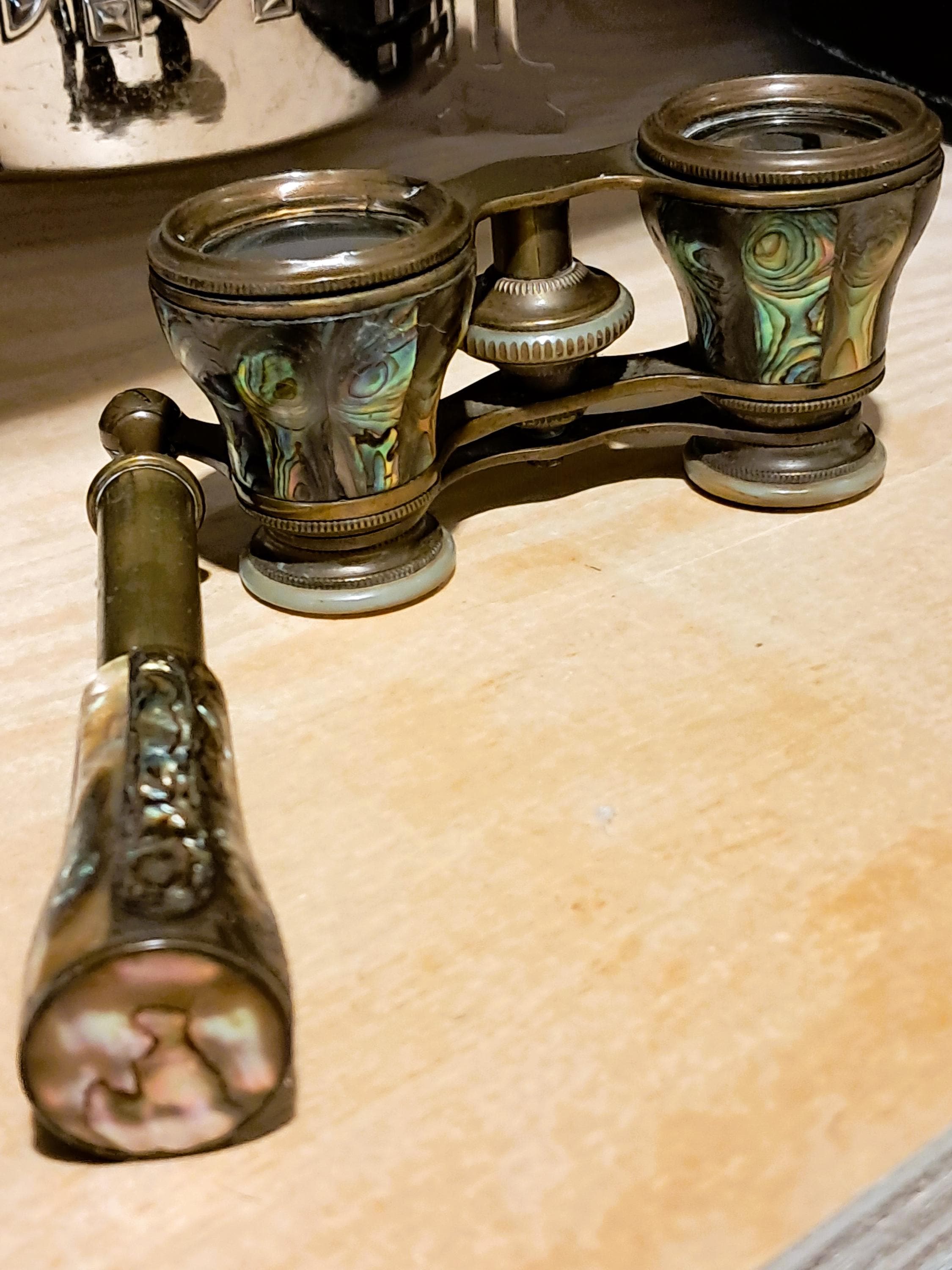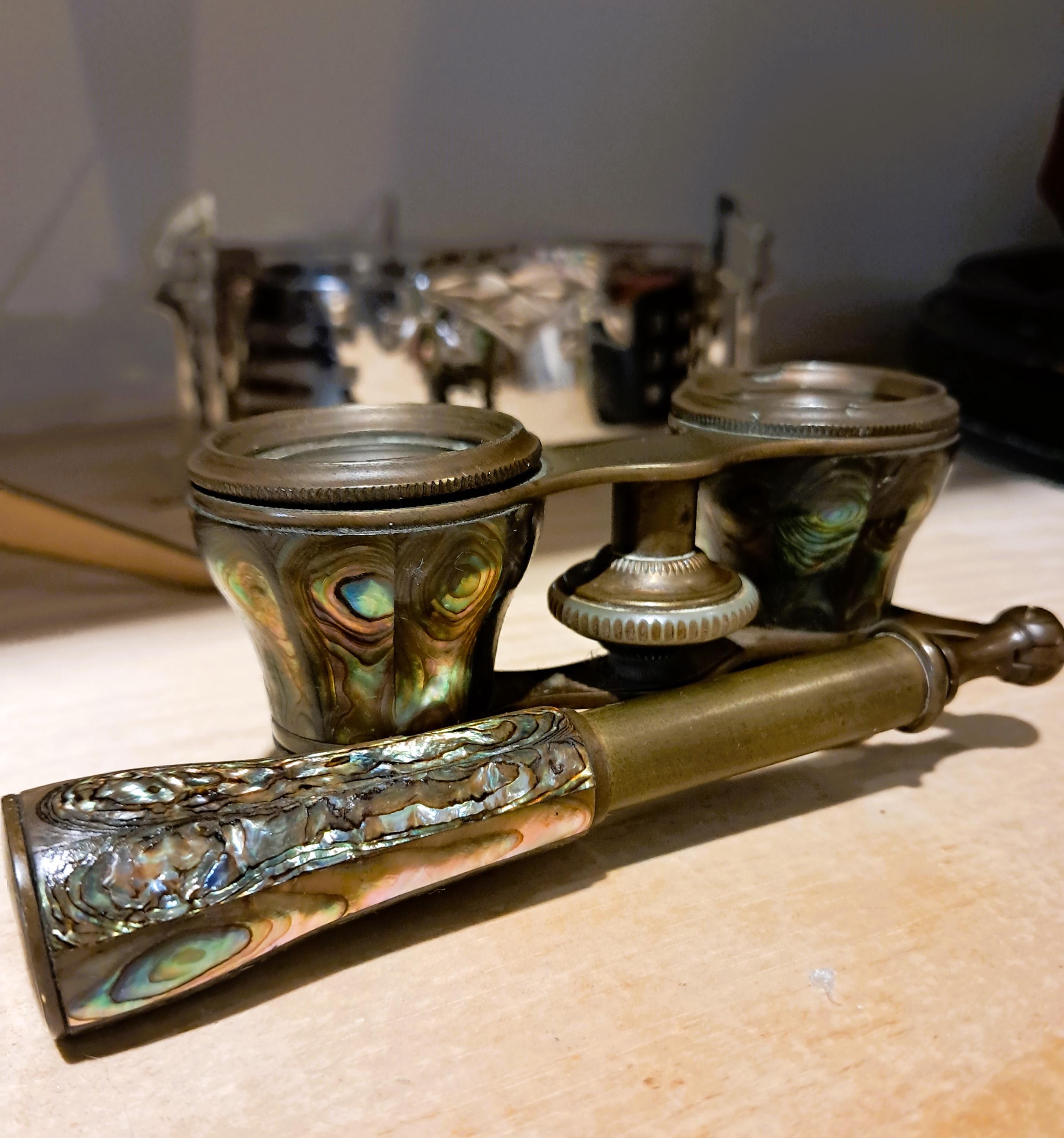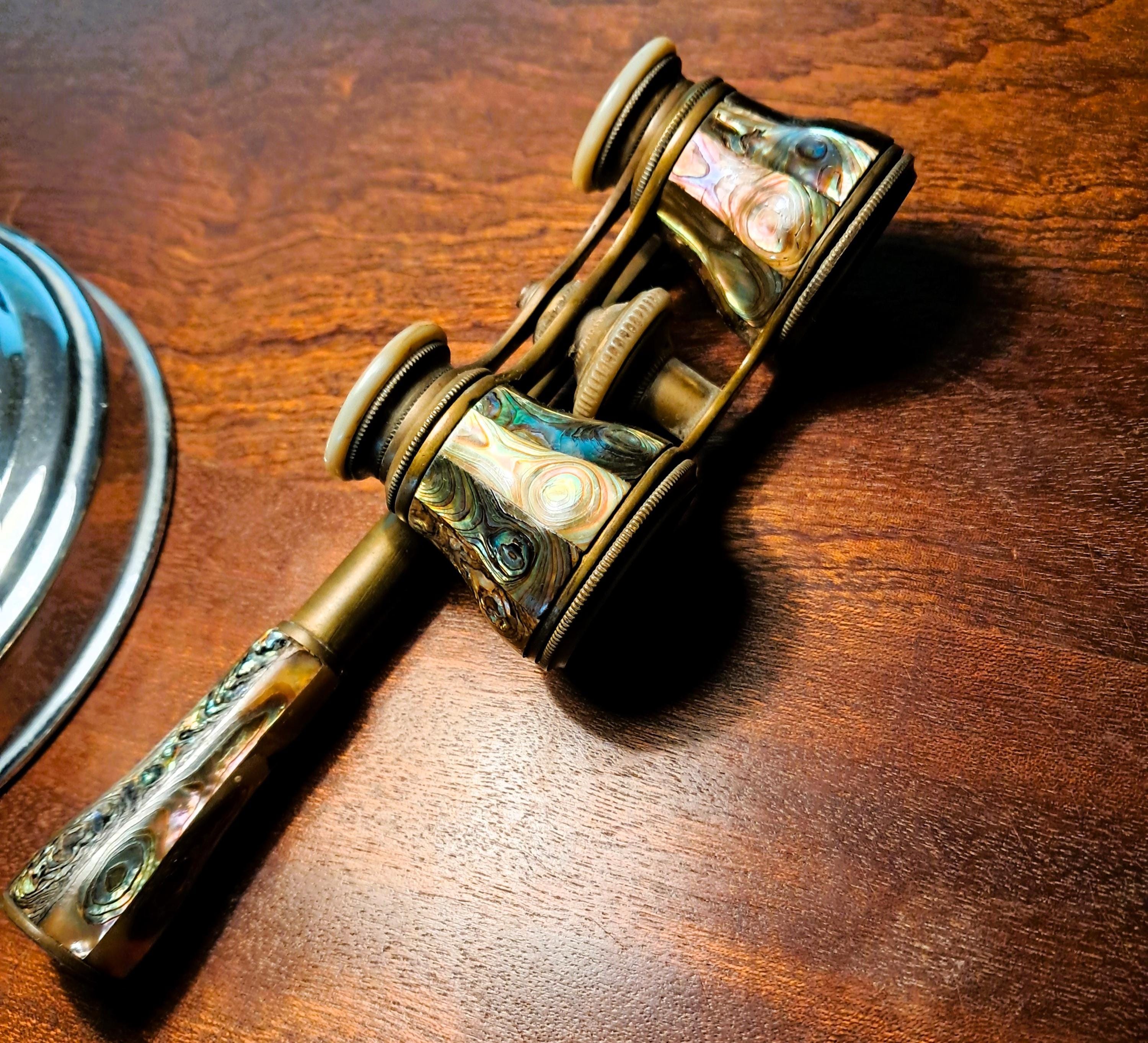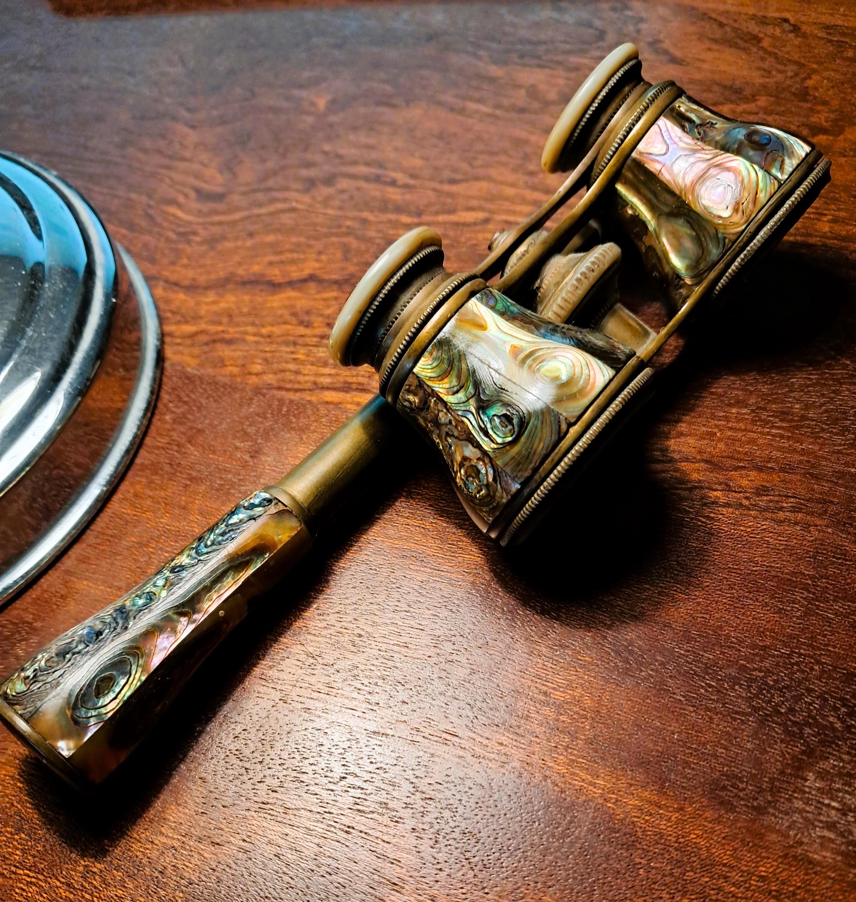 A very beautiful Opera glass made of brass and abalone shell mother-of-pearl, which has an incredibly wide colour spectrum. Everything works, including the focus adjustment and the extendable handle (telescope). All optical lenses are in good condition. Condition: Good condition except for one point: the right eyepiece is missing the abalone shell covering, which is why we are offering these opera glasses at a reduced price. Abalone shell mother-of-pearl can be purchased and used to cover the eyepiece again. Dimensions: Length with handle extended 30 cm/with handle retracted 22 cm. Height of opera glasses approx. 4.2 cm.