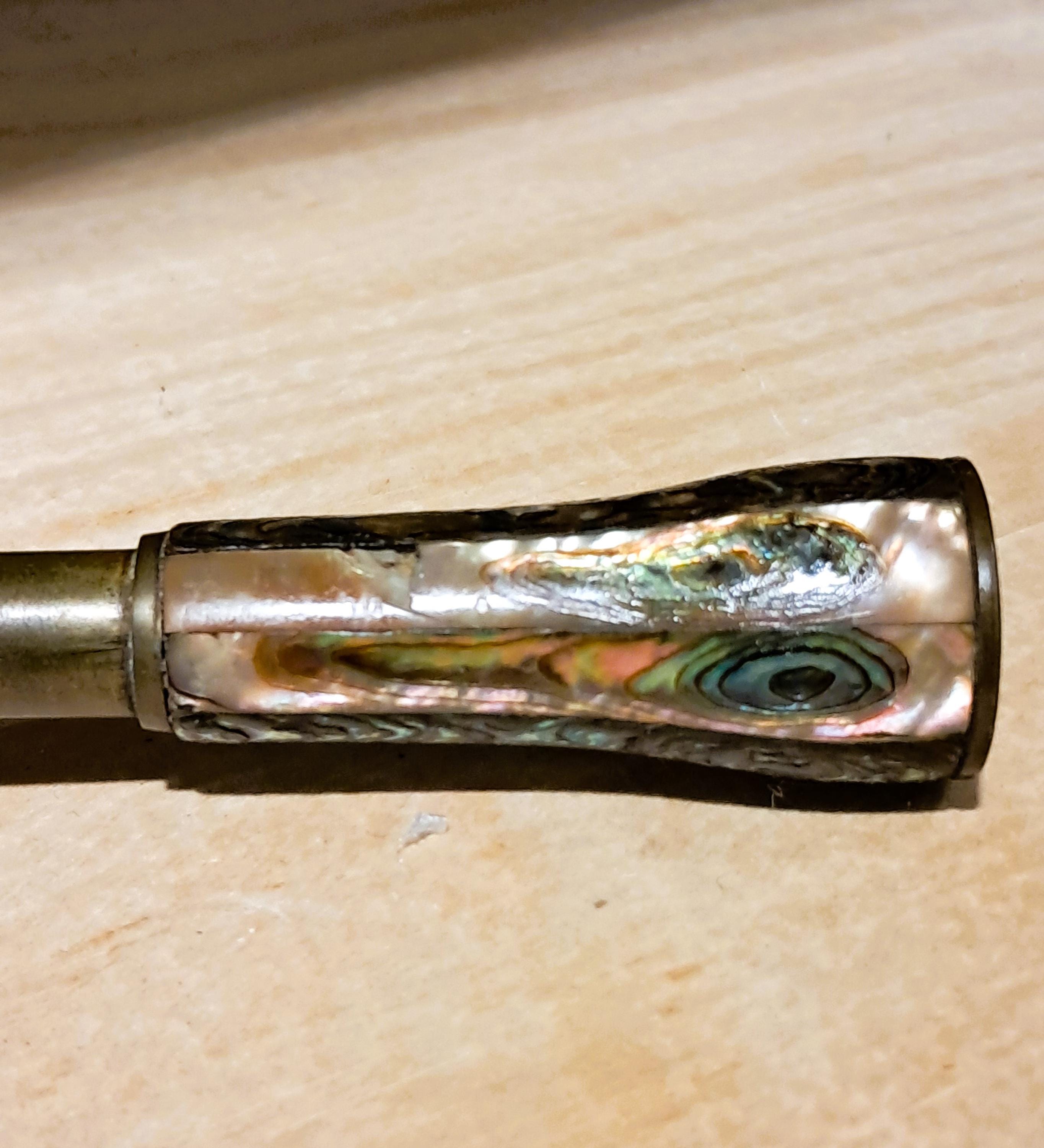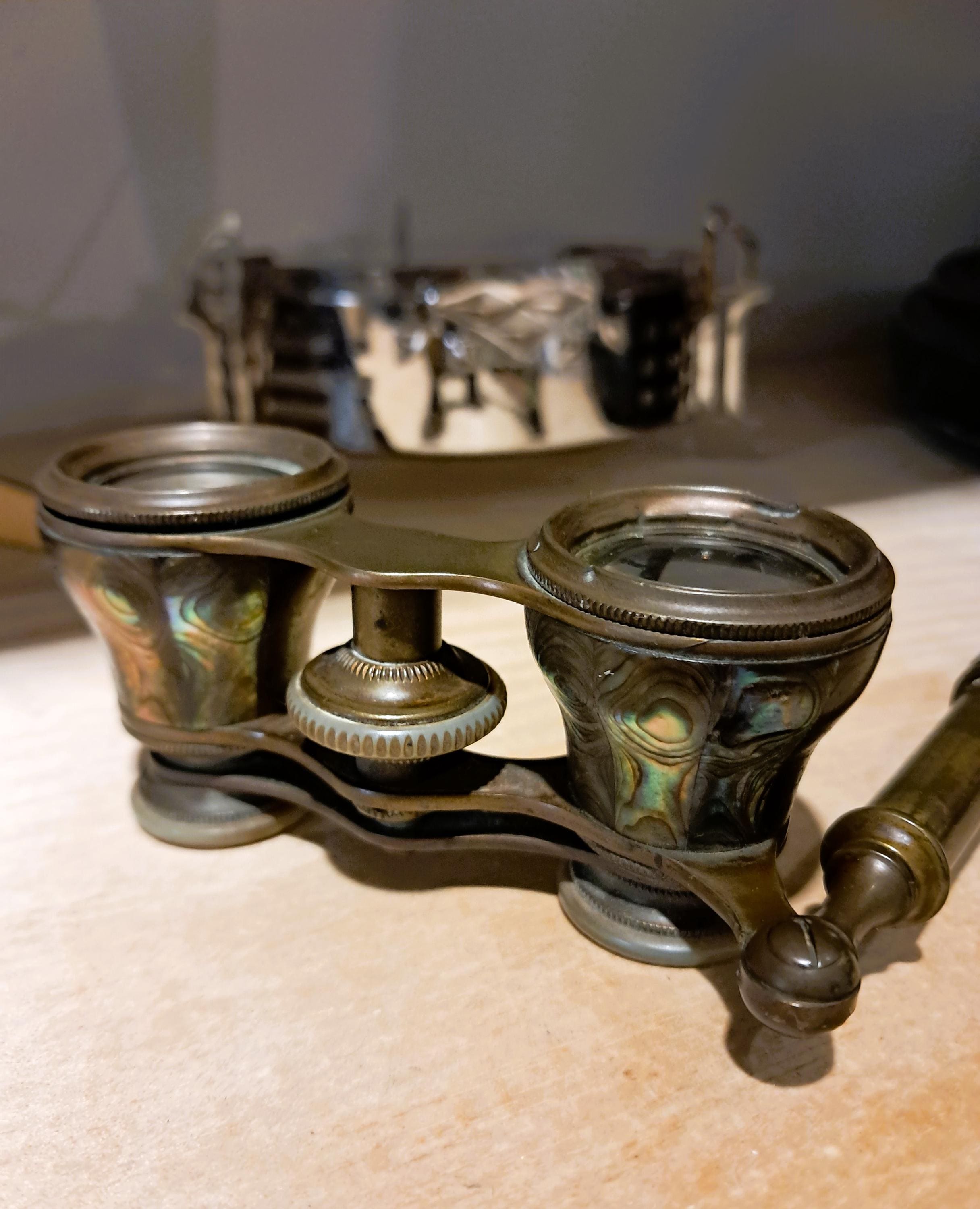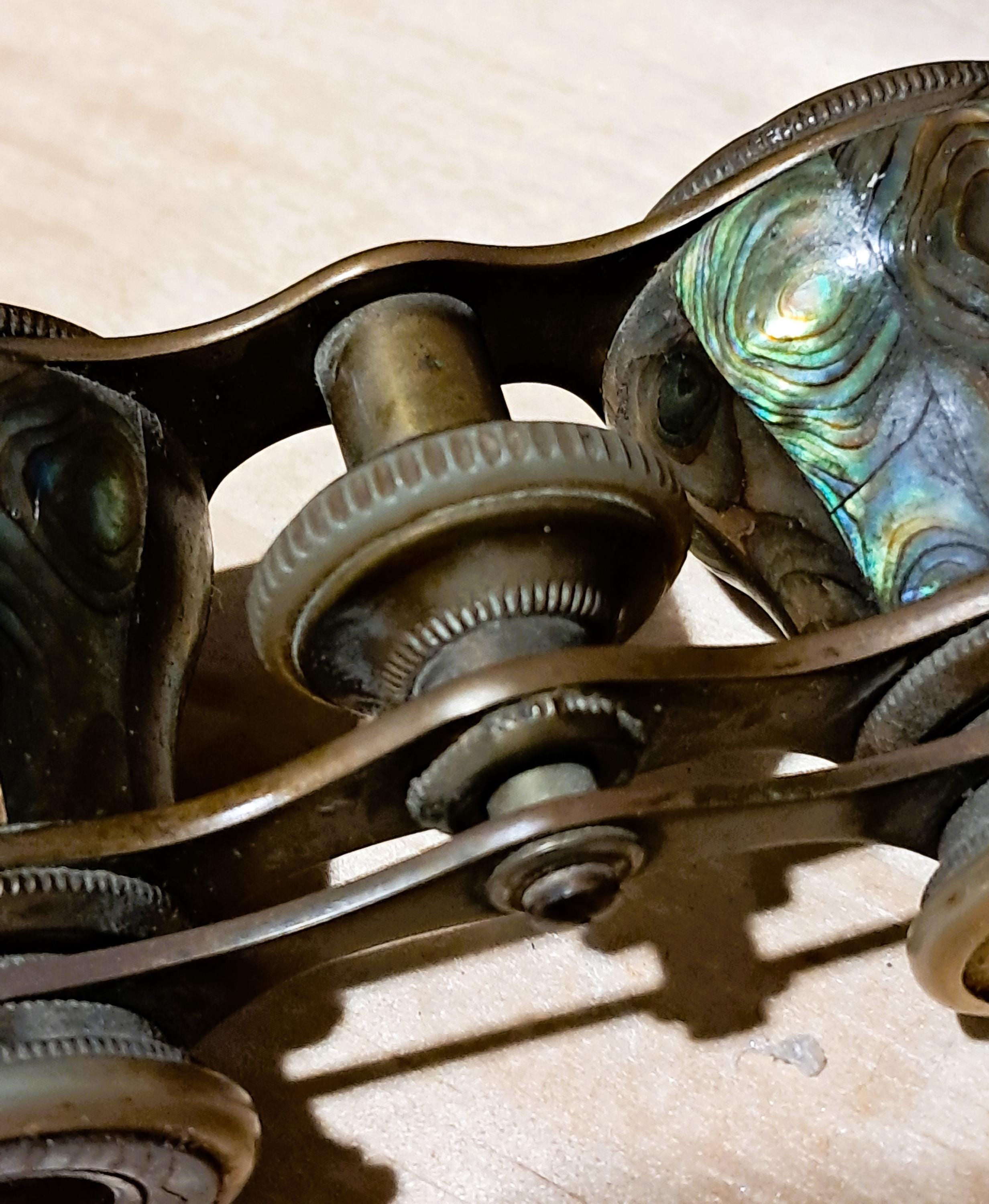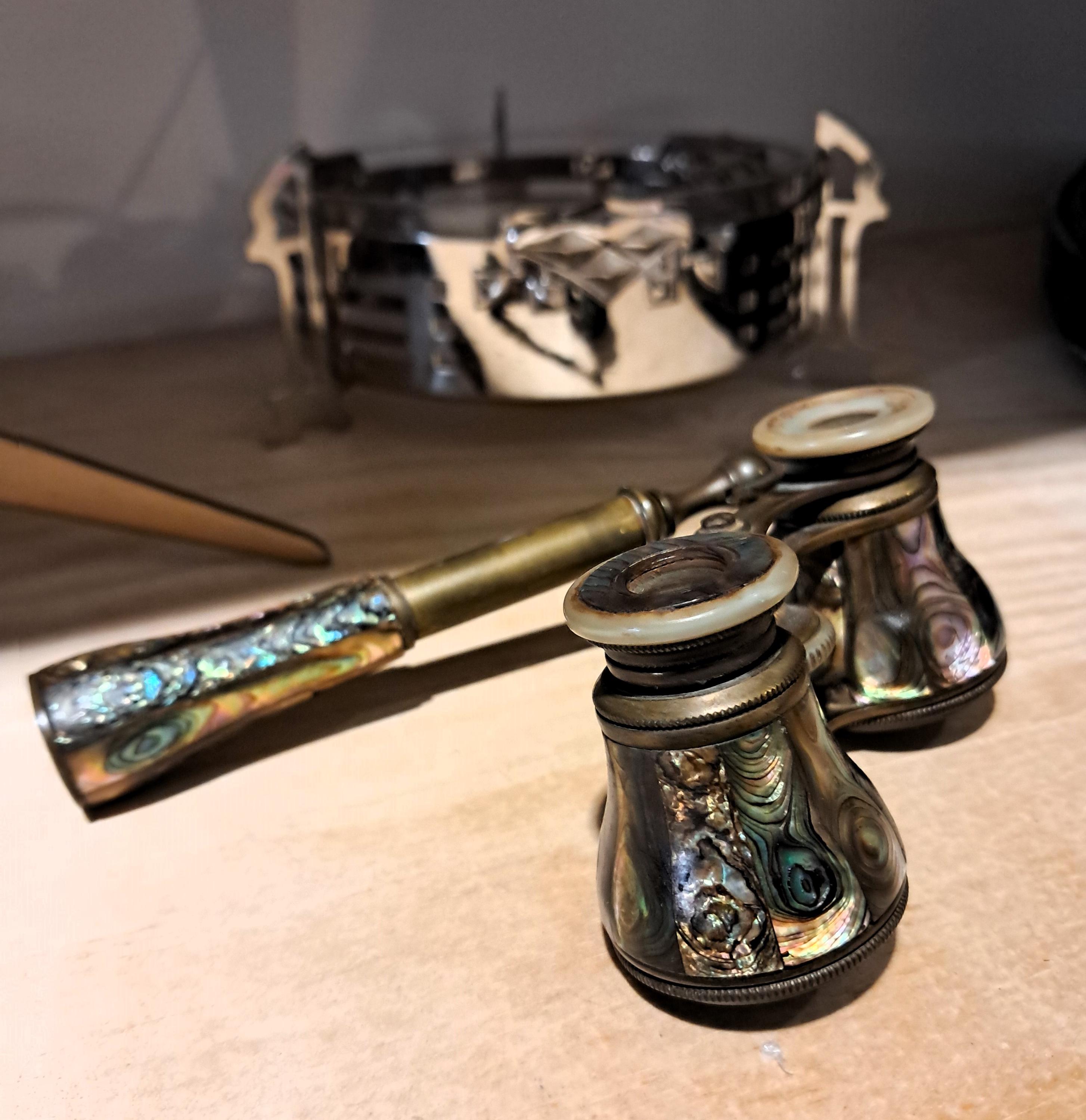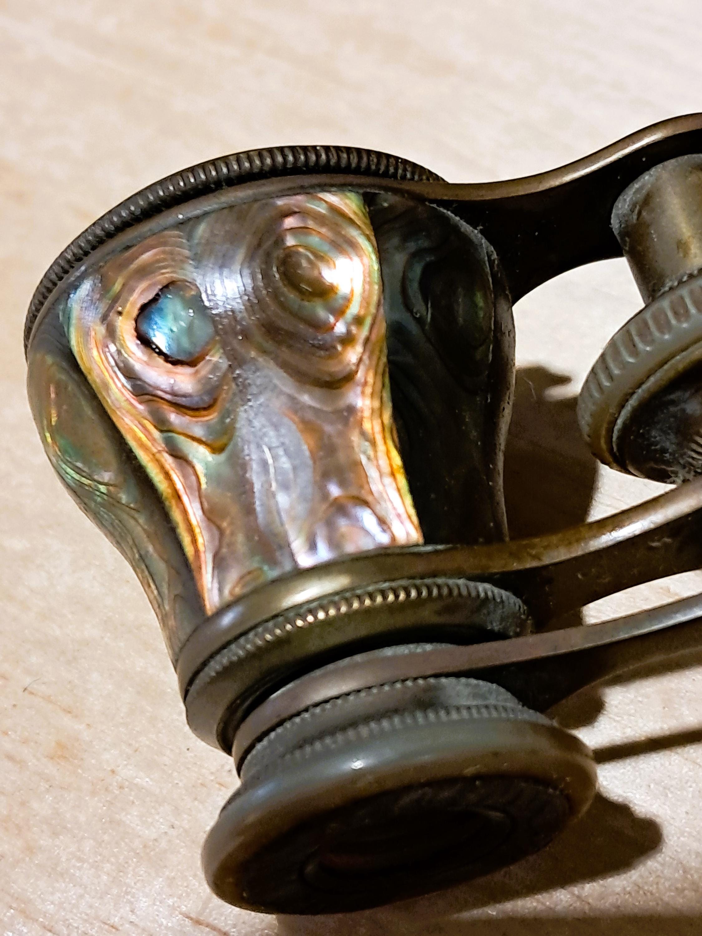 A very beautiful Opera glass made of brass and abalone shell mother-of-pearl, which has an incredibly wide colour spectrum. Everything works, including the focus adjustment and the extendable handle (telescope). All optical lenses are in good condition. Condition: Good condition except for one point: the right eyepiece is missing the abalone shell covering, which is why we are offering these opera glasses at a reduced price. Abalone shell mother-of-pearl can be purchased and used to cover the eyepiece again. Dimensions: Length with handle extended 30 cm/with handle retracted 22 cm. Height of opera glasses approx. 4.2 cm.