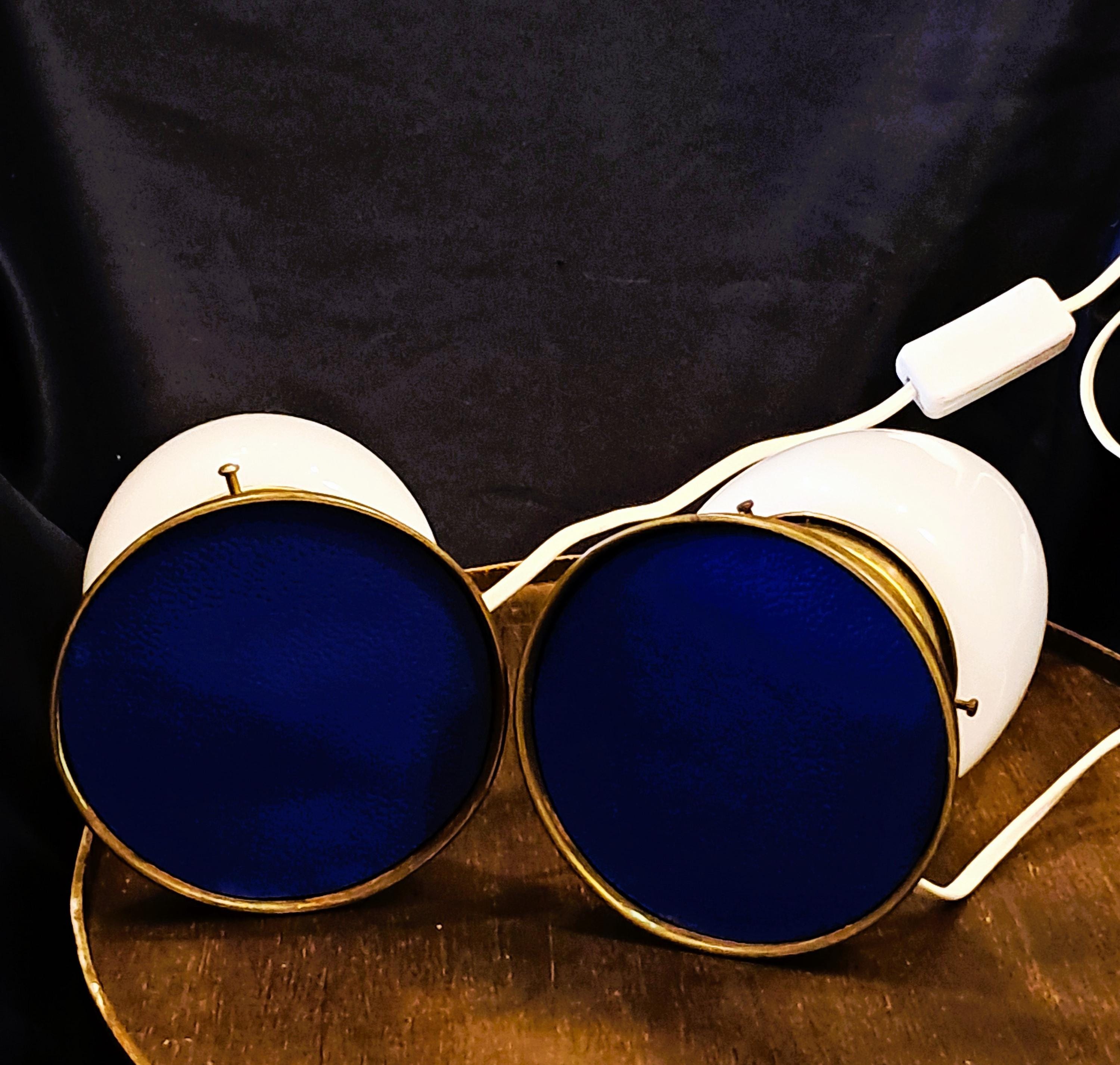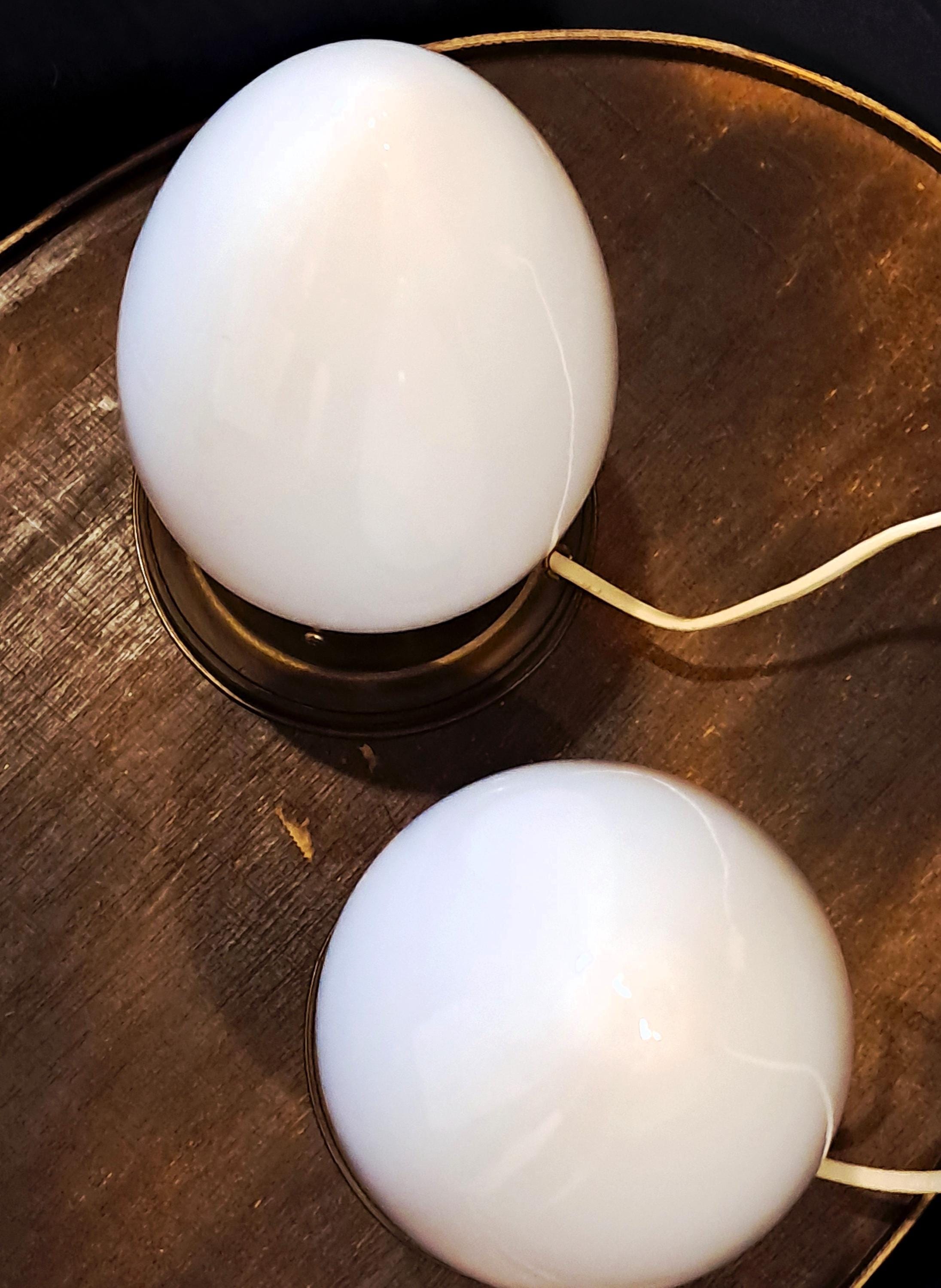 These two Art Deco style table lamps bathe a room in atmospheric light with their egg-shaped glass domes made of opaline glass. The bases are made of polished brass. Condition: Very good condition, all electrical components have been replaced. Dimensions: Diameter 10 cm, height 26 cm