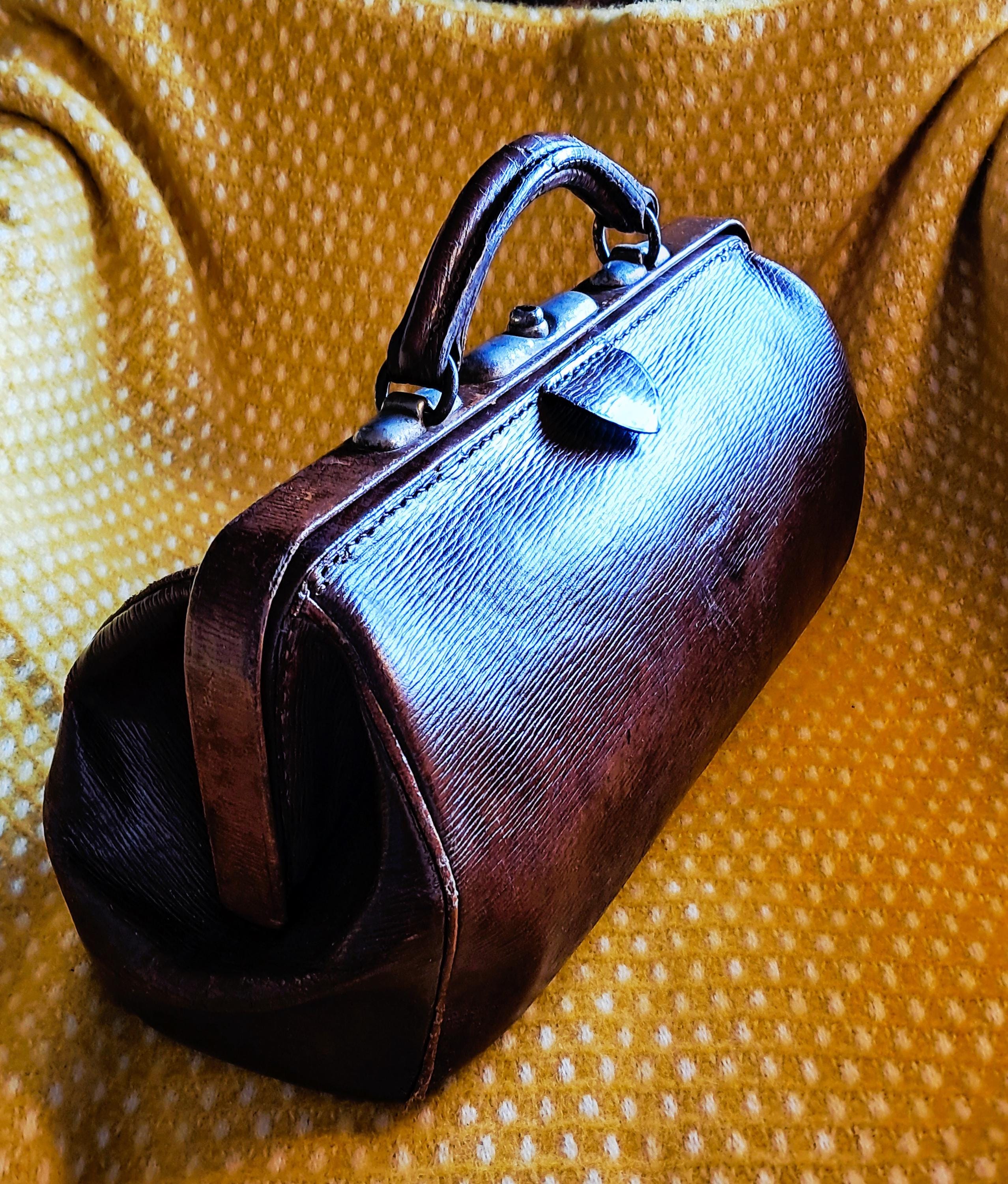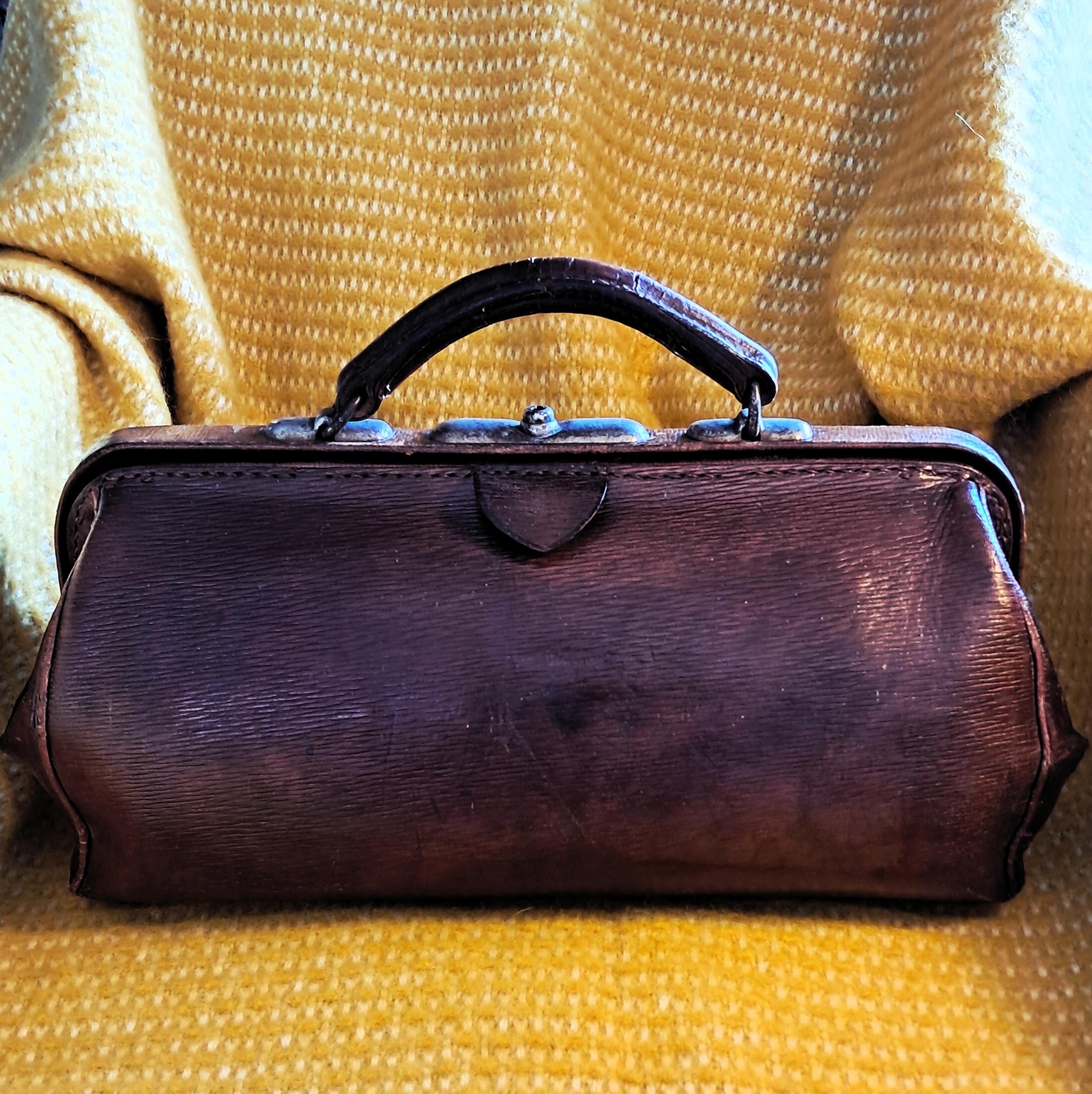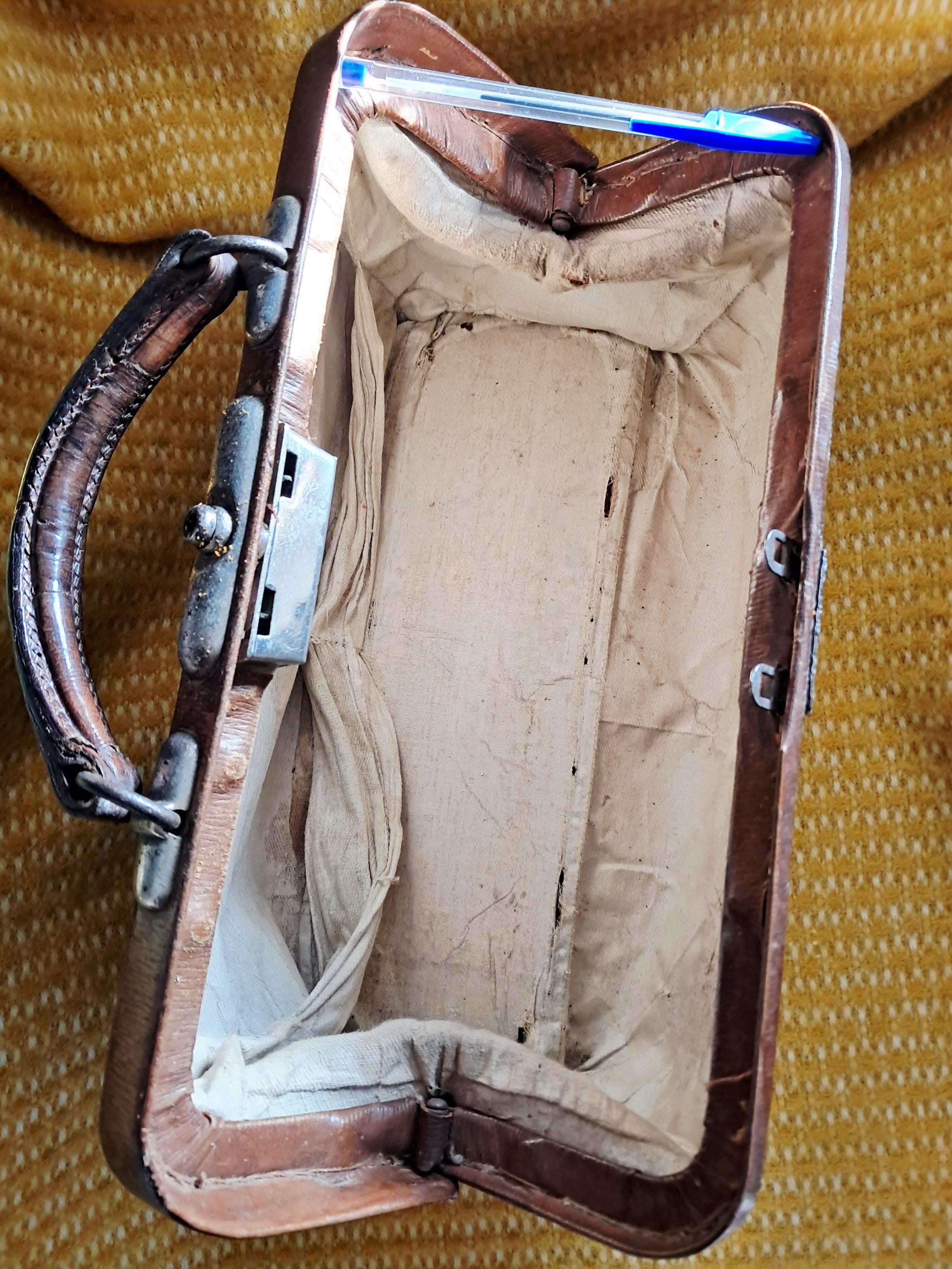 Original doctor's bag from the 1950s, probably from the Netherlands. Everything about the bag is original and works well. A fashionable accessory from a bygone era. Condition: Significant signs of wear, inner lining could be replaced, all fastenings work perfectly, everything is very sturdy. The bag can be used daily. Dimensions: Length 40 cm, width 19 cm, height (including handle) 24 cm