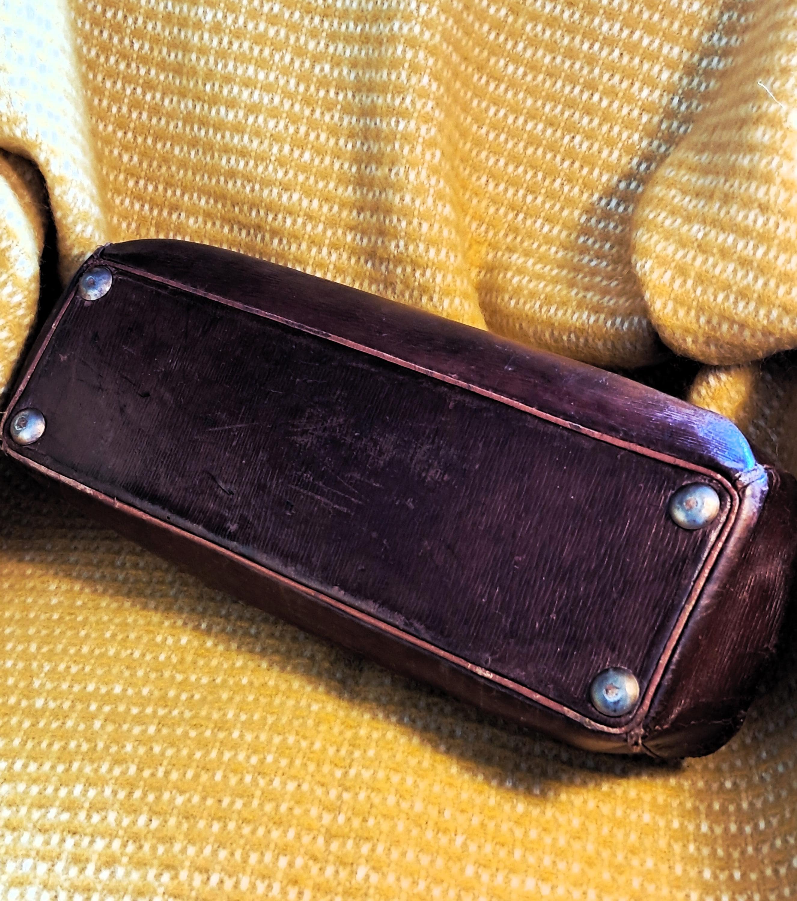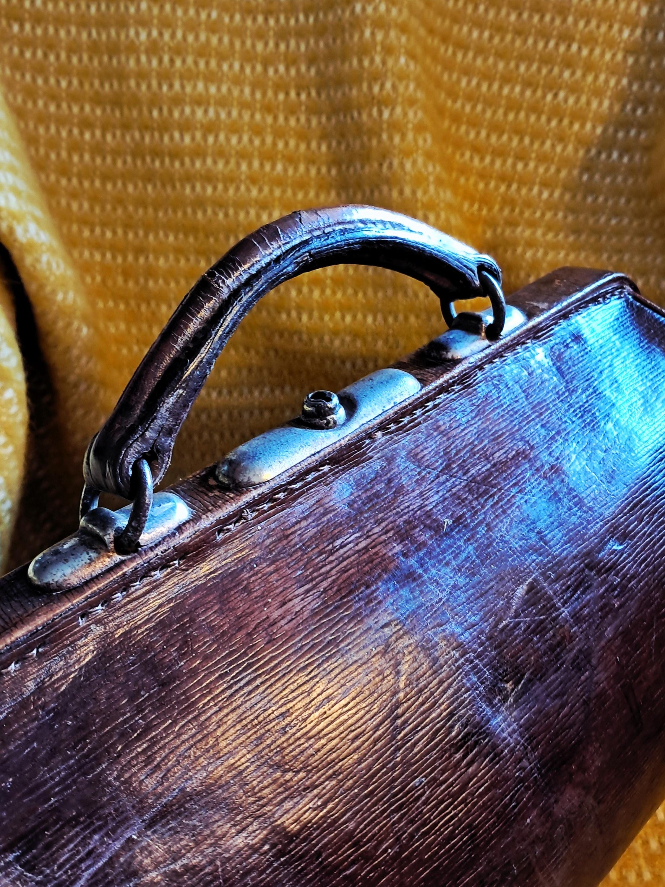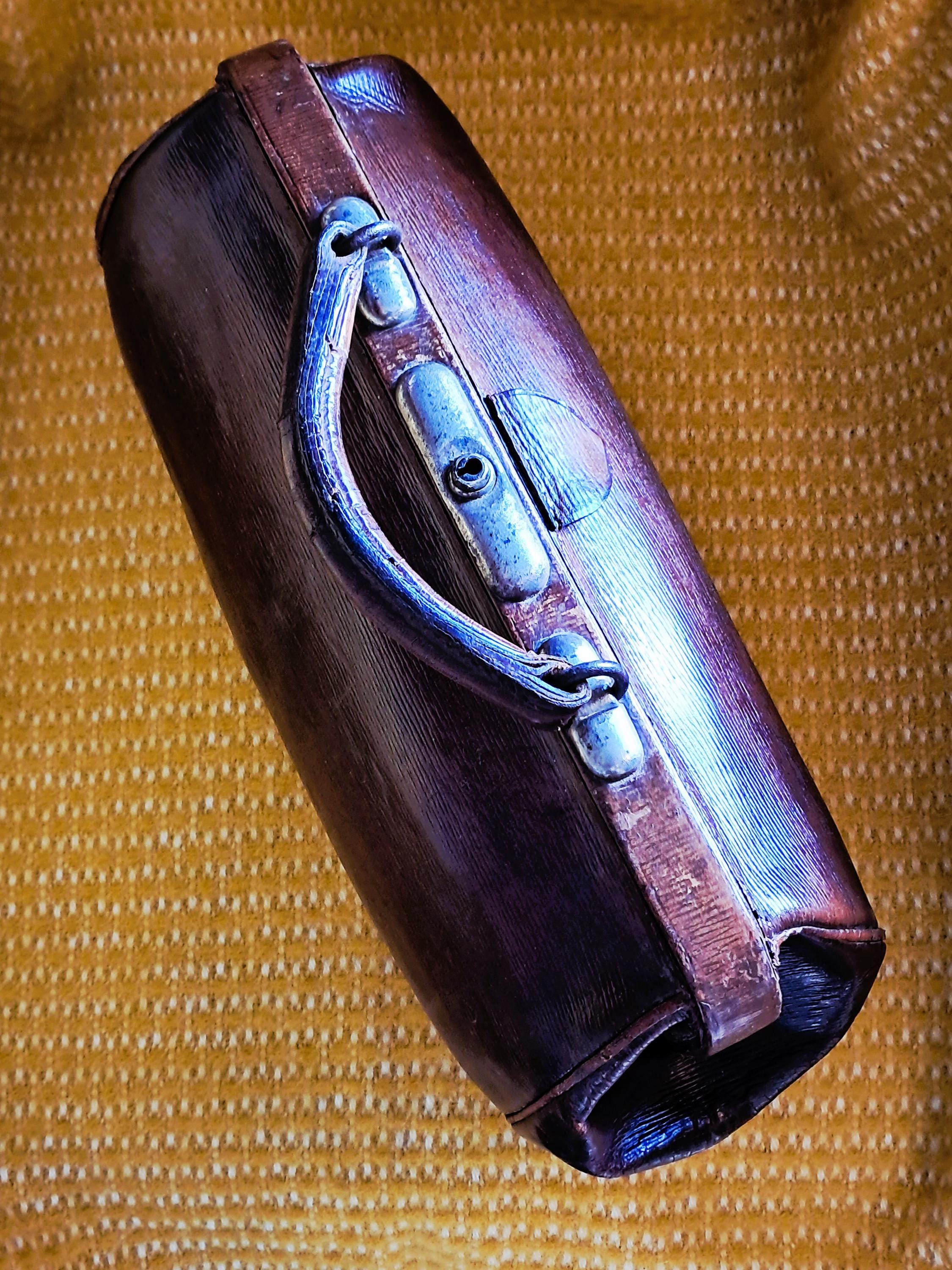 Original doctor's bag from the 1950s, probably from the Netherlands. Everything about the bag is original and works well. A fashionable accessory from a bygone era. Condition: Significant signs of wear, inner lining could be replaced, all fastenings work perfectly, everything is very sturdy. The bag can be used daily. Dimensions: Length 40 cm, width 19 cm, height (including handle) 24 cm