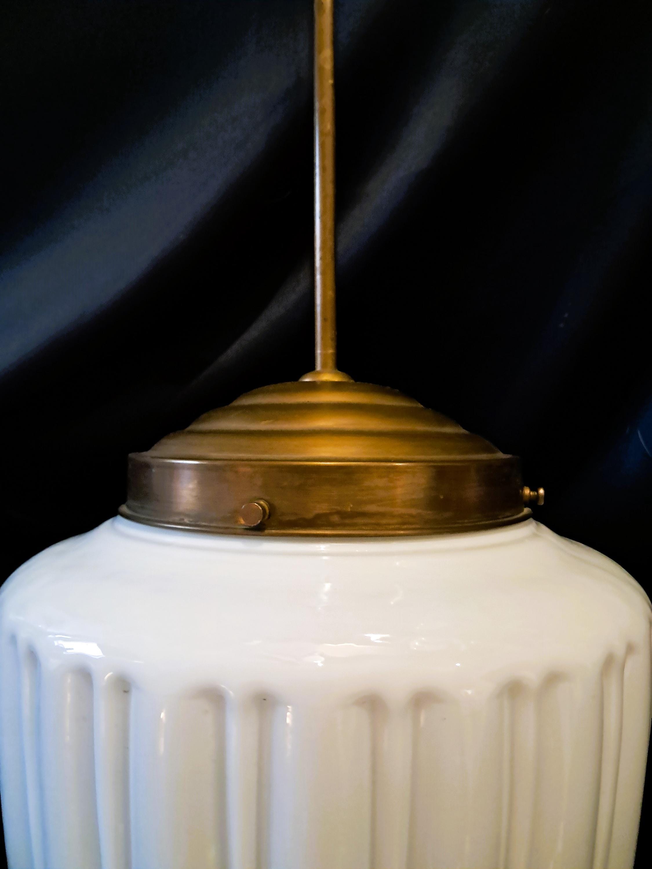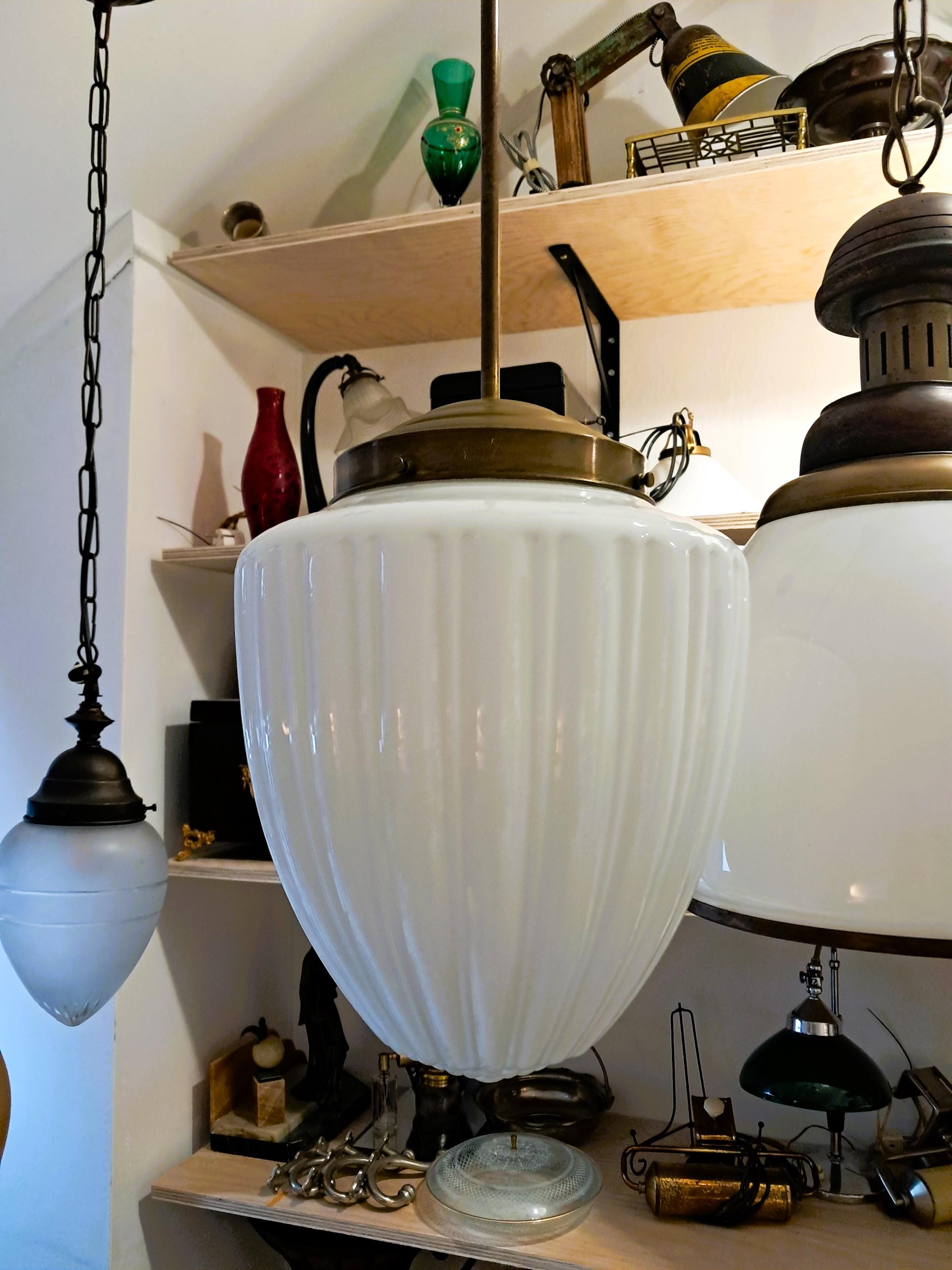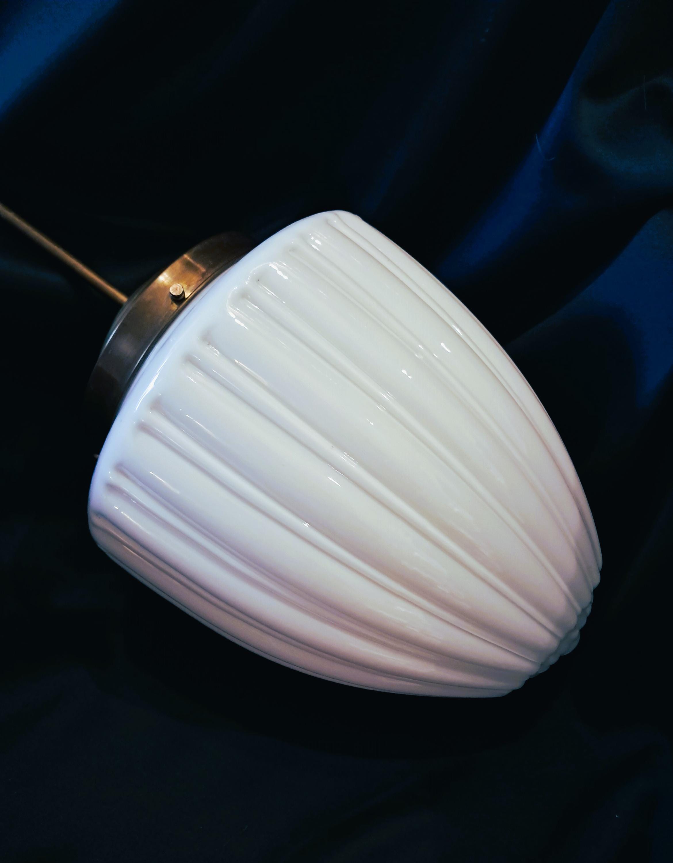 Attractive pendant light made of brass and opaline glass. Appealingly designed glass body. Condition: Very good condition, glass without damage, brass fitting with patina. Can be connected as is. Dimensions: Total height 92 cm, height of glass body 26 cm, diameter of glass body 24 cm