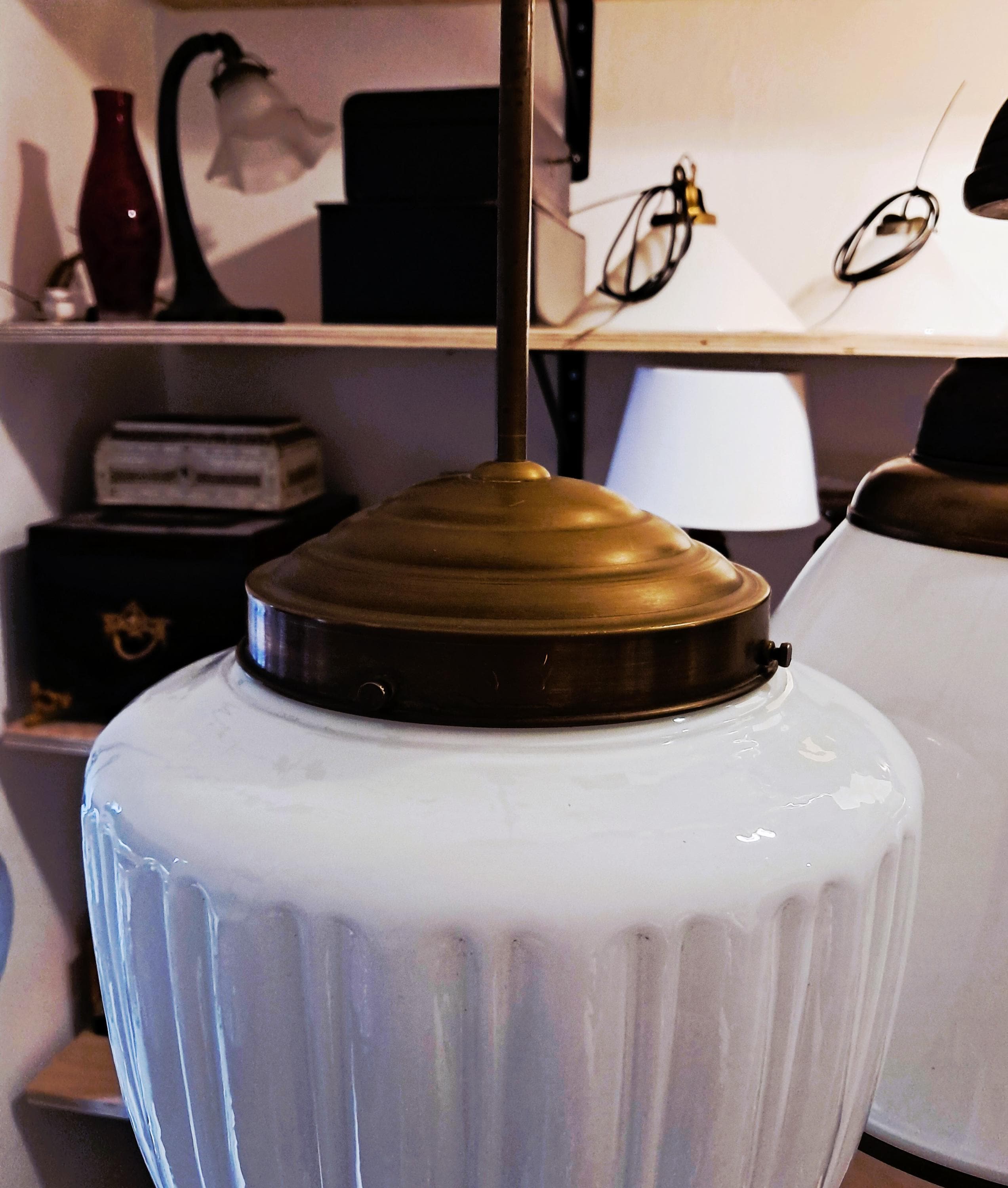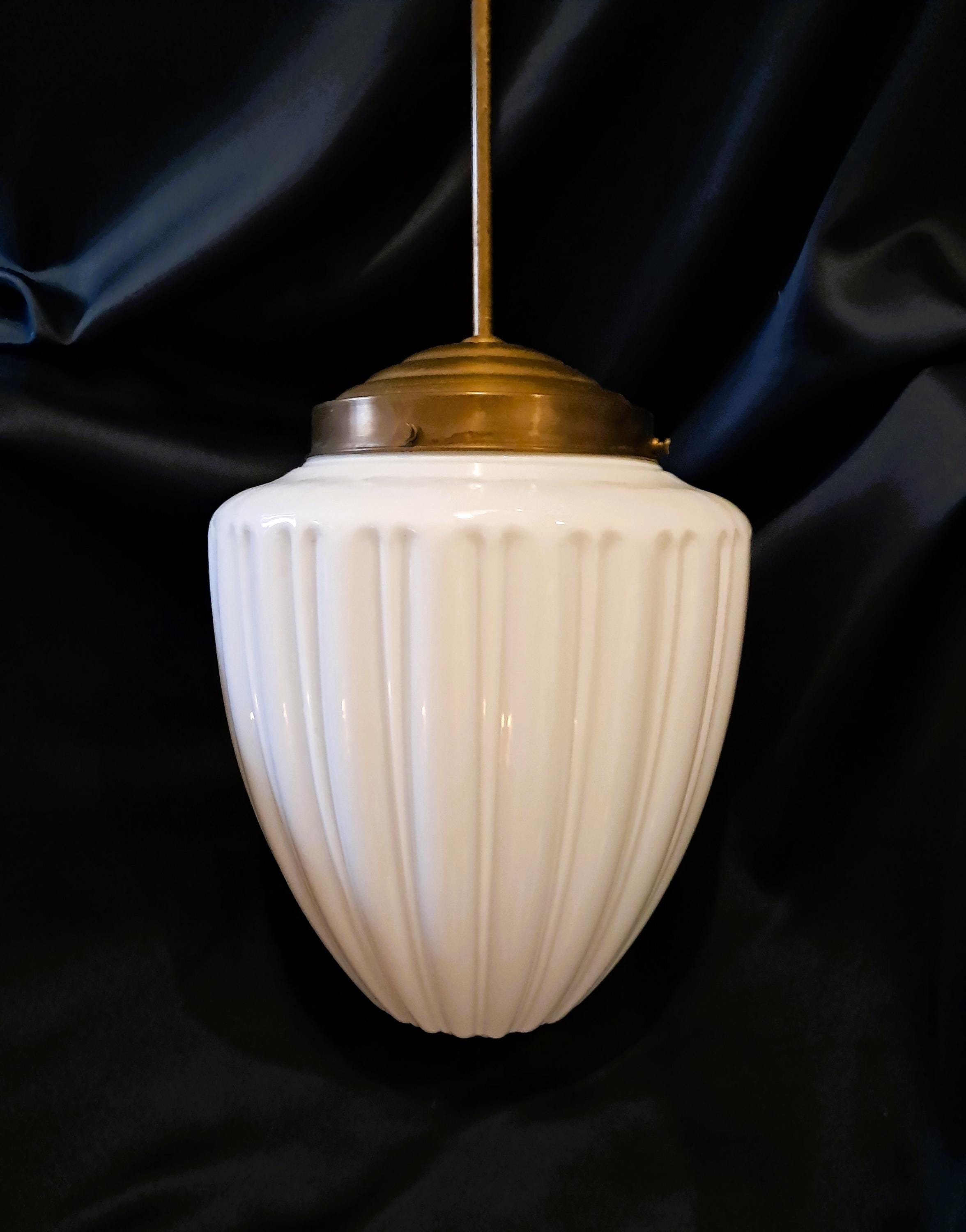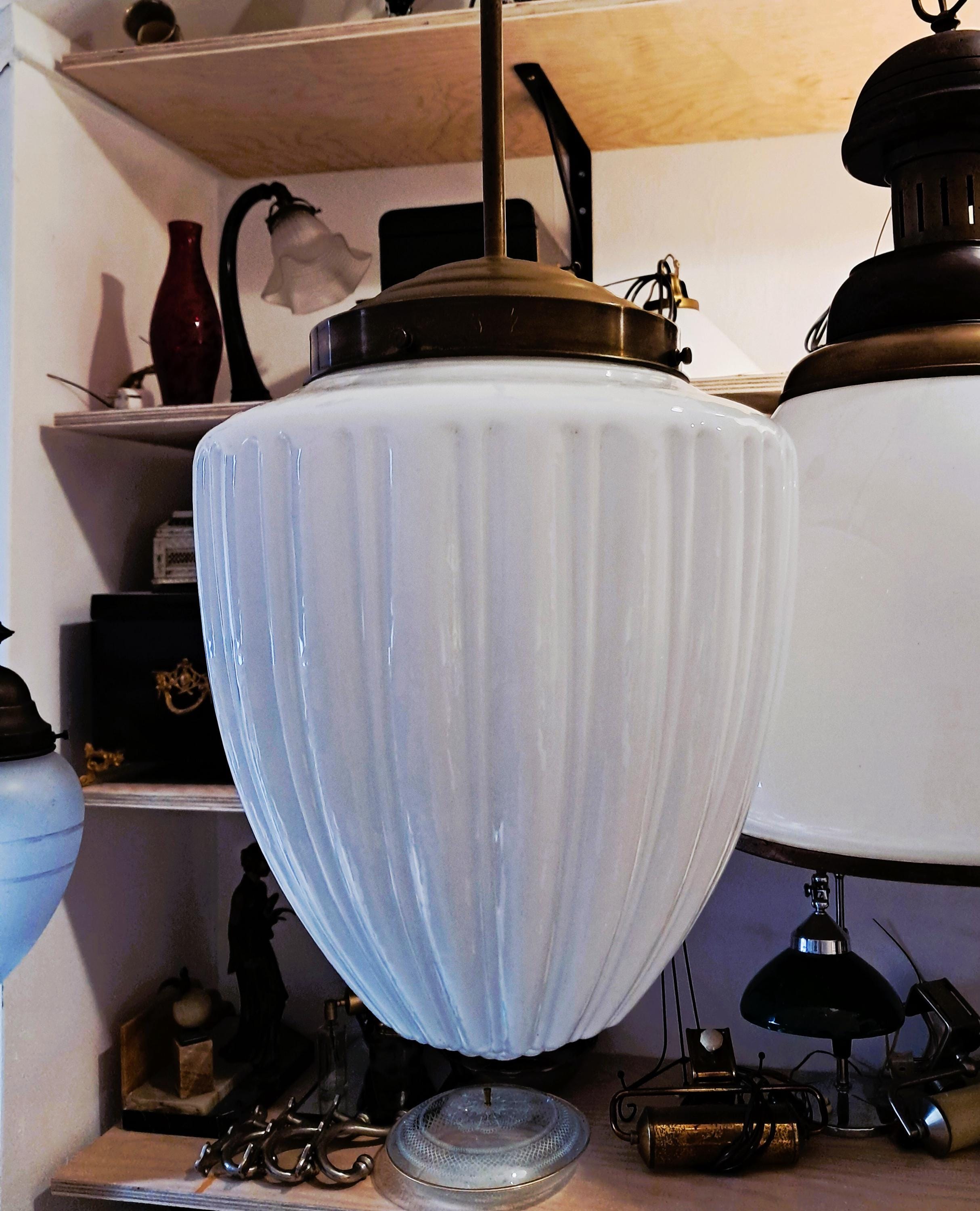 Attractive pendant light made of brass and opaline glass. Appealingly designed glass body. Condition: Very good condition, glass without damage, brass fitting with patina. Can be connected as is. Dimensions: Total height 92 cm, height of glass body 26 cm, diameter of glass body 24 cm