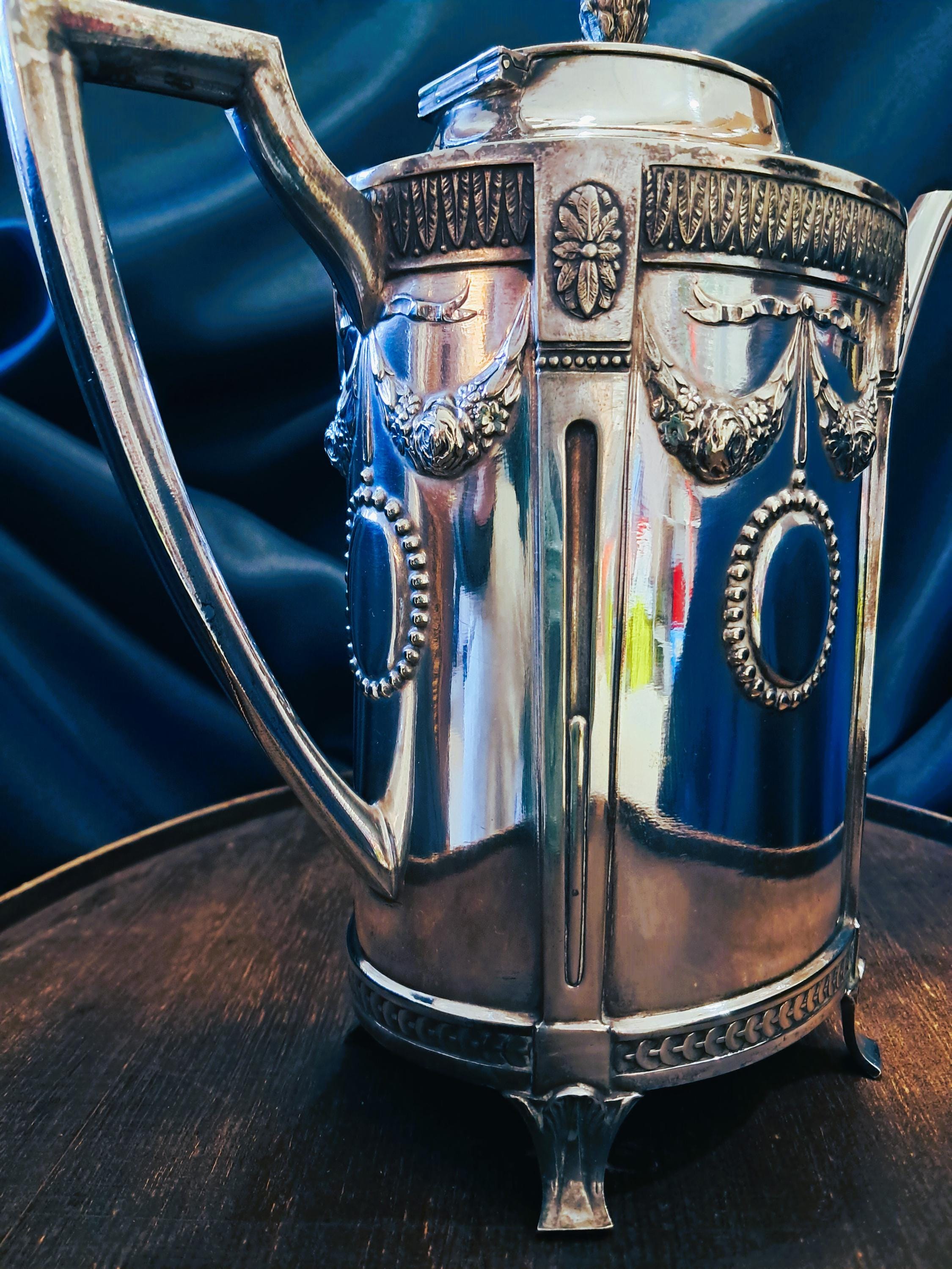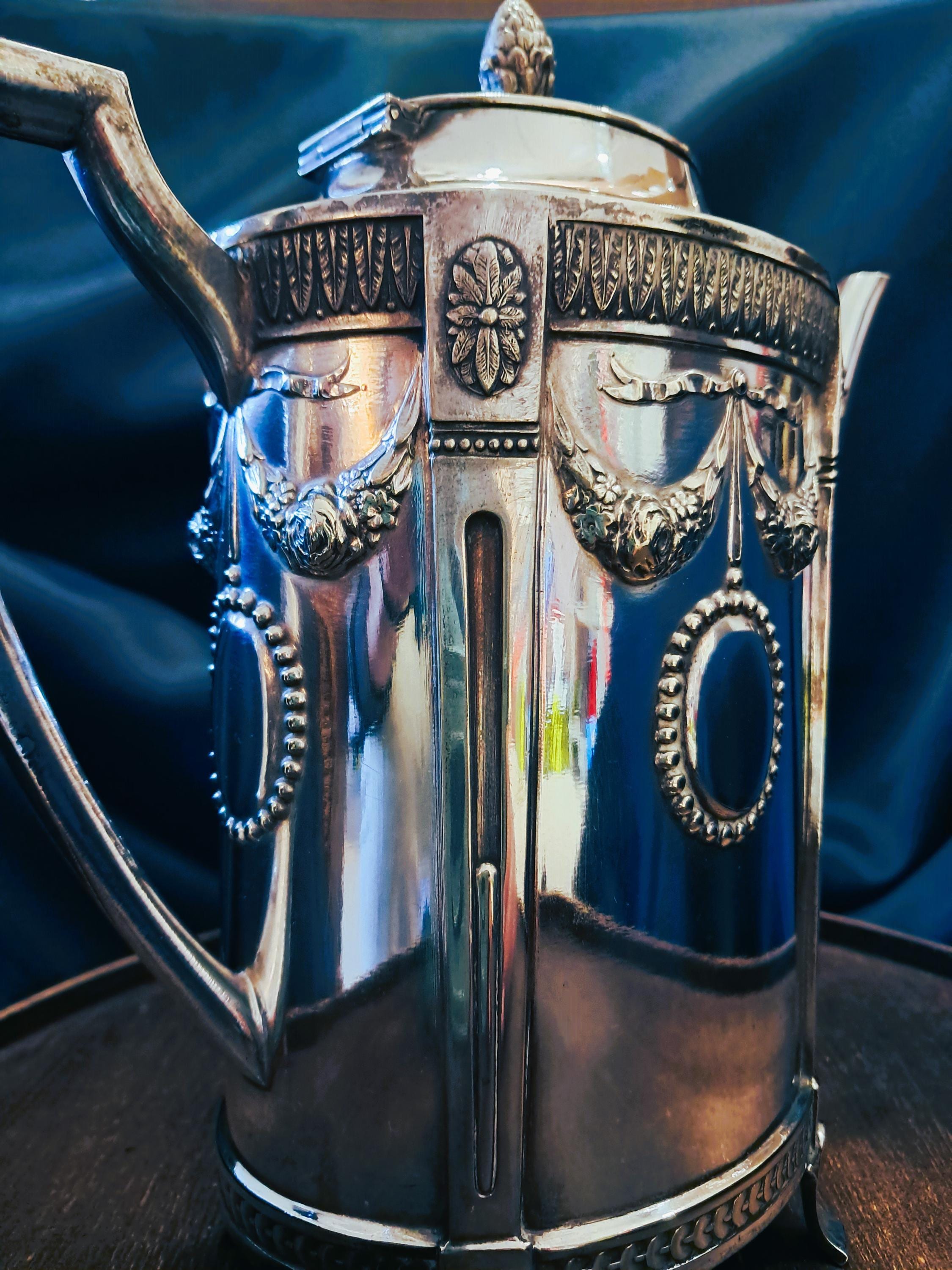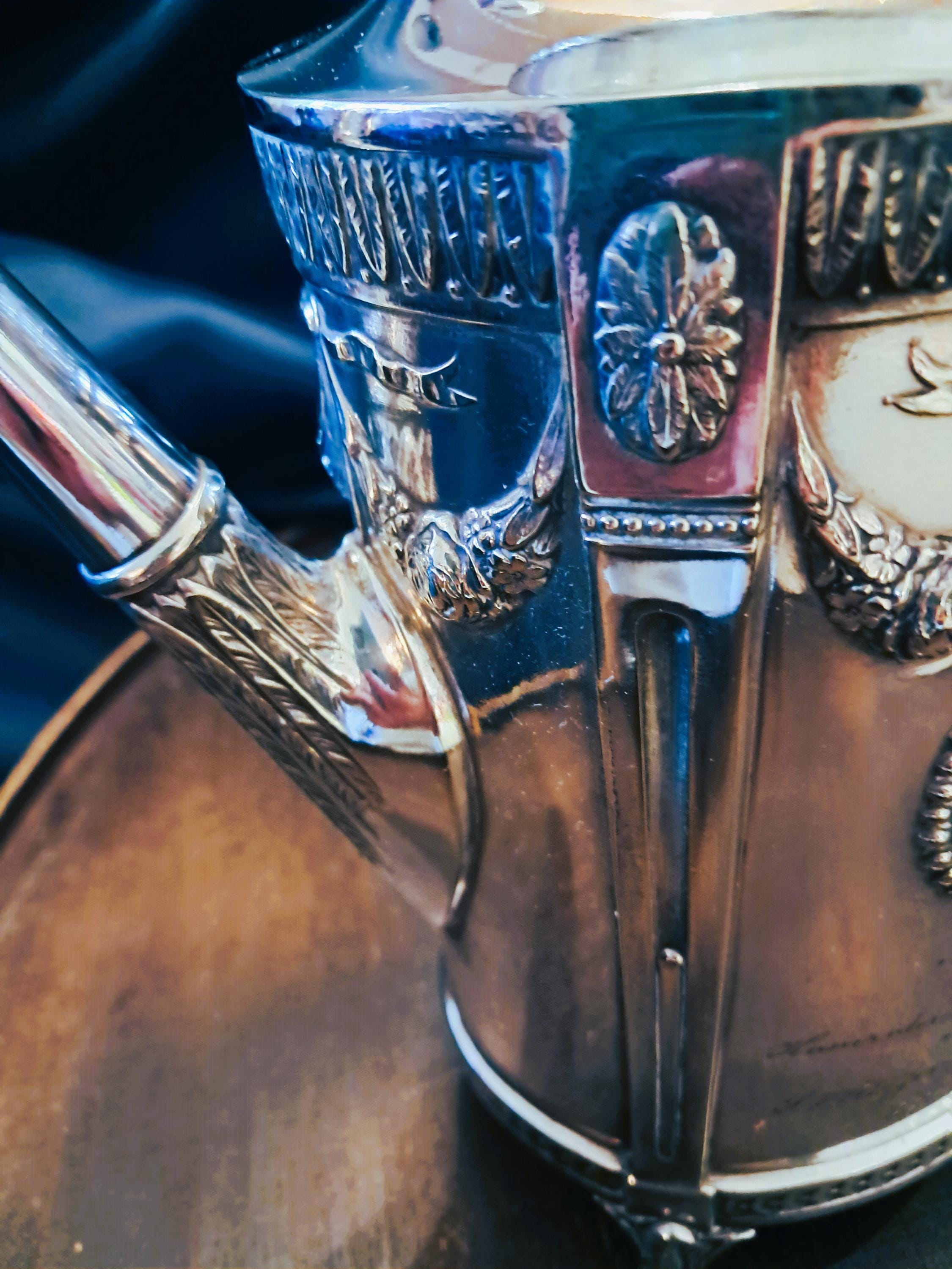 This jug was made around 1910 by C.G. Hallberg in nickel silver (tin/silver alloy). The design was based on the Gustavian style, which was influenced by classicism. Very finely crafted details. Condition: Despite its age, the jug is in very good condition. Age-related patina in places, but no damage. Stamped with the manufacturer's mark on the bottom. Dimensions: Height 25 cm, width 24 cm, depth 11 cm