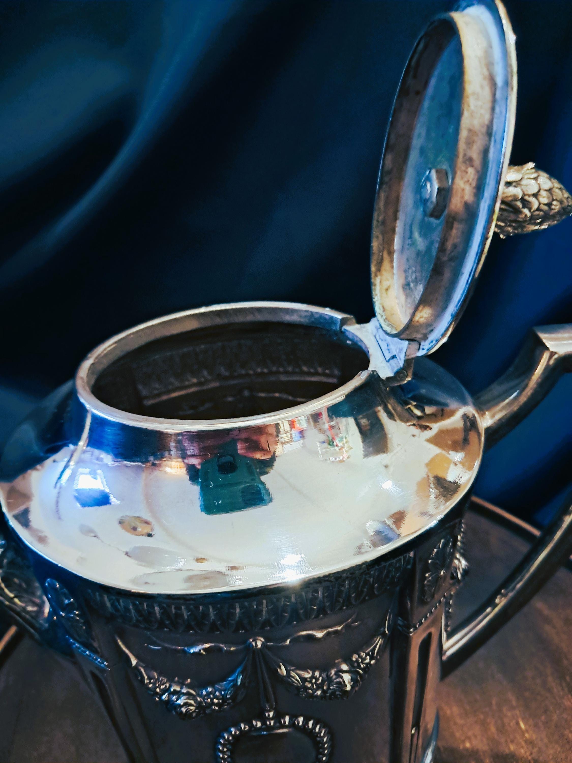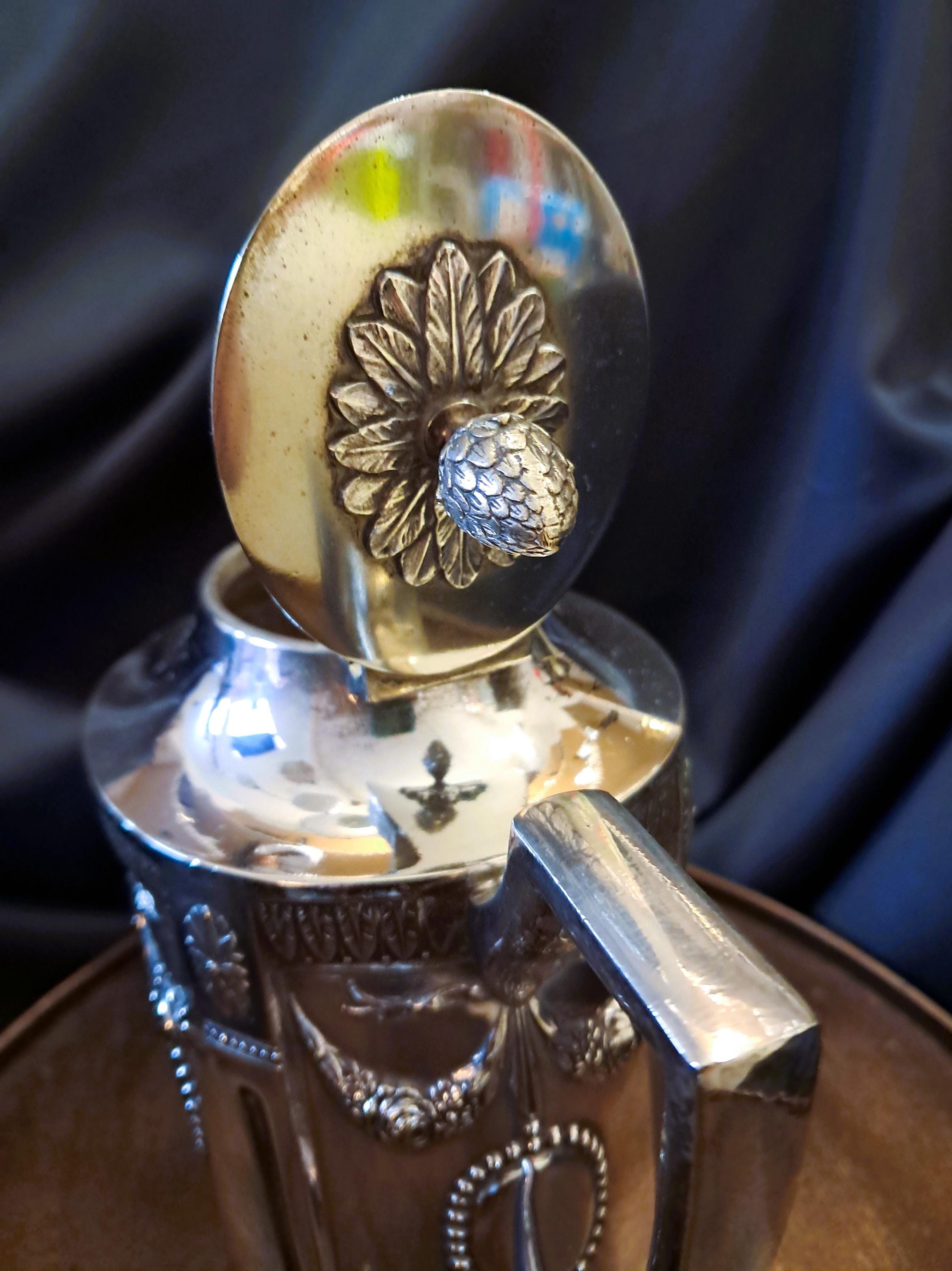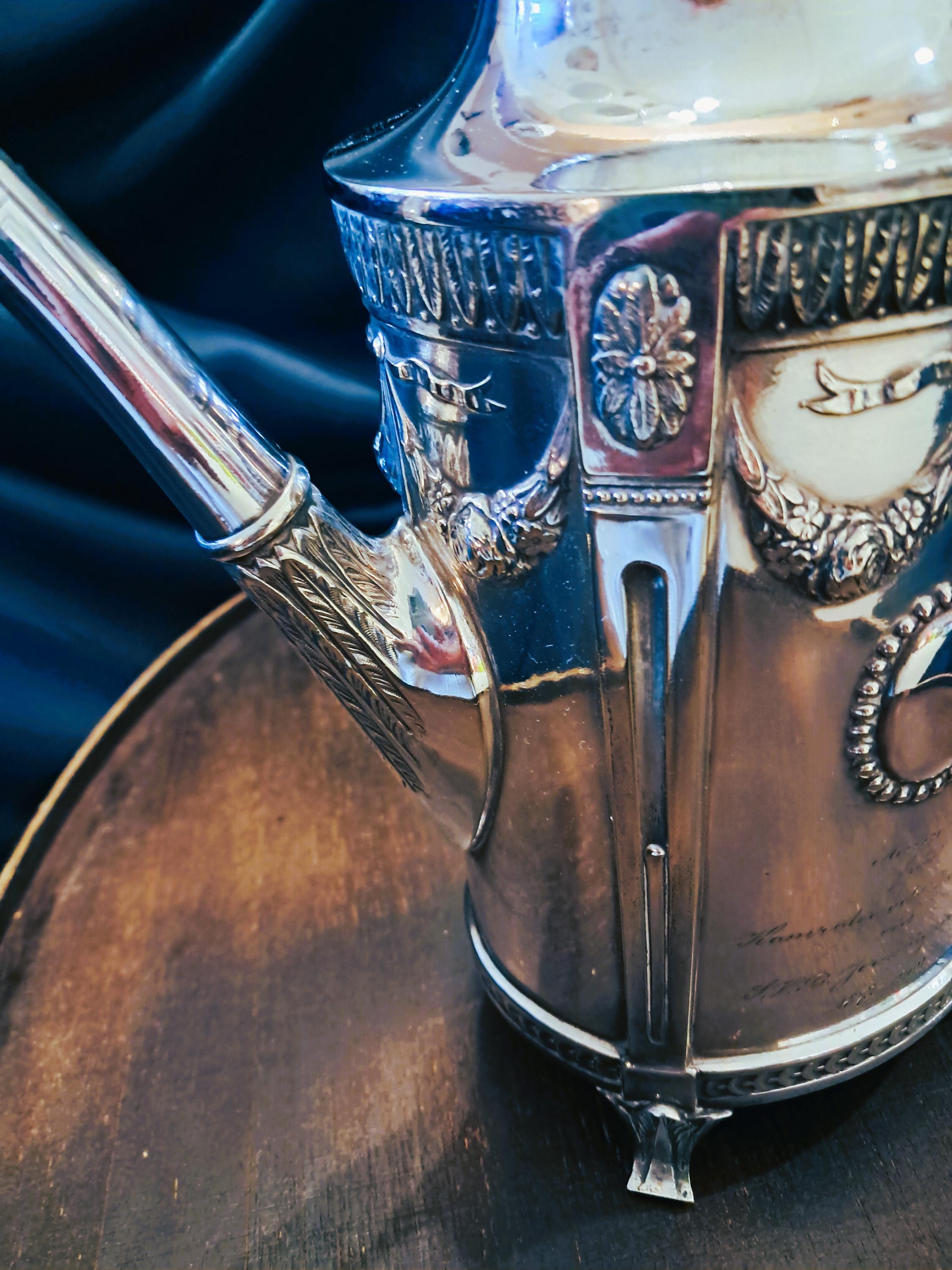 This jug was made around 1910 by C.G. Hallberg in nickel silver (tin/silver alloy). The design was based on the Gustavian style, which was influenced by classicism. Very finely crafted details. Condition: Despite its age, the jug is in very good condition. Age-related patina in places, but no damage. Stamped with the manufacturer's mark on the bottom. Dimensions: Height 25 cm, width 24 cm, depth 11 cm