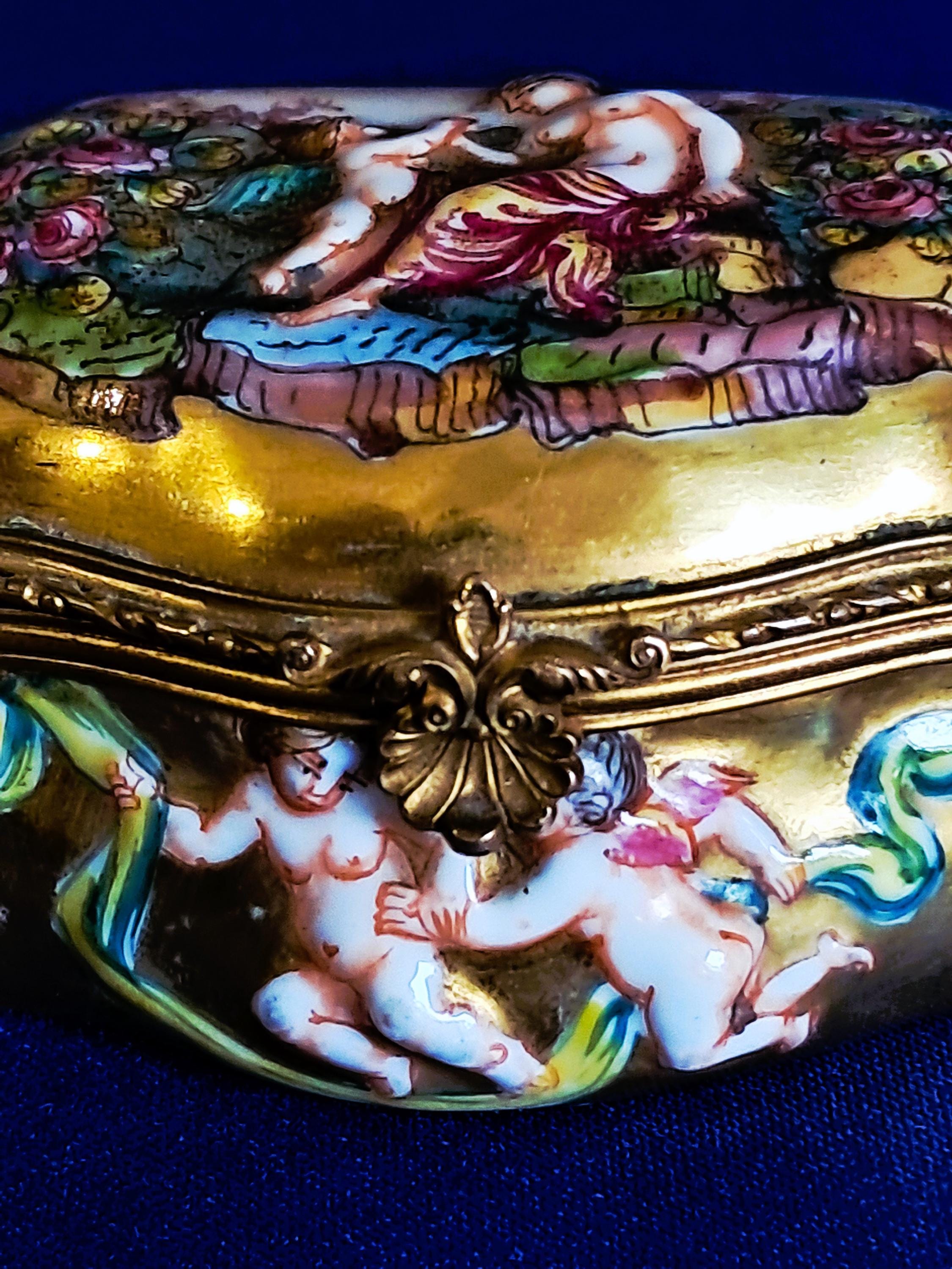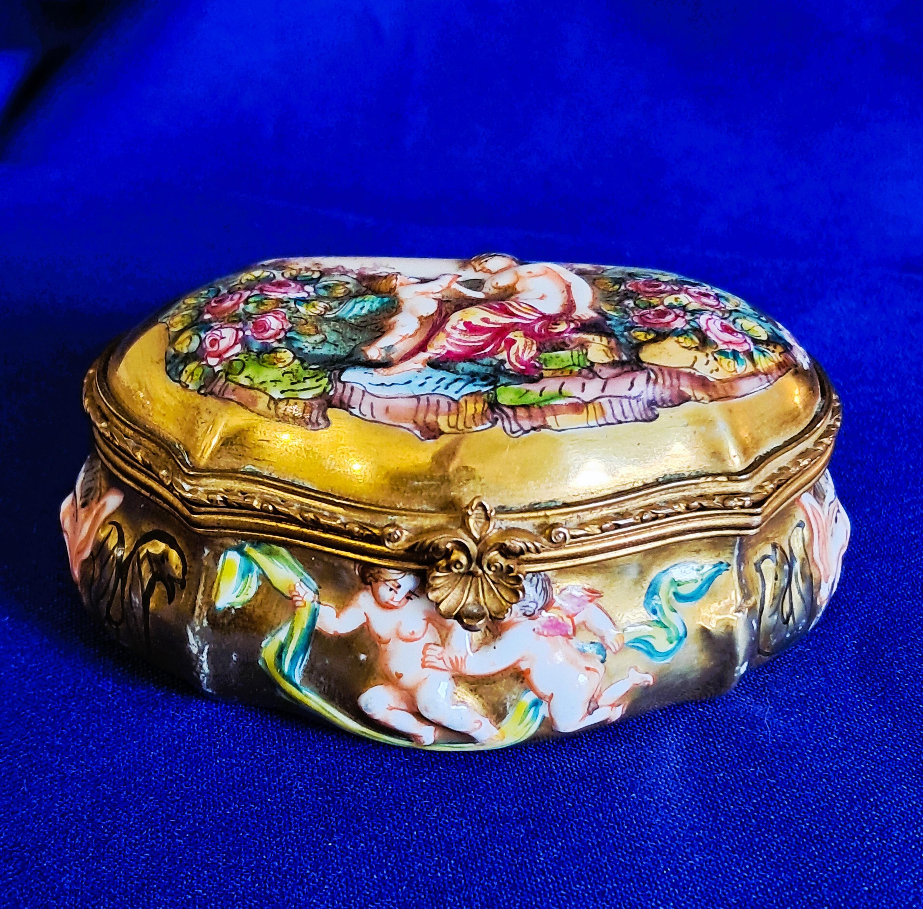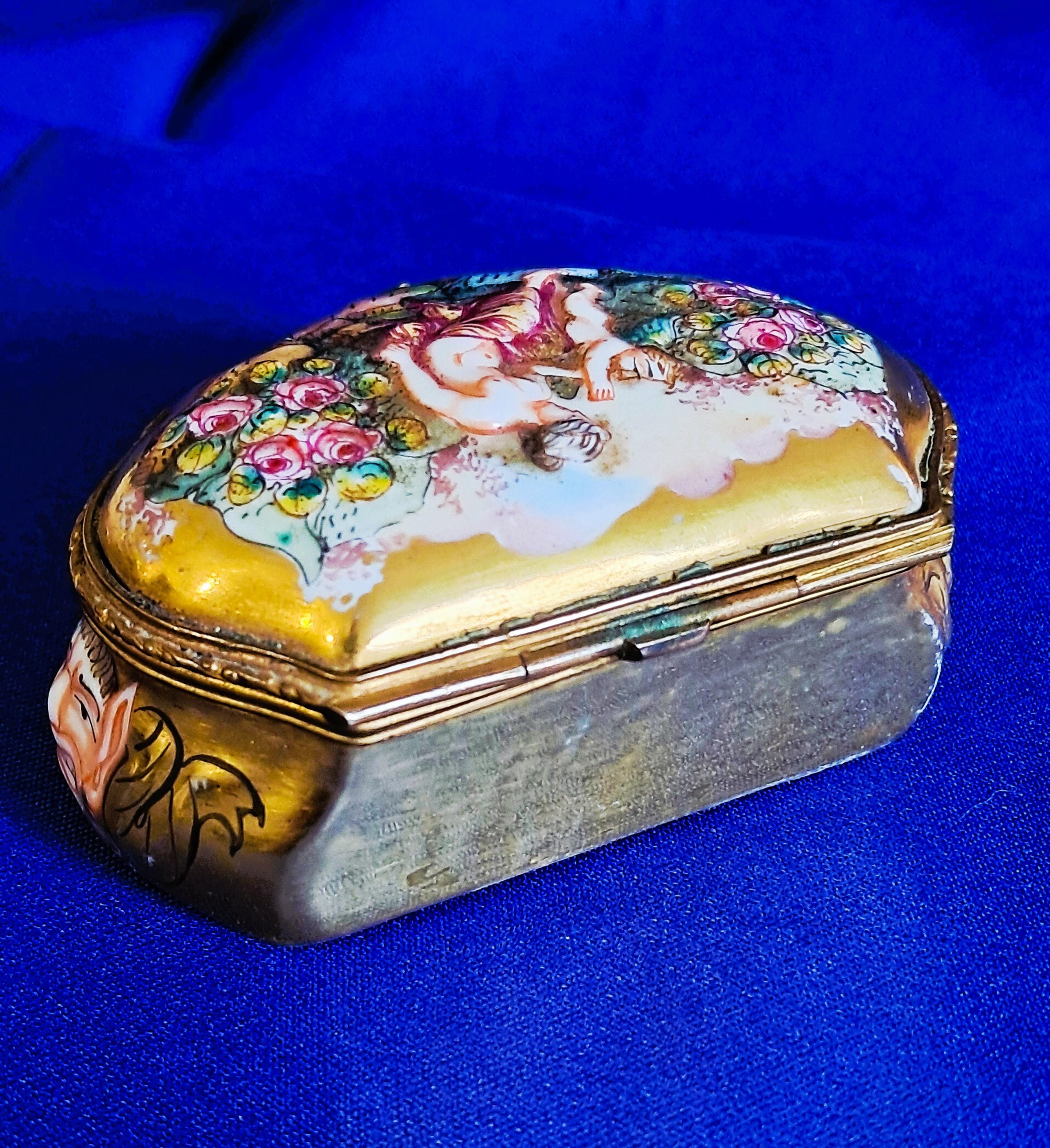 This beautiful little porcelain box was made in the second half of the 19th century by the Royal Porcelain Manufactory of Naples, Capodimonte. Both the porcelain and the brass fittings are heavily gilded. Grotesques on the left and right sides. Lovely scene with cherubs on the lid. Manufacturer's mark under glaze on the bottom. Condition: Good condition, slight abrasion of the gilding, no chips, hinges in perfect condition Dimensions: Width 8.5 cm, height 4 cm, depth 5 cm