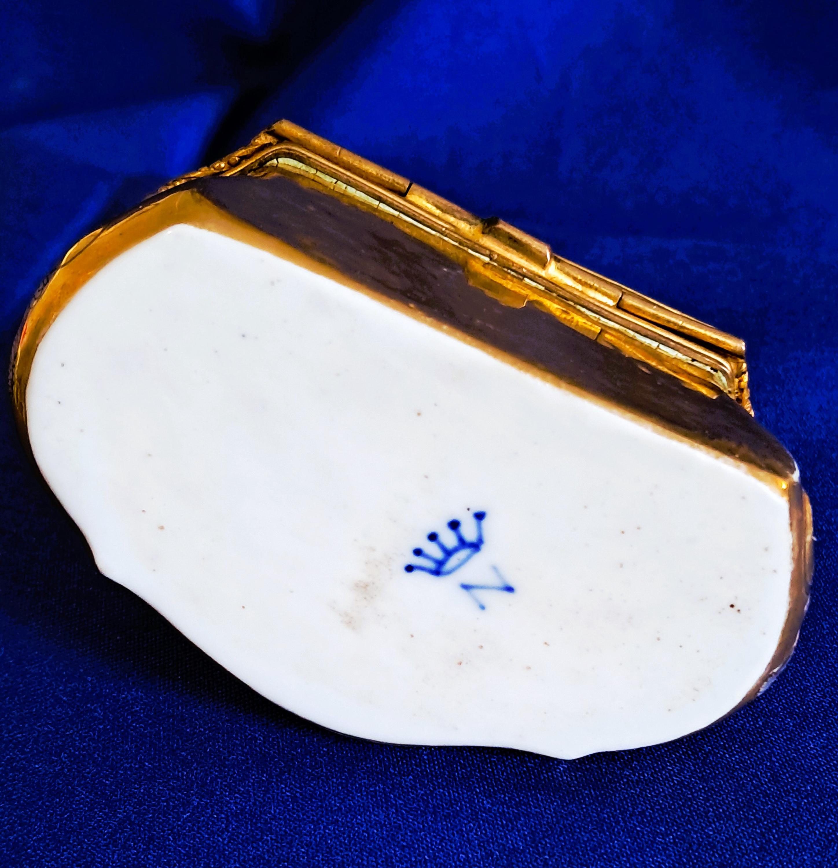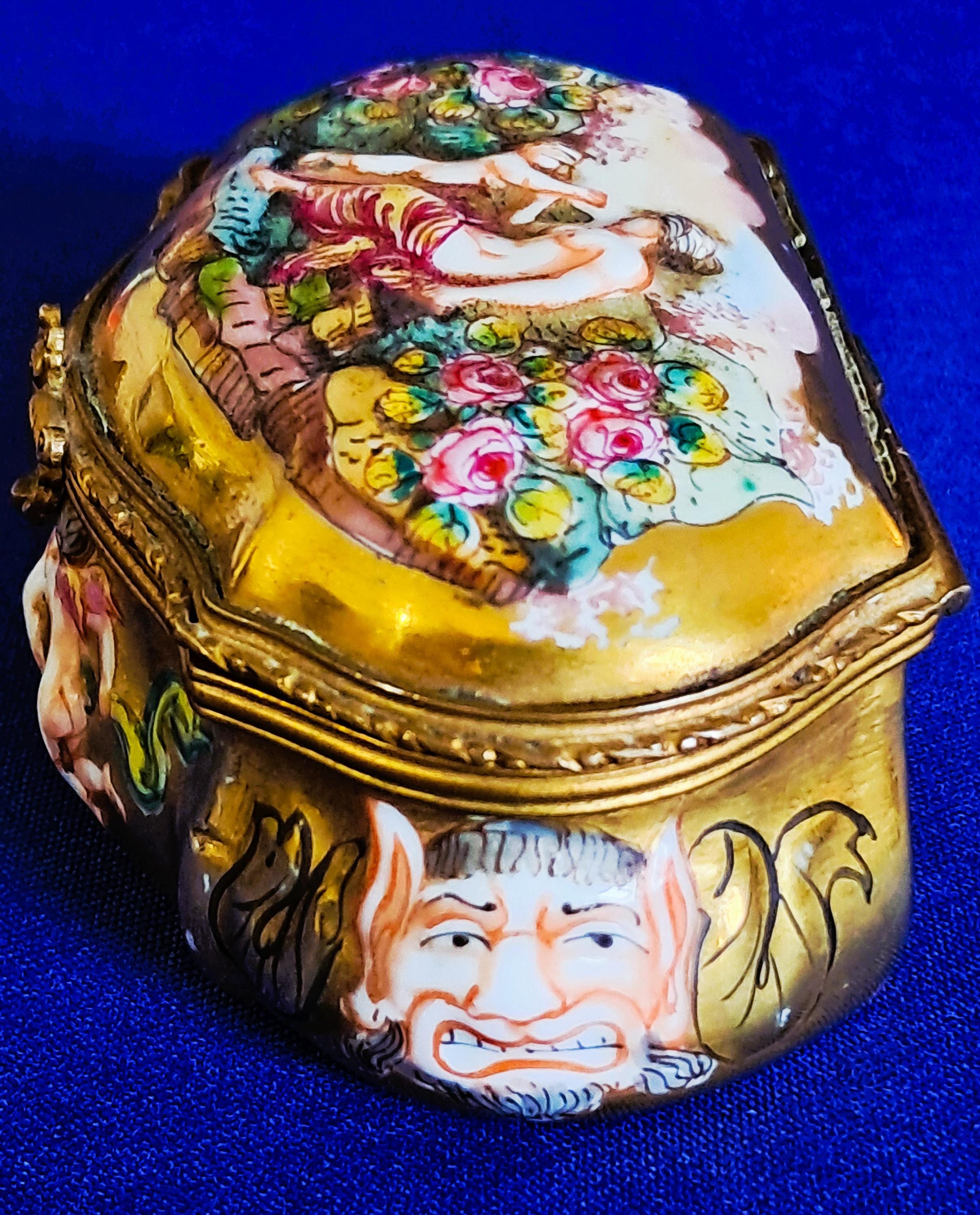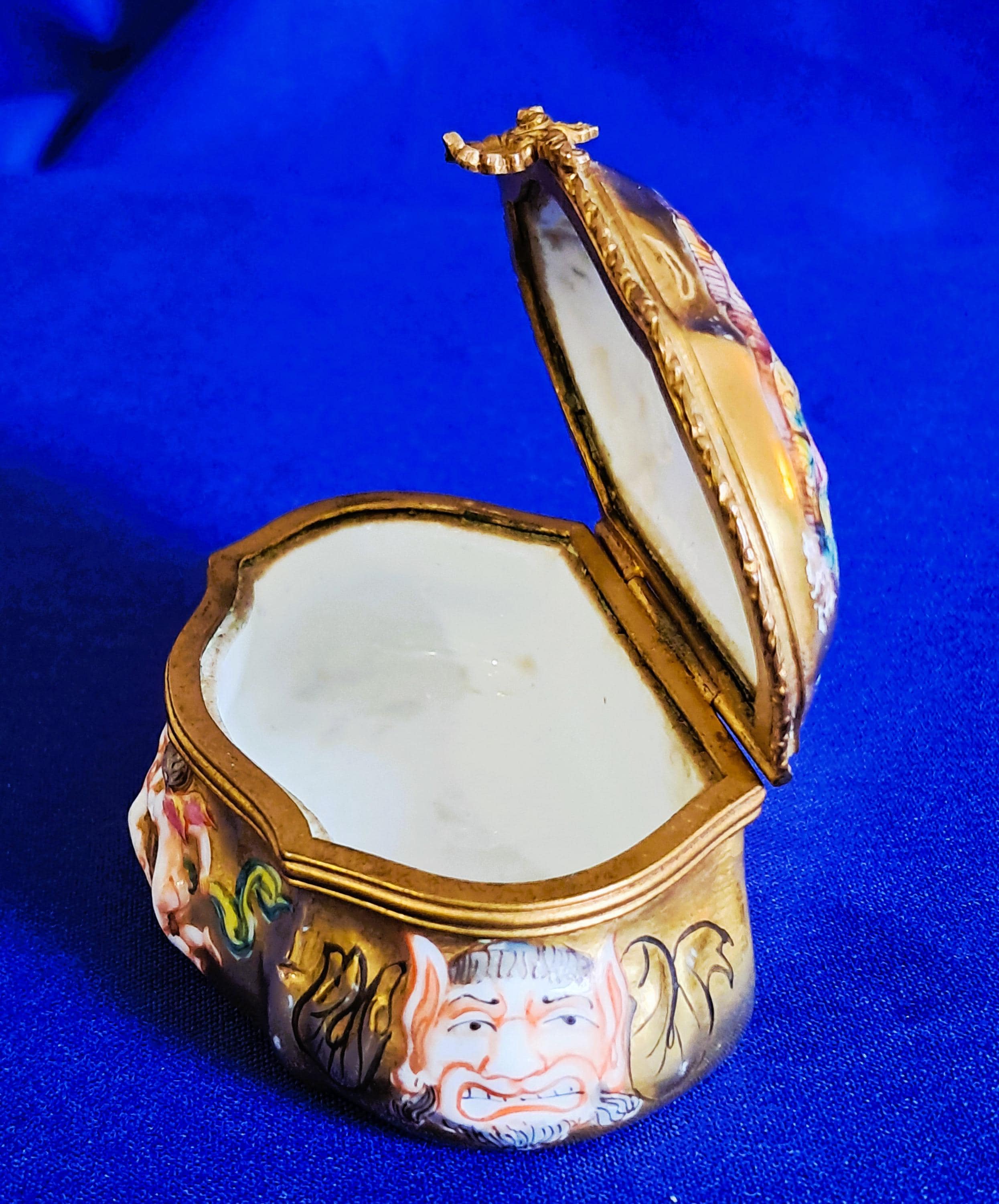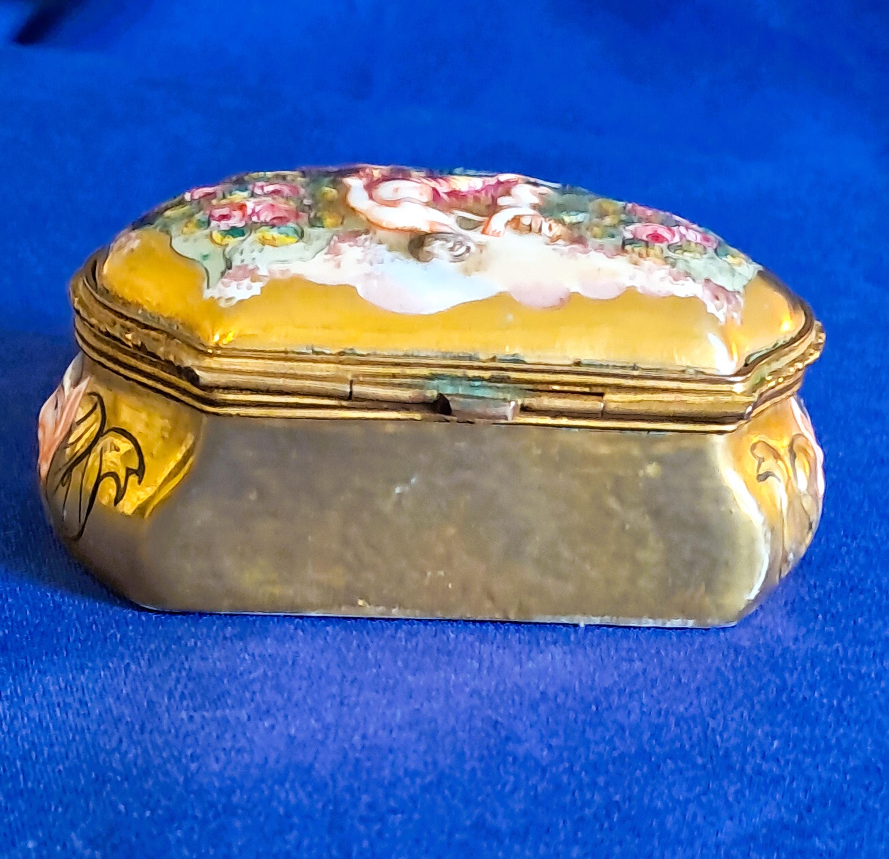 This beautiful little porcelain box was made in the second half of the 19th century by the Royal Porcelain Manufactory of Naples, Capodimonte. Both the porcelain and the brass fittings are heavily gilded. Grotesques on the left and right sides. Lovely scene with cherubs on the lid. Manufacturer's mark under glaze on the bottom. Condition: Good condition, slight abrasion of the gilding, no chips, hinges in perfect condition Dimensions: Width 8.5 cm, height 4 cm, depth 5 cm