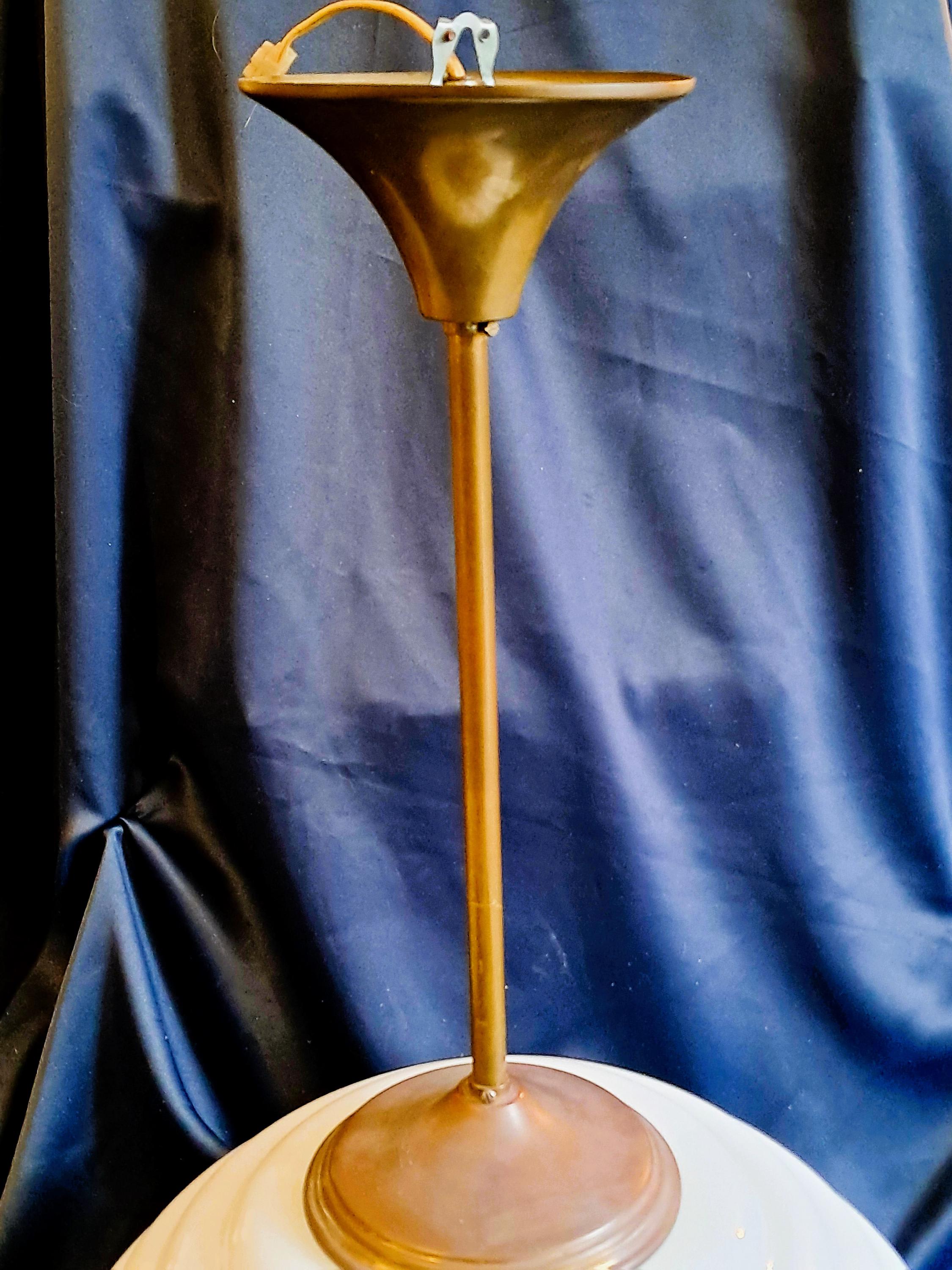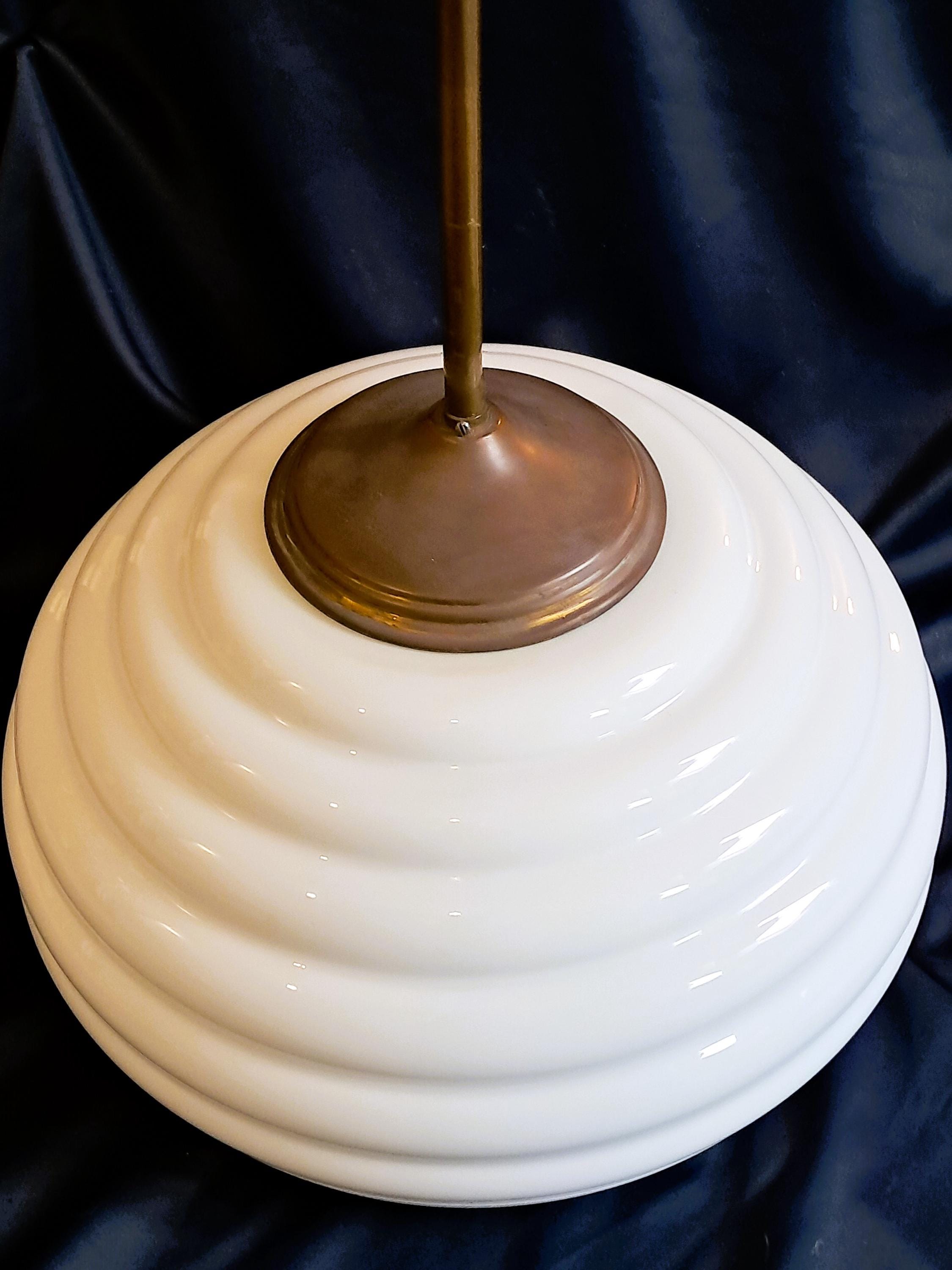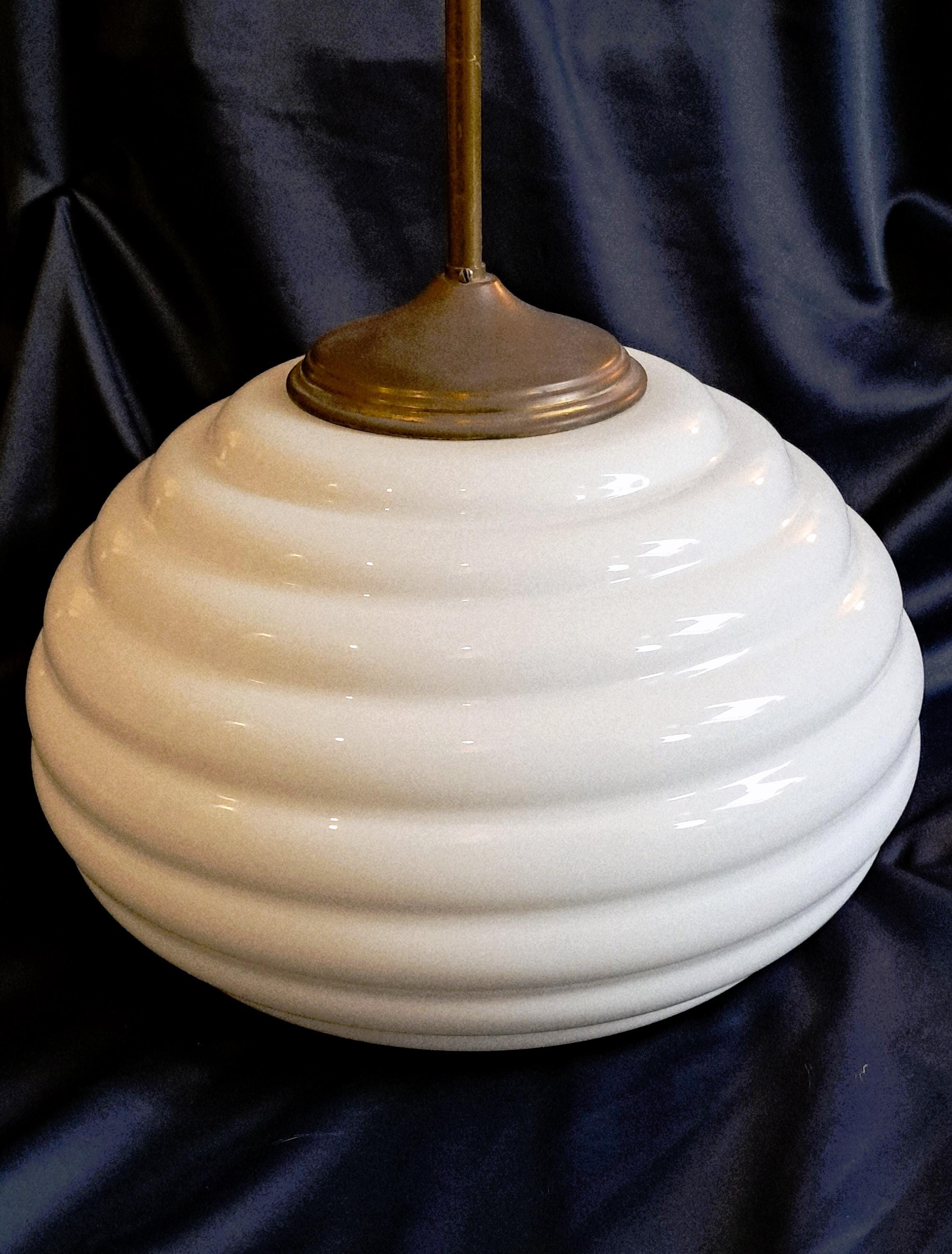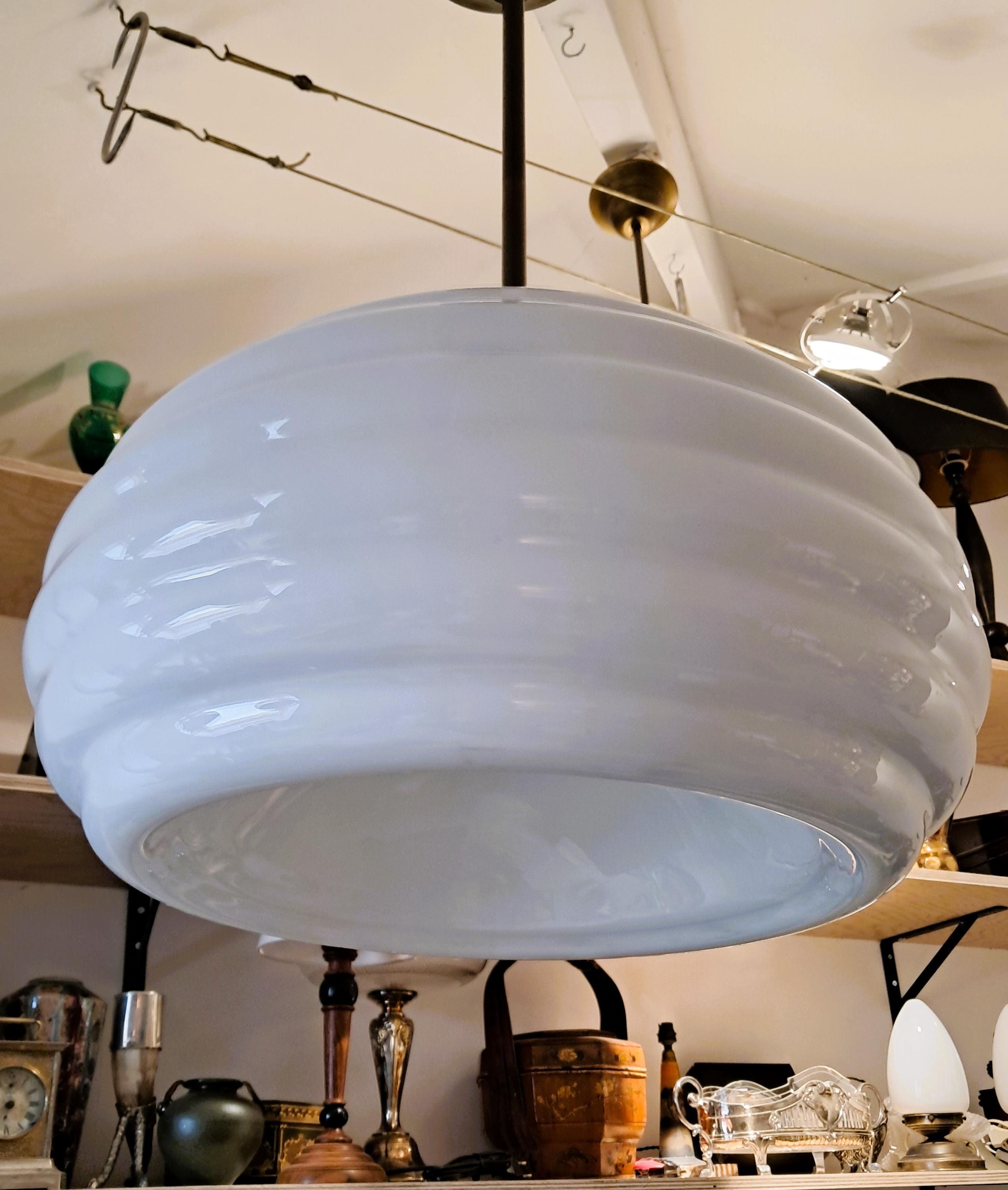 Large and unusually shaped opaline pendant lamp from an old town hall. Due to its size and unusual shape, this lamp is a piece of design that provides soft light and adds atmosphere to any room. Condition: Good condition, glass body without damage. Brass fittings, without damage but with patina corresponding to its age. Dimensions: Total height 80 cm, diameter of lamp body 46 cm, height of lamp body 32 cm