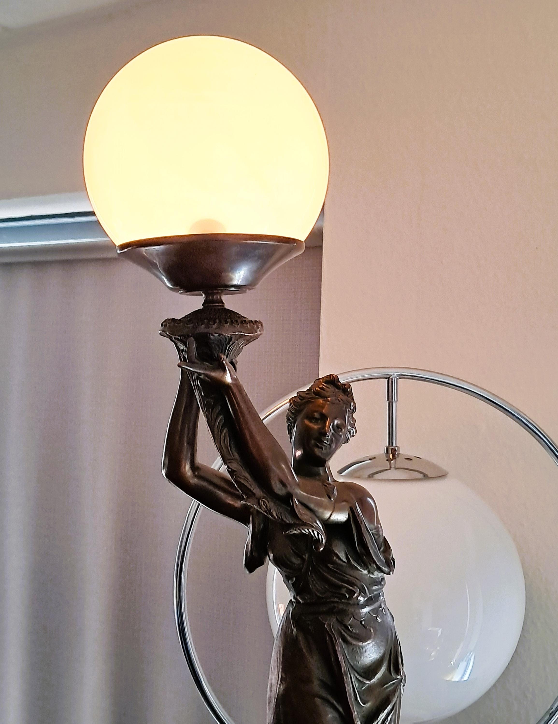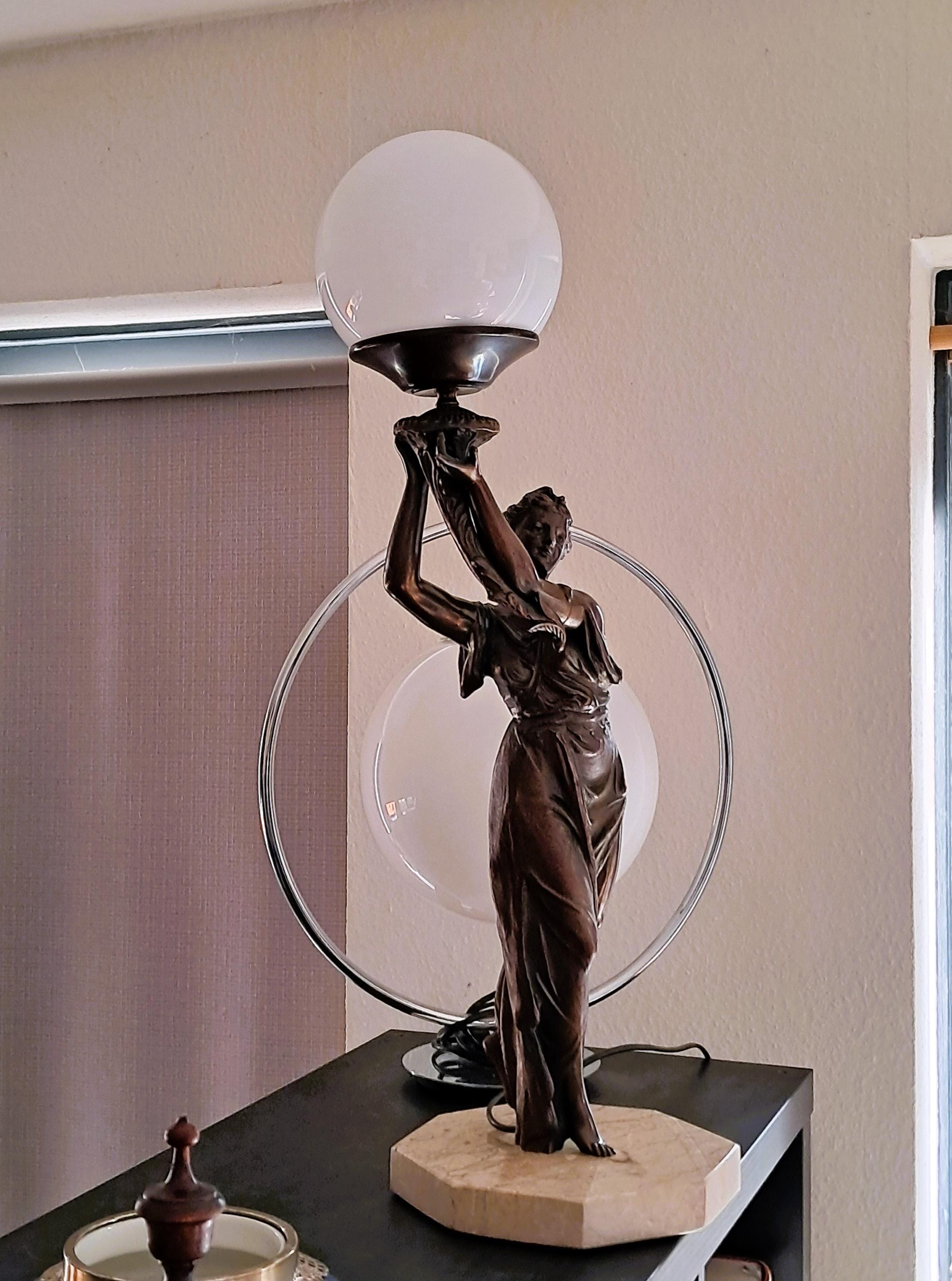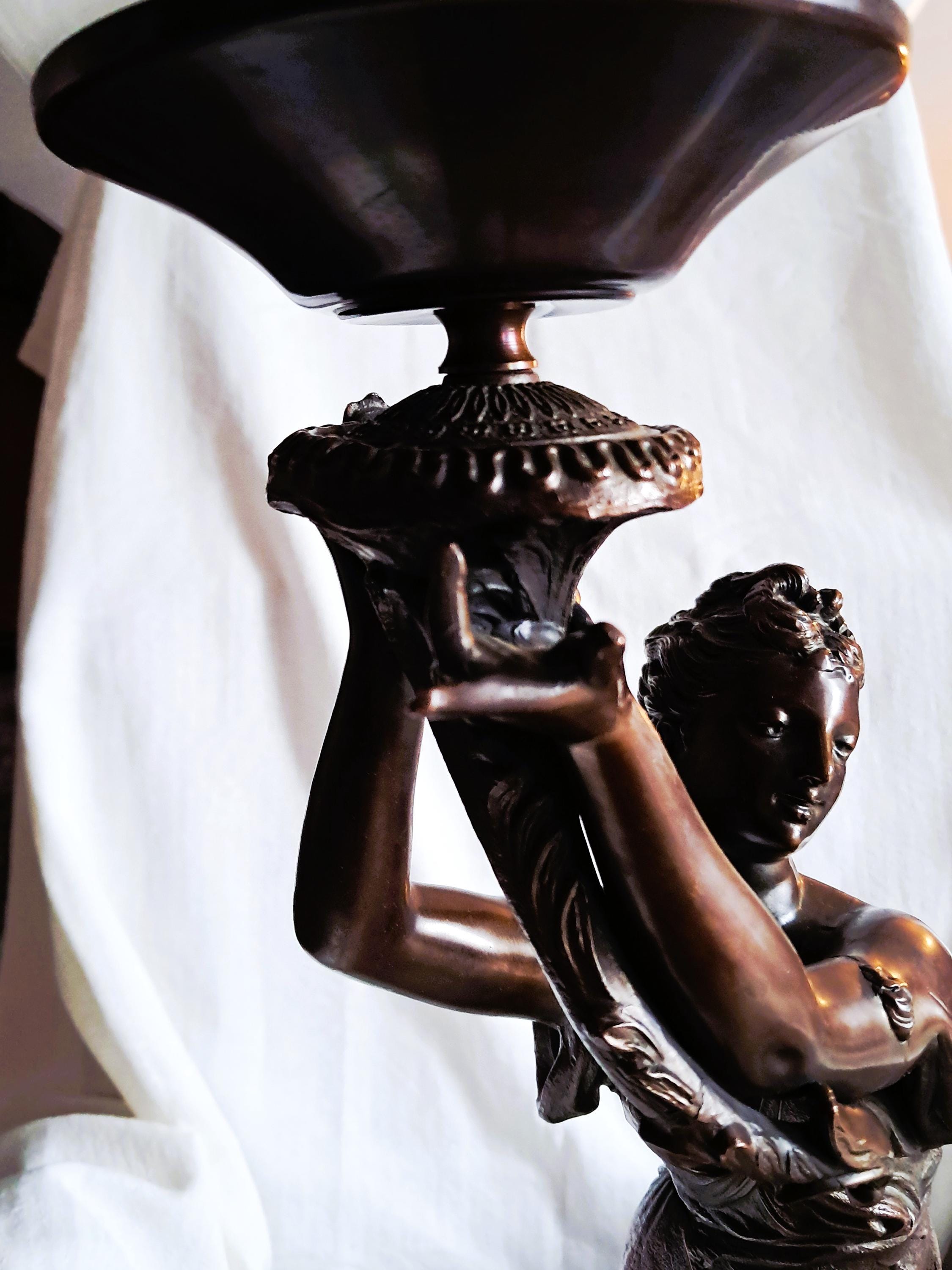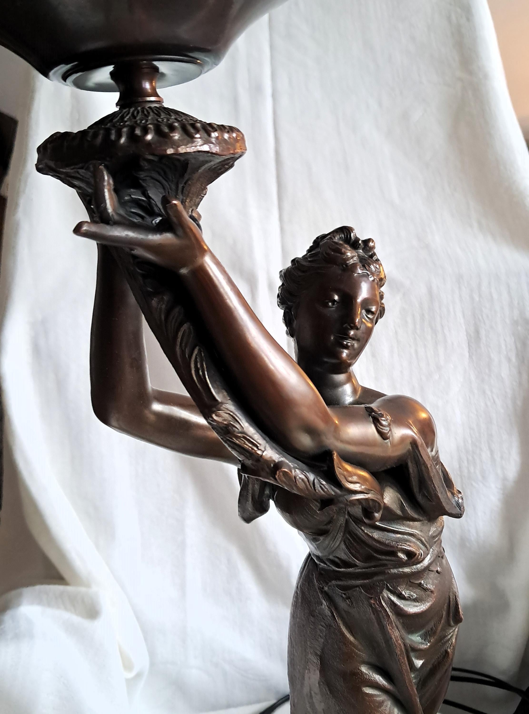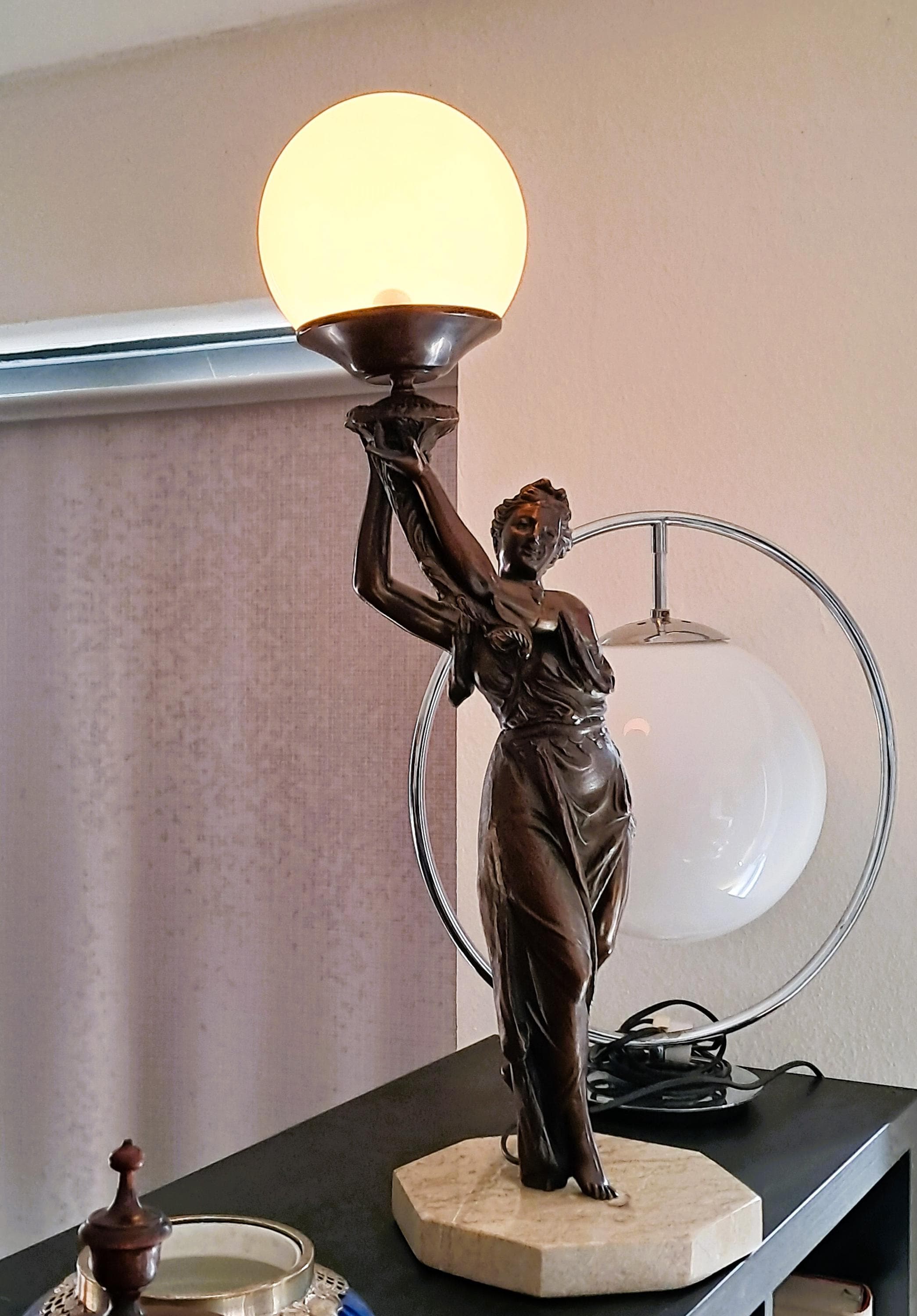 Vintage Art Nouveau table lamp with figurative representation on stone base and opaline glass body. Heavy (approx. 6 kg) design with finely crafted details. Condition: Good condition: fitting, cable and switch have been replaced. Slight signs of wear, no damage. Dimensions: Height 68 cm, width 30 cm - Weight approx. 6 kg