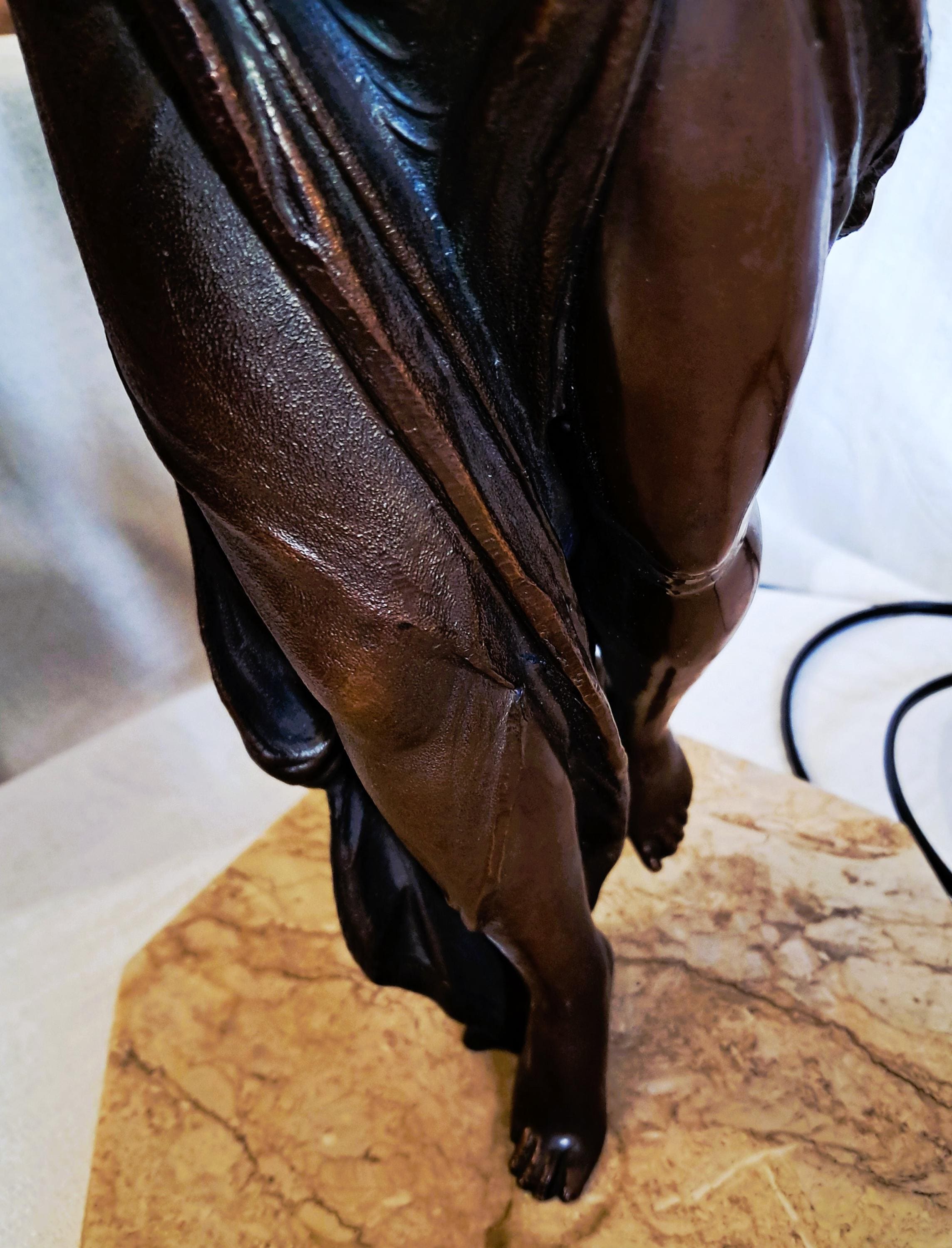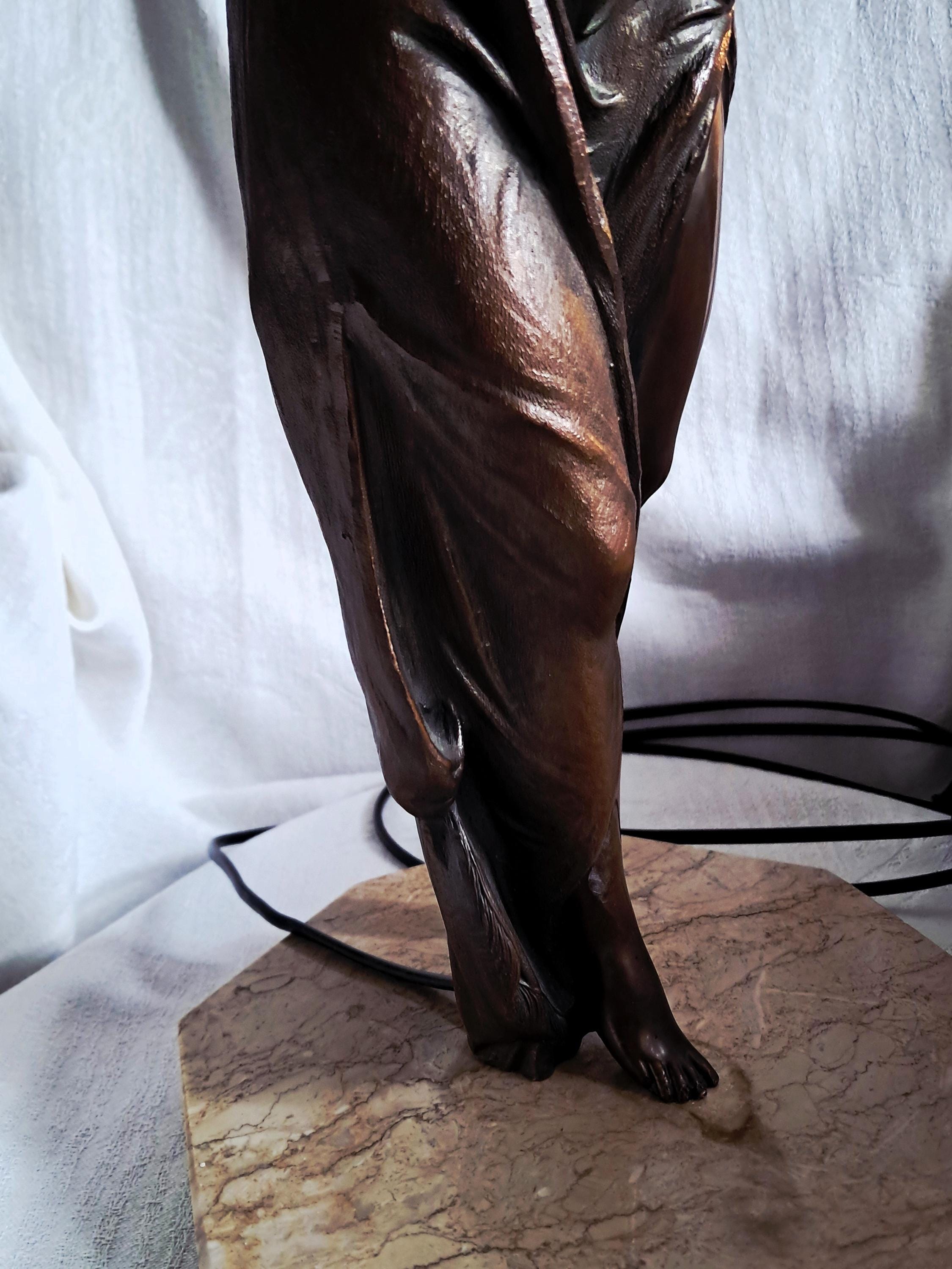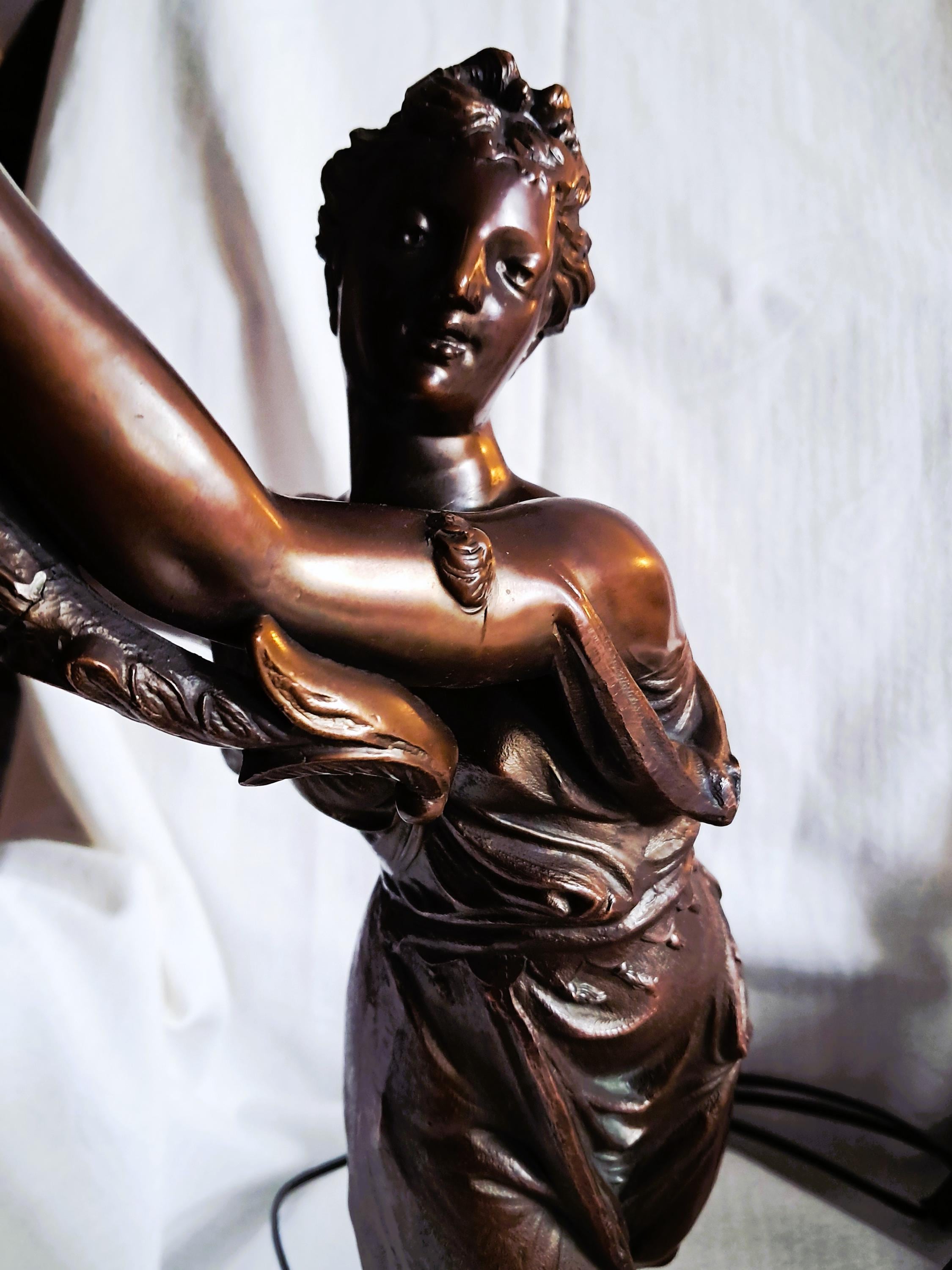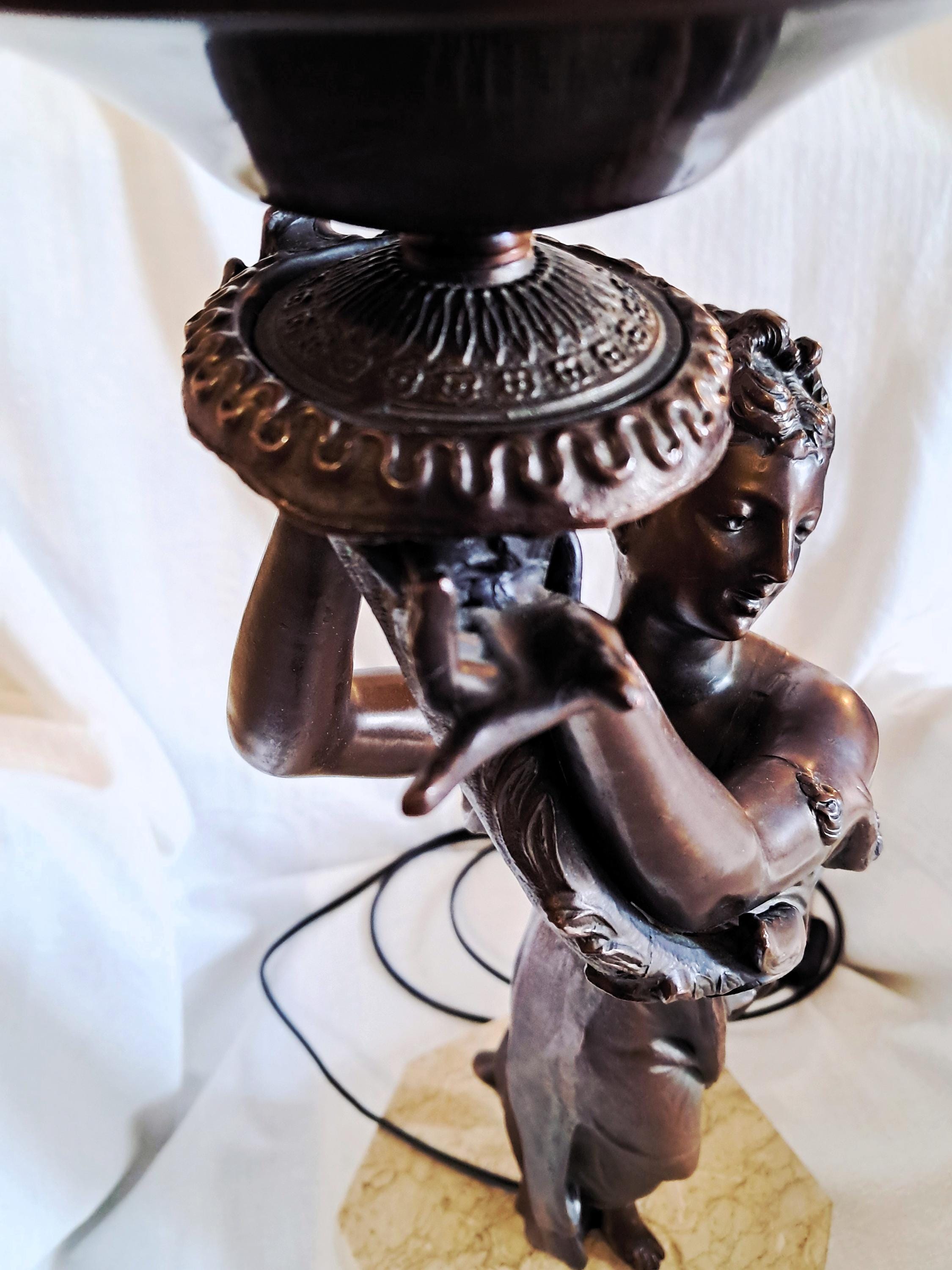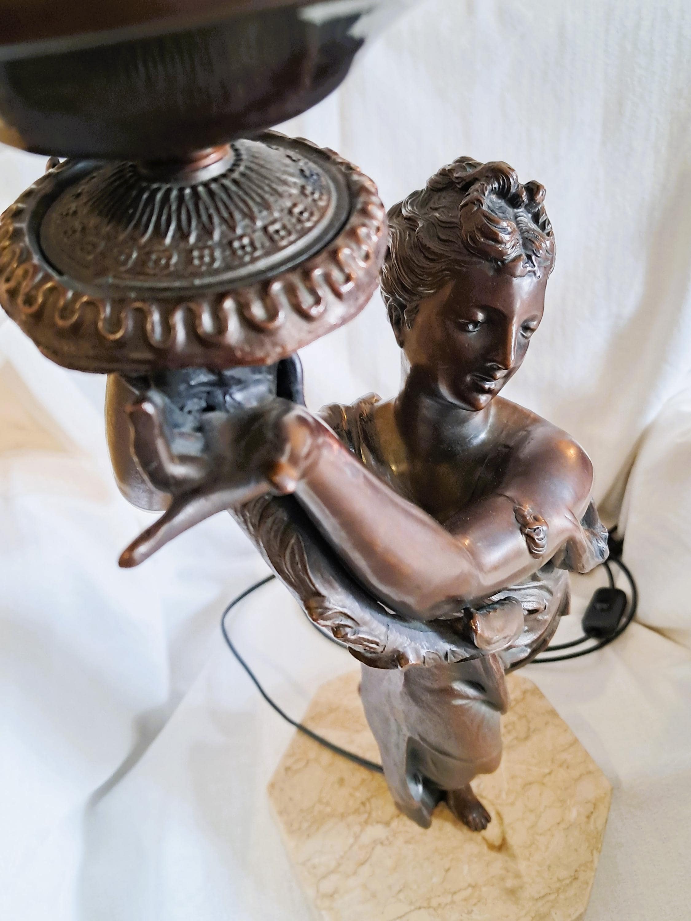 Vintage Art Nouveau table lamp with figurative representation on stone base and opaline glass body. Heavy (approx. 6 kg) design with finely crafted details. Condition: Good condition: fitting, cable and switch have been replaced. Slight signs of wear, no damage. Dimensions: Height 68 cm, width 30 cm - Weight approx. 6 kg