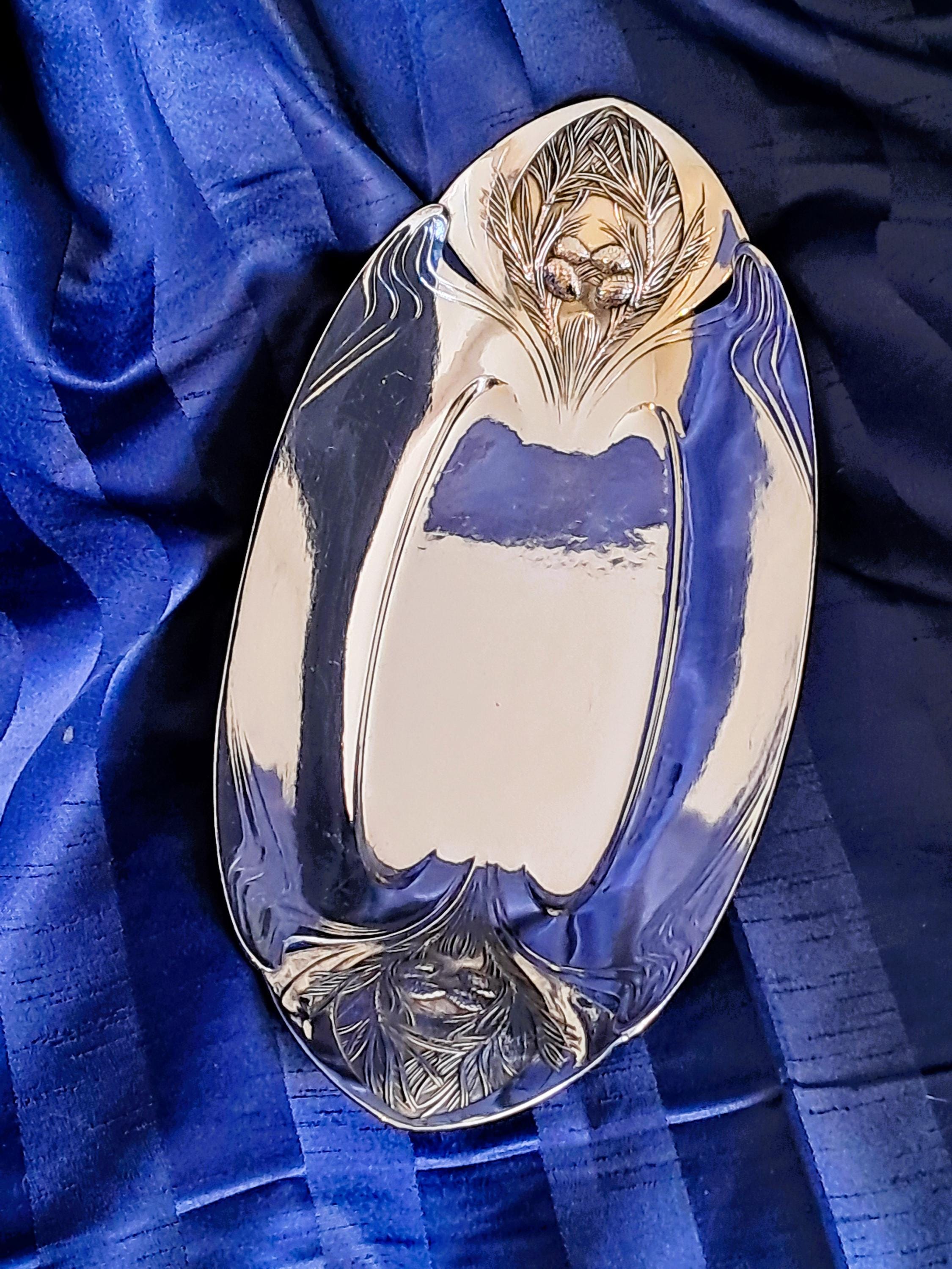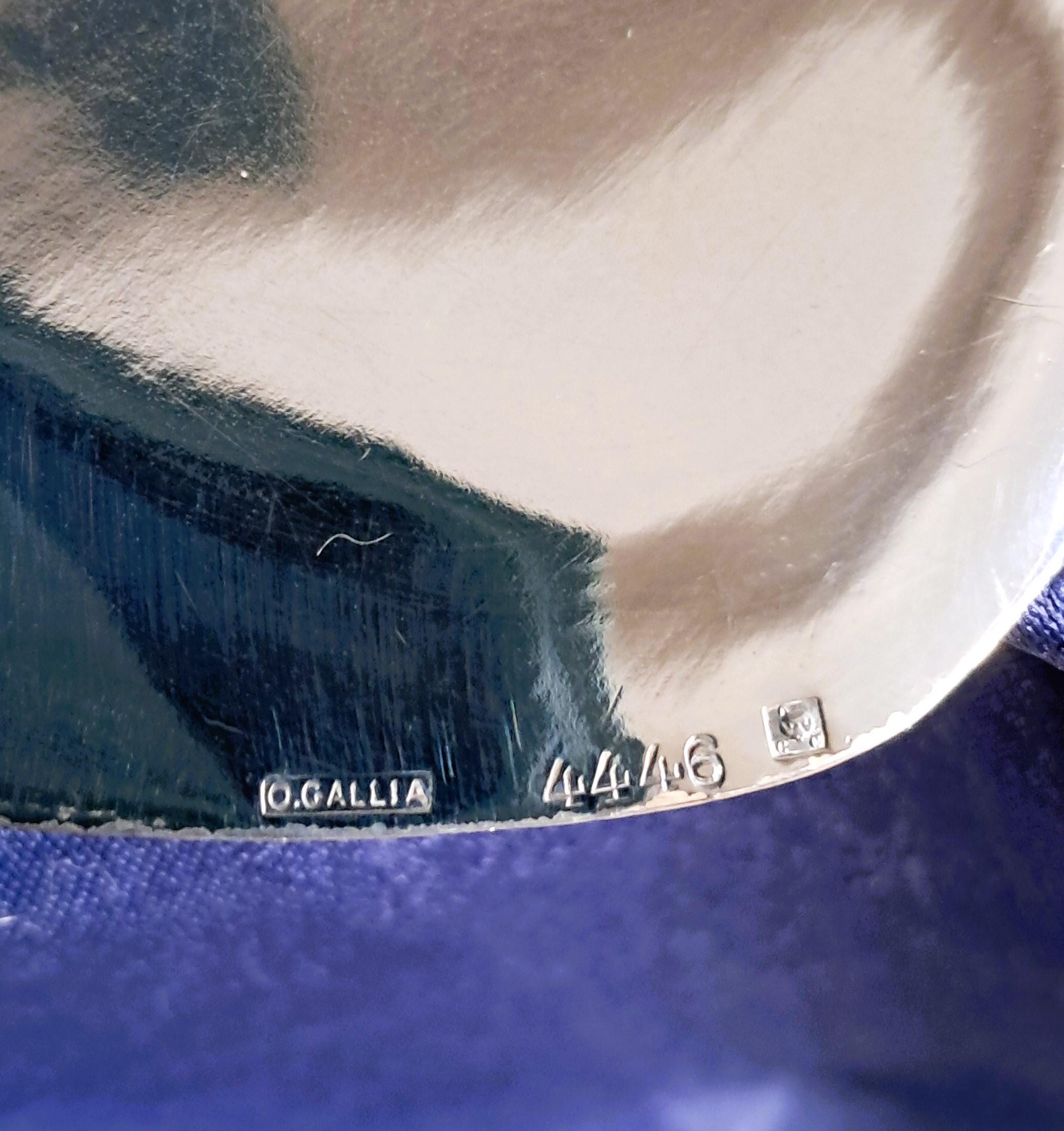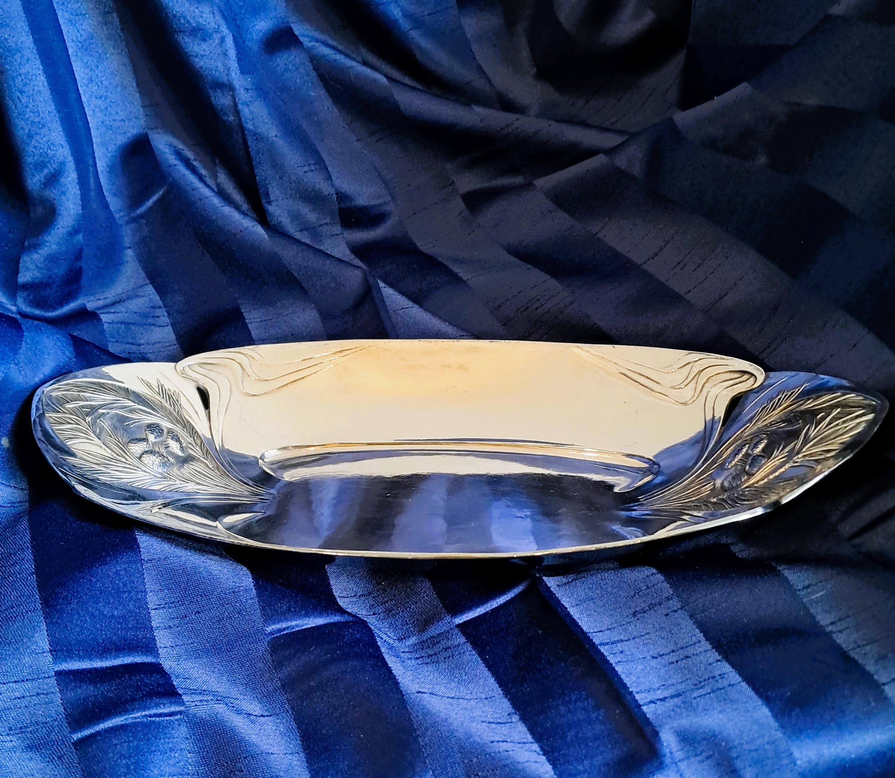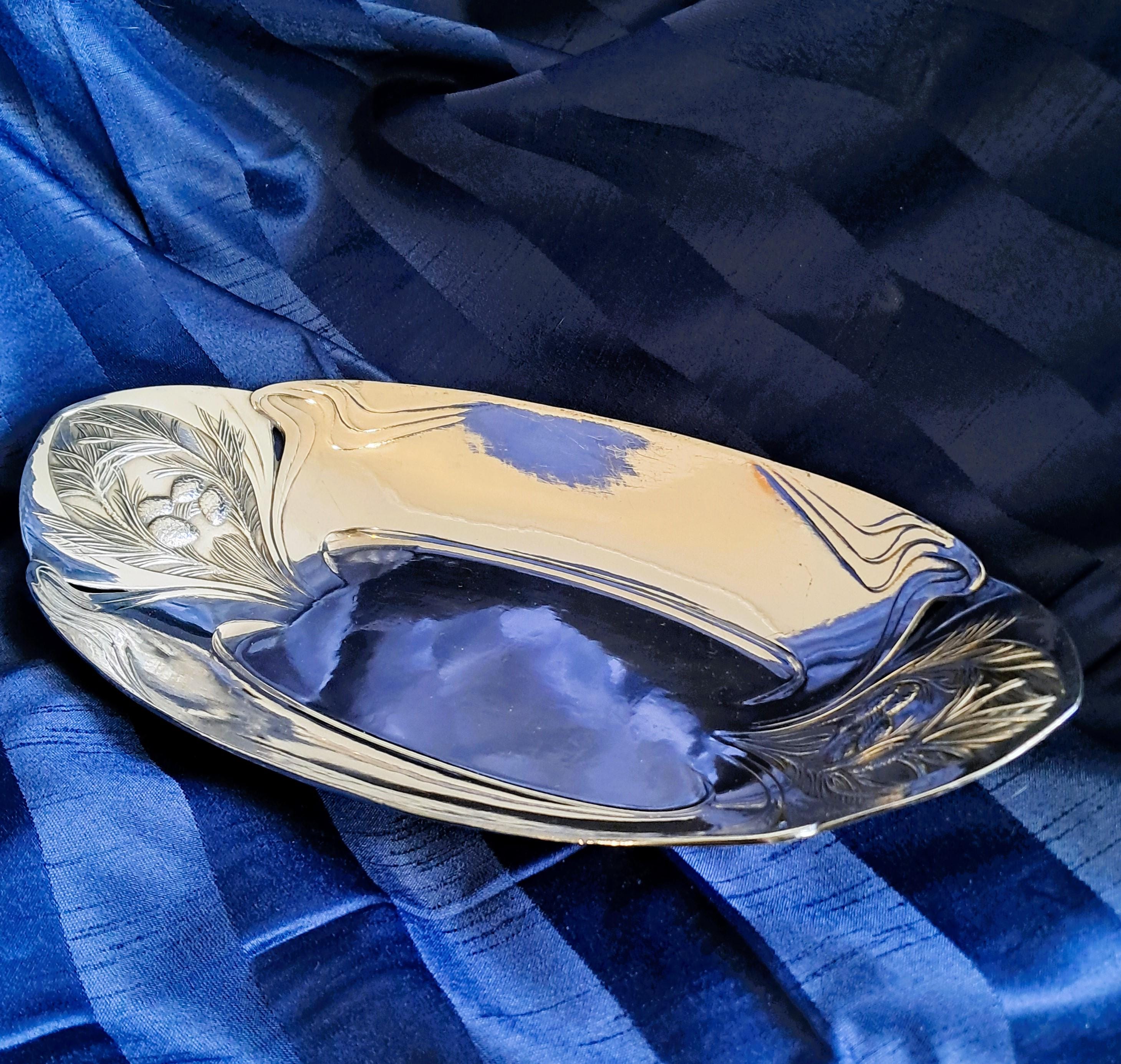 Elegant large silver-plated bowl by Christofle Paris, Orfevrerie Gallia department. The bowl is designed in Art Nouveau style (transition to Art Deco) and was used as a bread or fruit bowl. The hallmarks on the bottom (O. GALLIA, cat's head with CC / stands for Charles Christofle) were only used by the Maison Gallia department between 1921 and 1931. Condition: Good condition with slight signs of wear, silver plating completely intact. Dimensions: Height 5.5 cm, length 36 cm, depth 18 cm