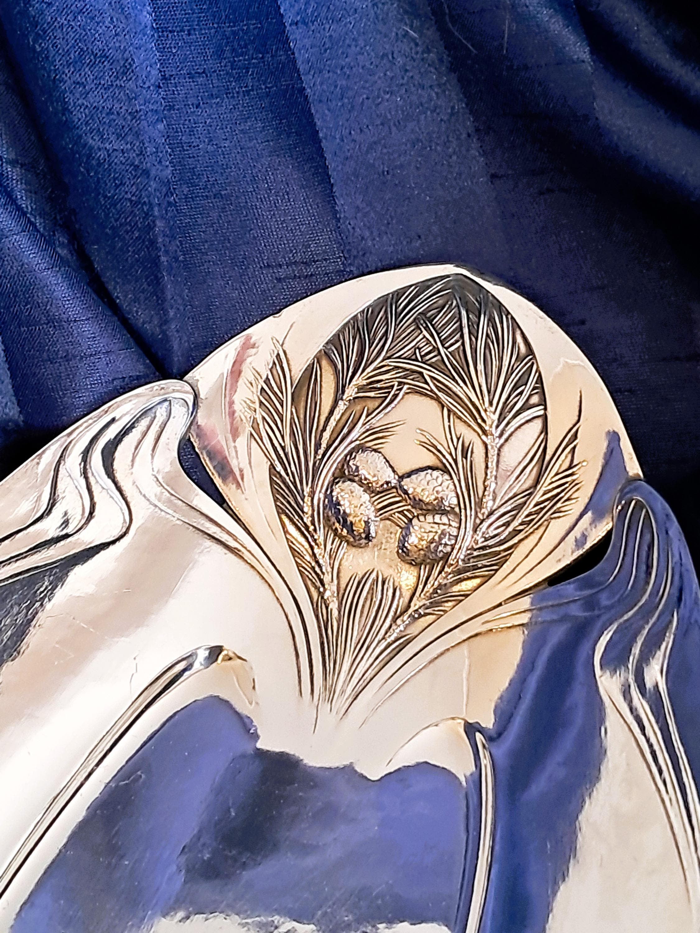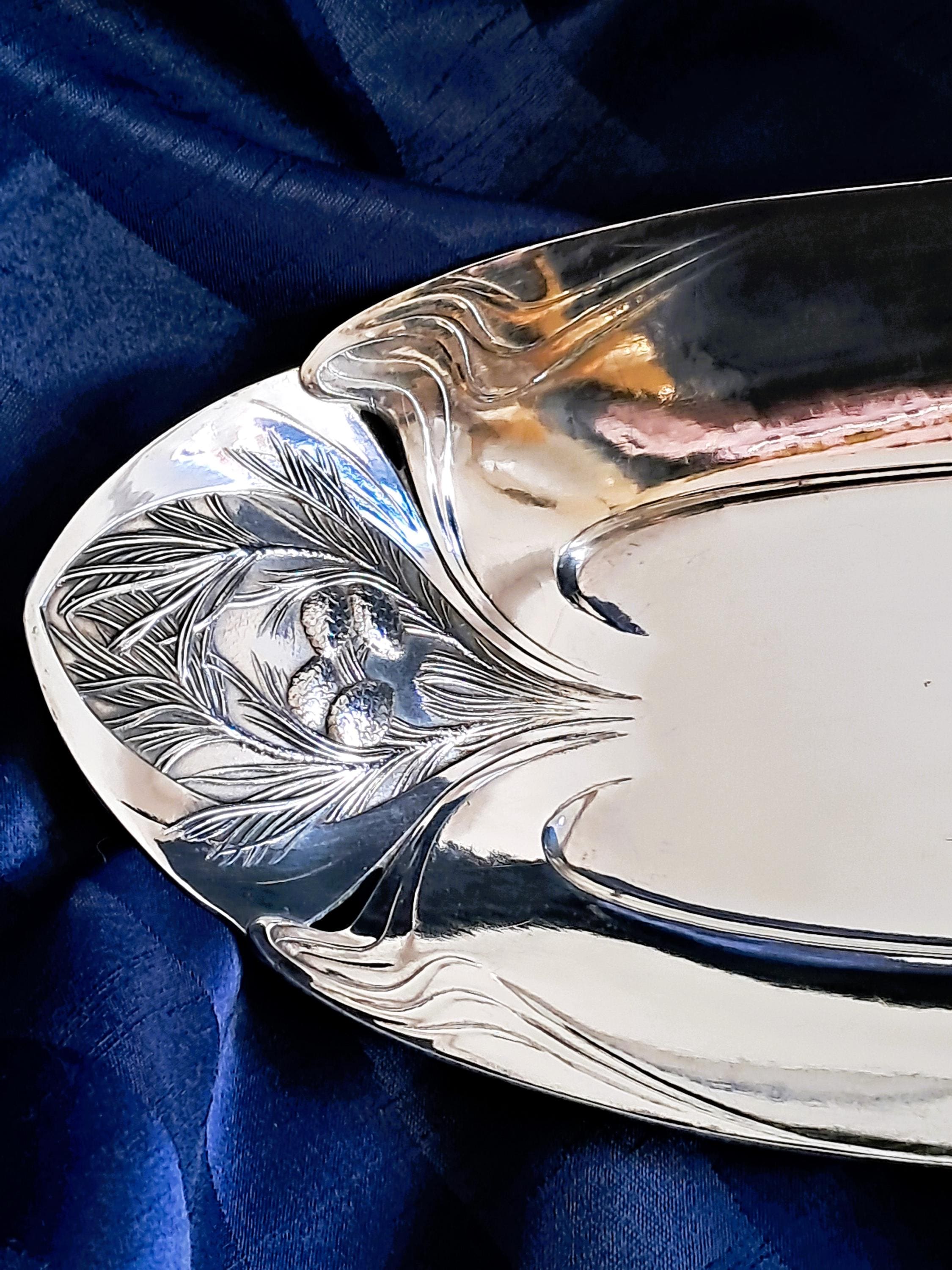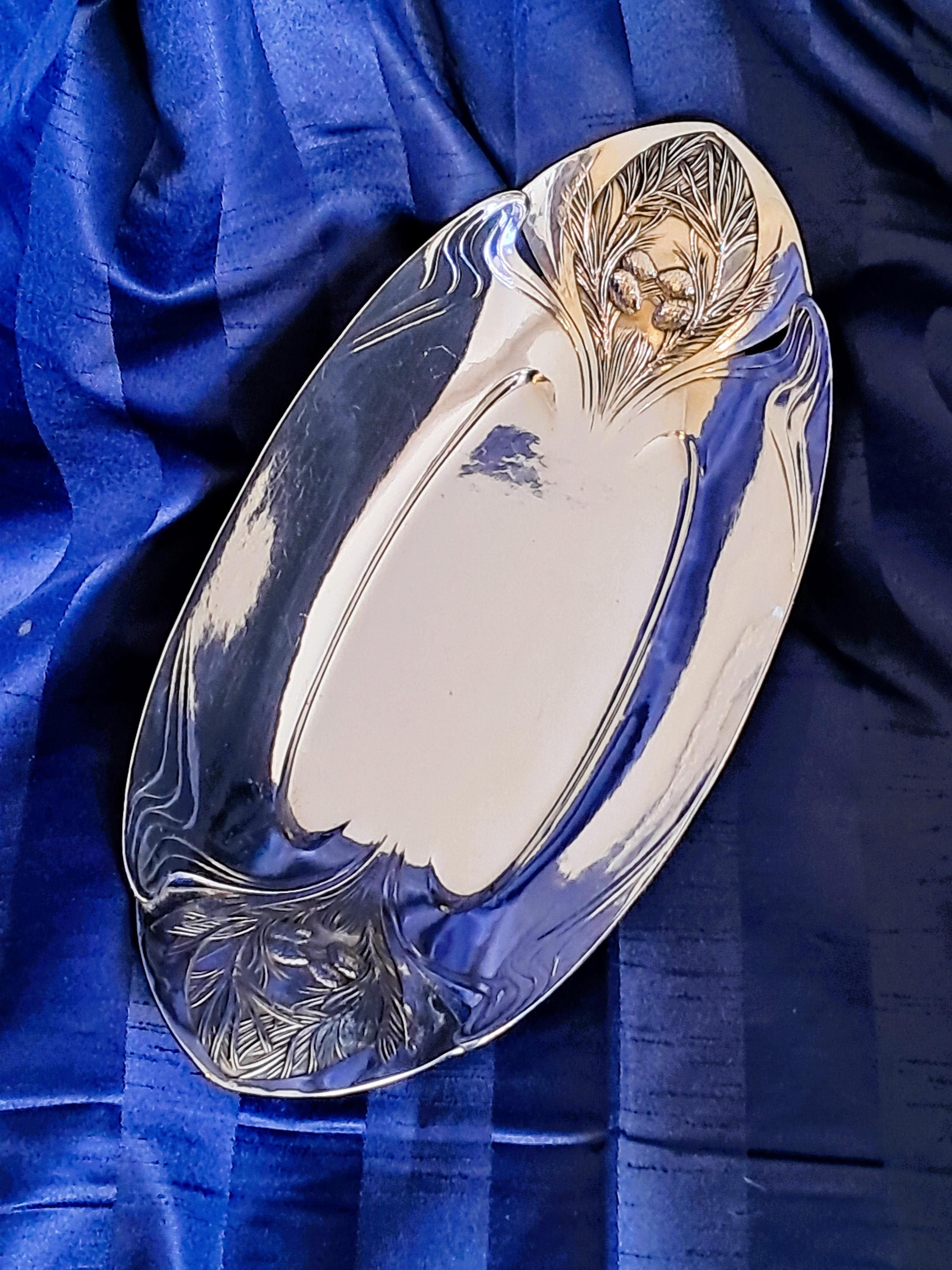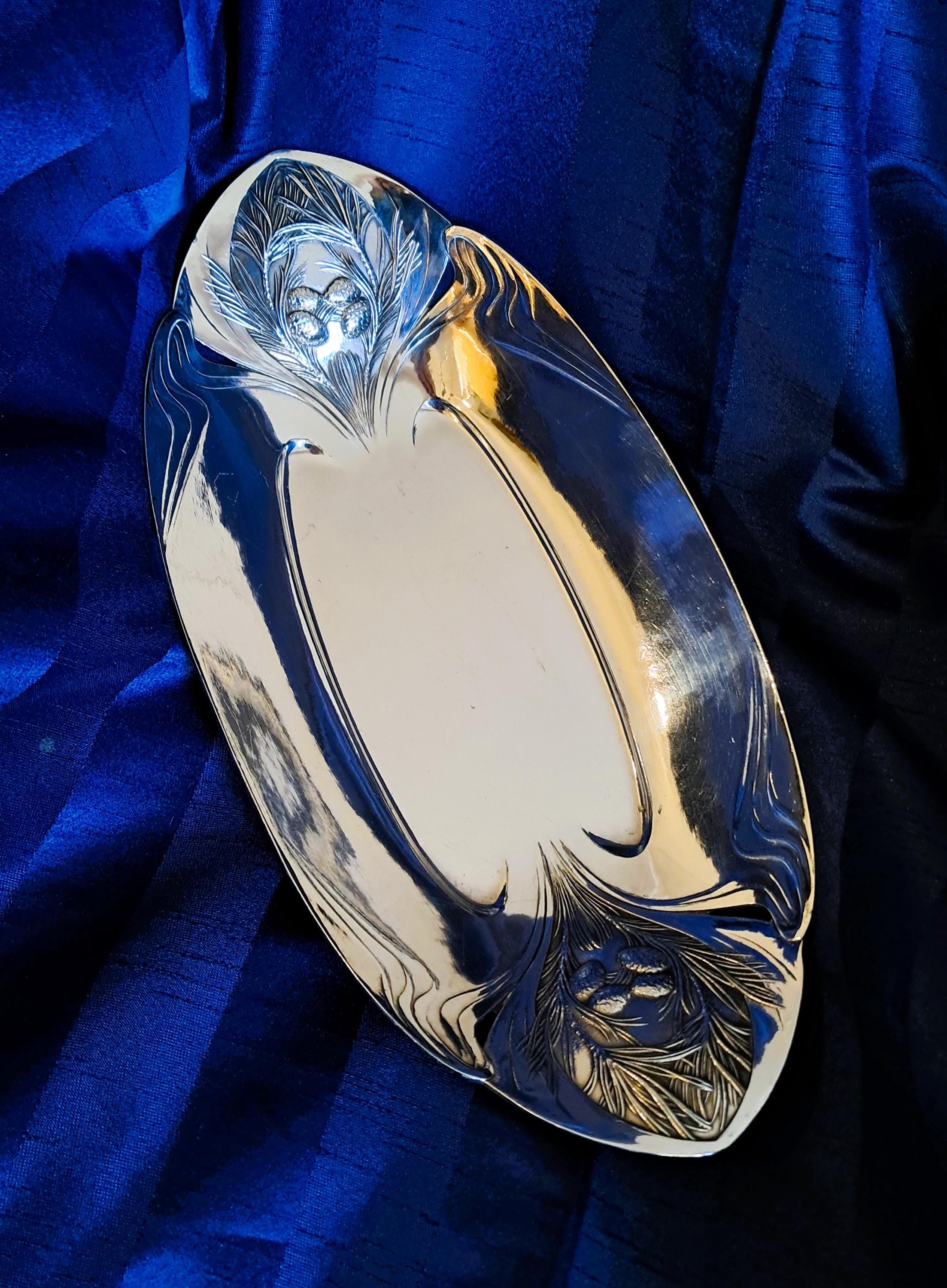Elegant large silver-plated bowl by Christofle Paris, Orfevrerie Gallia department. The bowl is designed in Art Nouveau style (transition to Art Deco) and was used as a bread or fruit bowl. The hallmarks on the bottom (O. GALLIA, cat's head with CC / stands for Charles Christofle) were only used by the Maison Gallia department between 1921 and 1931. Condition: Good condition with slight signs of wear, silver plating completely intact. Dimensions: Height 5.5 cm, length 36 cm, depth 18 cm