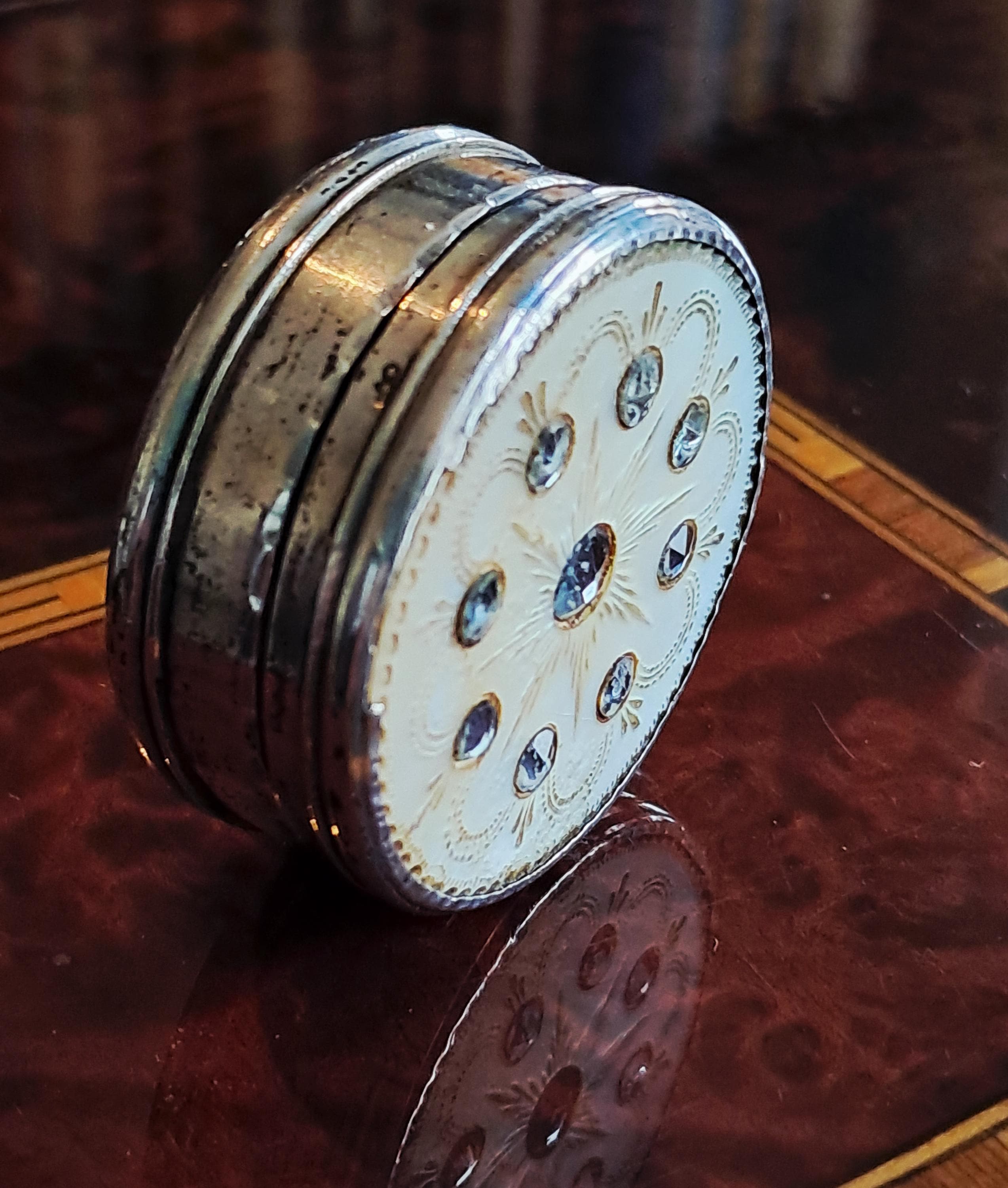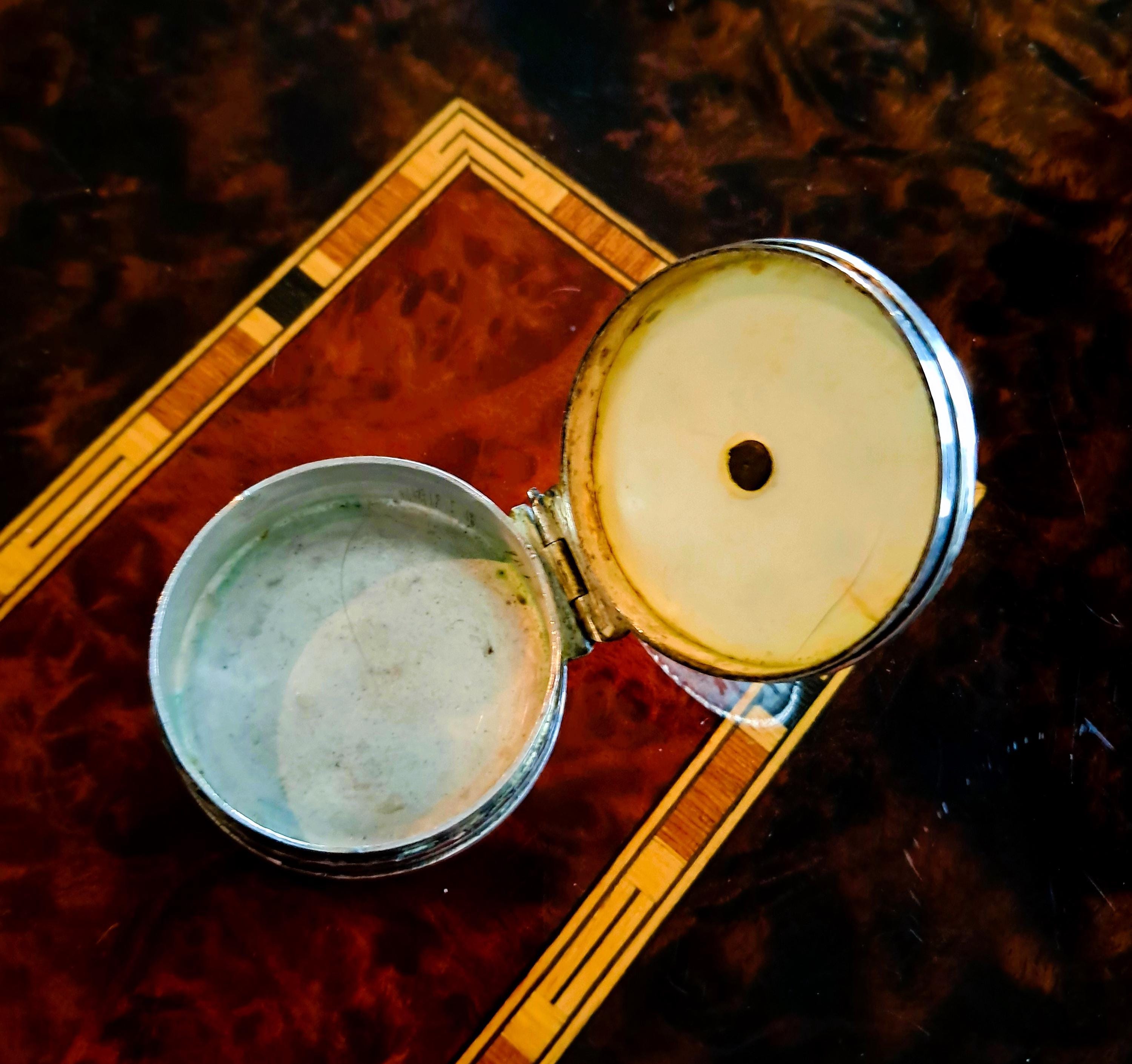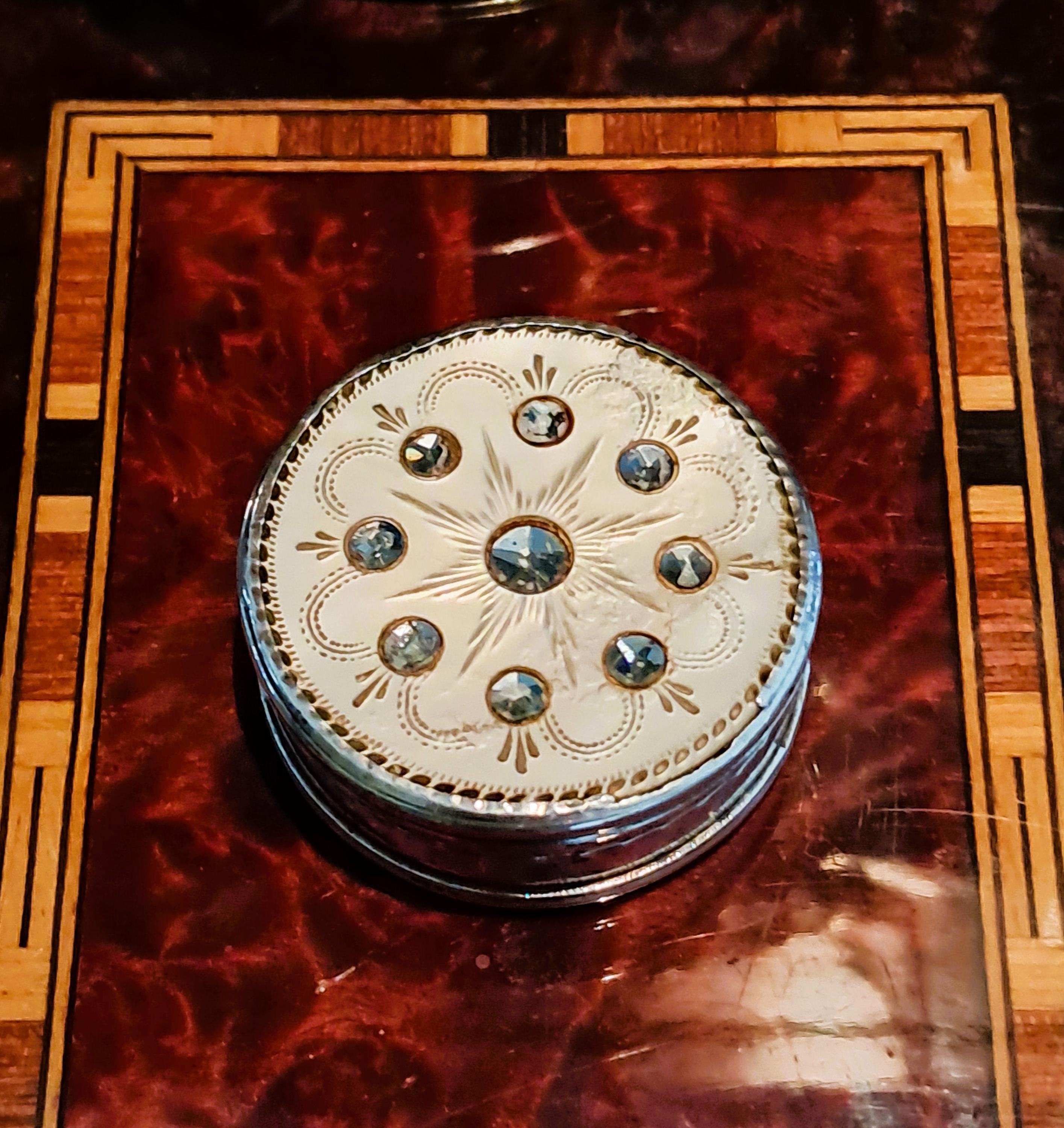 The lid of this pill box from 1817 is made of mother-of-pearl, which is decorated with very fine engravings and decorative glass stones. The box is made of 833 silver and is hallmarked. The hallmarks indicate the year 1817 and manufacture in Gouda, Netherlands (Minerva head with R), shortly after the end of French rule and the beginning of the constitutional monarchy. A very fine piece of work, more than 200 years old. Condition: Patina and signs of wear appropriate for its age, but no major damage, lid hinge works perfectly. Dimensions: Diameter 4 cm, height 1.6 cm; weight 33 grams