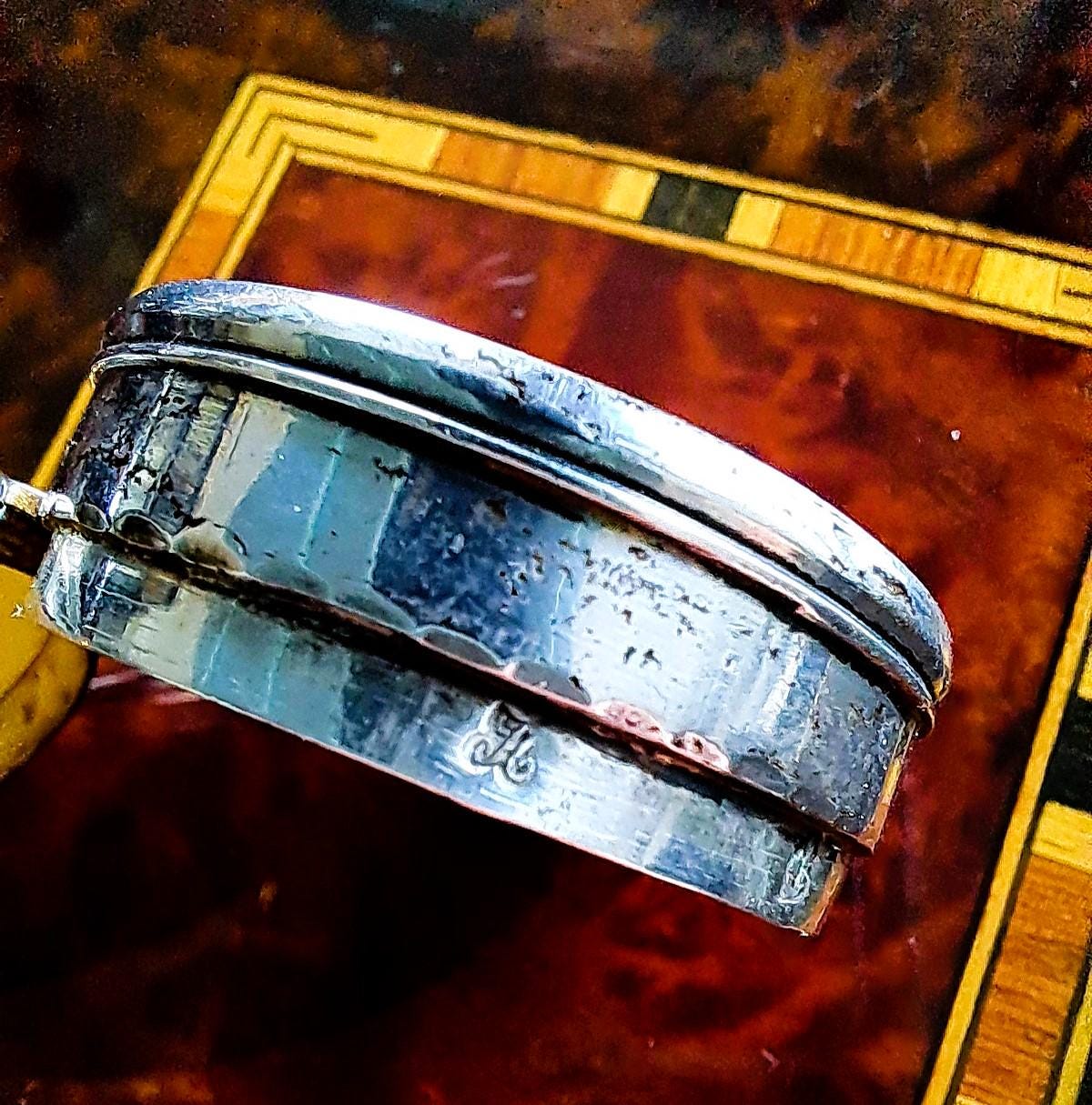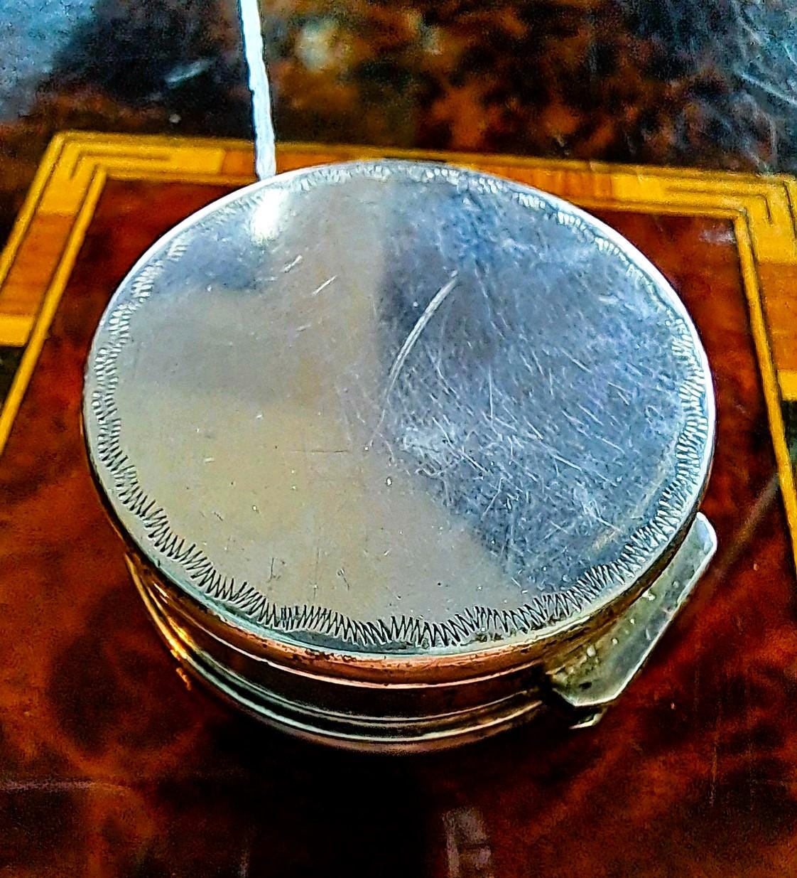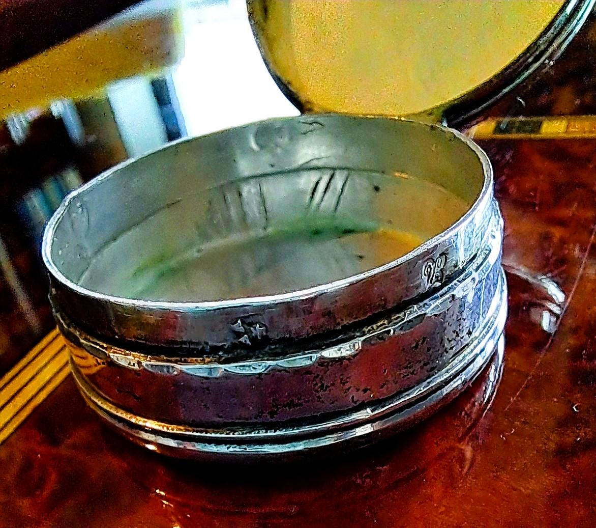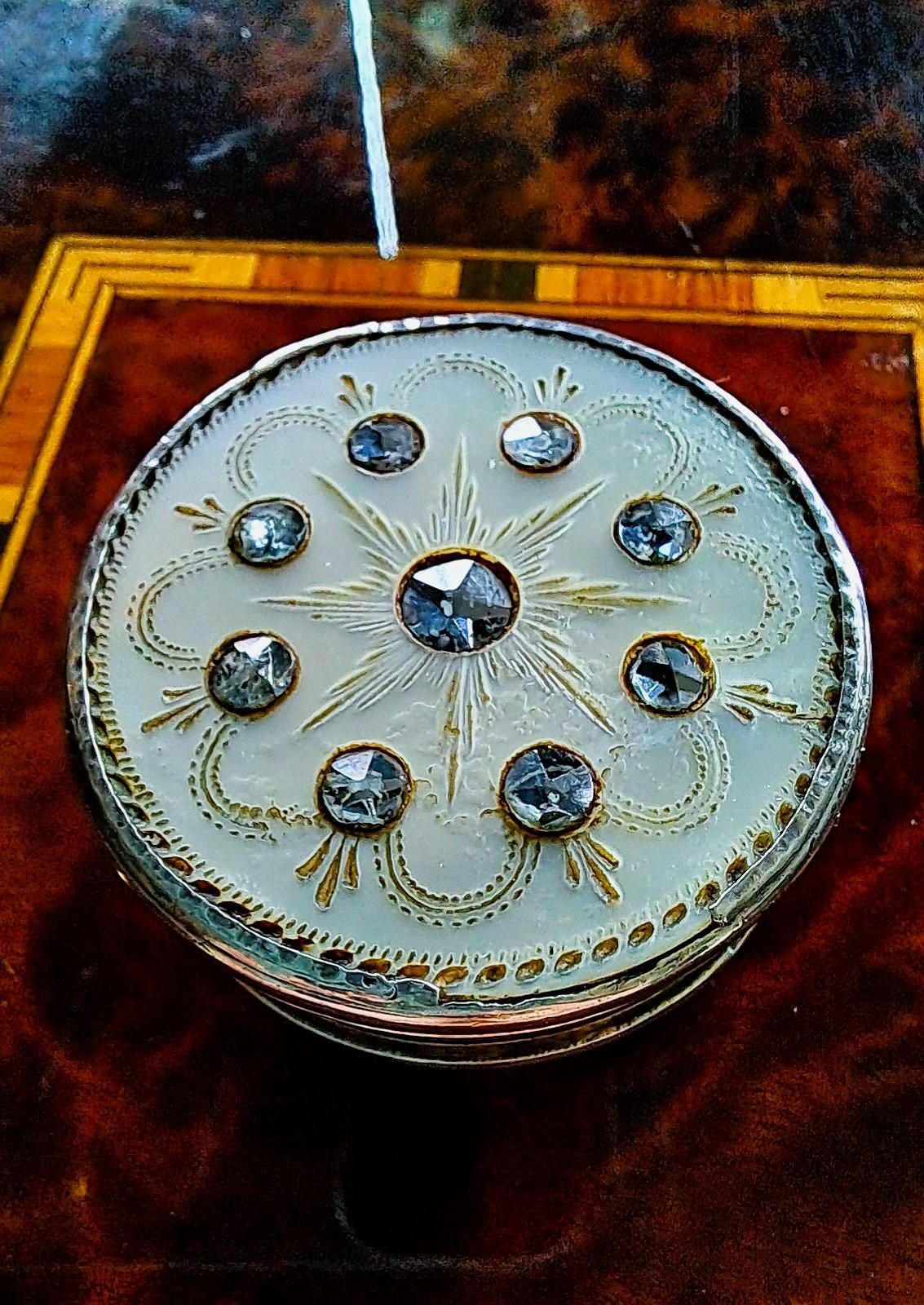 The lid of this pill box from 1817 is made of mother-of-pearl, which is decorated with very fine engravings and decorative glass stones. The box is made of 833 silver and is hallmarked. The hallmarks indicate the year 1817 and manufacture in Gouda, Netherlands (Minerva head with R), shortly after the end of French rule and the beginning of the constitutional monarchy. A very fine piece of work, more than 200 years old. Condition: Patina and signs of wear appropriate for its age, but no major damage, lid hinge works perfectly. Dimensions: Diameter 4 cm, height 1.6 cm; weight 33 grams