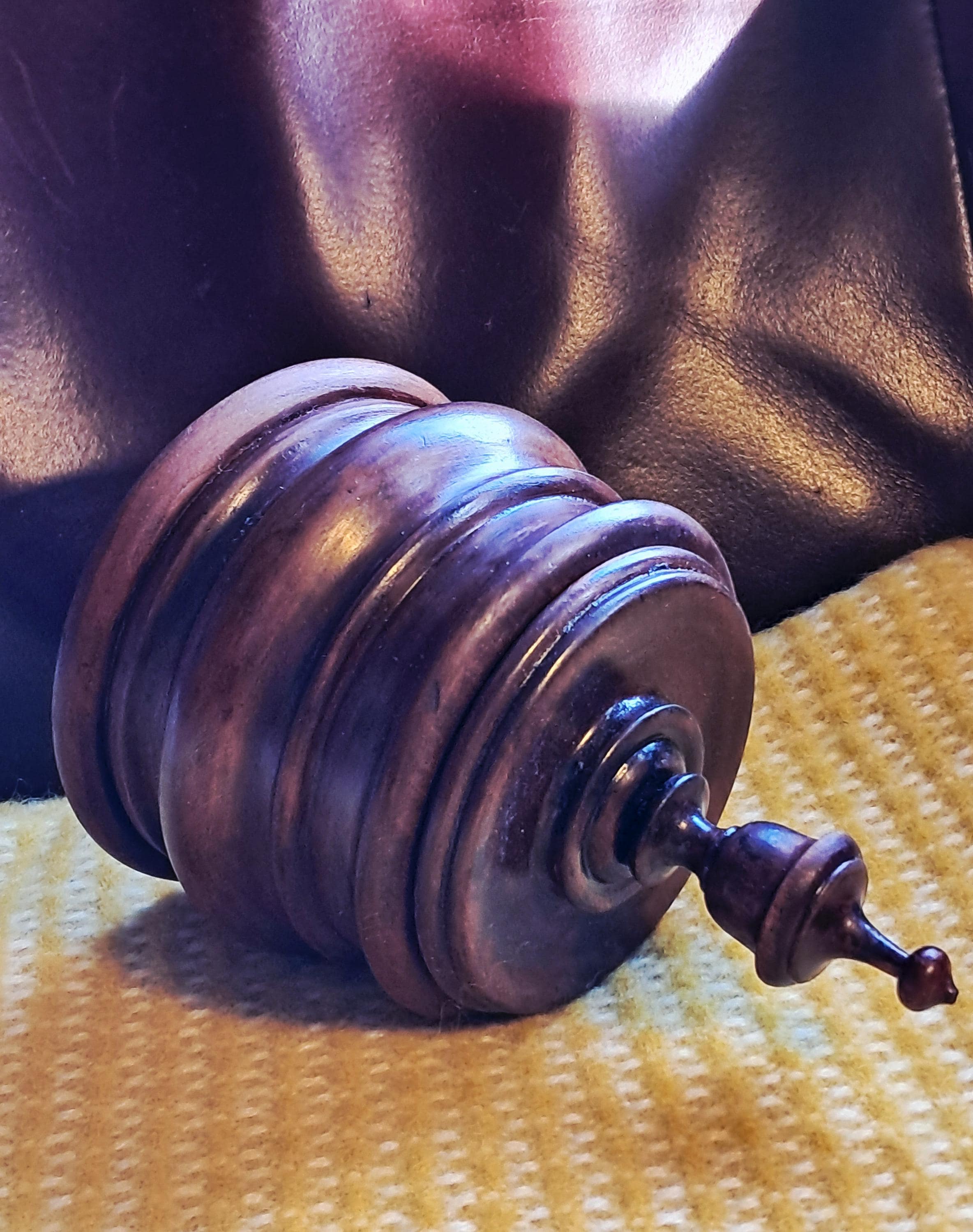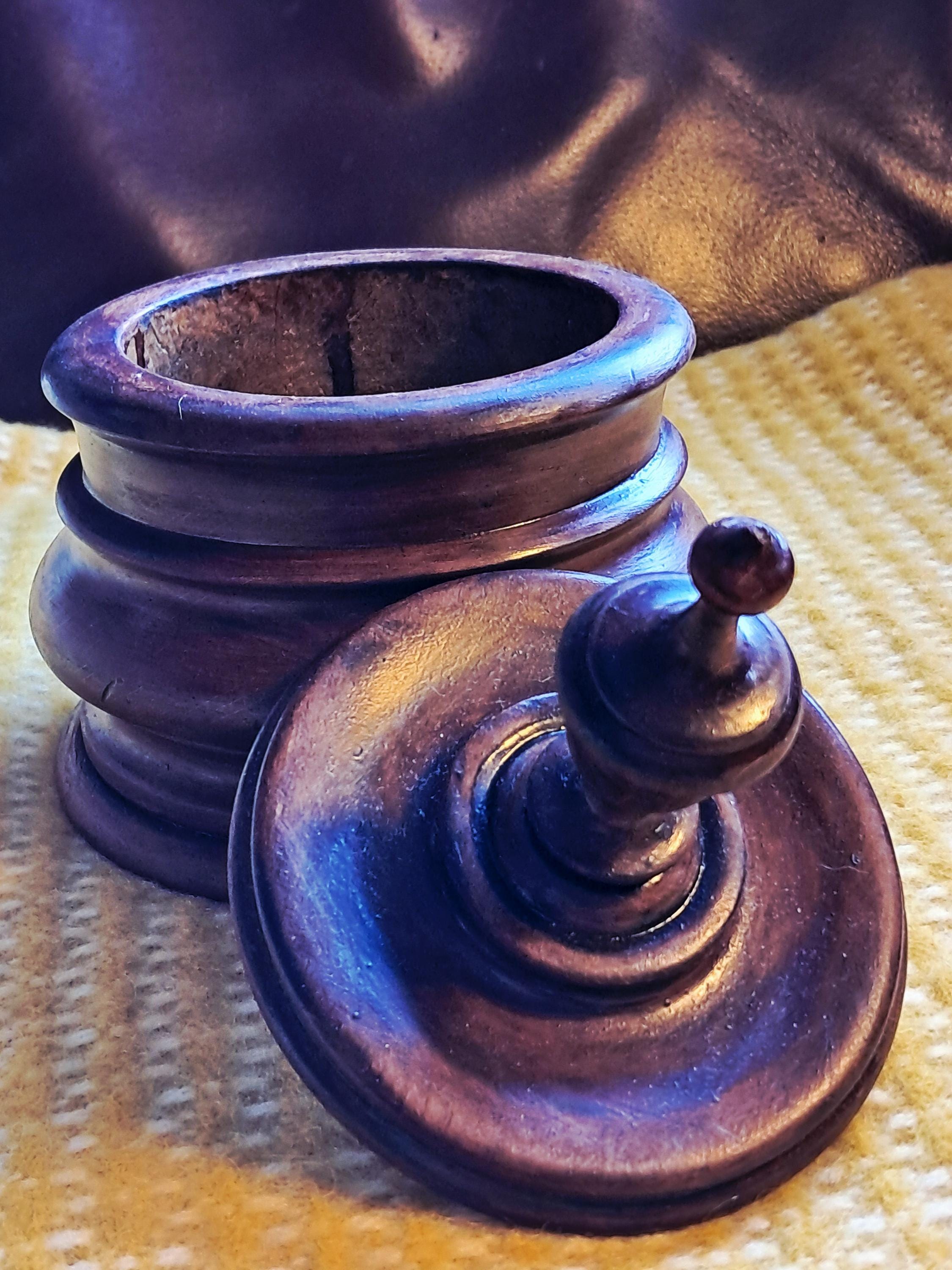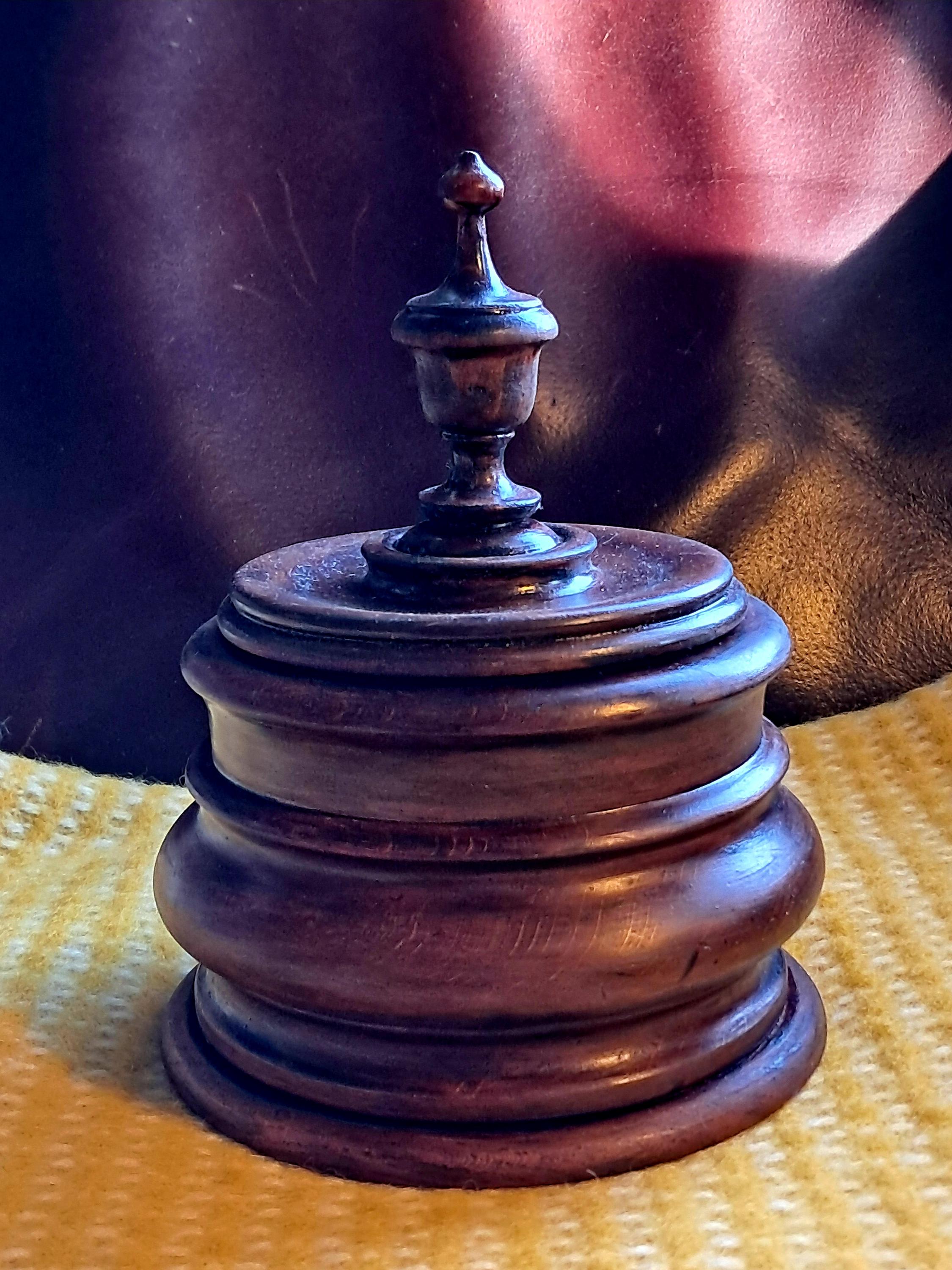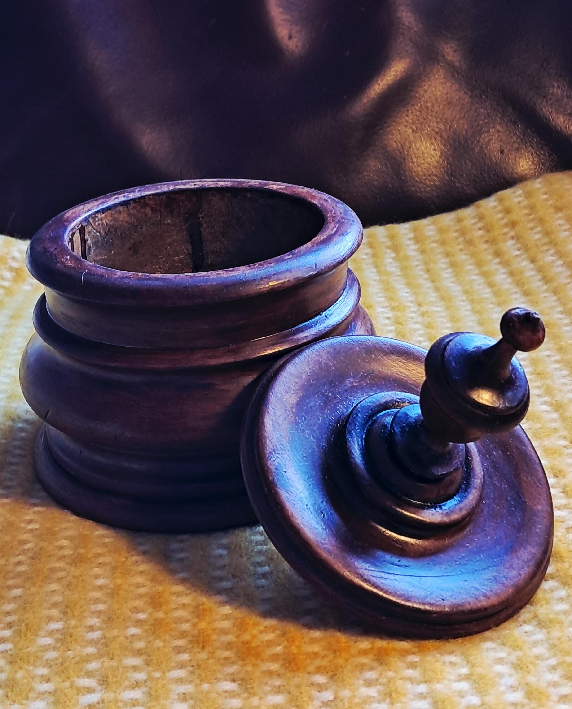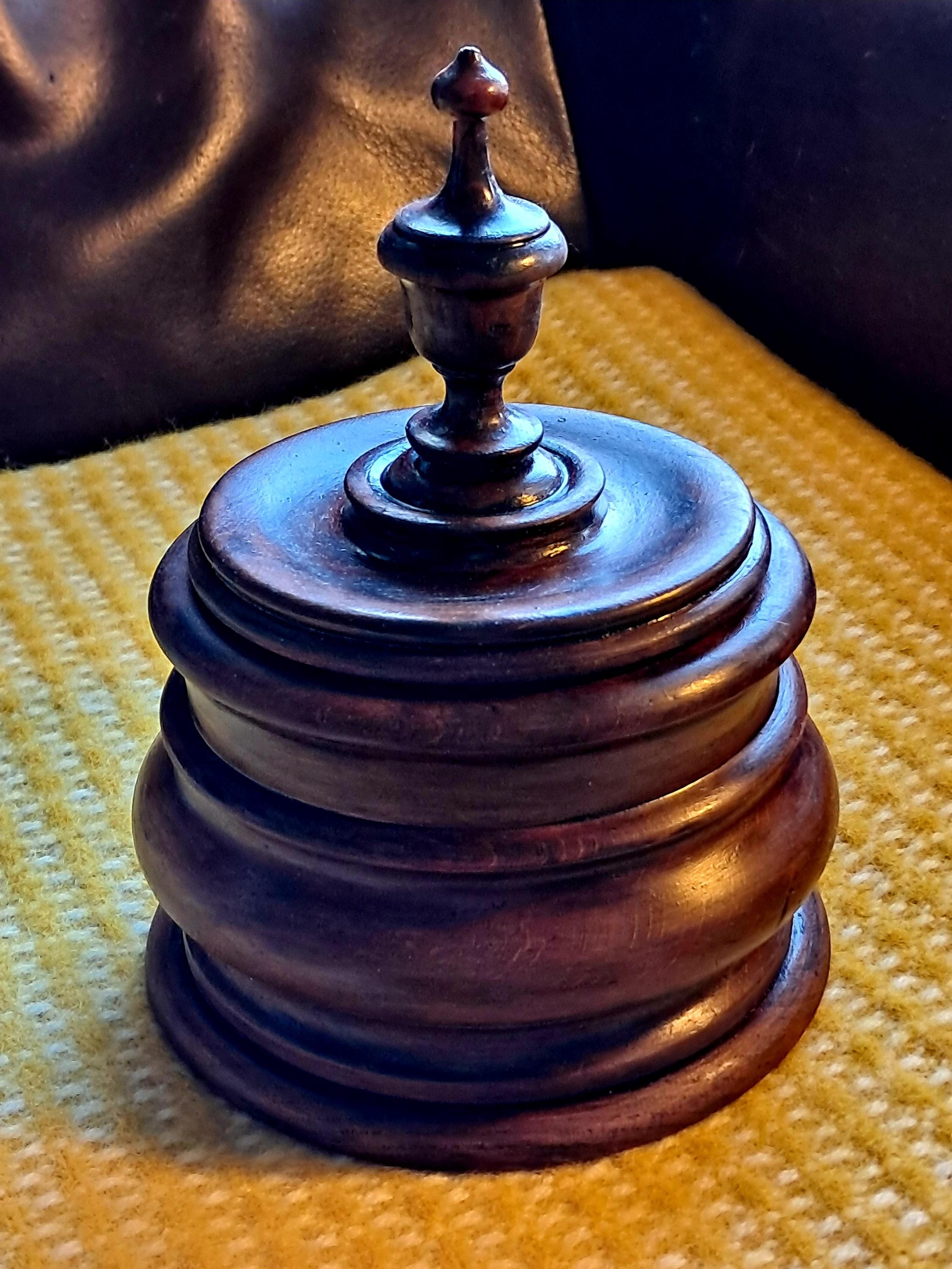 This antique tobacco pot from the Biedermeier period consists of a ring-turned body with a stepped base and a lid with a baluster-shaped knob. Originally intended exclusively for tobacco, this antique tobacco pot is also suitable for storing other items. Condition: Good condition, no shrinkage cracks, etc., lid closes perfectly. Dimensions: Height 18.5 cm, diameter 14 cm