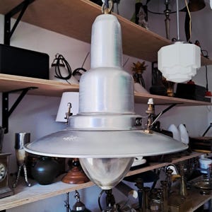 Large industrial lamp (3 in total, prices are per lamp; if you purchase all three lamps, the price per lamp is reduced by 15%, please contact us before purchase). Ideal for lofts, restaurants, bars, showrooms or shops. Robust, uncomplicated and with the necessary flair. All lamps are ready for use and can be connected to the power supply. Condition: Good condition despite age and use (dairy operation) Dimensions: Height of lamp body 43 cm, height including chain and end cap 130 cm, diameter 41 cm