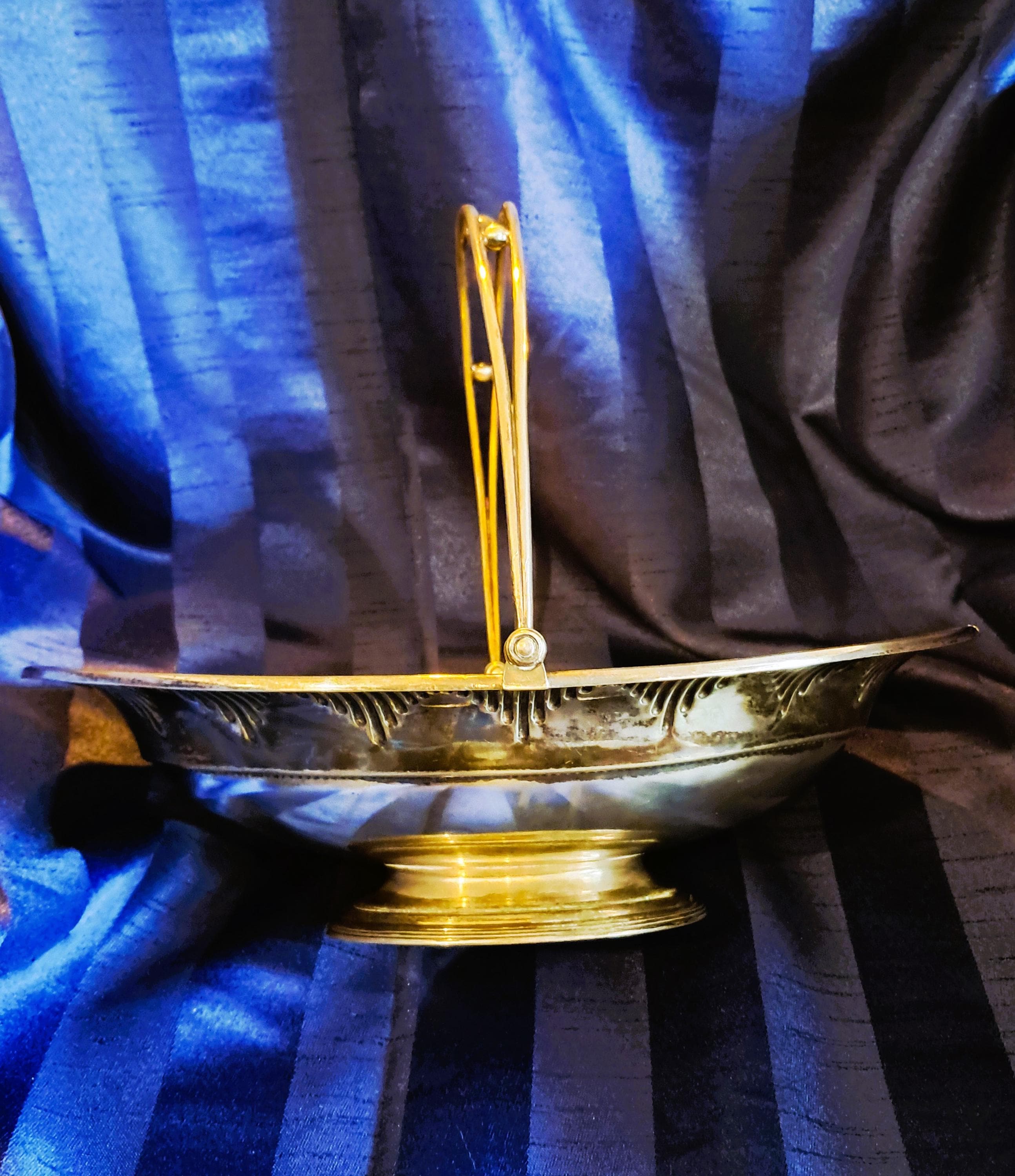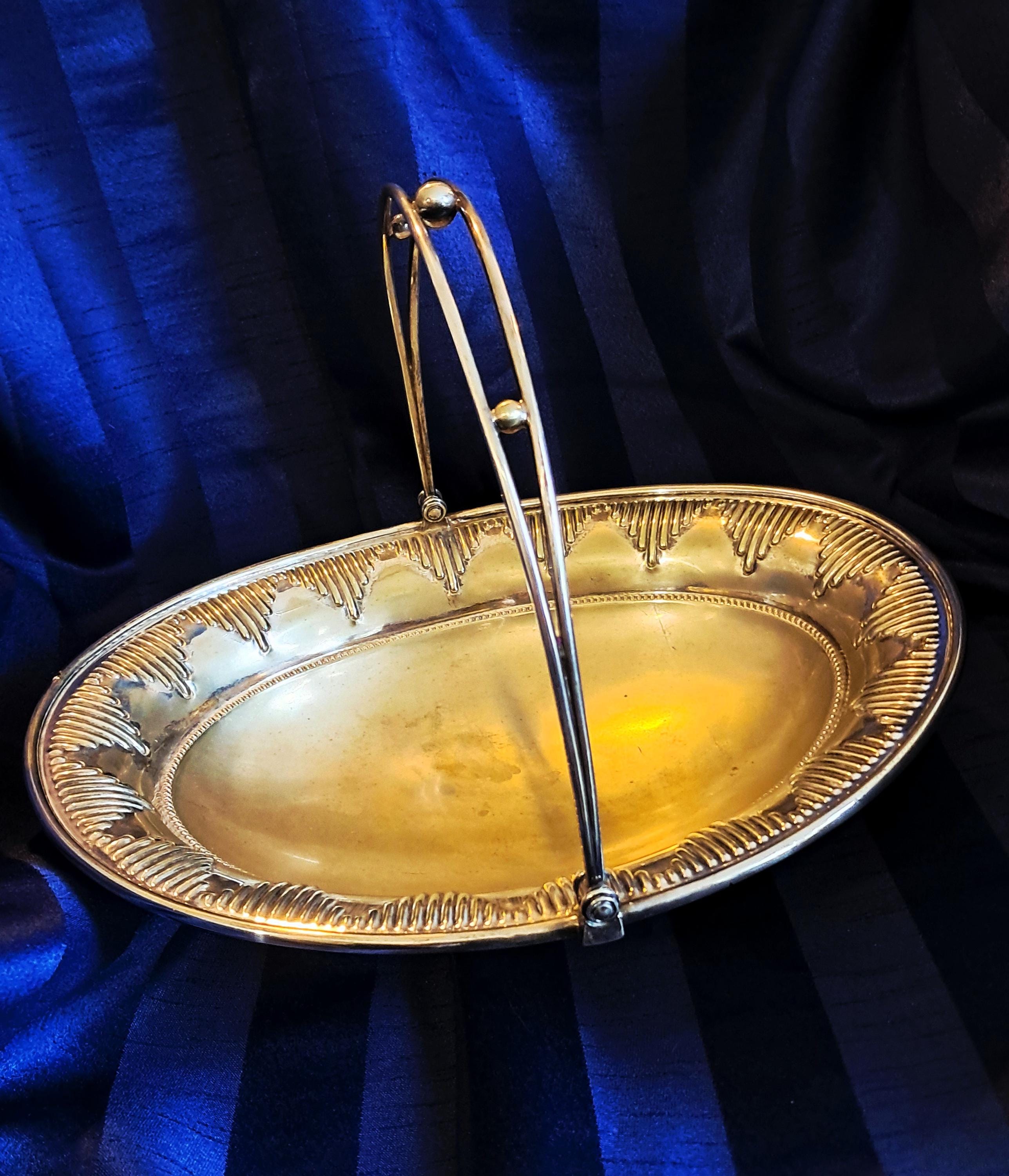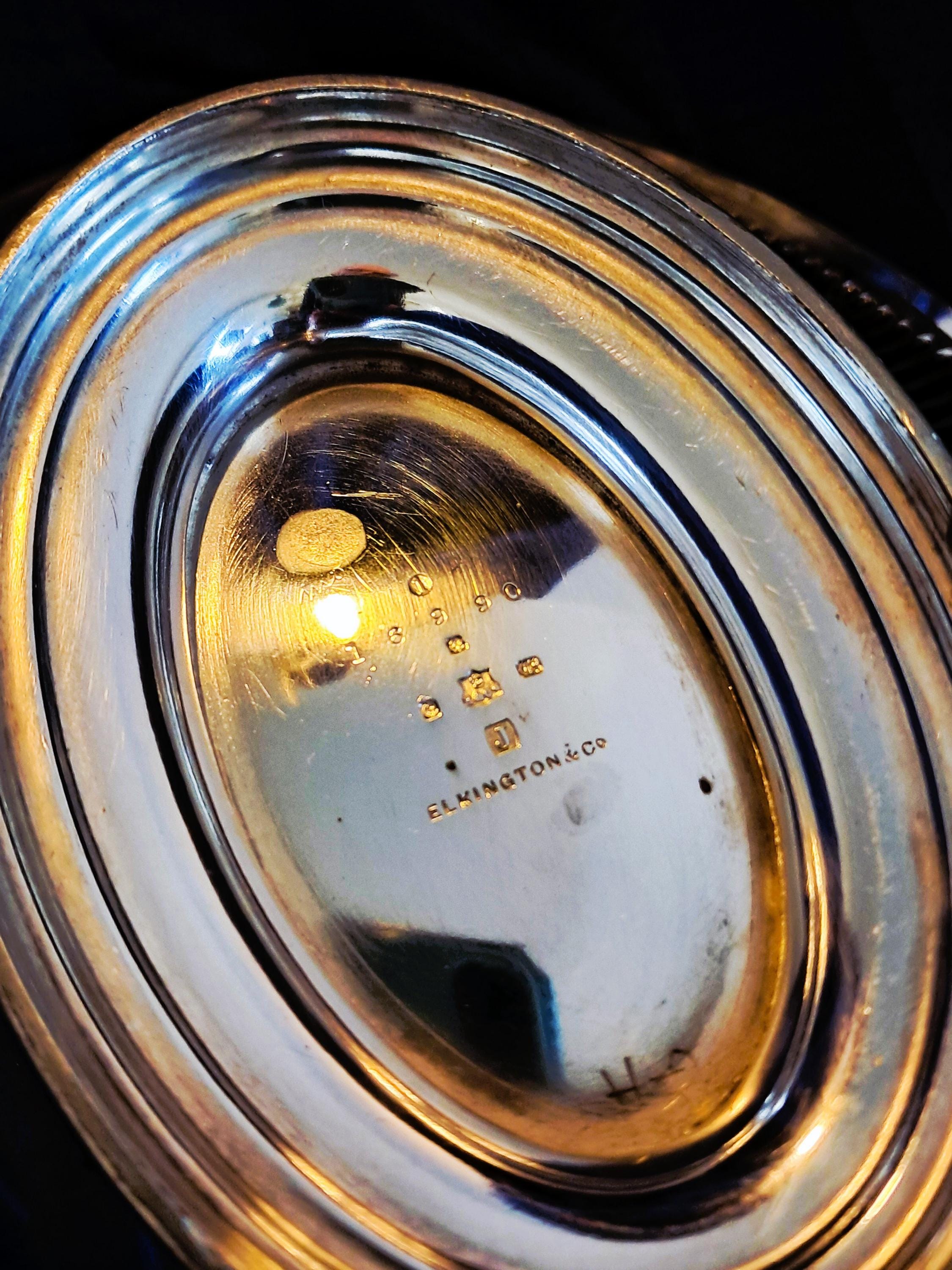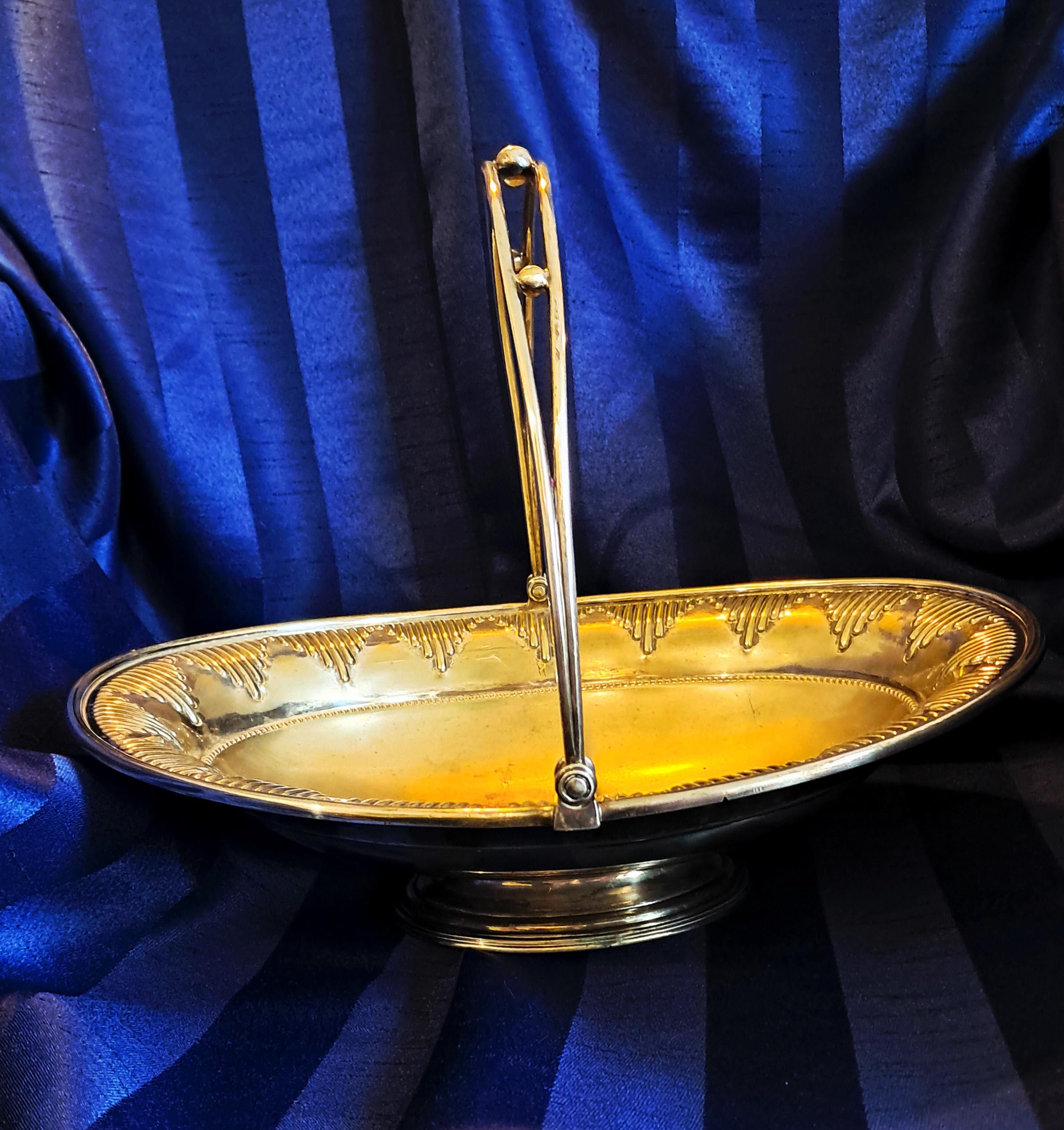 Elkington, the inventors of silver-plating, were and remain synonymous with the highest quality silver-plated items. This bowl for fruit (with traces of gilding still visible on the inside) can be dated to 1895 based on the hallmarks on the base. Elkington & Co. was a purveyor to the British Royal Family, as well as to the royal houses of Spain and Italy; Elkington also produced the cutlery for the luxury class of the Titanic. Condition: Good condition with age-related patina and signs of wear. One impact mark on the upper rim (see photo). Dimensions: Length 31 cm, width 24.5 cm, height with handle raised 26 cm, height without handle 8 cm.