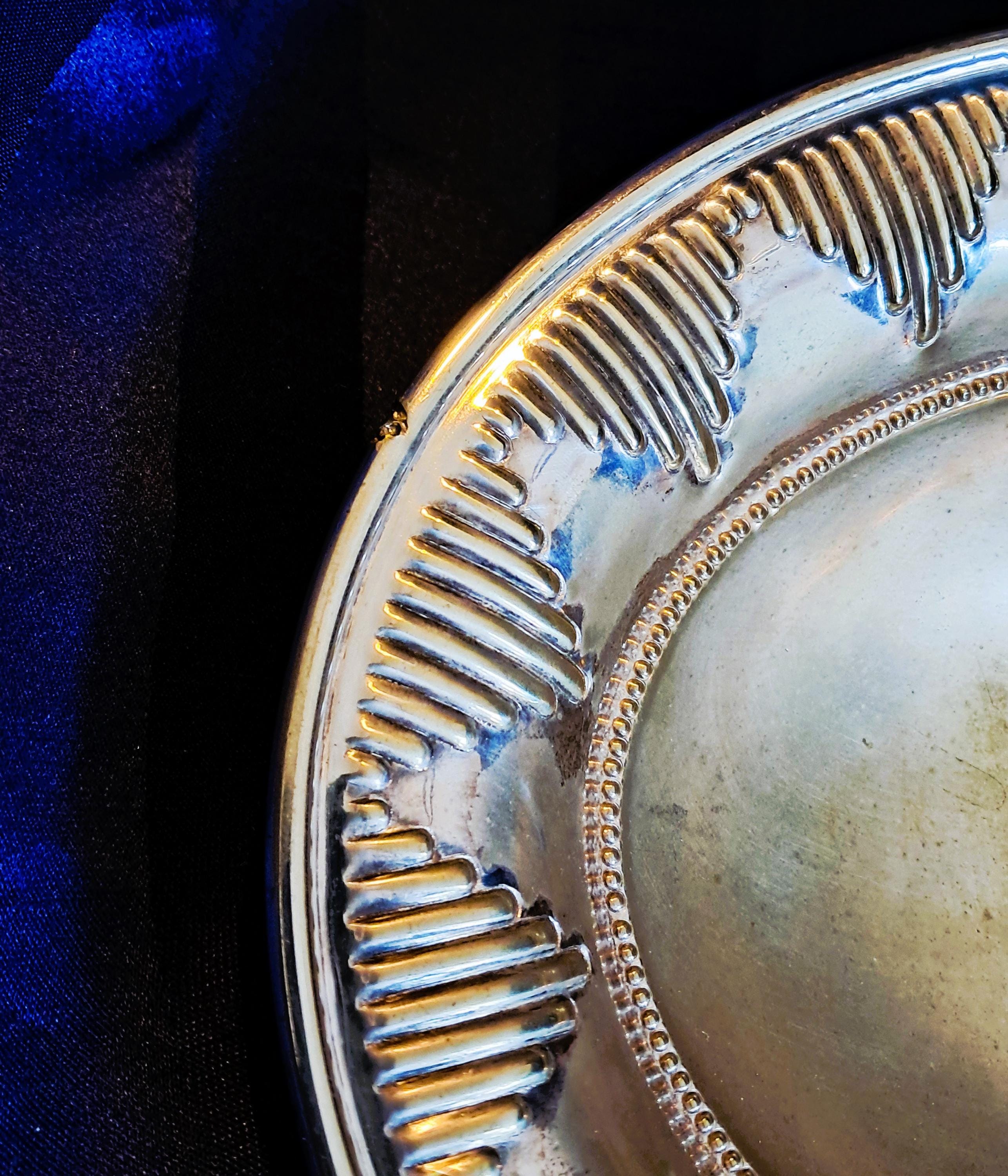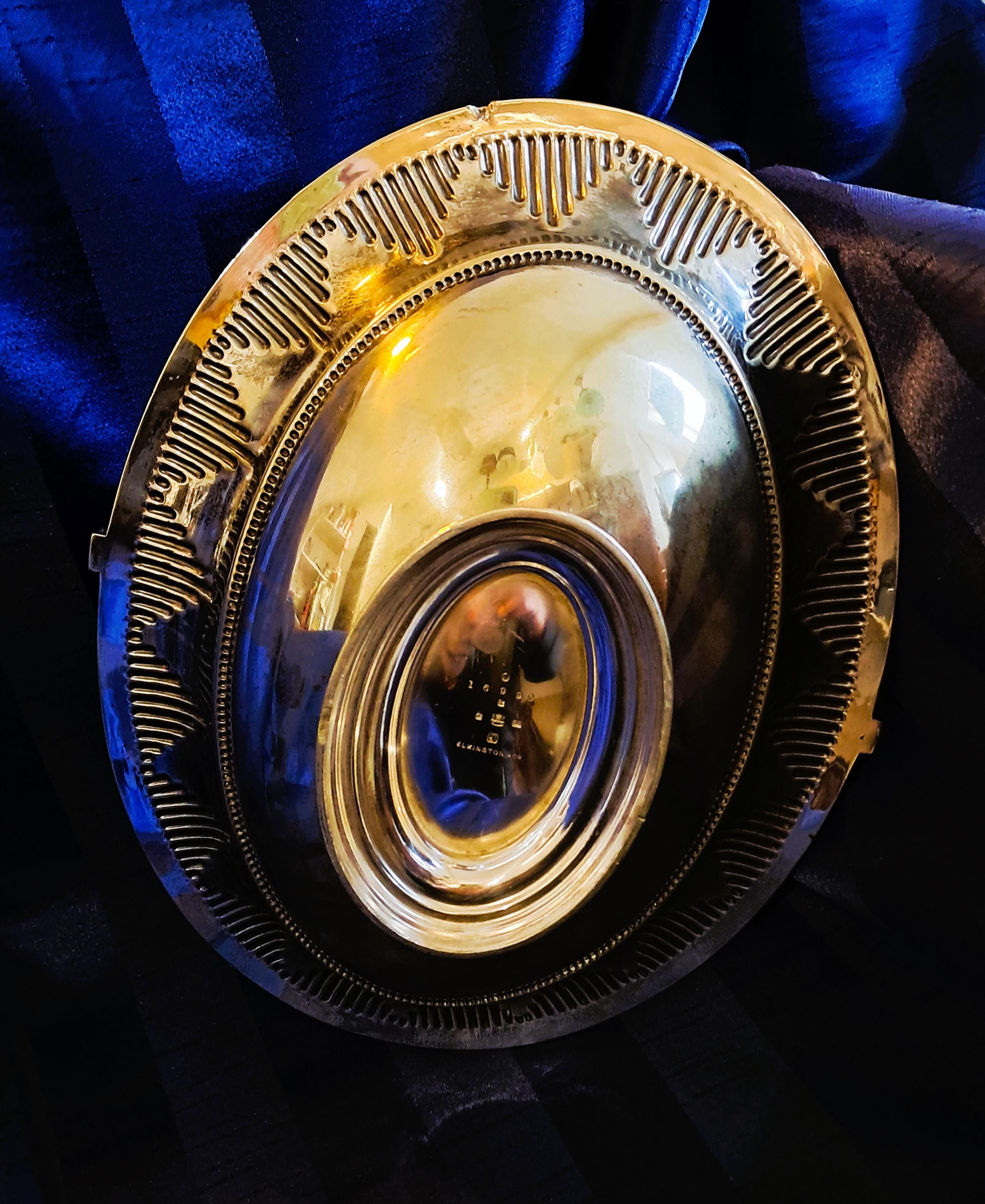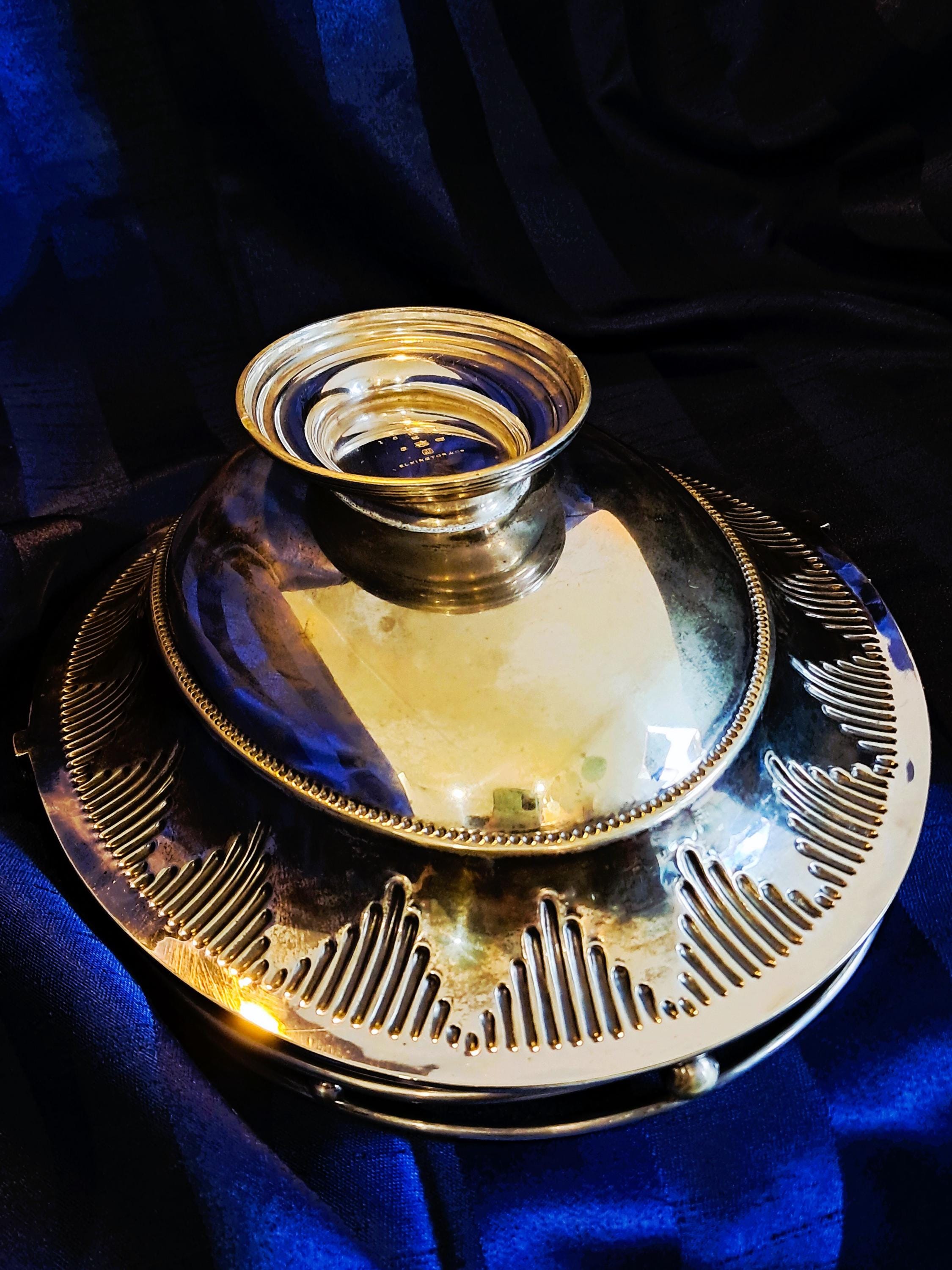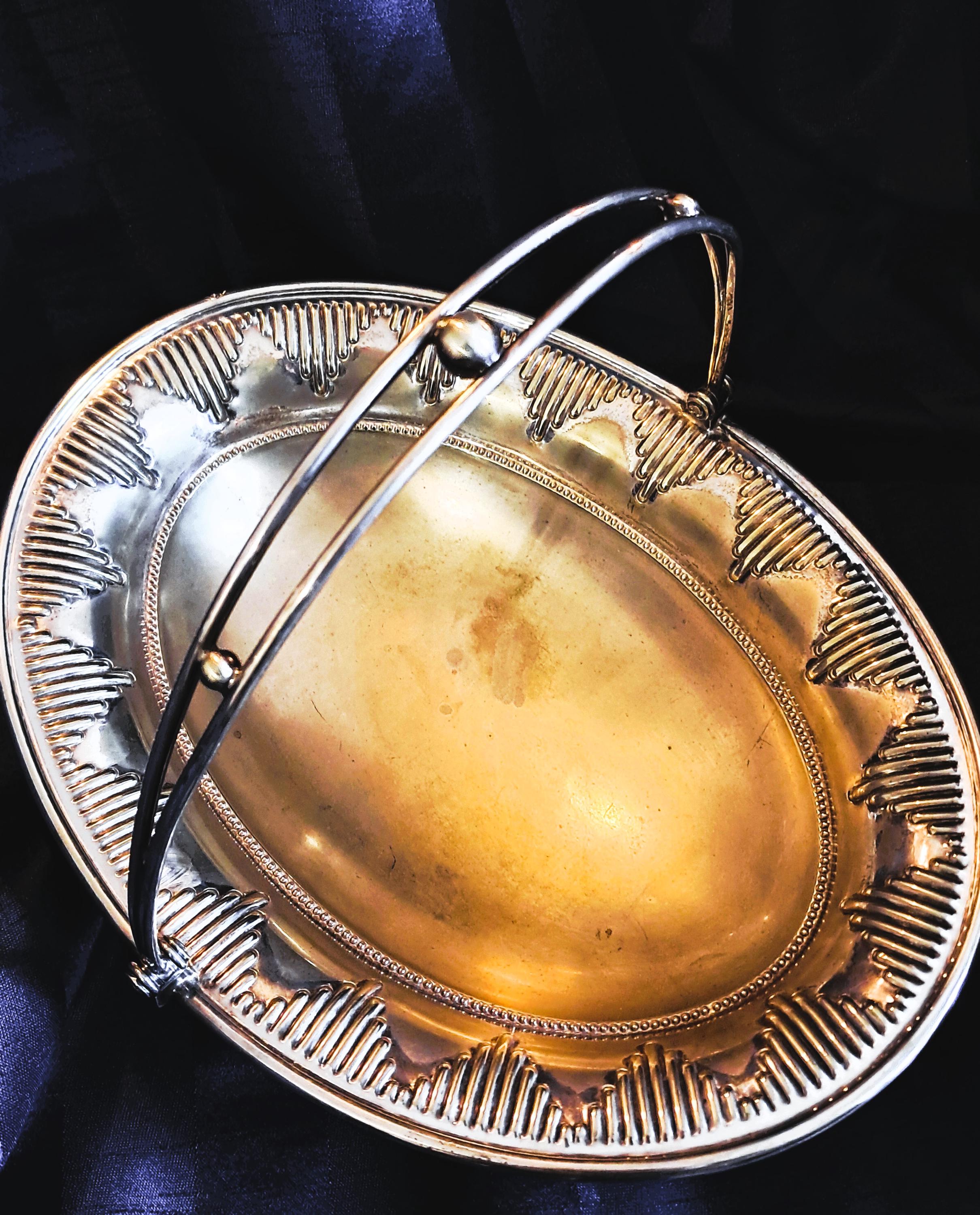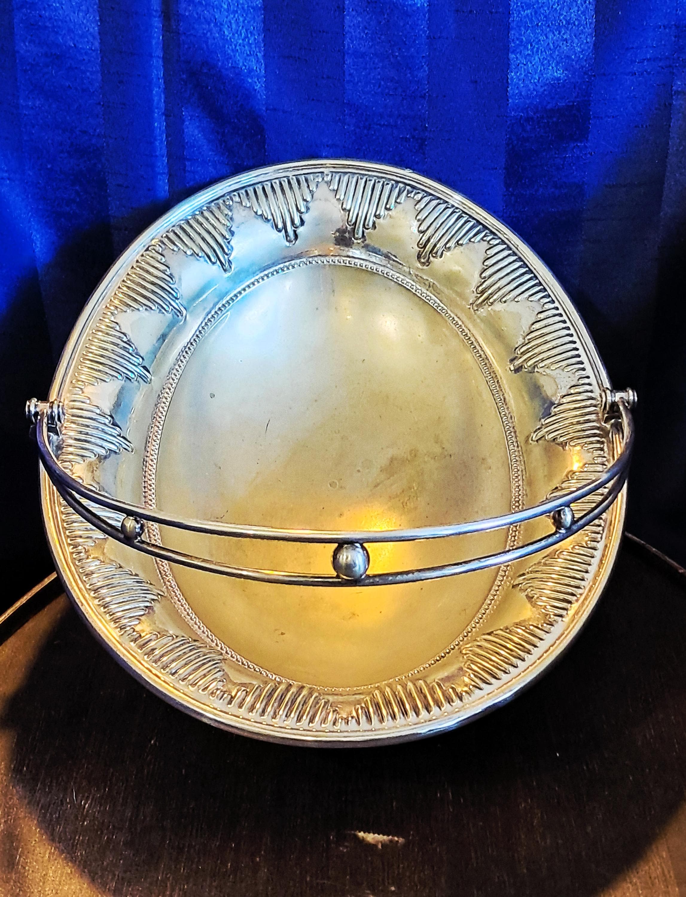 Elkington, the inventors of silver-plating, were and remain synonymous with the highest quality silver-plated items. This bowl for fruit (with traces of gilding still visible on the inside) can be dated to 1895 based on the hallmarks on the base. Elkington & Co. was a purveyor to the British Royal Family, as well as to the royal houses of Spain and Italy; Elkington also produced the cutlery for the luxury class of the Titanic. Condition: Good condition with age-related patina and signs of wear. One impact mark on the upper rim (see photo). Dimensions: Length 31 cm, width 24.5 cm, height with handle raised 26 cm, height without handle 8 cm.