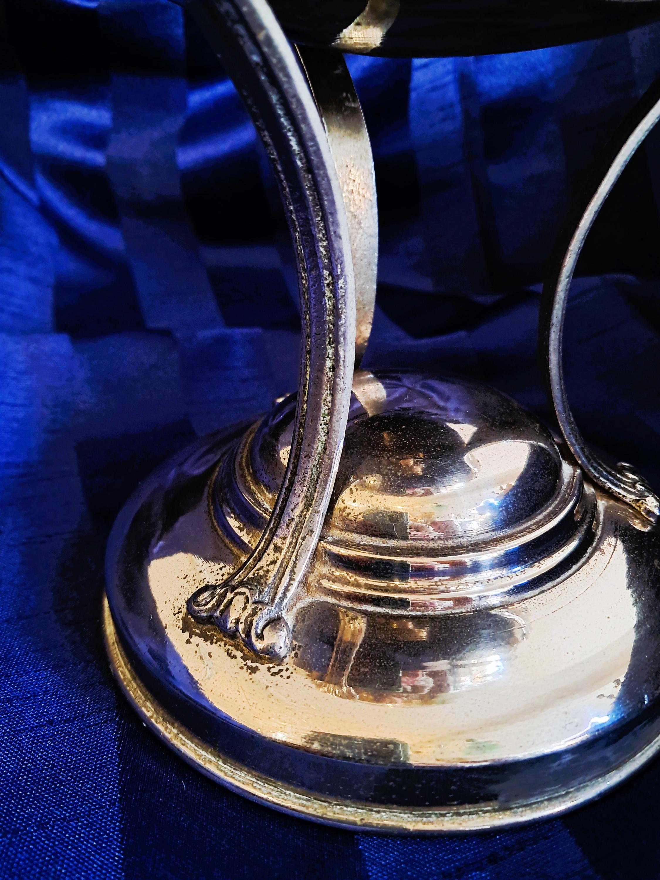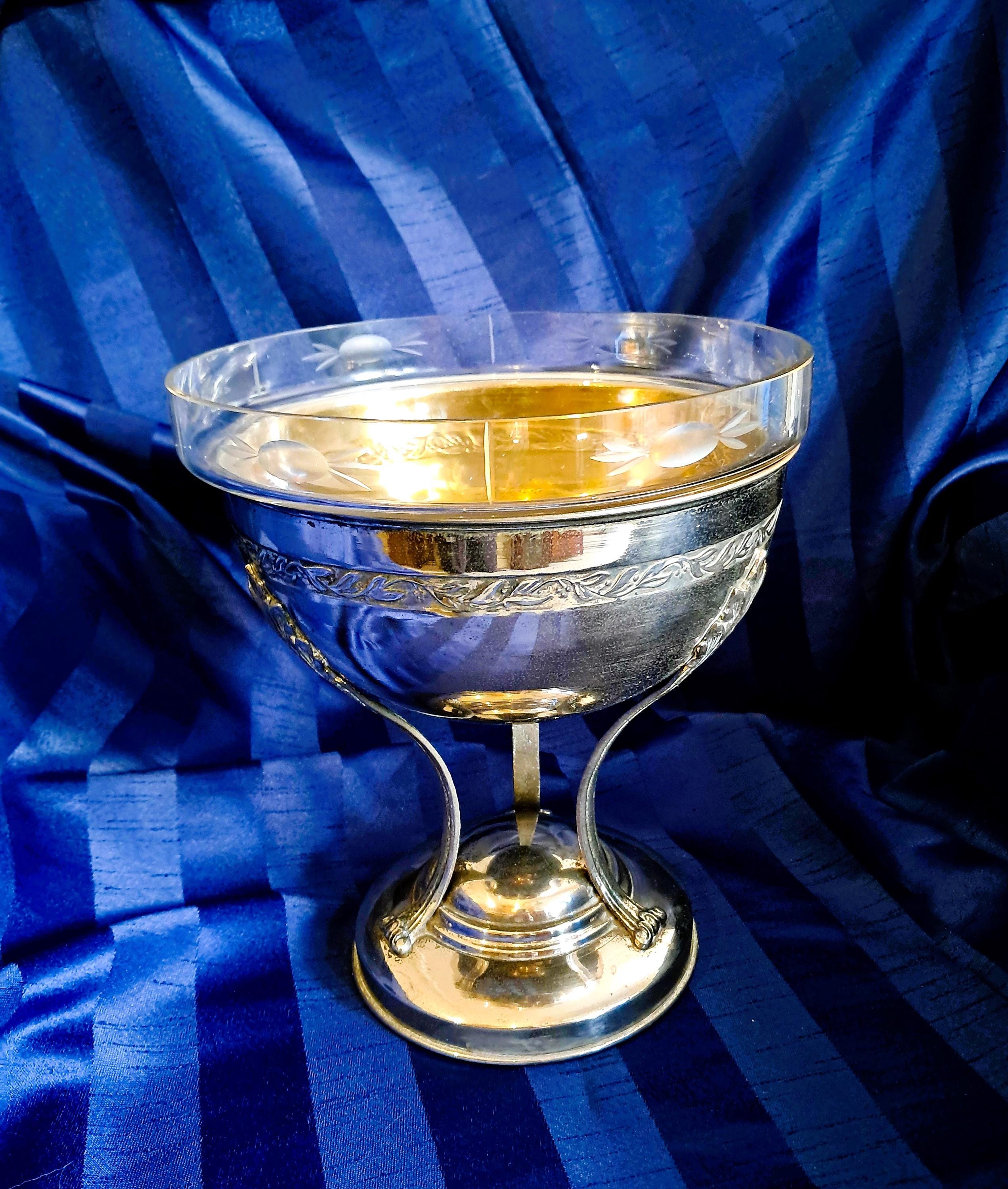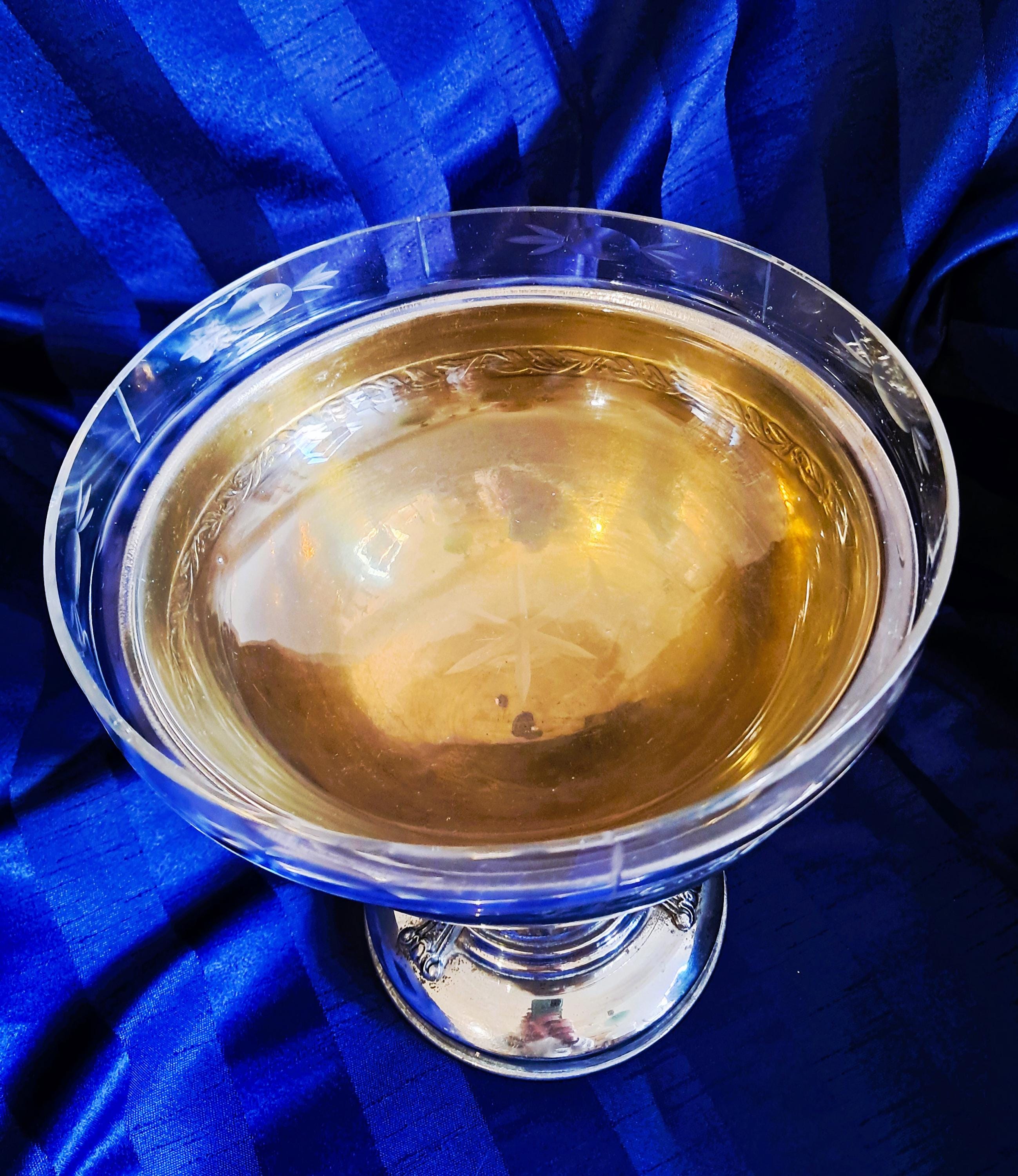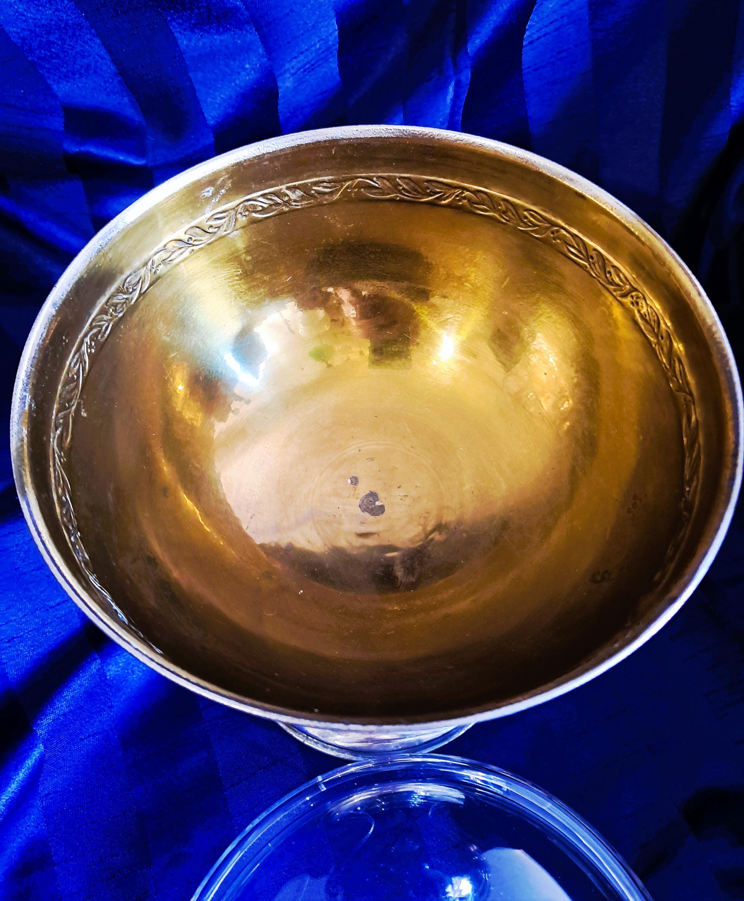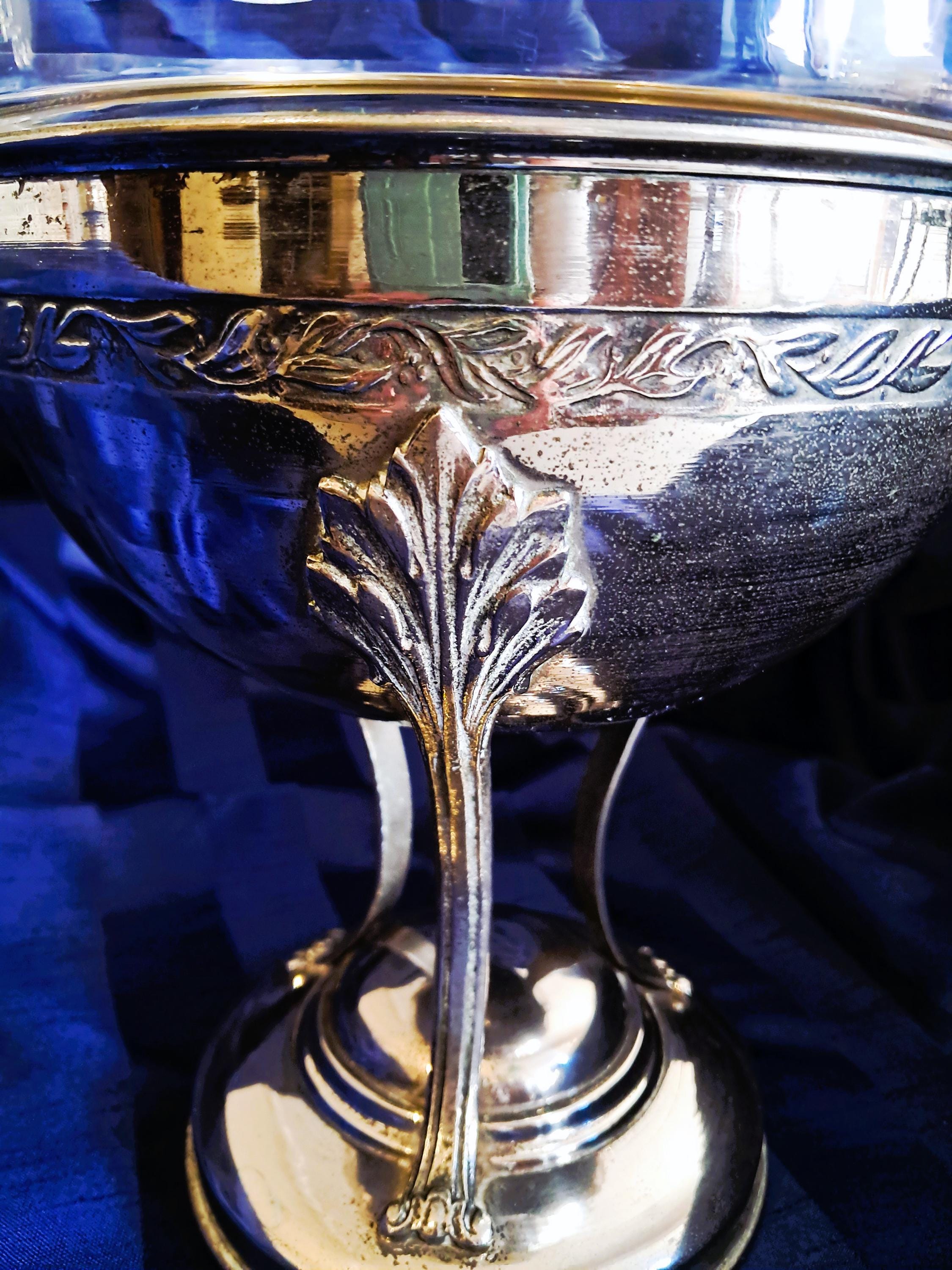 Attractive fruit bowl made of nickel-plated brass with a cut-glass insert. Three elongated, curved acanthus leaves connect the round base to the bowl. The bowl is adorned with a decorative band all the way round. Condition: There is no damage to the metal or the glass. The bowl shows clear signs of age (see photos). An attractive piece that does not hide its age. Dimensions: Height 25 cm, diameter 21 cm