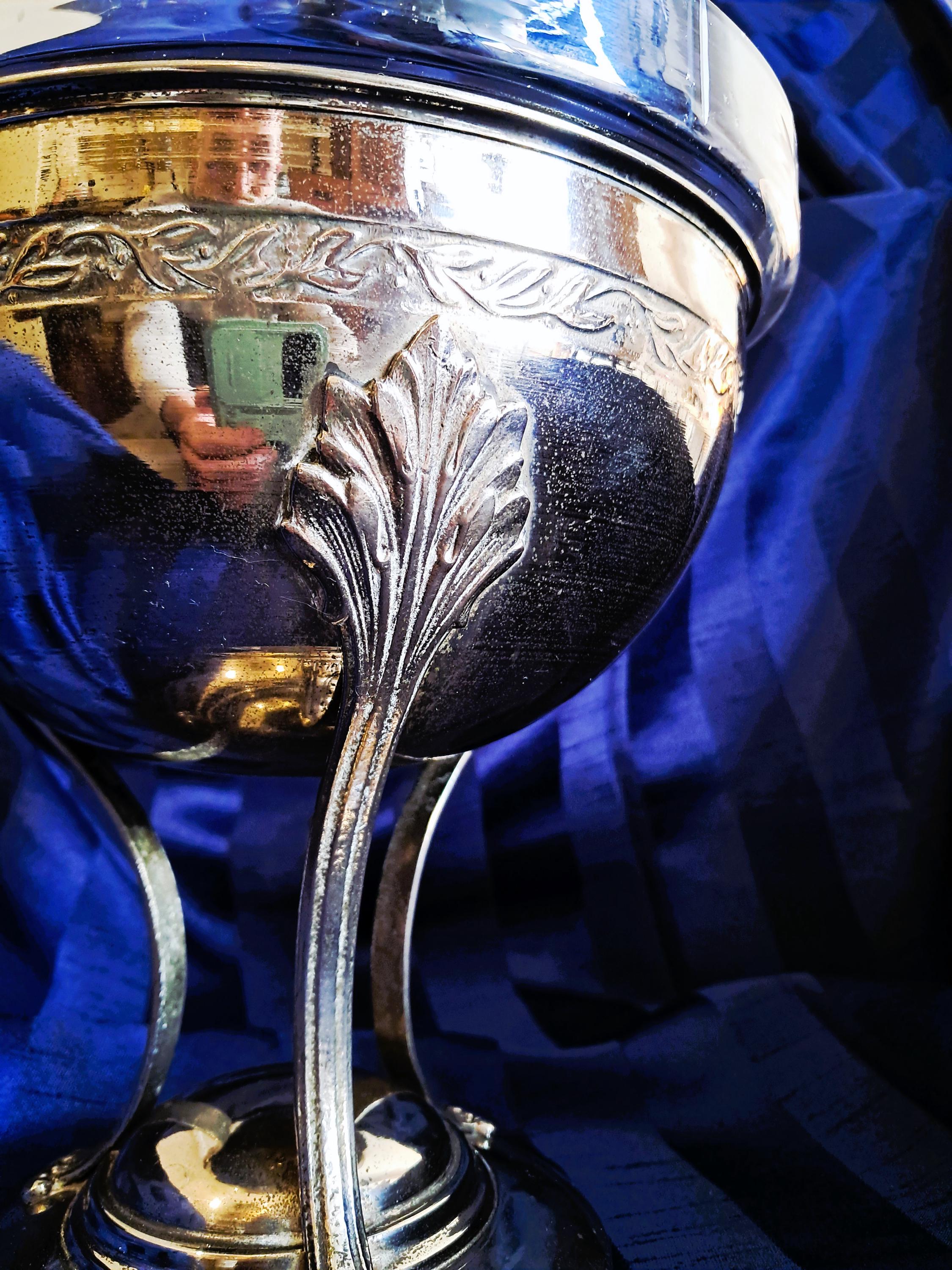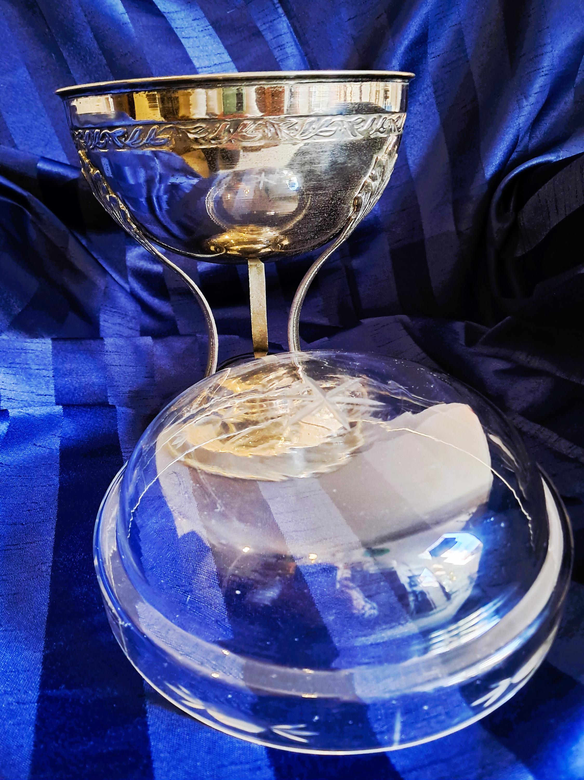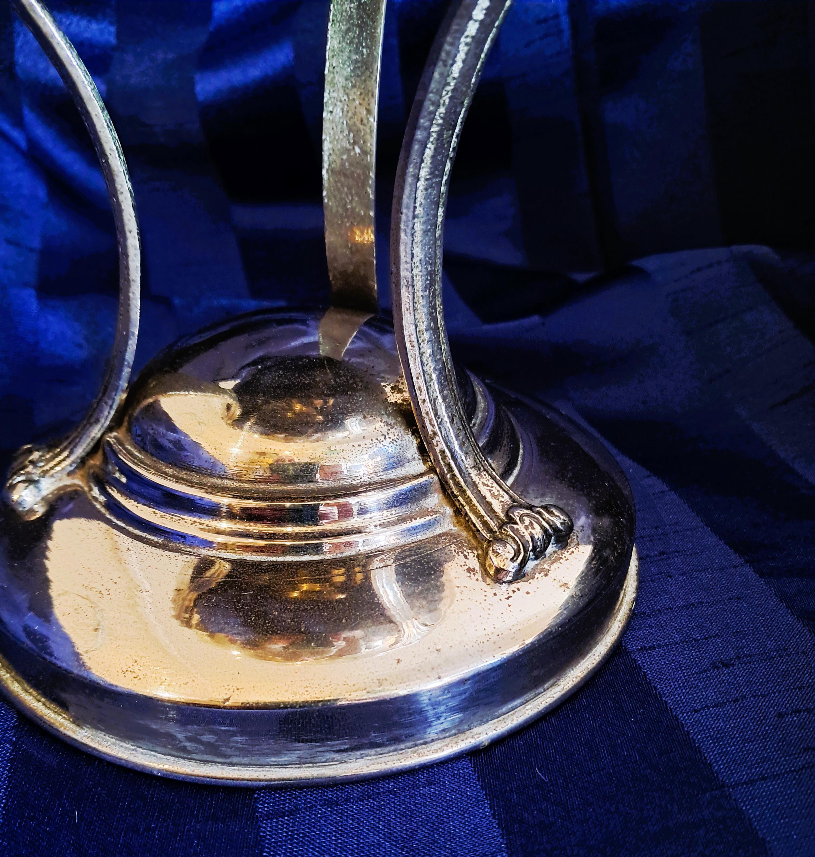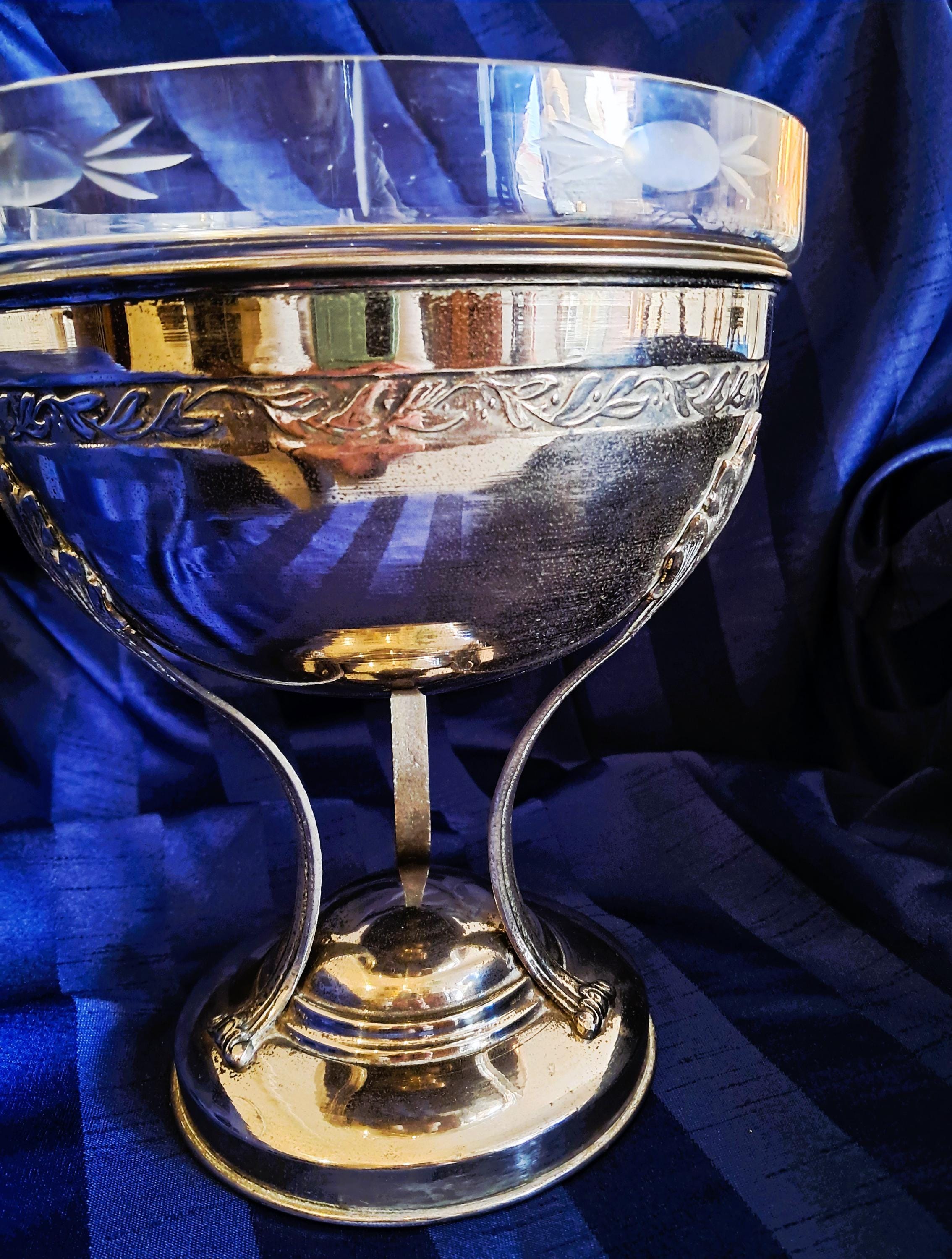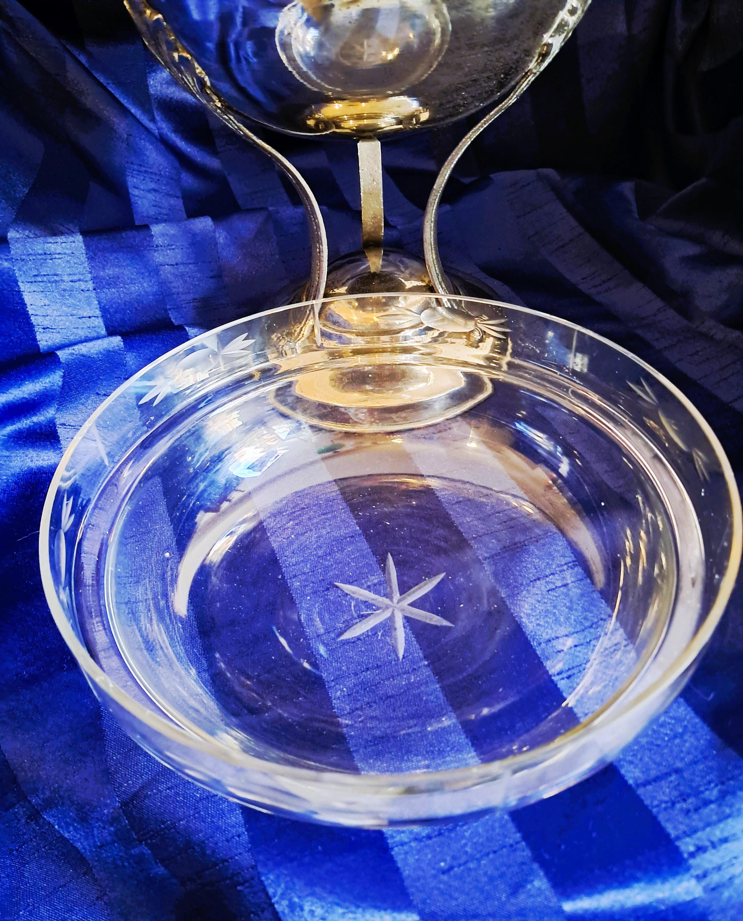 Attractive fruit bowl made of nickel-plated brass with a cut-glass insert. Three elongated, curved acanthus leaves connect the round base to the bowl. The bowl is adorned with a decorative band all the way round. Condition: There is no damage to the metal or the glass. The bowl shows clear signs of age (see photos). An attractive piece that does not hide its age. Dimensions: Height 25 cm, diameter 21 cm