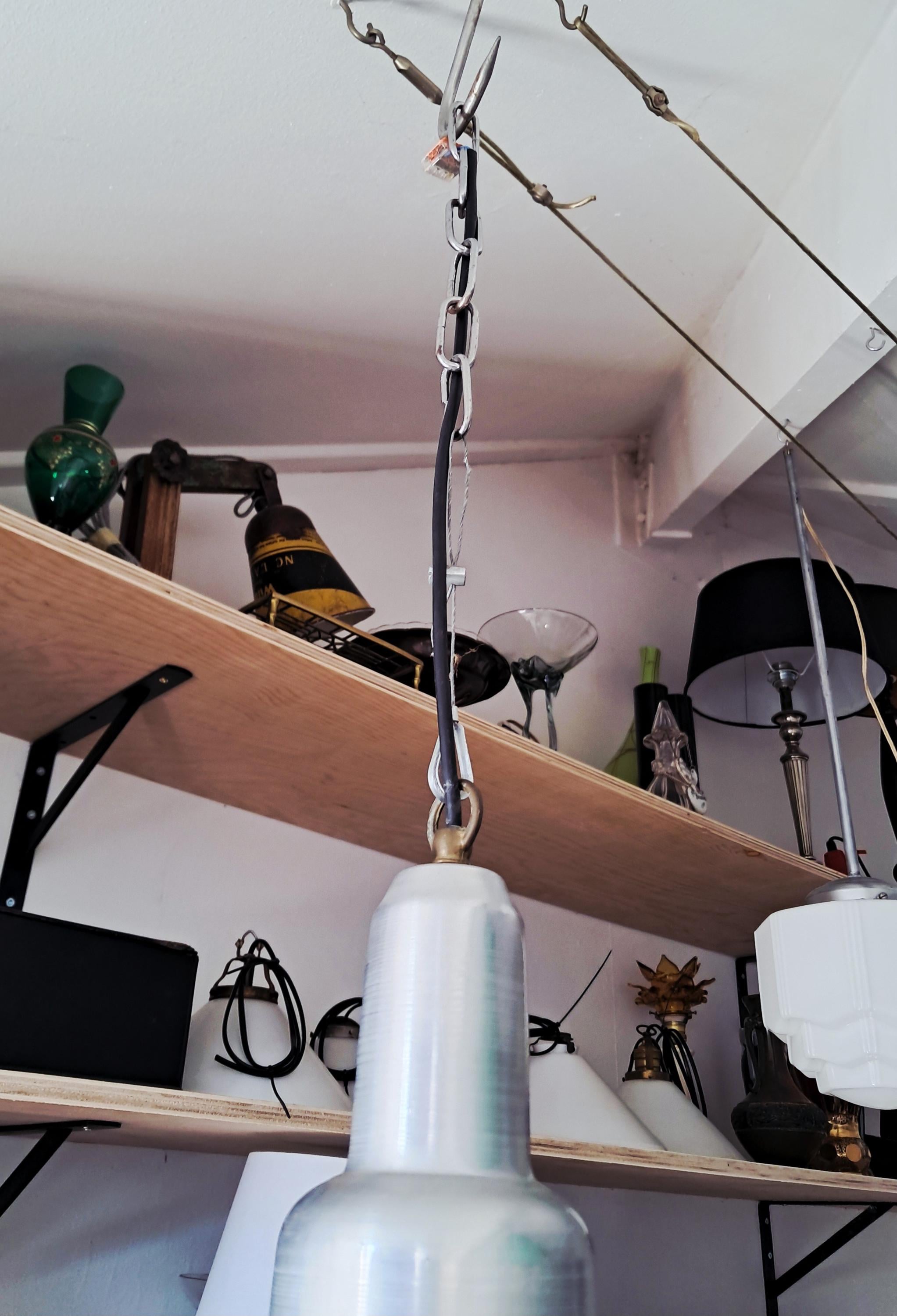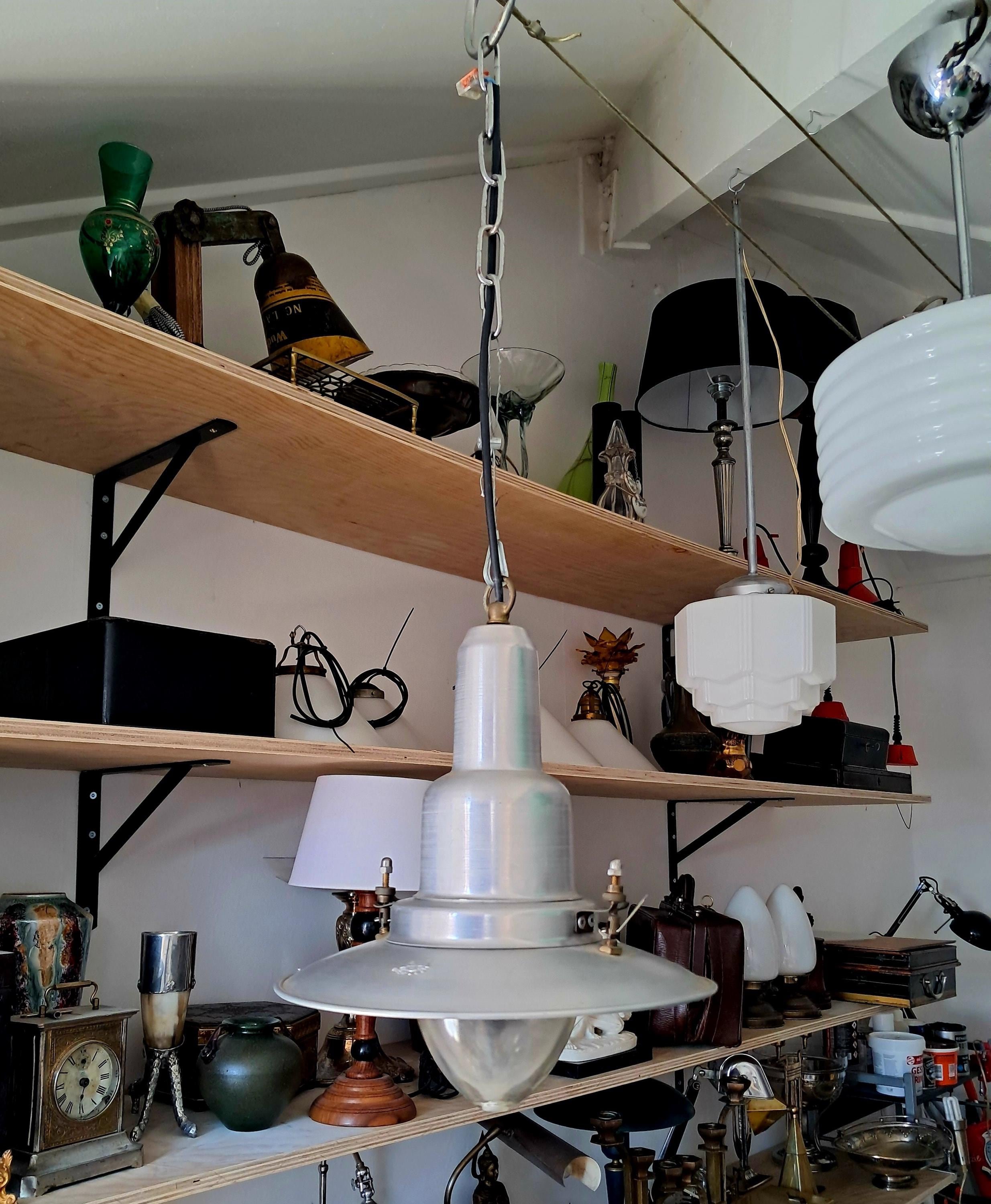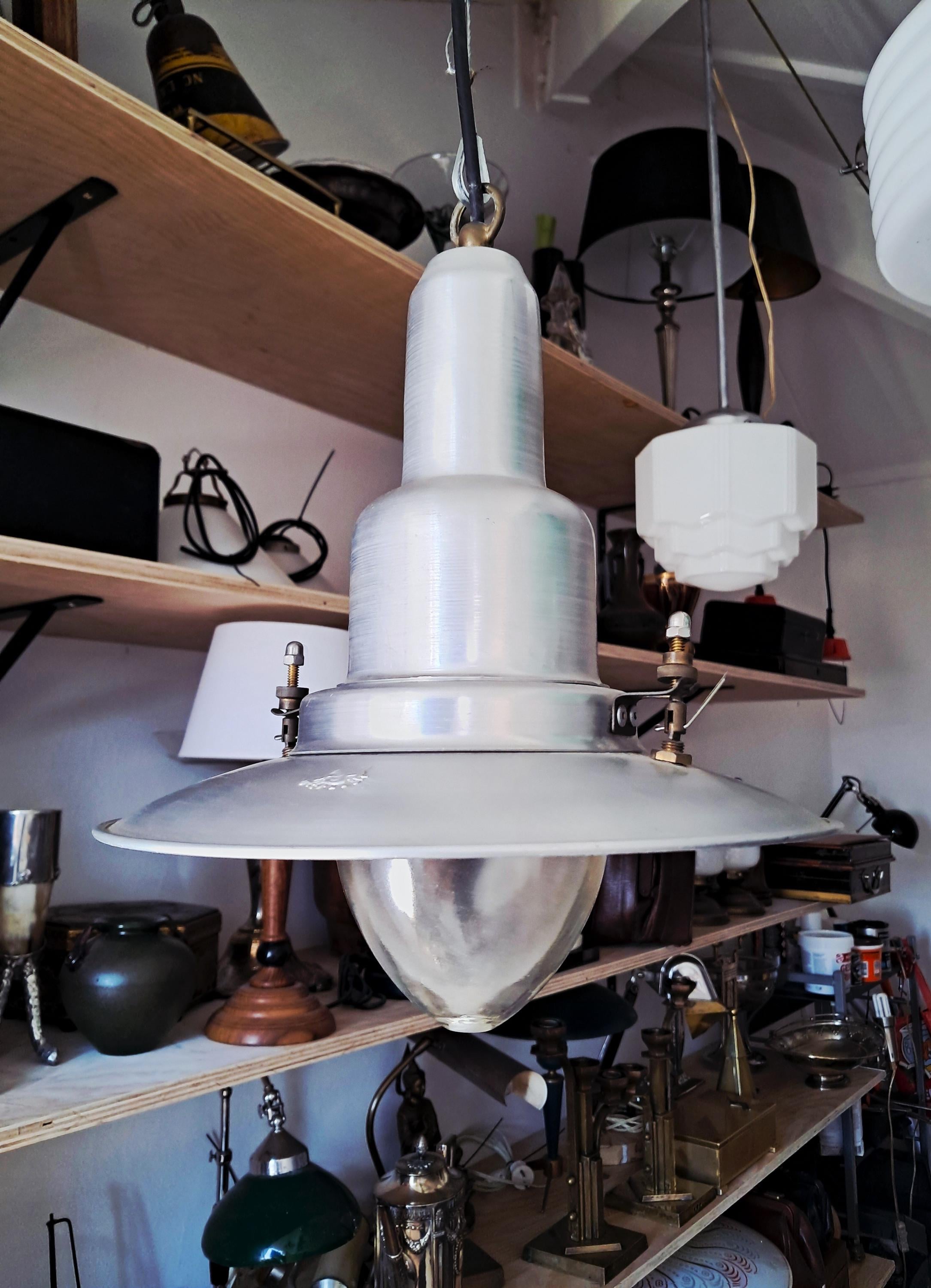 Vintage Uccello ship's lantern – the design is based on the lanterns that fishermen used to attach to the stern of their boats to attract fish. Aluminium housing with a conical glass body. Condition: Good condition, age-appropriate patina and slight signs of wear. Dimensions: Height of lamp body 30 cm, length of chain 39 cm, diameter 25 cm