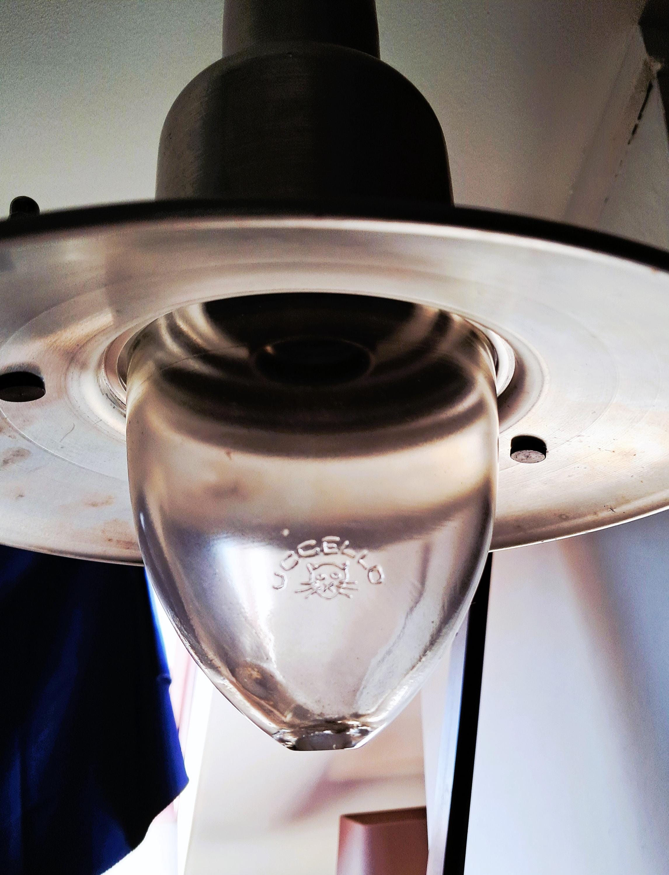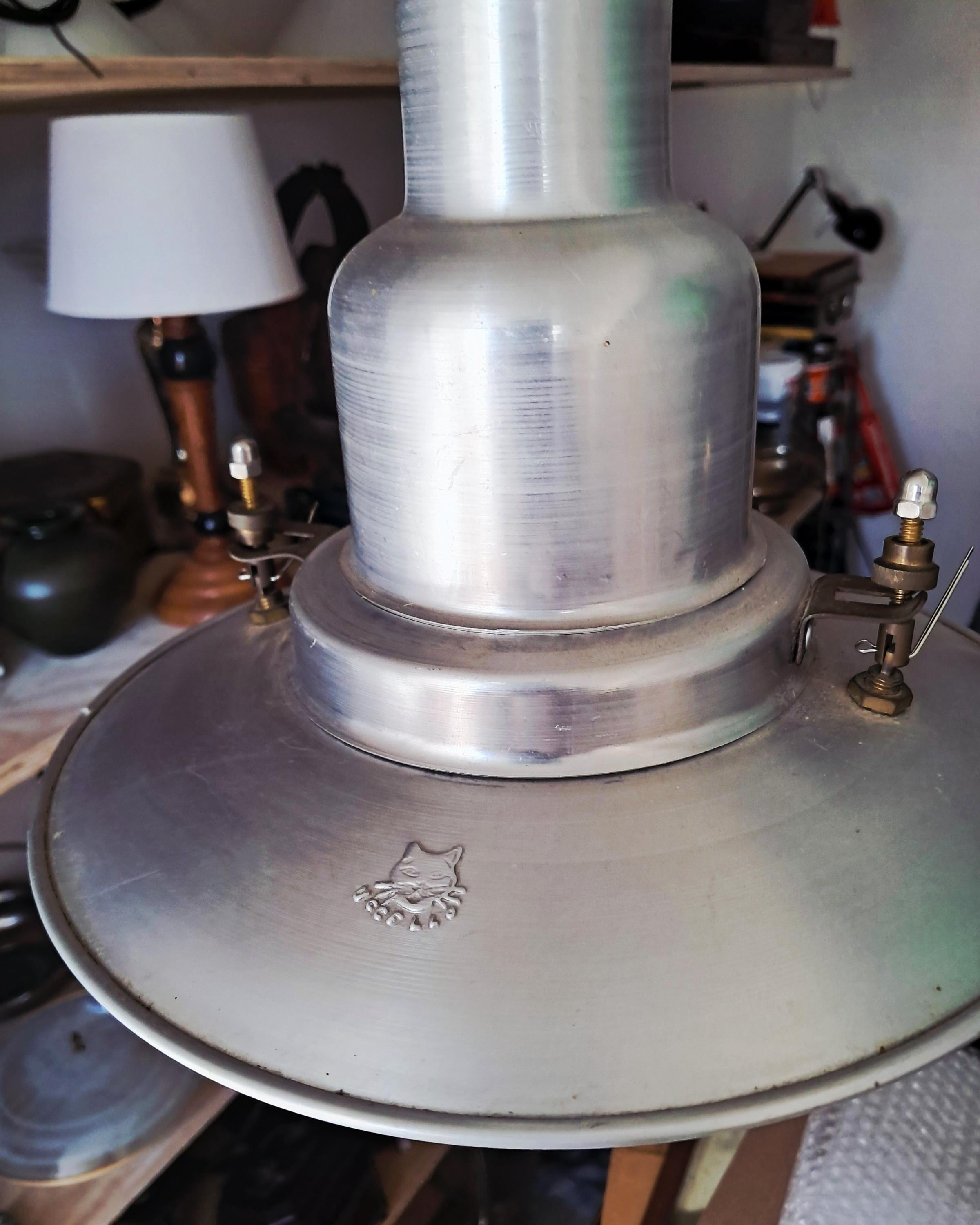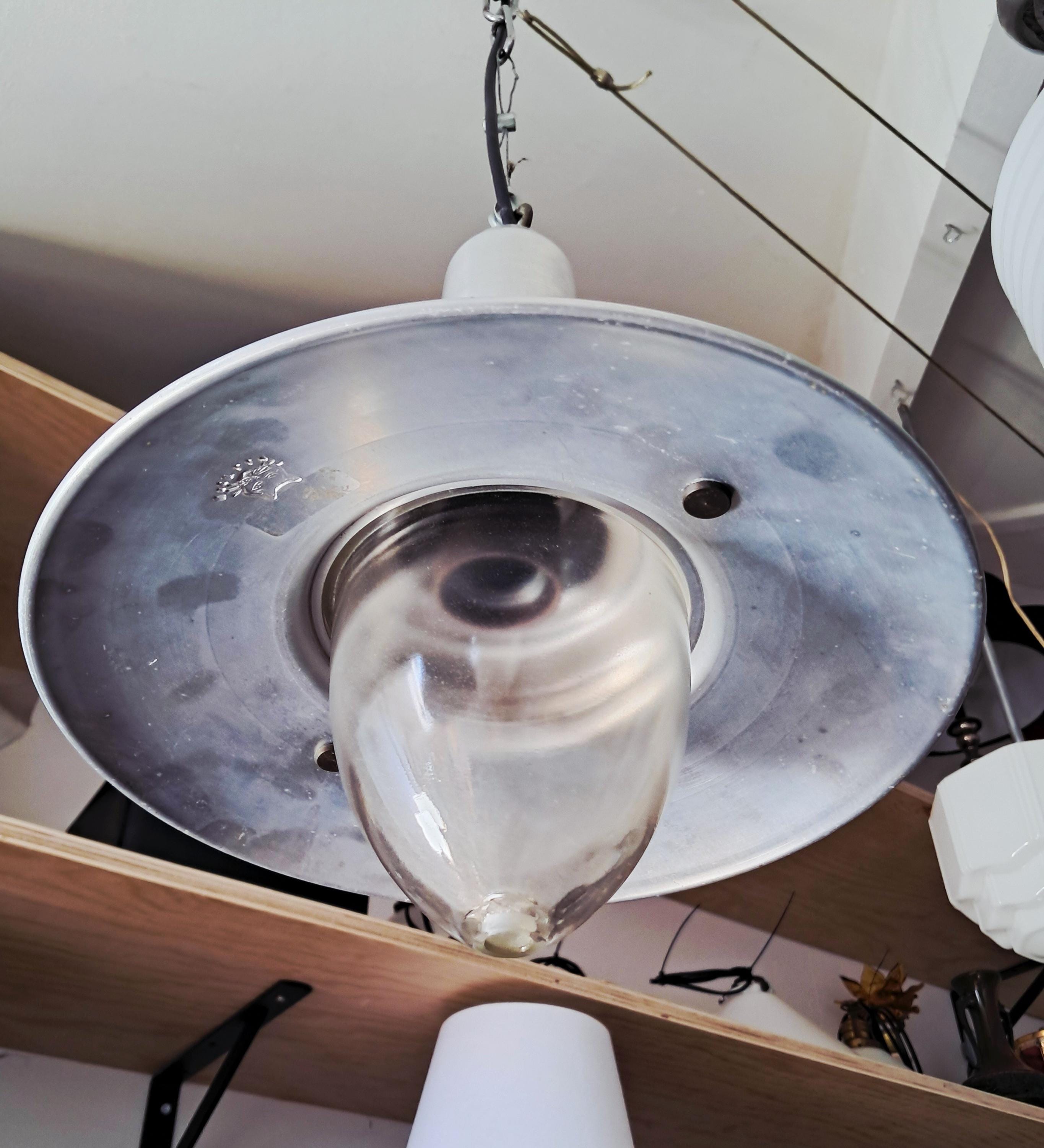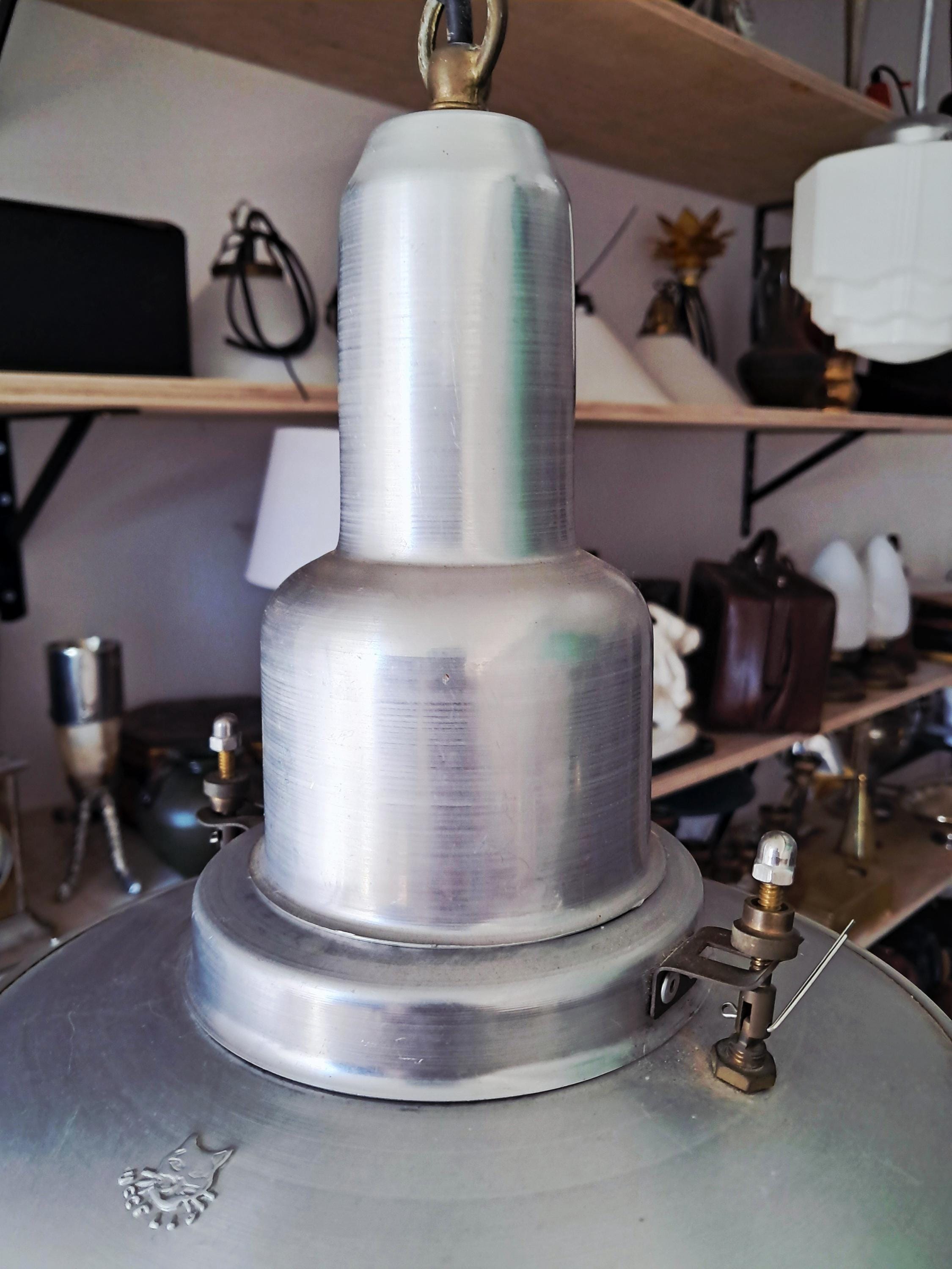 Vintage Uccello ship's lantern – the design is based on the lanterns that fishermen used to attach to the stern of their boats to attract fish. Aluminium housing with a conical glass body. Condition: Good condition, age-appropriate patina and slight signs of wear. Dimensions: Height of lamp body 30 cm, length of chain 39 cm, diameter 25 cm