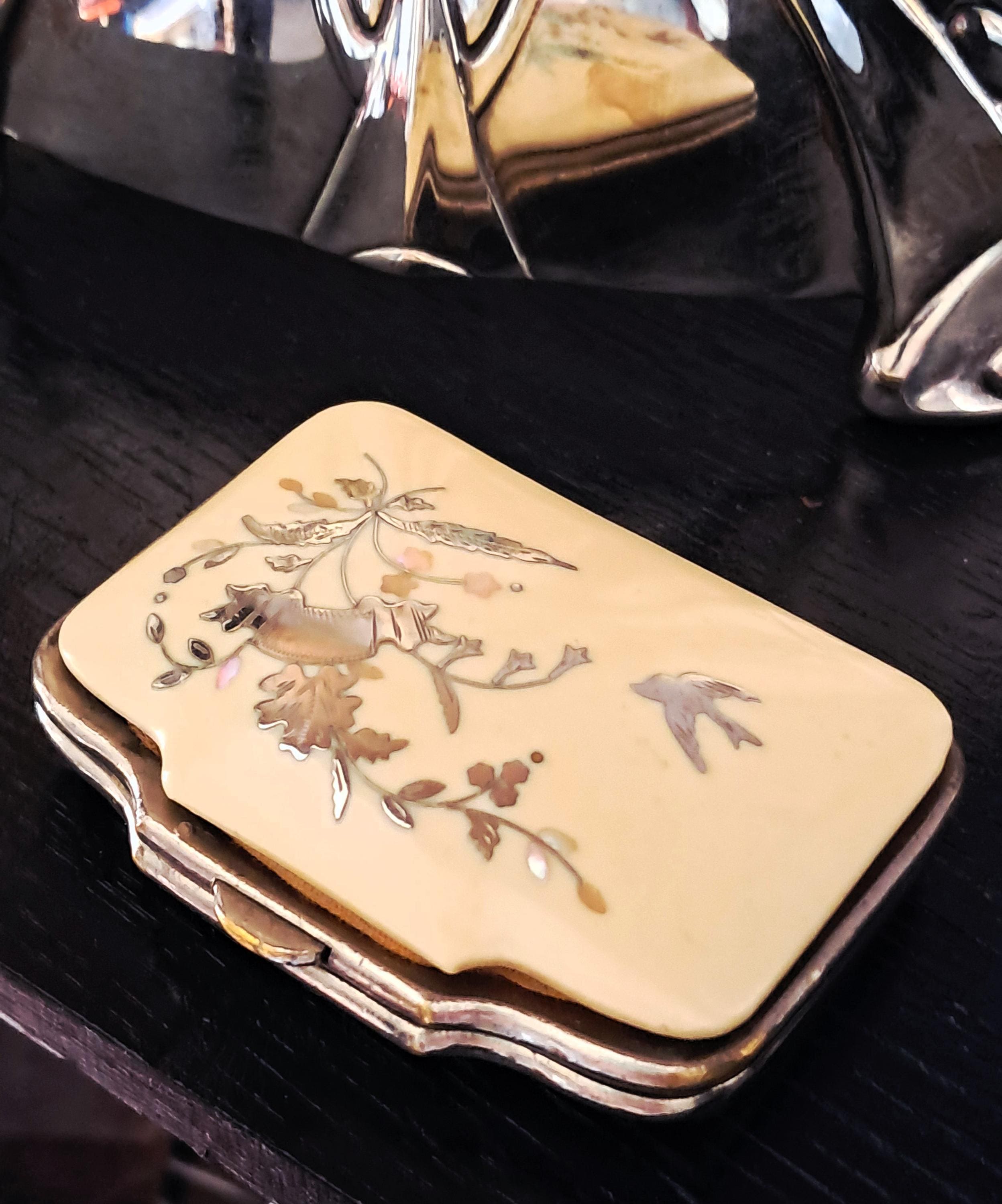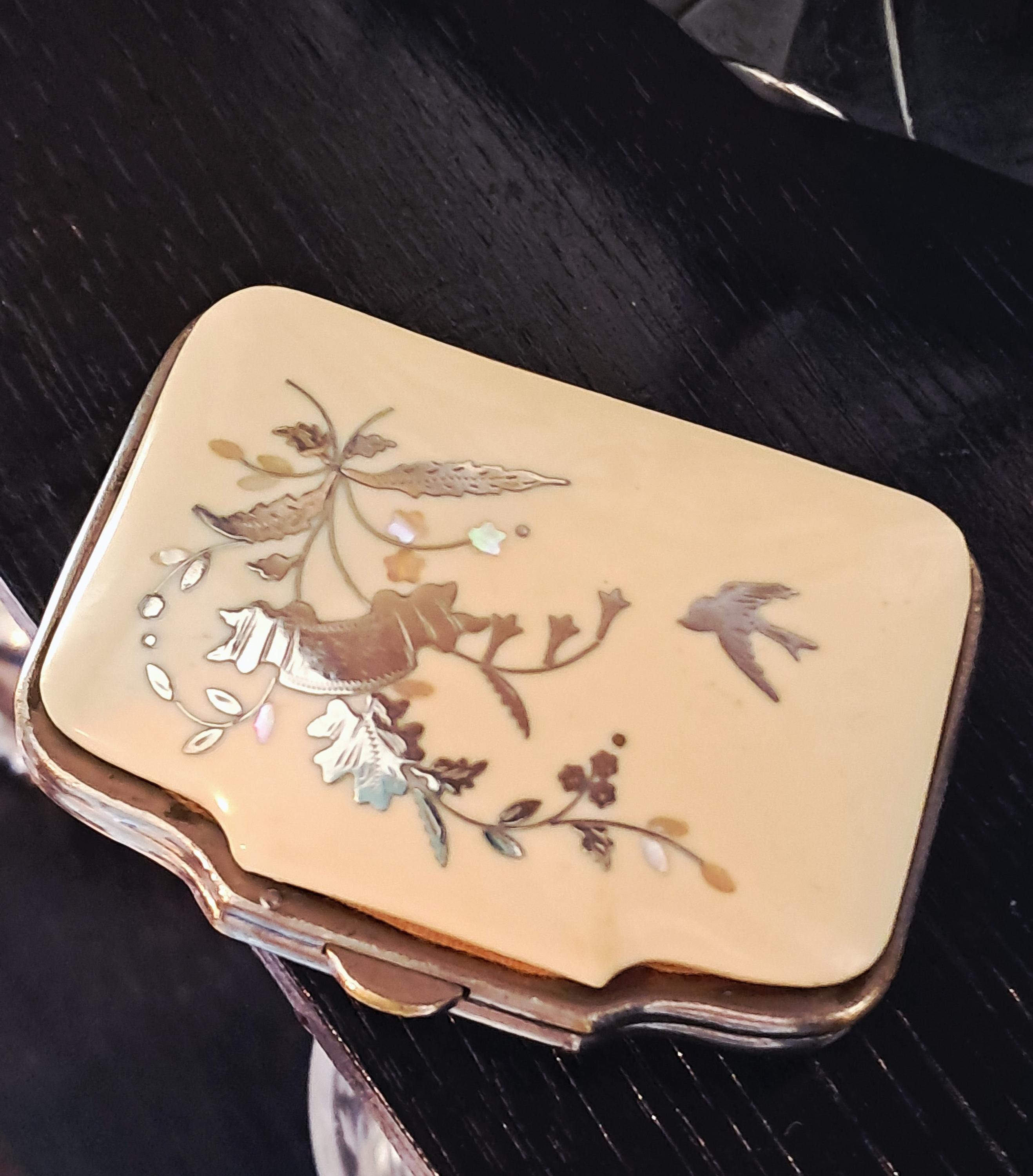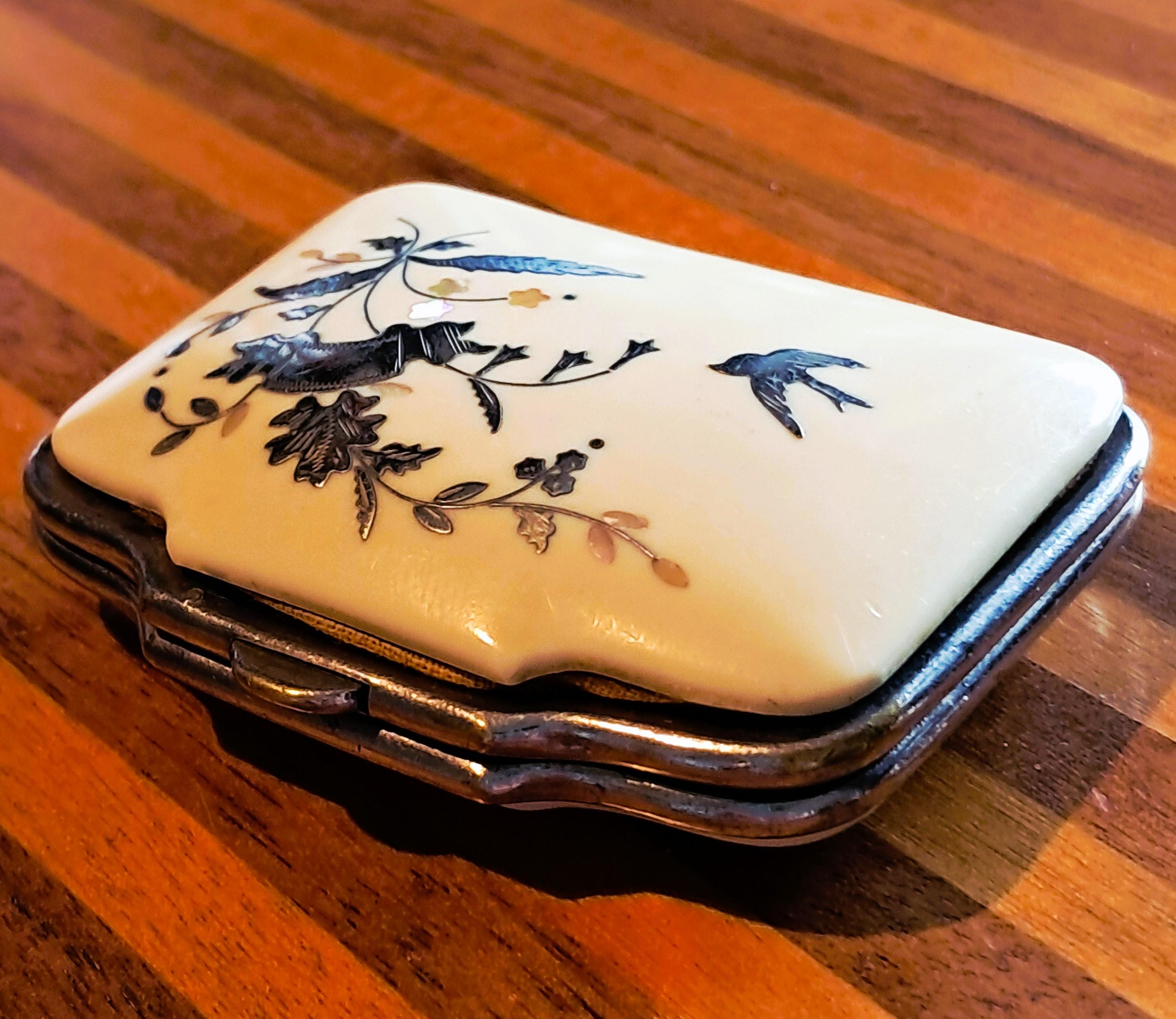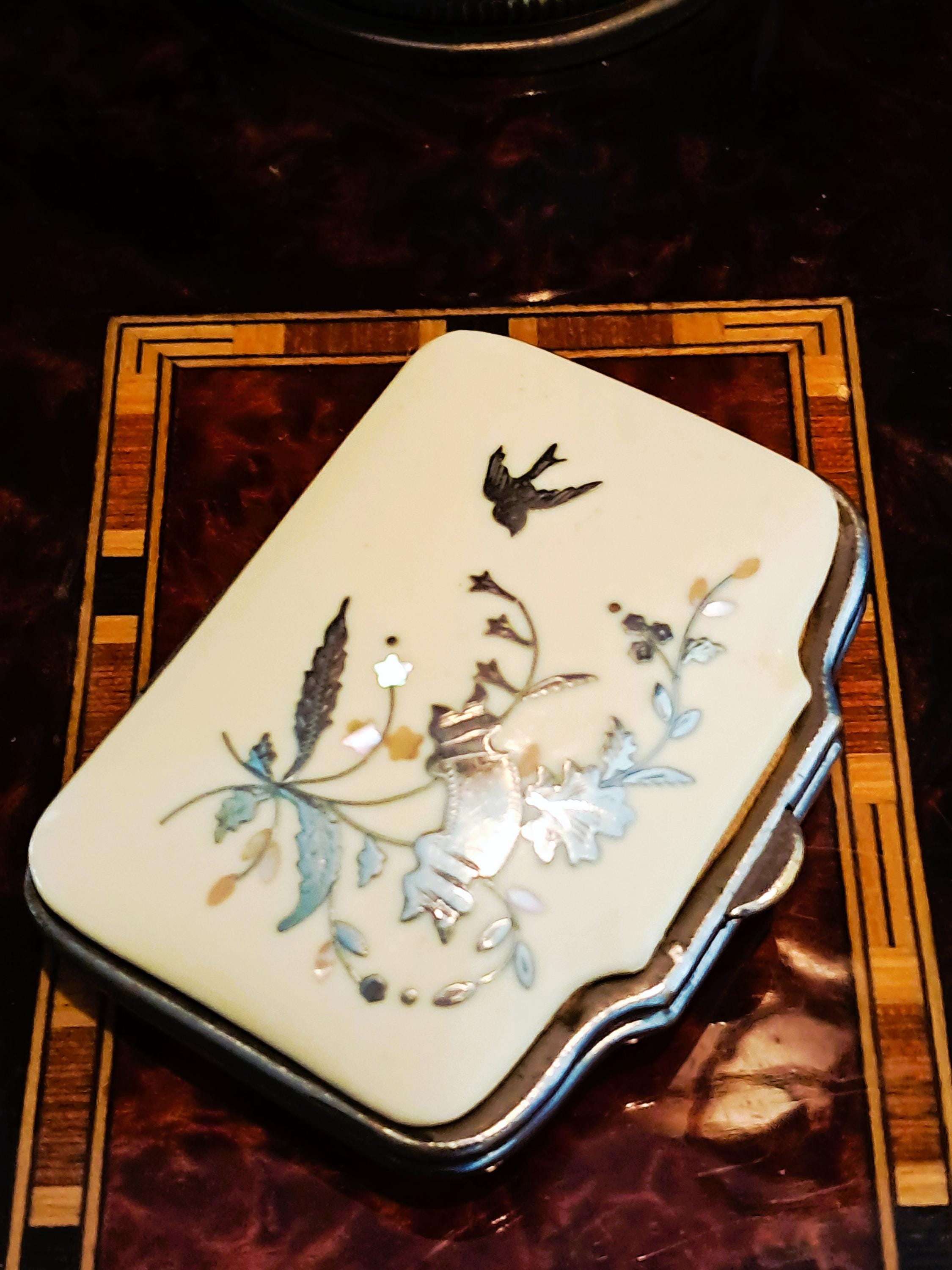 A pretty little purse from the second half of the 19th century. Made of iron, celluloid (Ivorin - imitation ivory) and silver inlay (twigs with leaves and a swallow). The interior has not survived the nearly 200 years, but the exterior exemplifies the artistic and craftsmanship of the 19th century. Condition: Exterior good – no damage; silver inlays are complete and undamaged. Interior – see photos and description above. Dimensions: Width 7 cm, depth 5.5 cm, height 2 cm