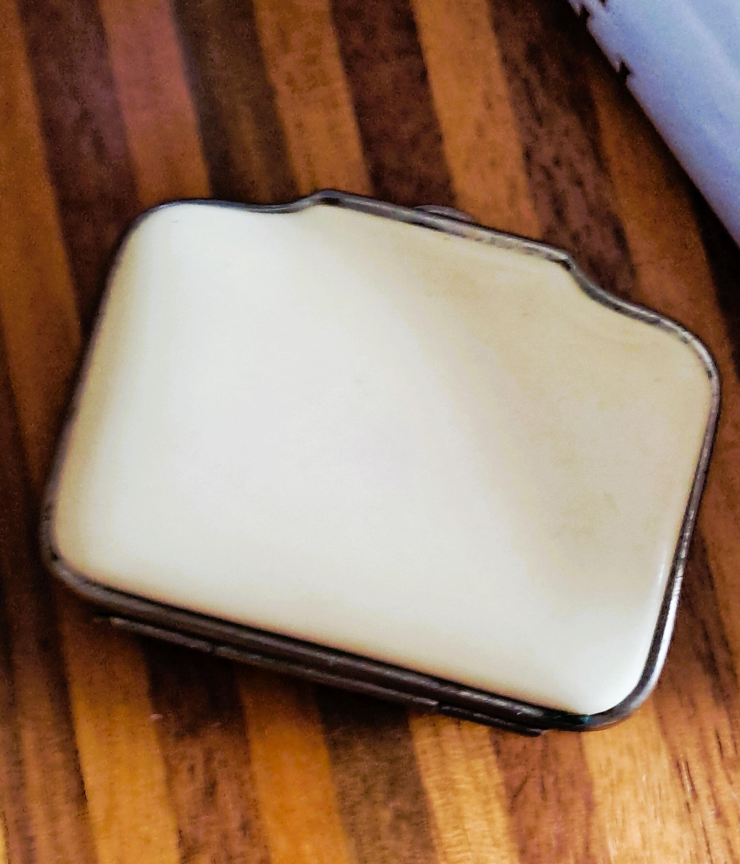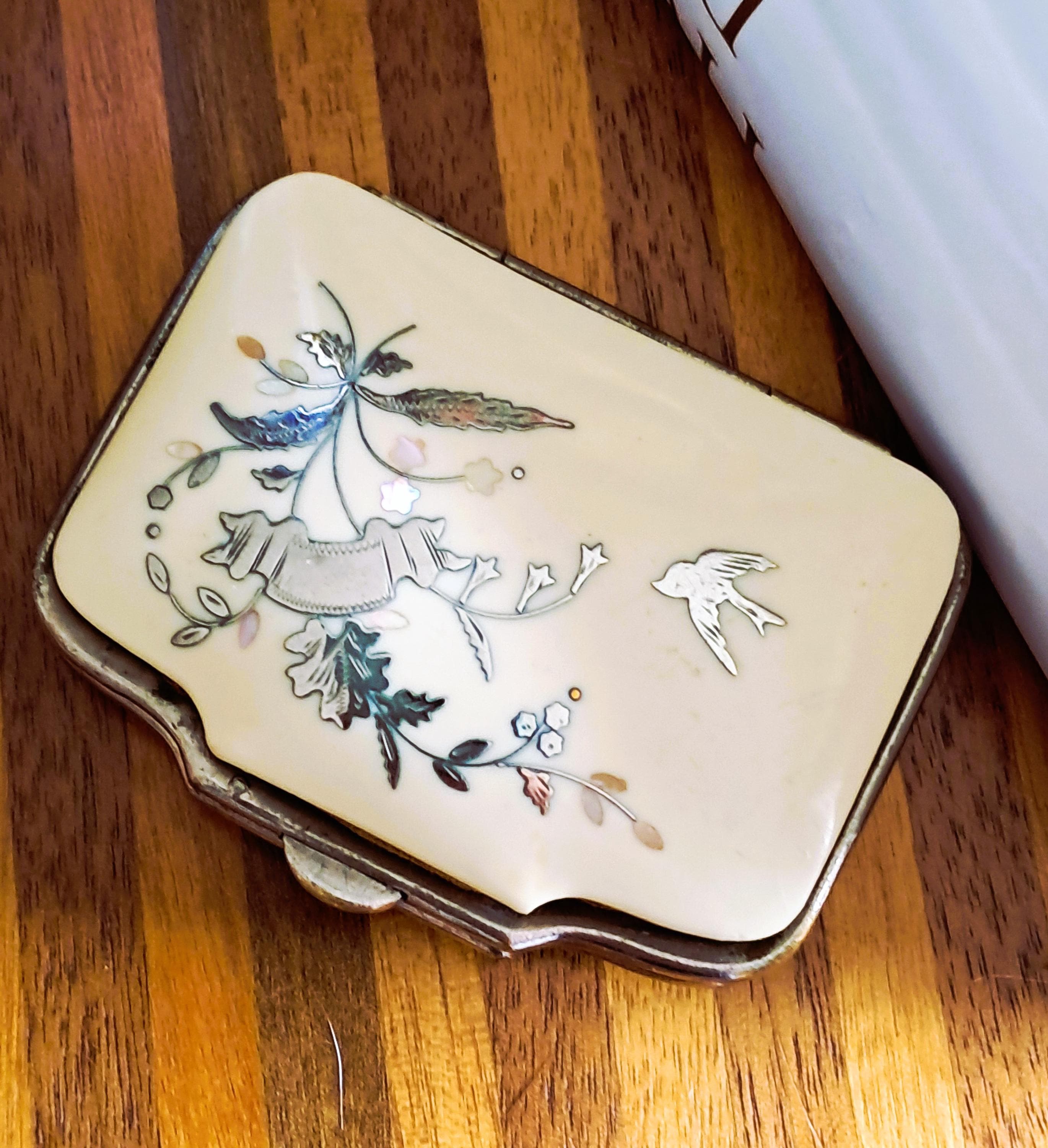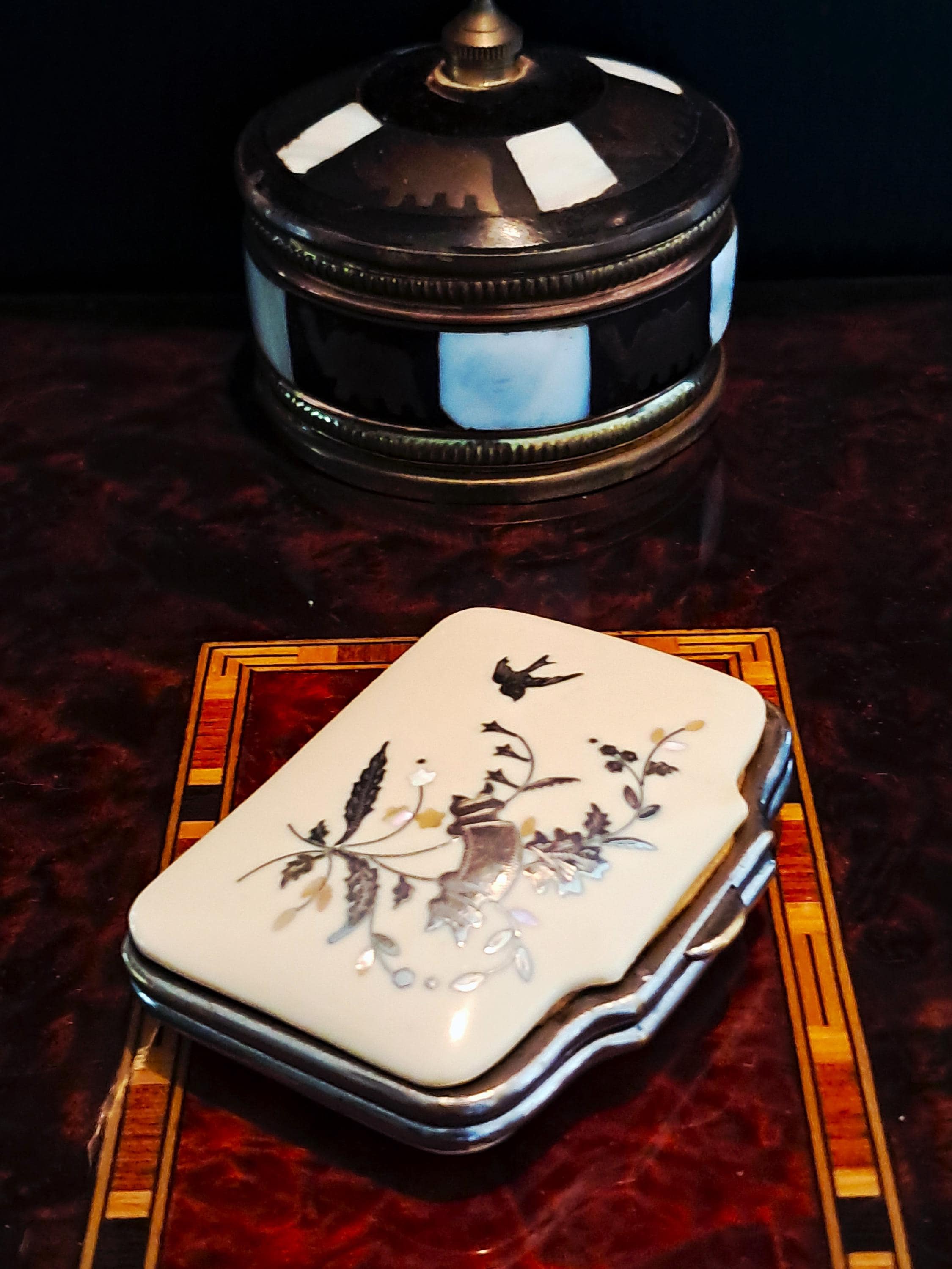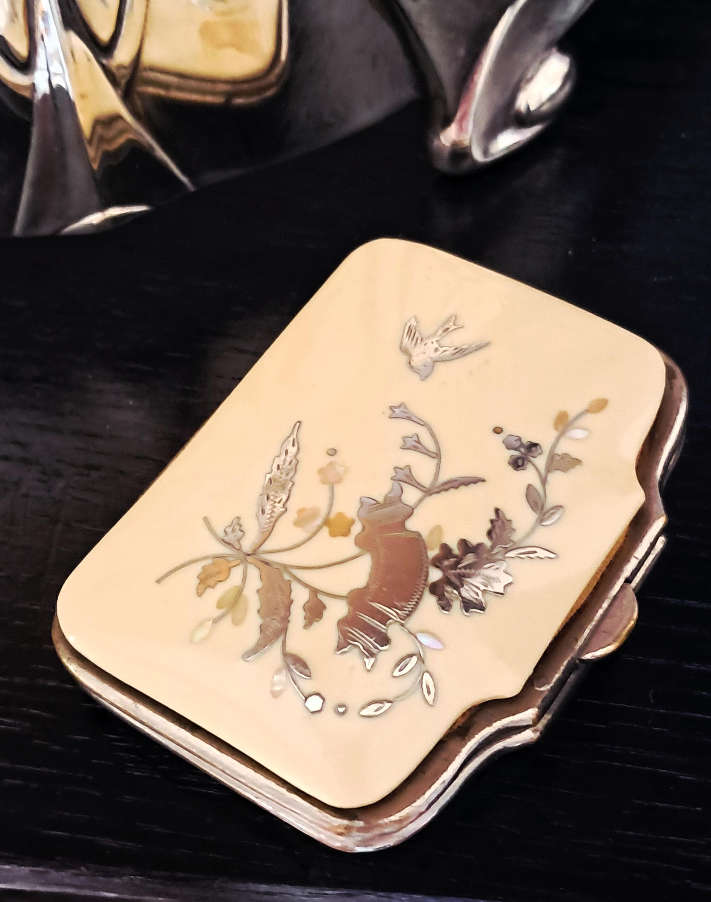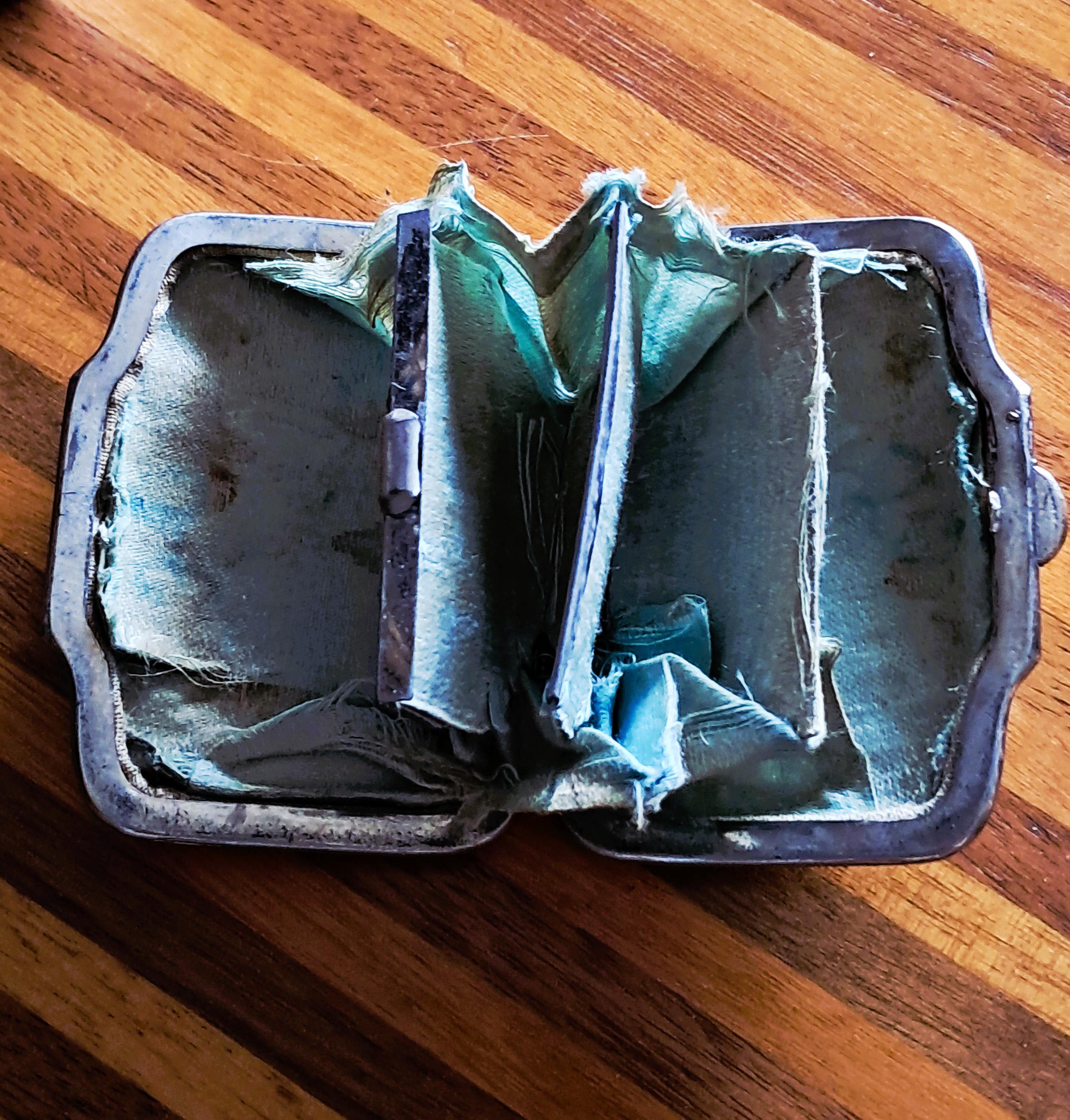 A pretty little purse from the second half of the 19th century. Made of iron, celluloid (Ivorin - imitation ivory) and silver inlay (twigs with leaves and a swallow). The interior has not survived the nearly 200 years, but the exterior exemplifies the artistic and craftsmanship of the 19th century. Condition: Exterior good – no damage; silver inlays are complete and undamaged. Interior – see photos and description above. Dimensions: Width 7 cm, depth 5.5 cm, height 2 cm